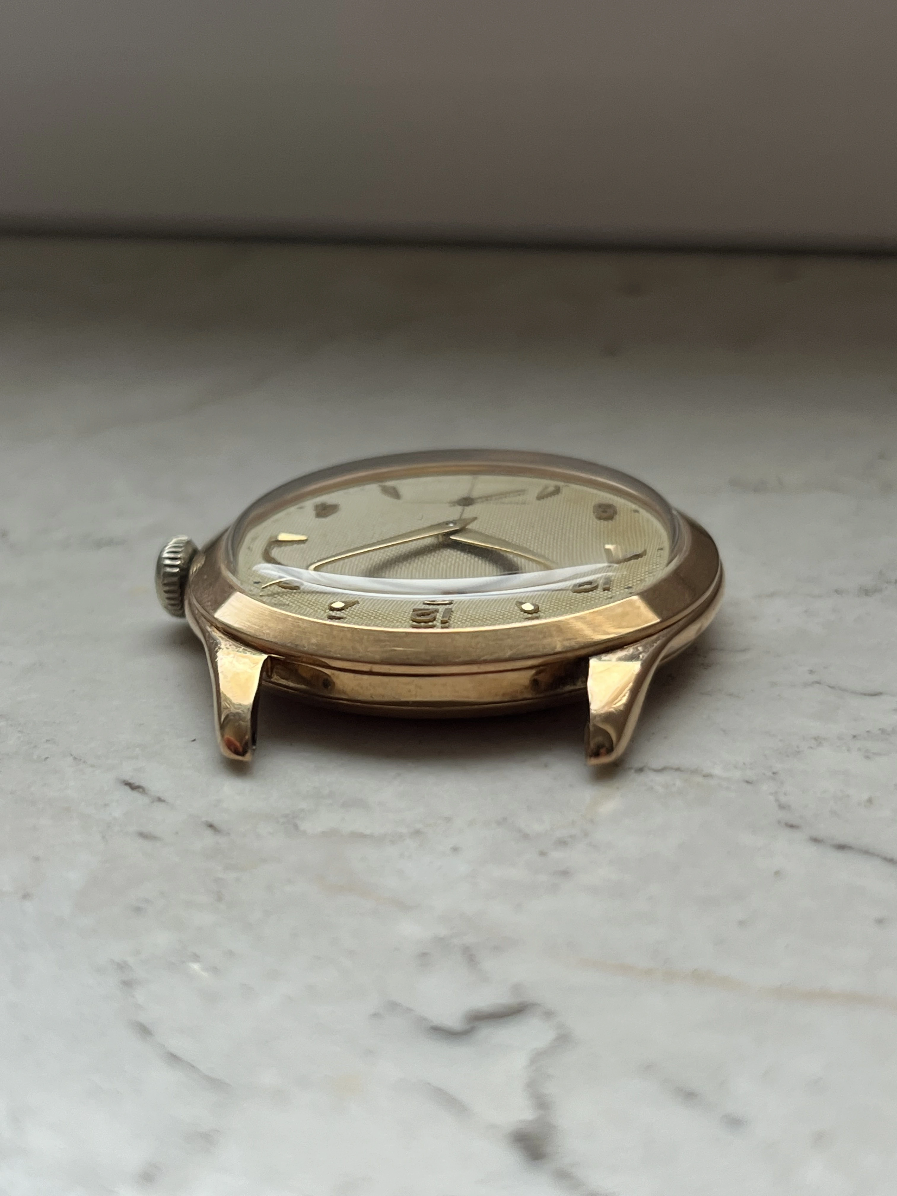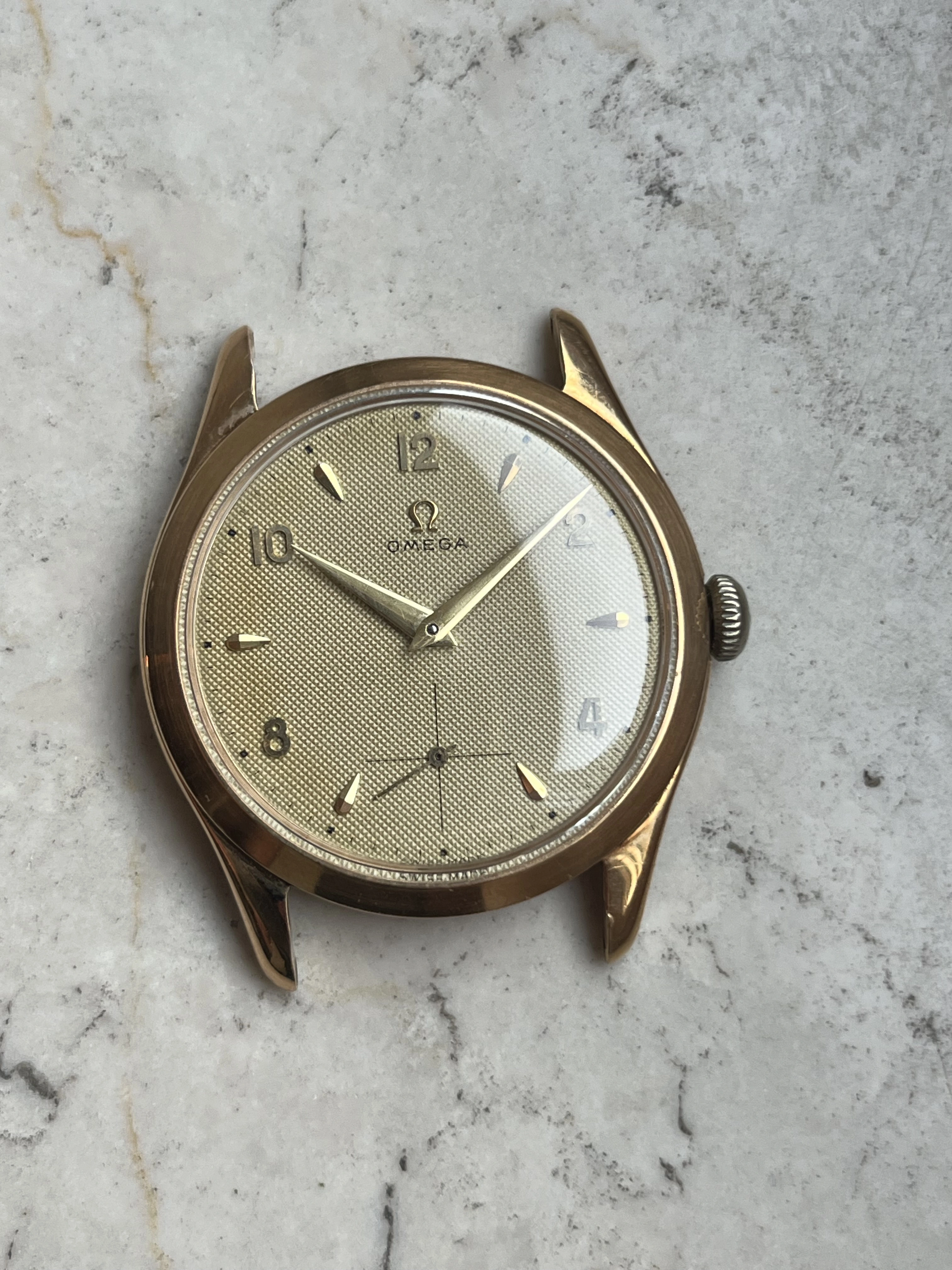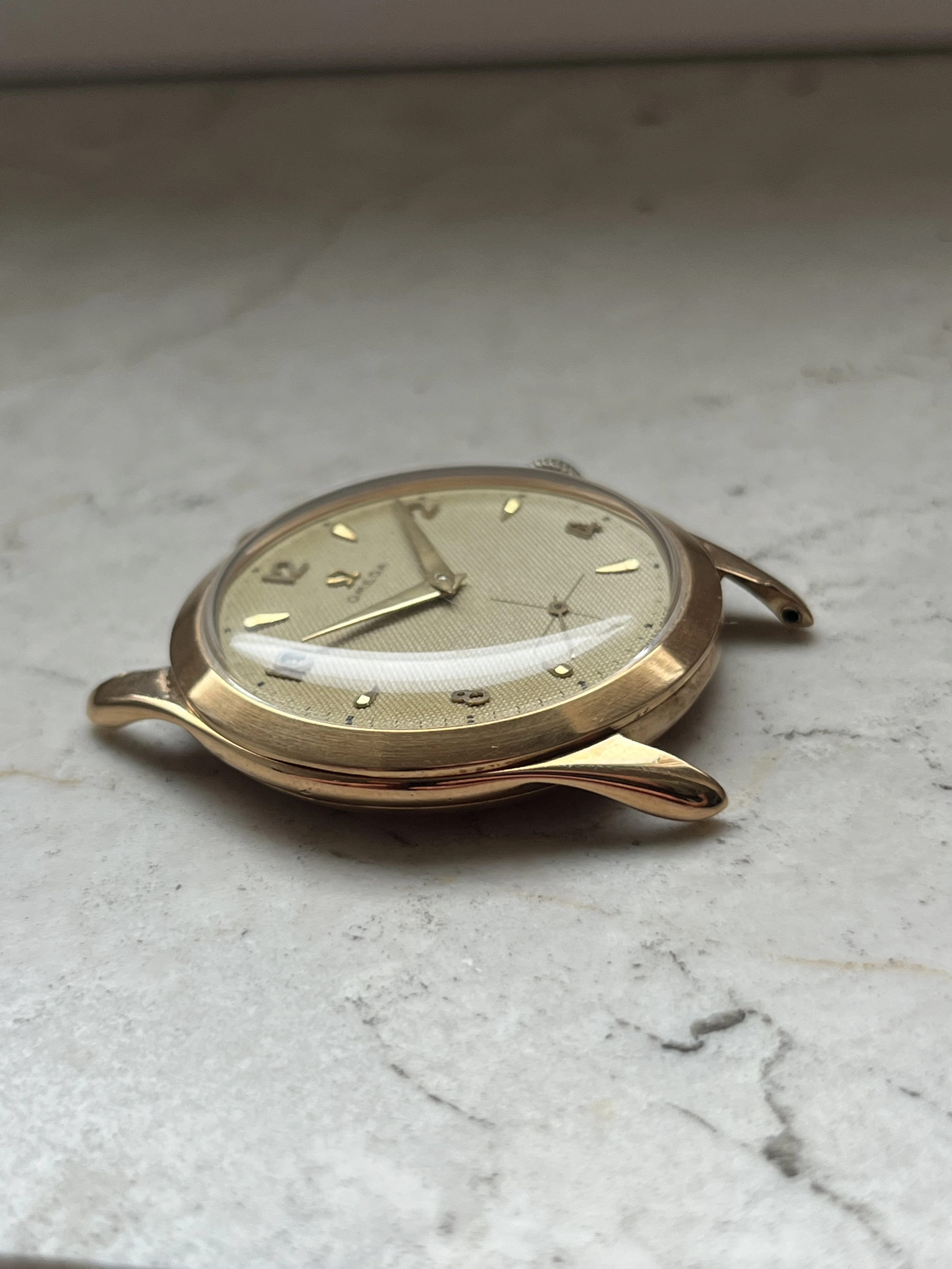 Case: The watch is with its 36mm 14k gold case quite large for its age and will fit many wrists very well.The case is in very good condition without any significant damages. The crystal is original with the Omega stamp in the middle. The crown is original but has lost a bit of its colour as visible in the pictures.