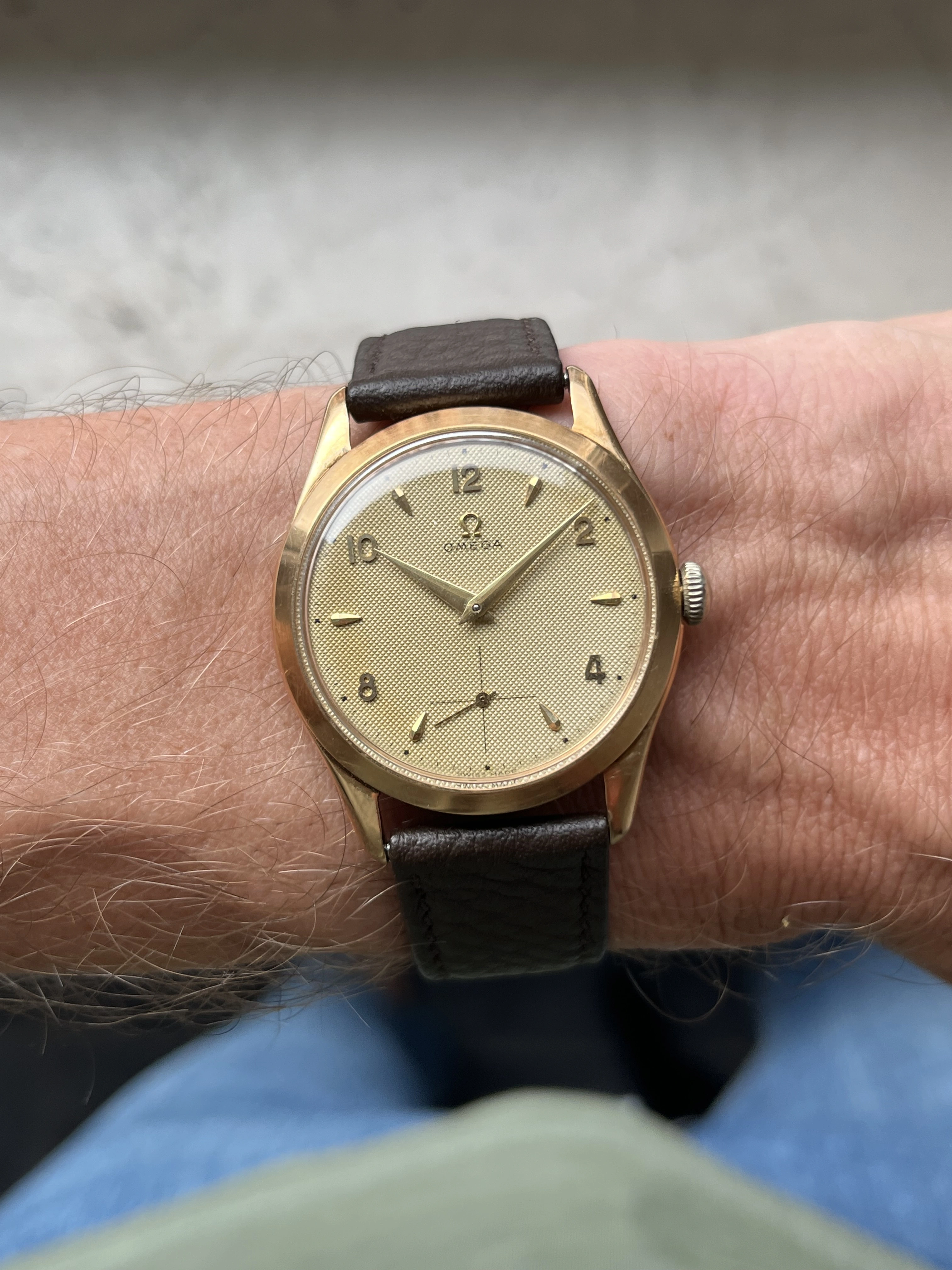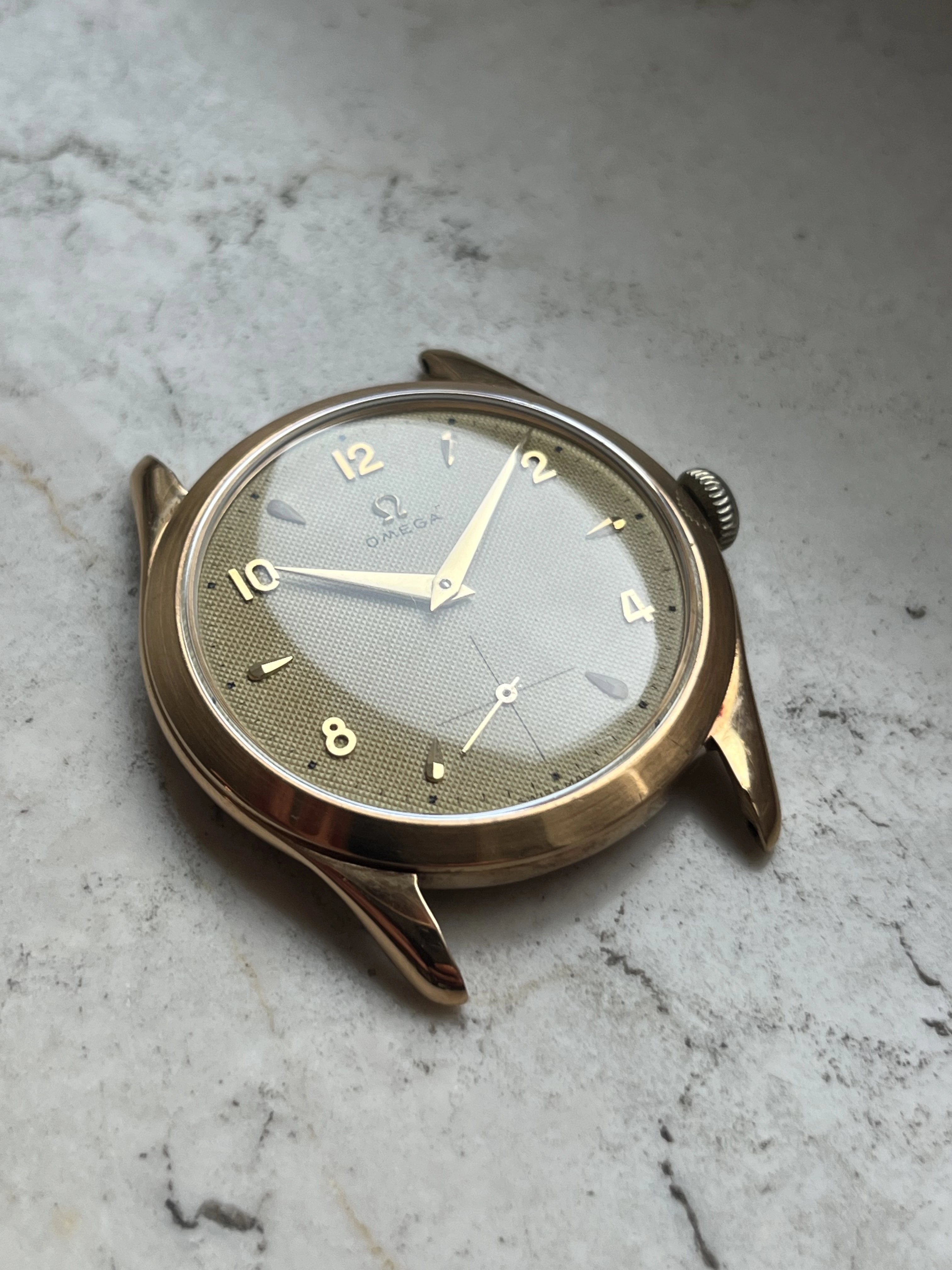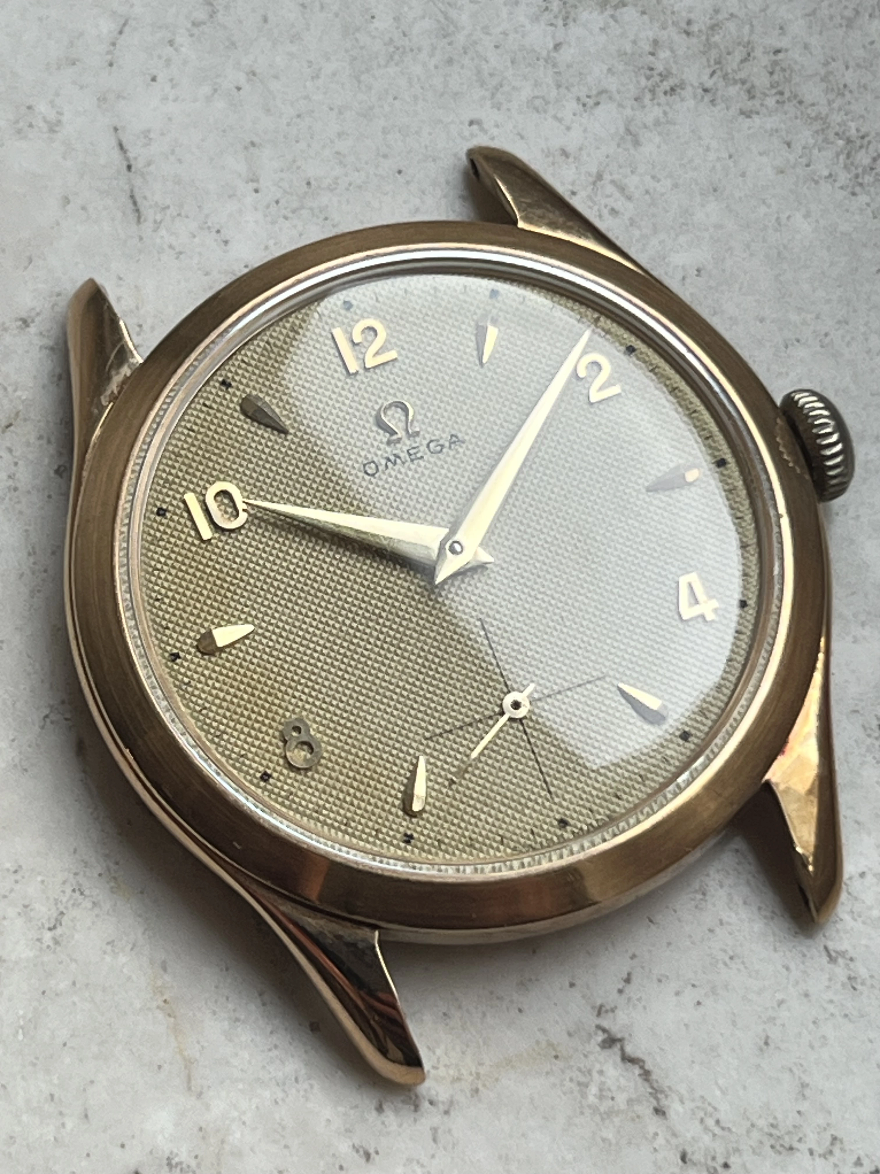 Case: The watch is with its 36mm 14k gold case quite large for its age and will fit many wrists very well.The case is in very good condition without any significant damages. The crystal is original with the Omega stamp in the middle. The crown is original but has lost a bit of its colour as visible in the pictures.