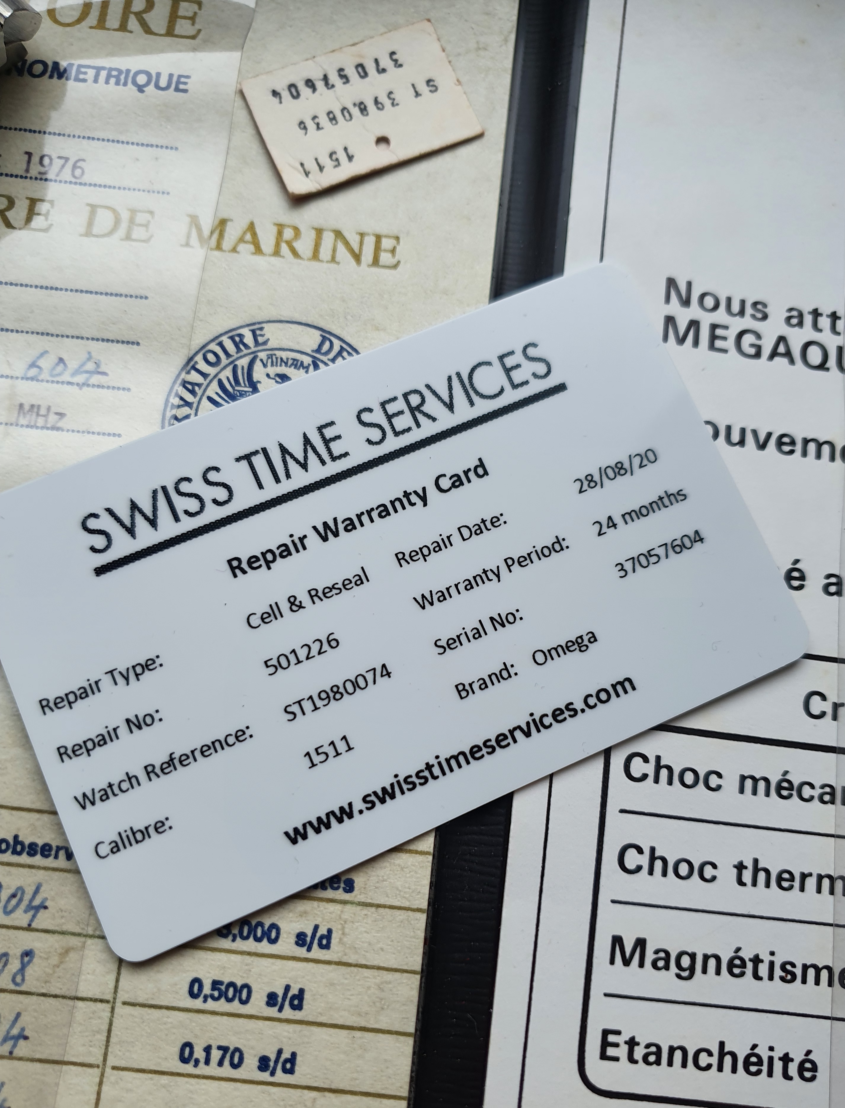 The watch is in overall good original condition and is obviously in full working order. The original no 27 clasp and correct leather band are included with the important mounting ends. To the best of my knowledge this band is the only correct one for the 1511. Also present is the original chronometer certificate that was provided by the University of Besancon for this watch, all serials are correct and match. The certificate is presented in its original Omega booklet. These certificates and booklets are usually missing and a copy of the certificate is often provided, this is the original paper that was provided at sale. The original hang tag is also included. This is a big watch (34/46mm) and there are a few scuffs but no major dents or dings. The original chamfers are present and the case appears original to me. There are a few extra links pictured that are included.