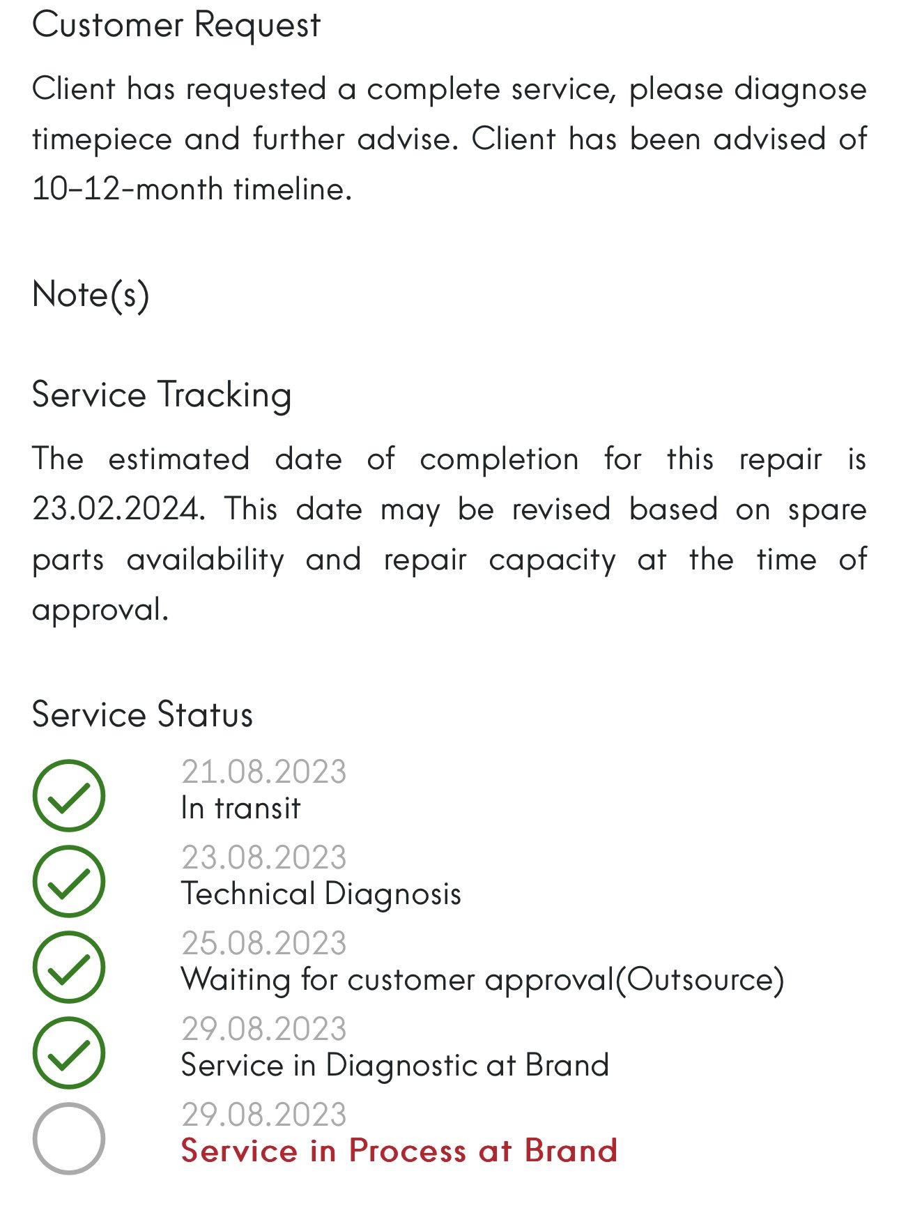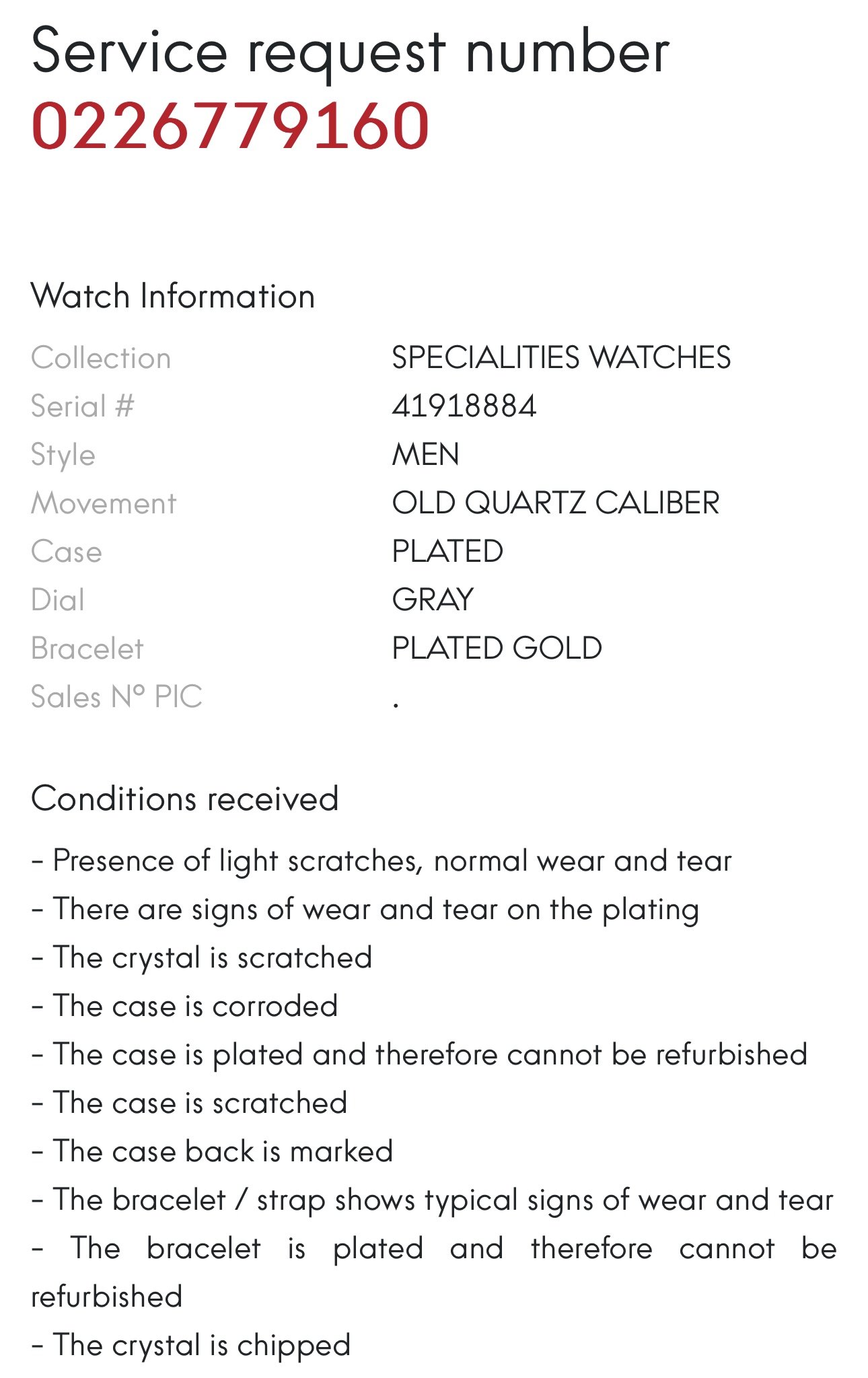 According to the information on Omega CIS (which I have checked every 20 minutes, like a madman!), my watch was sent to Omega/Swatch in Victoria, for assessment. From then on, I was requested to approve outsourcing. It appears that it has now been sent to Omega HQ in Bienne. The comments state that the band and case cannot be restored due to the gold plating, so I am curious to see if there is an option to replace them or perhaps have them re-plated as part of the service.