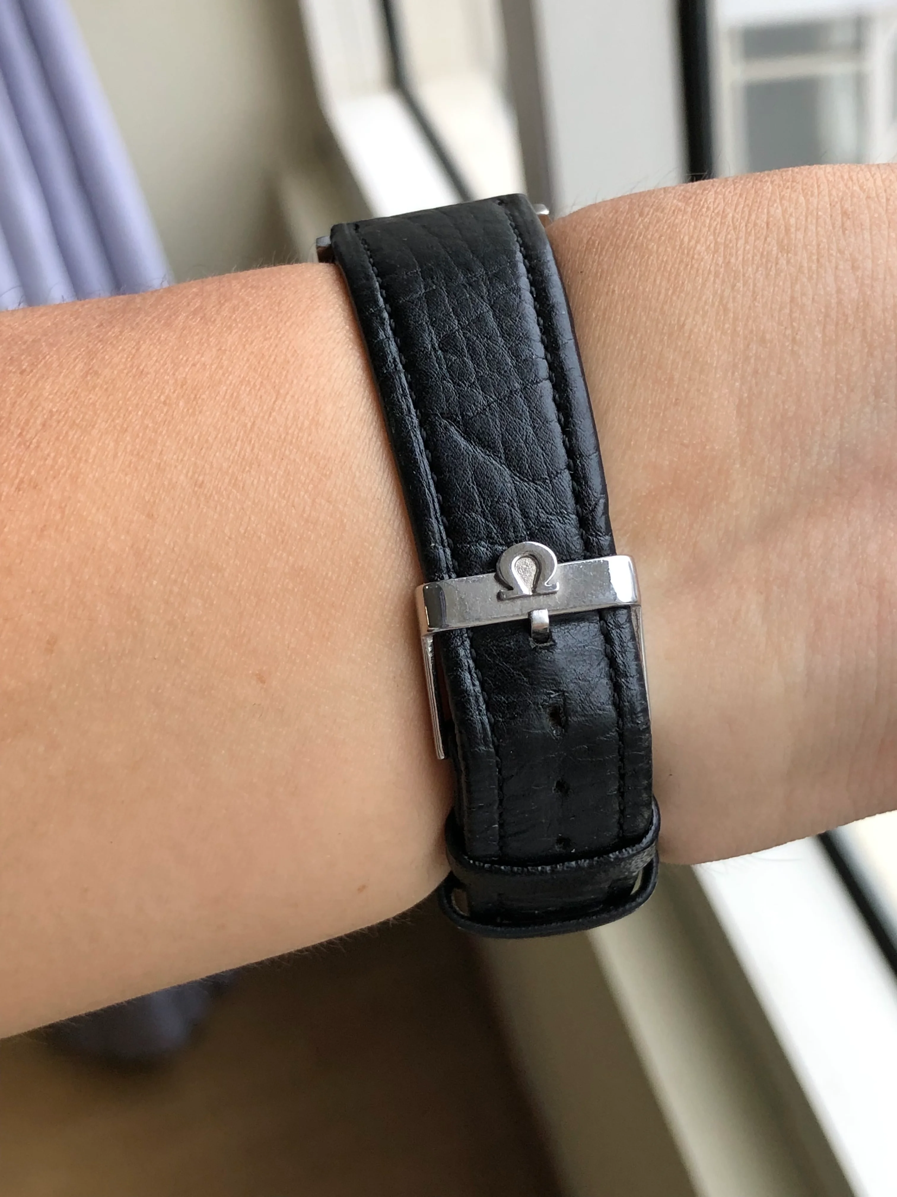 - Box/Bracelet: Original box and leather strap with after market buckle.
