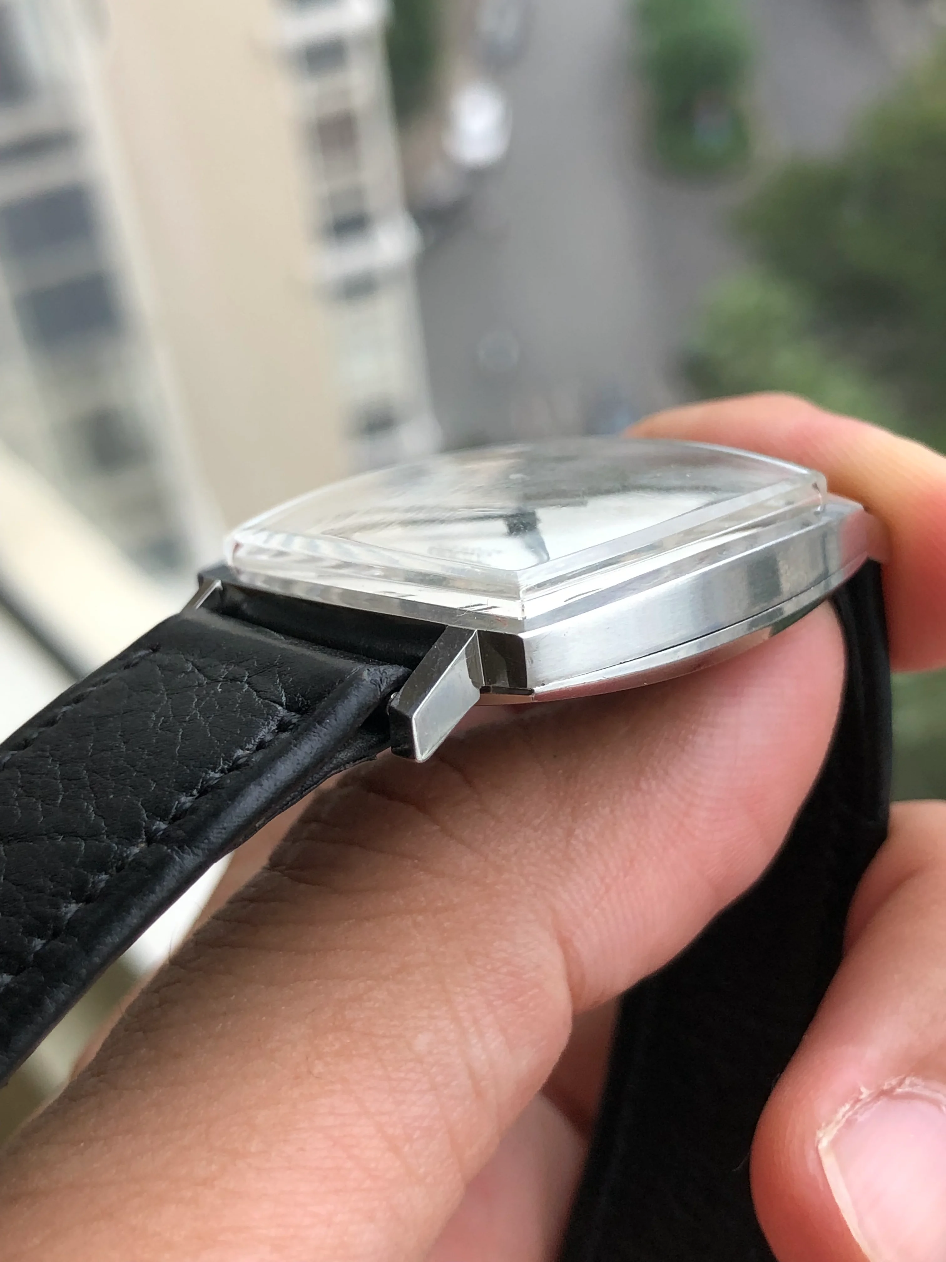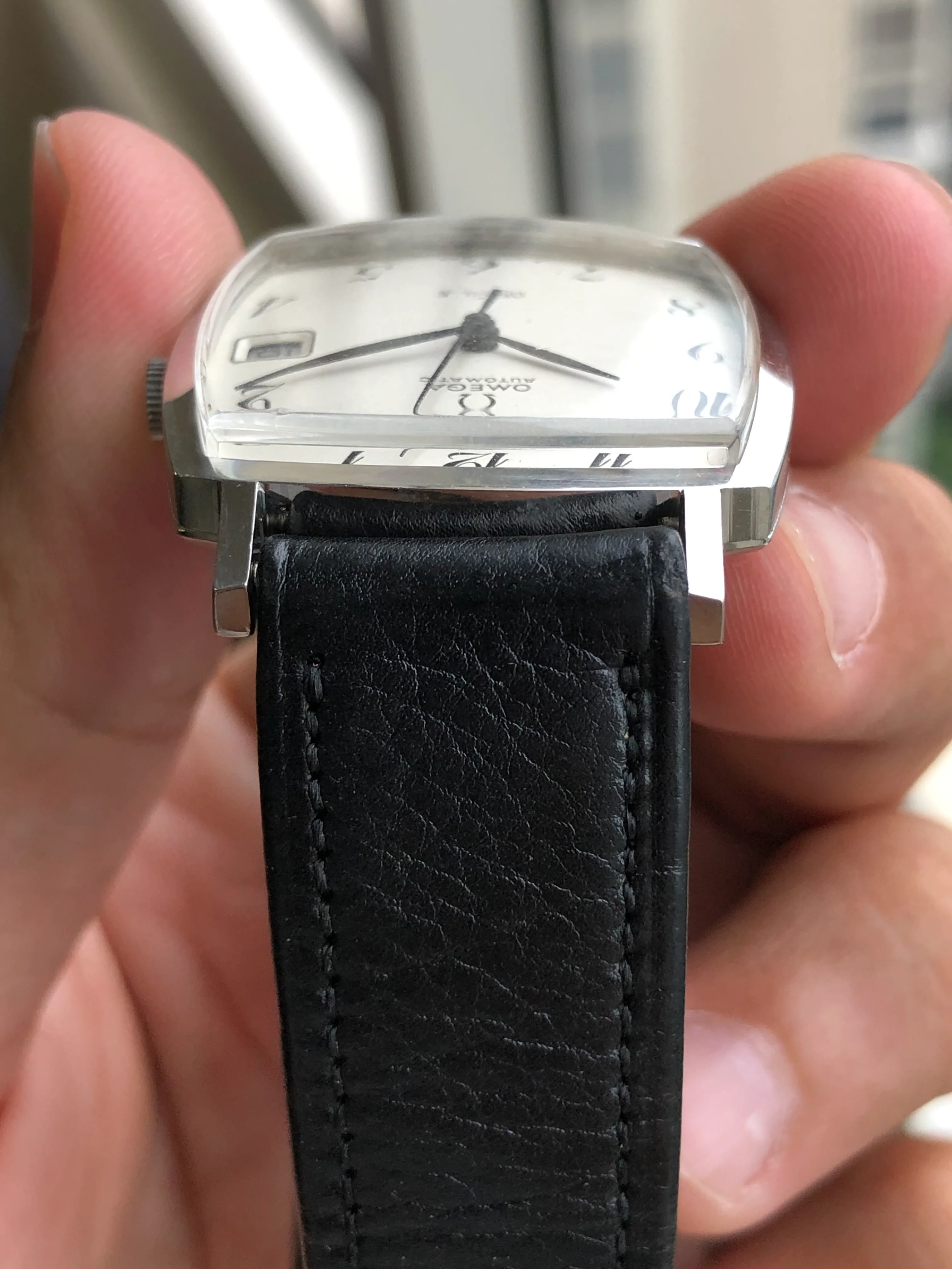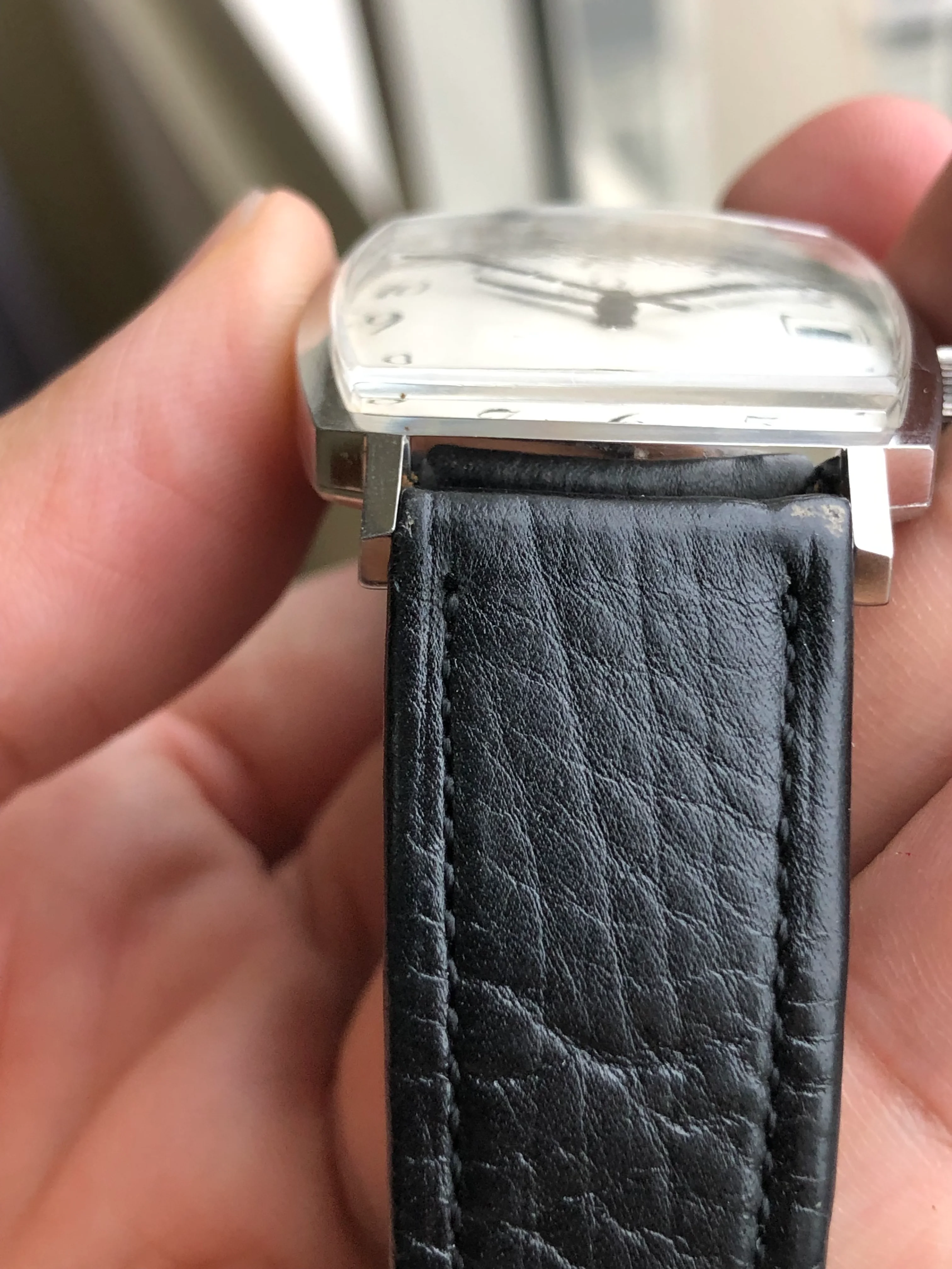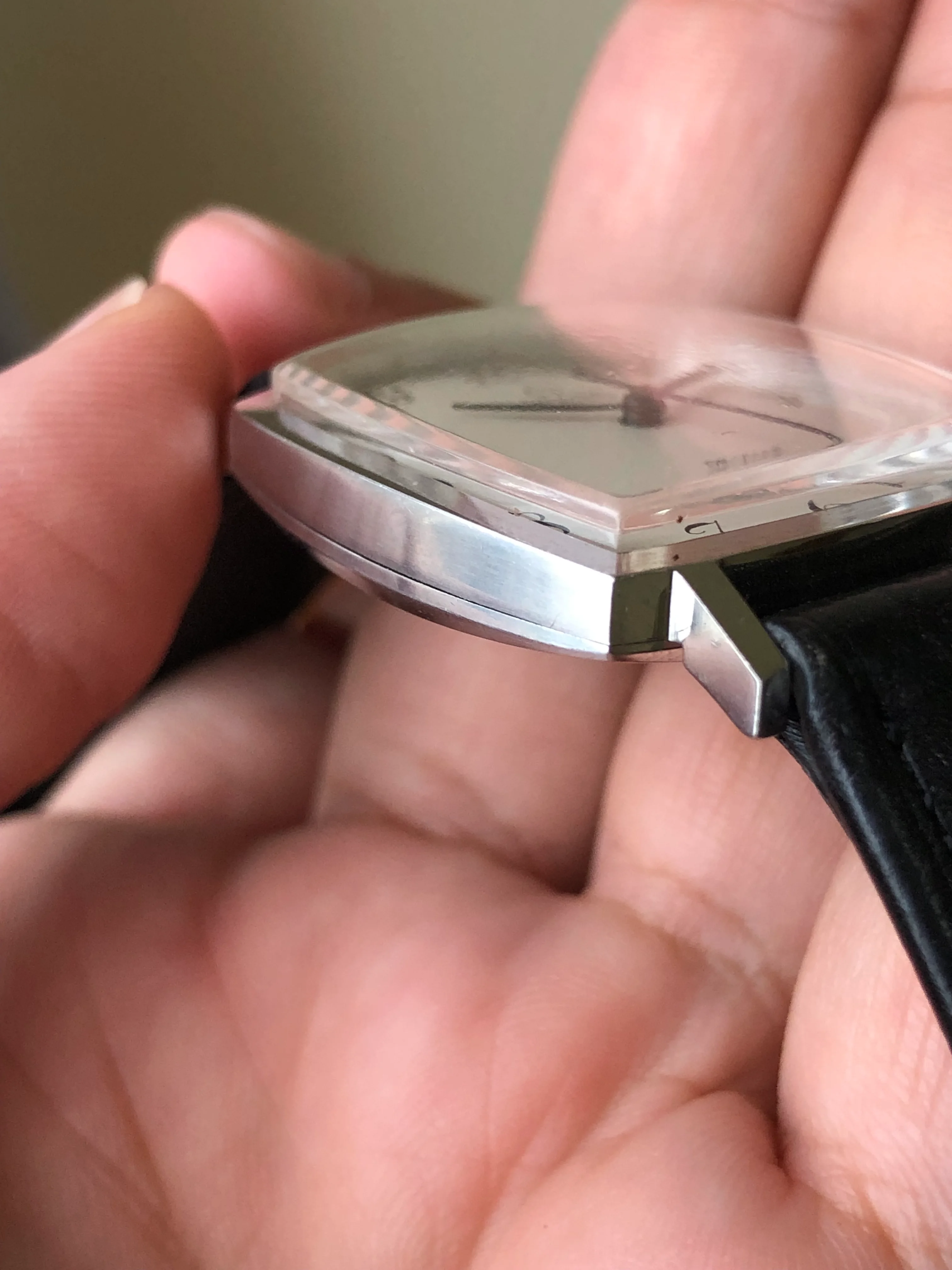 - Dial: Original matte white rectangular dial with printed arabic hour markers, black leaf hands, date-aperture frame at 3; prints, hands and hour markers are all good. The dial surface has been aged and has some damages at the edge (details are shown in photos below).