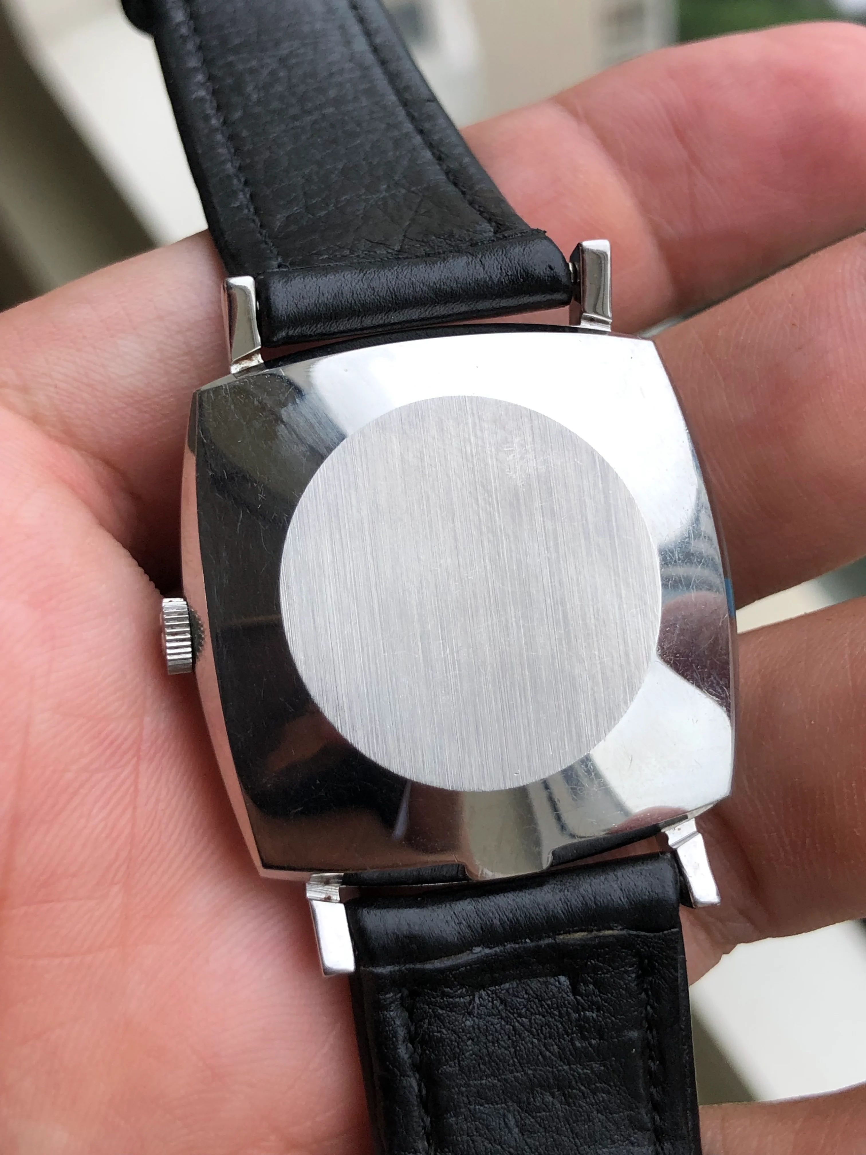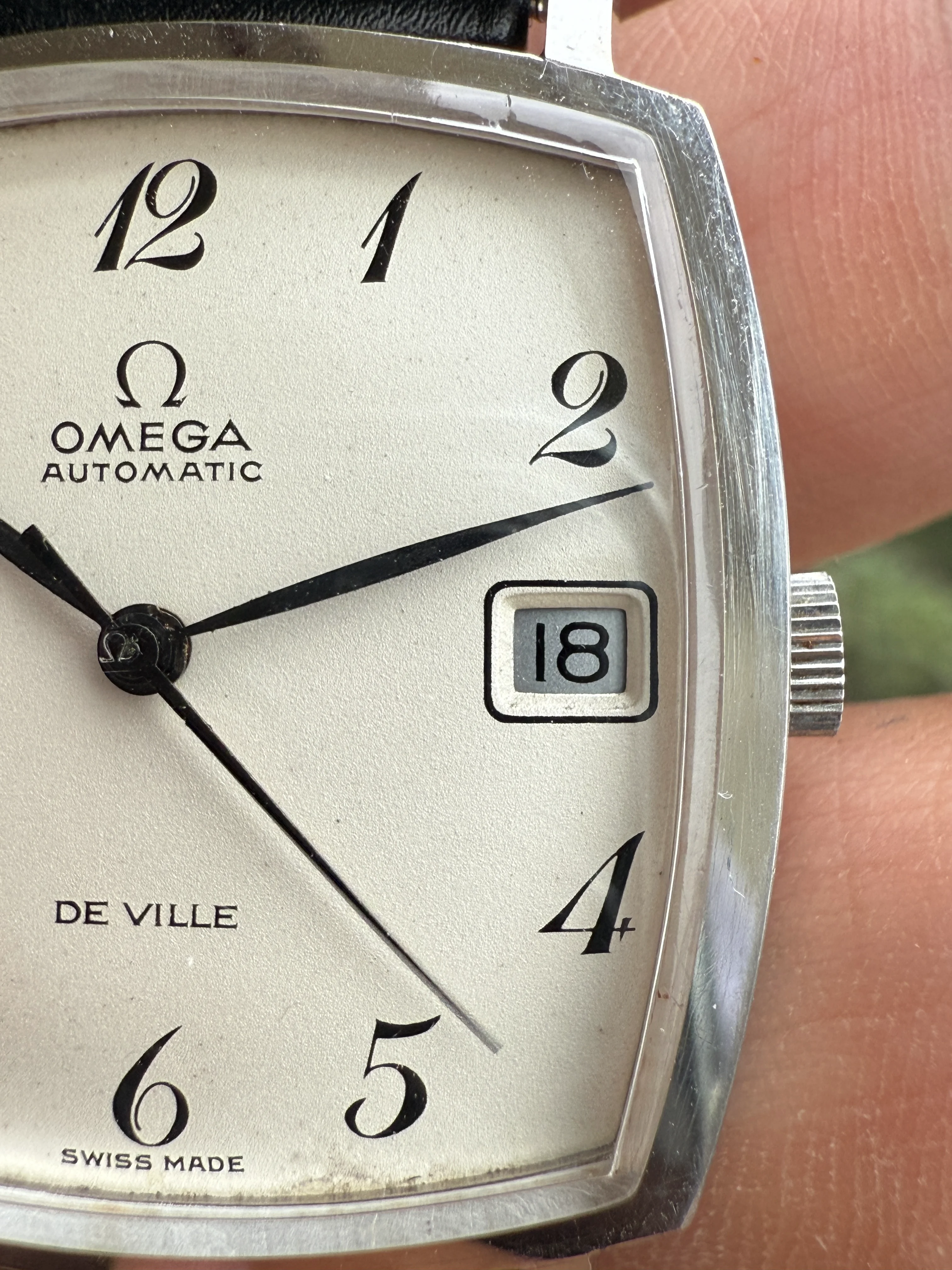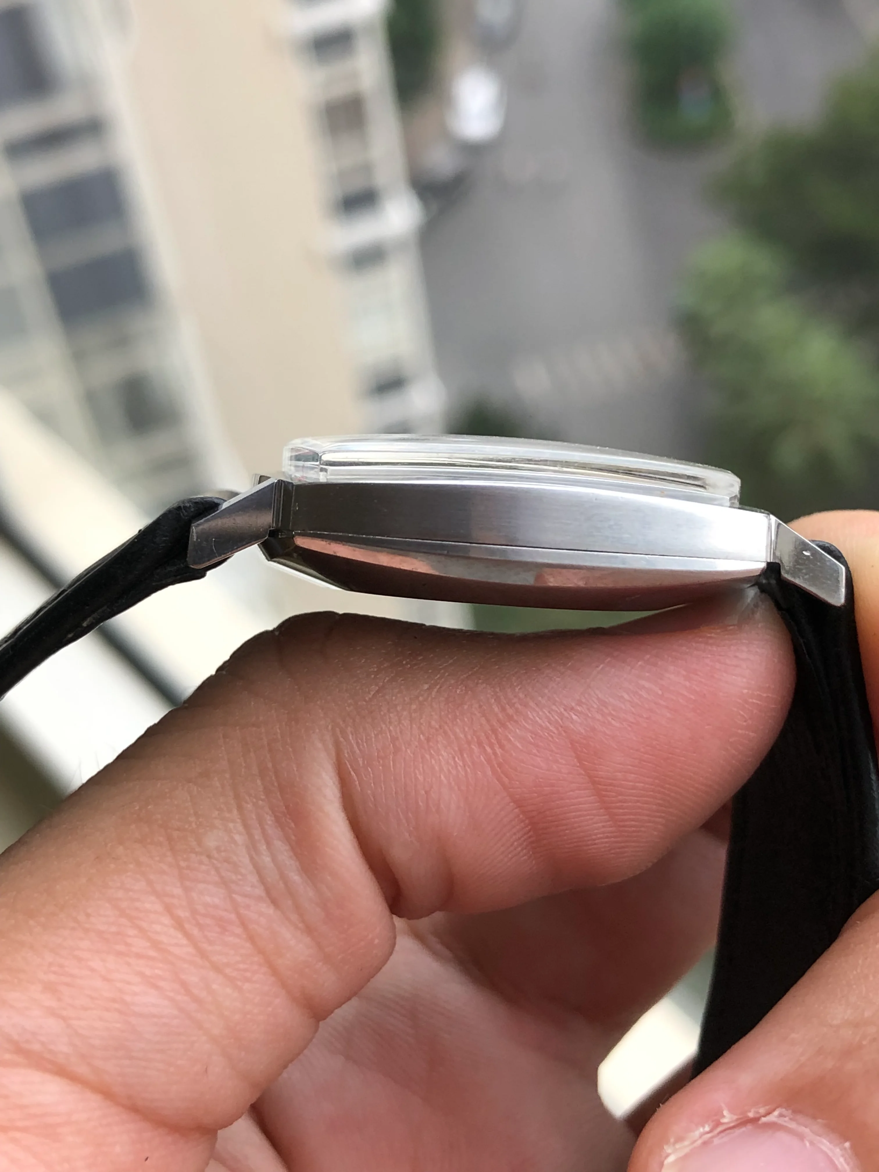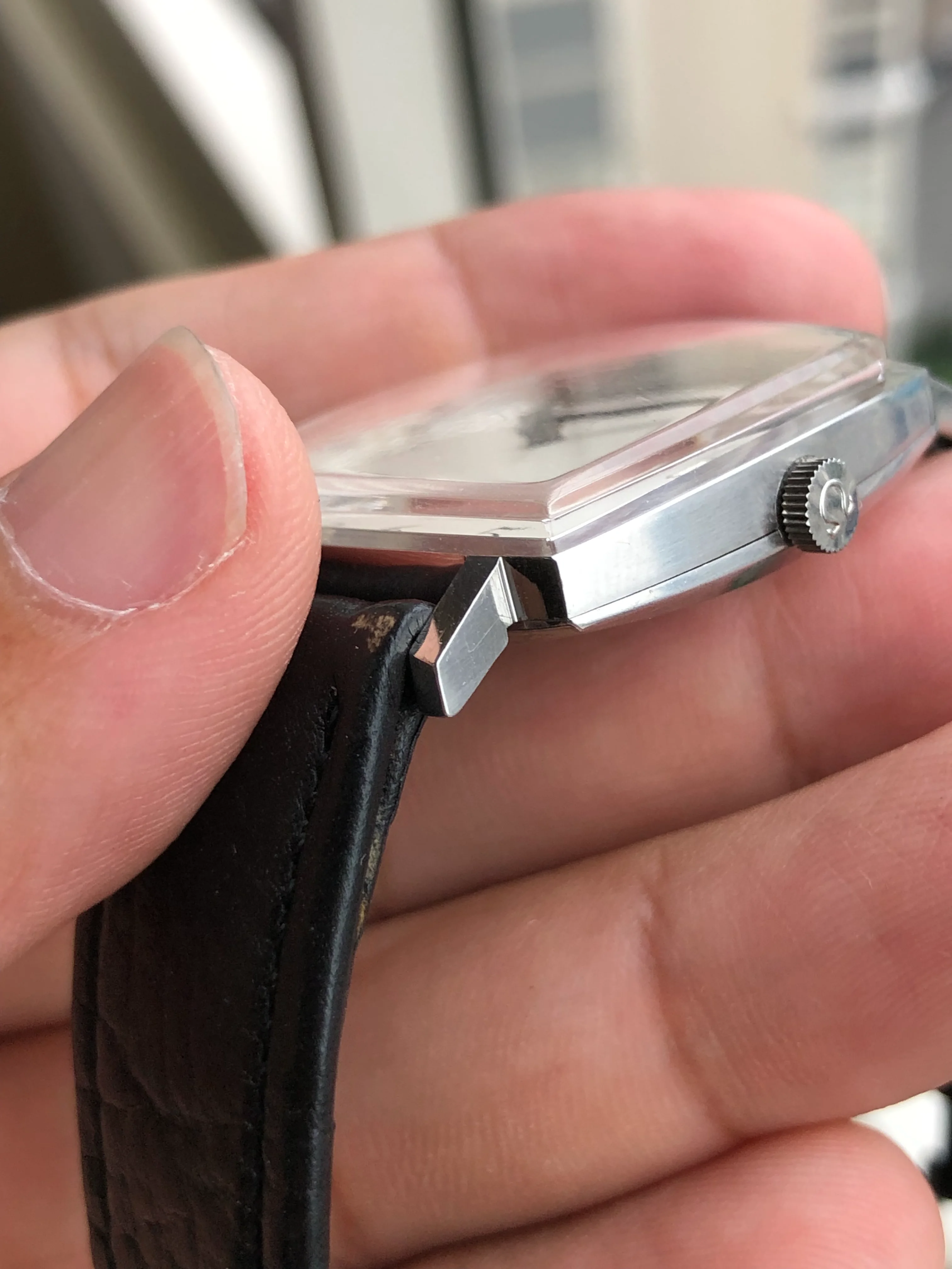 - Dial: Original matte white rectangular dial with printed arabic hour markers, black leaf hands, date-aperture frame at 3; prints, hands and hour markers are all good. The dial surface has been aged and has some damages at the edge (details are shown in photos below).