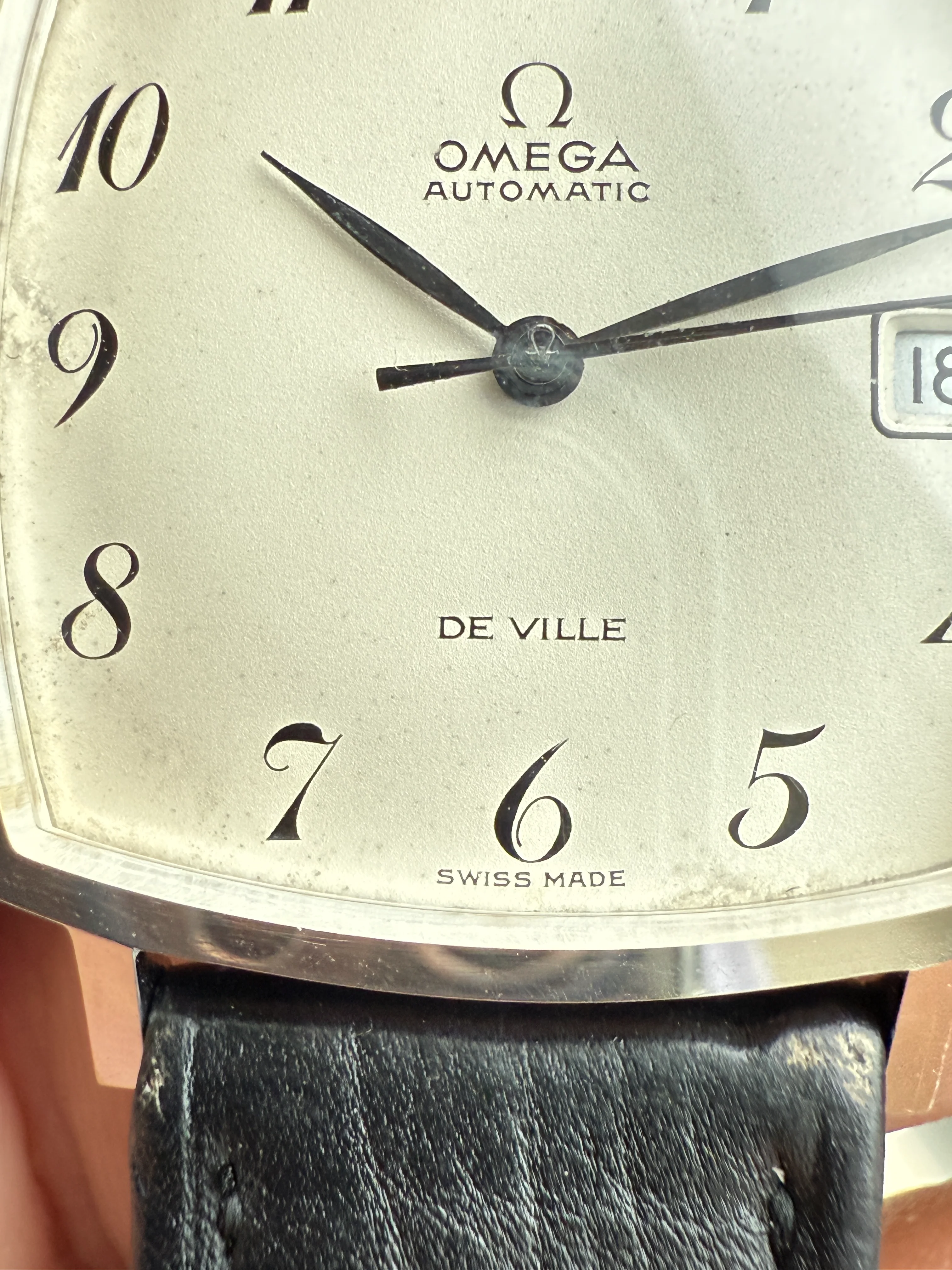 A stainless steel Omega 162.025, matte white rectangular dial with printed arabic hour markers, black leaf hands, Omega leather strap and box, serviced, shipping fee with insurance in EU included.
