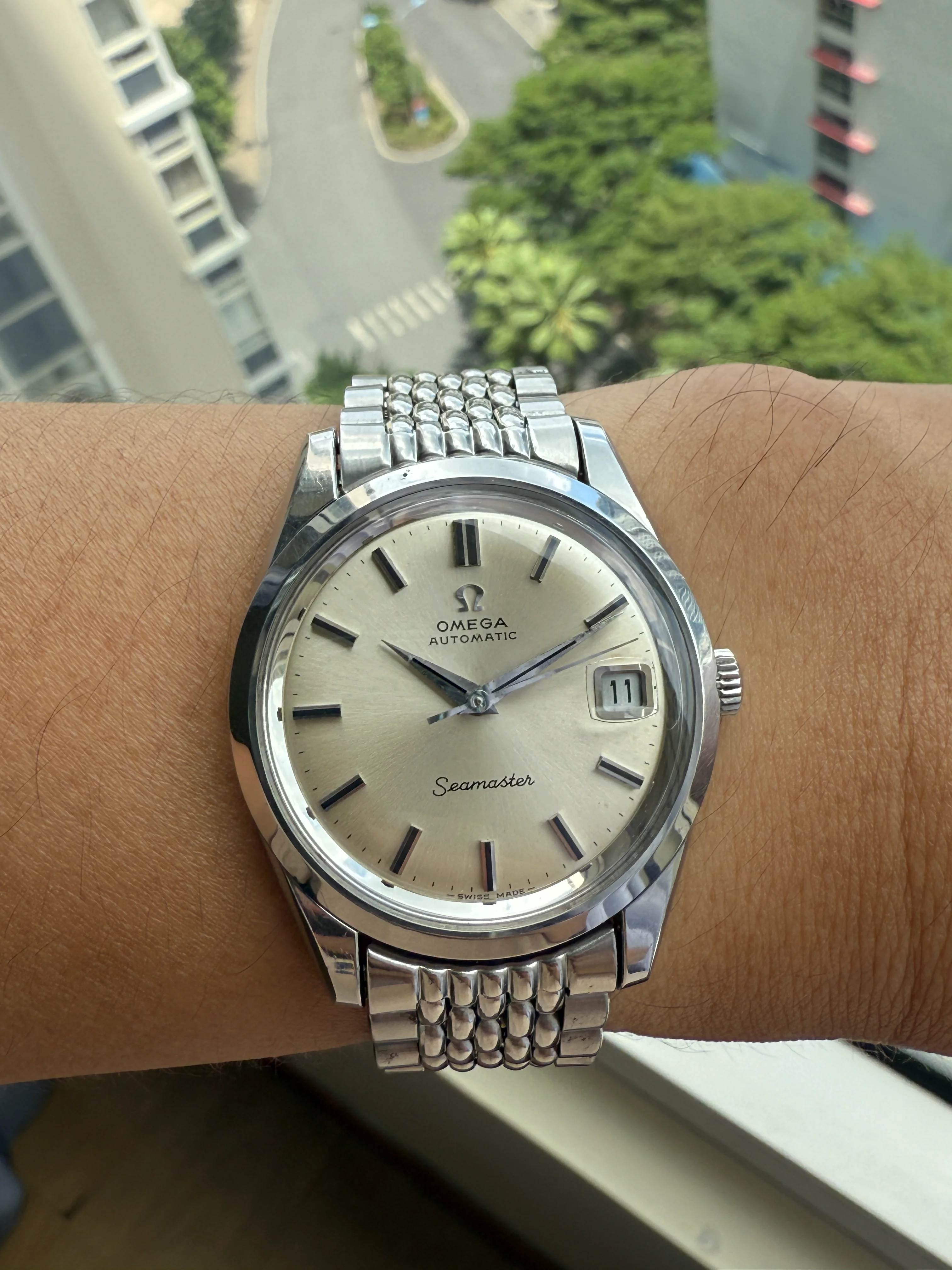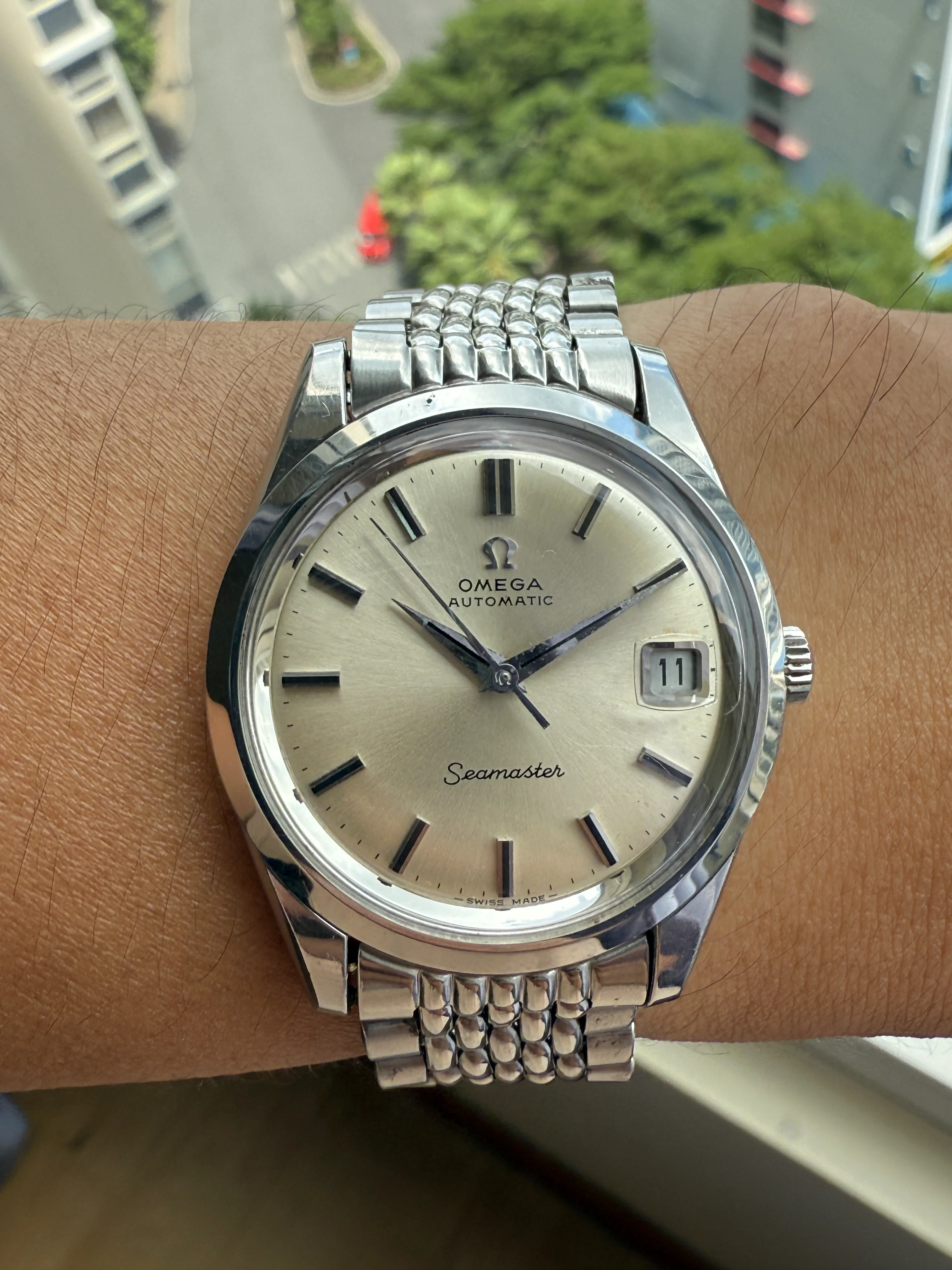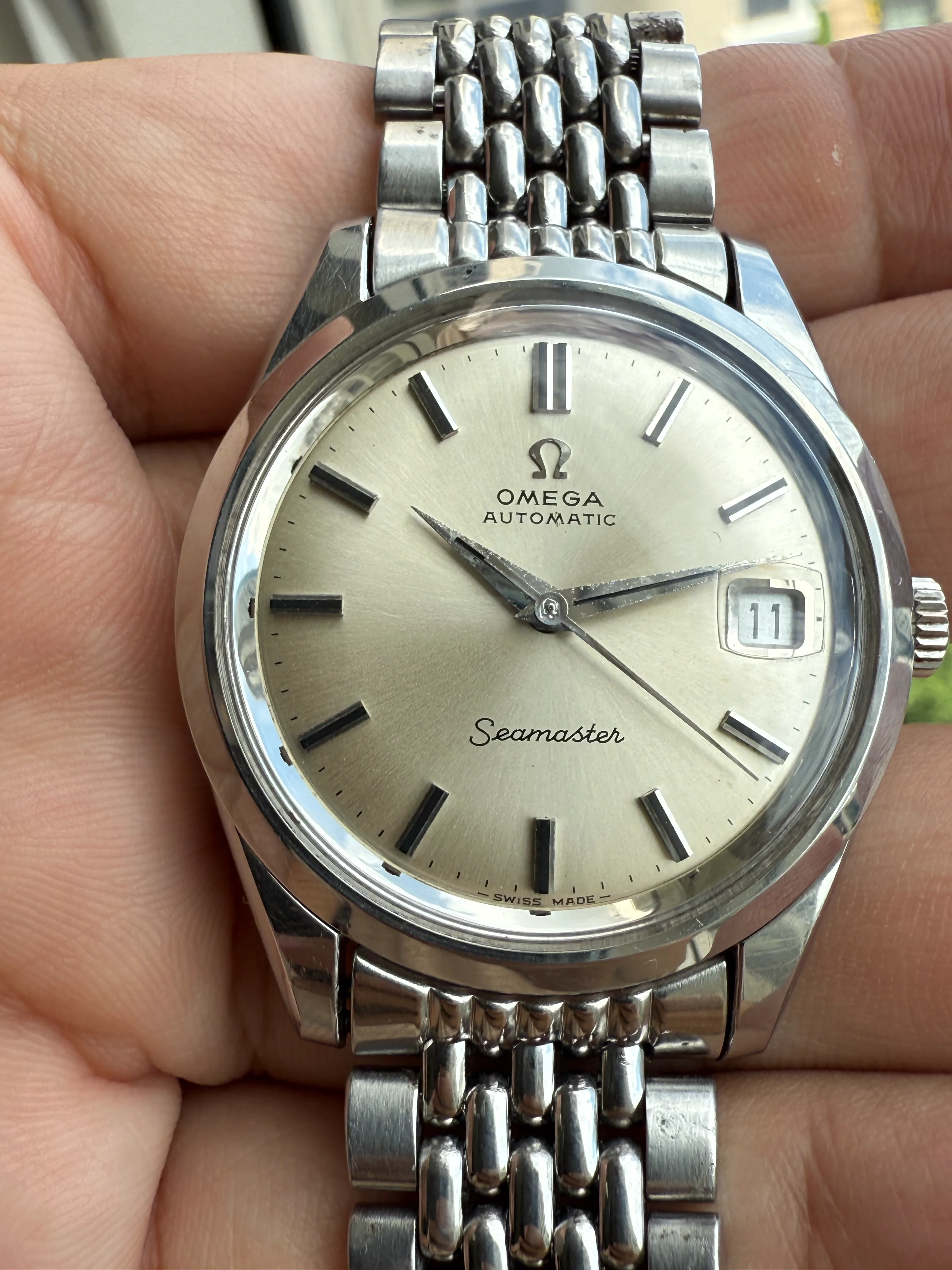 A stainless steel Omega 166.010, original dial with black painted hour markers, original Omega 1036/11 bracelet in very good condition, serviced, shipping fee with insurance in EU/US included.