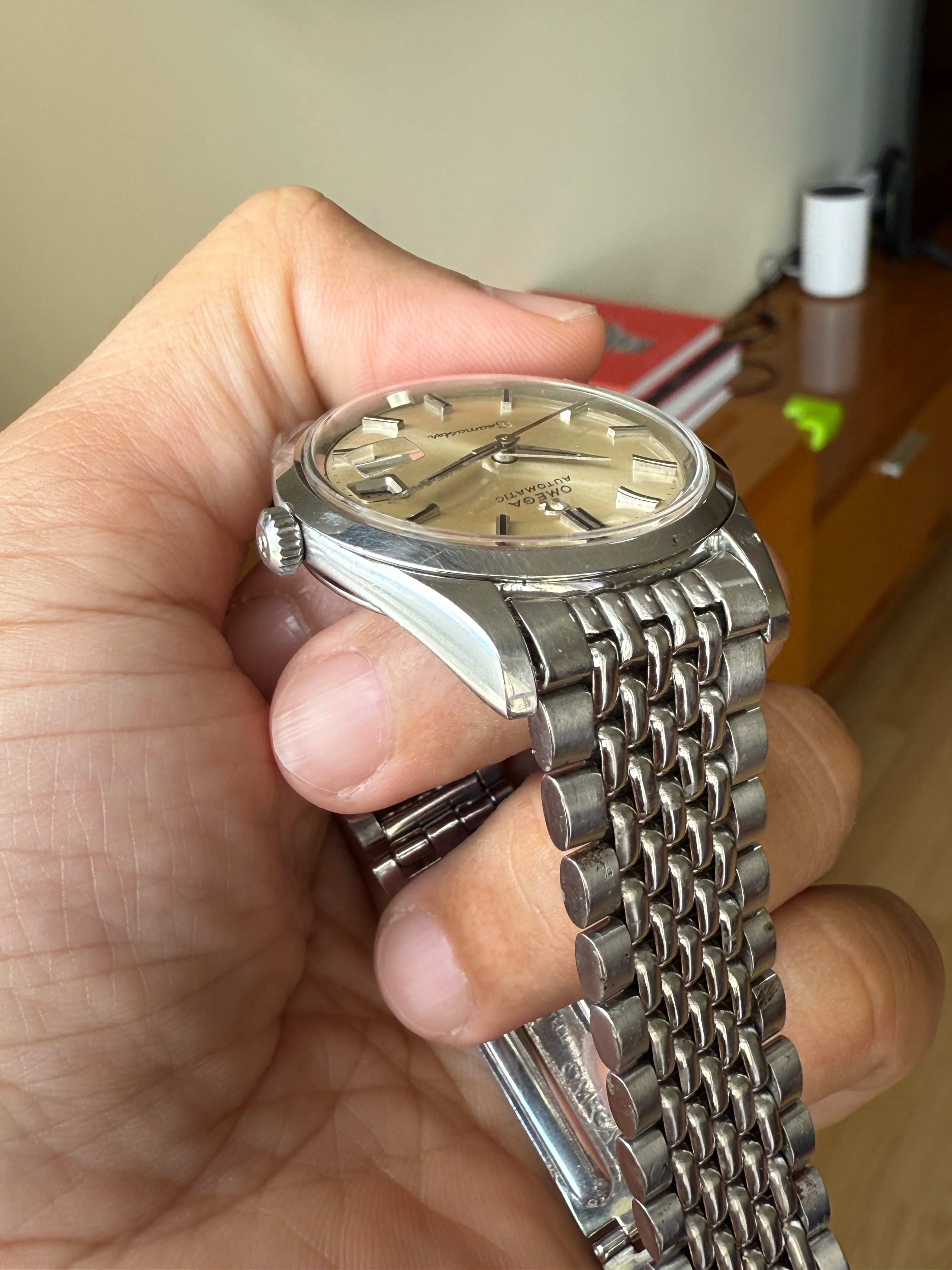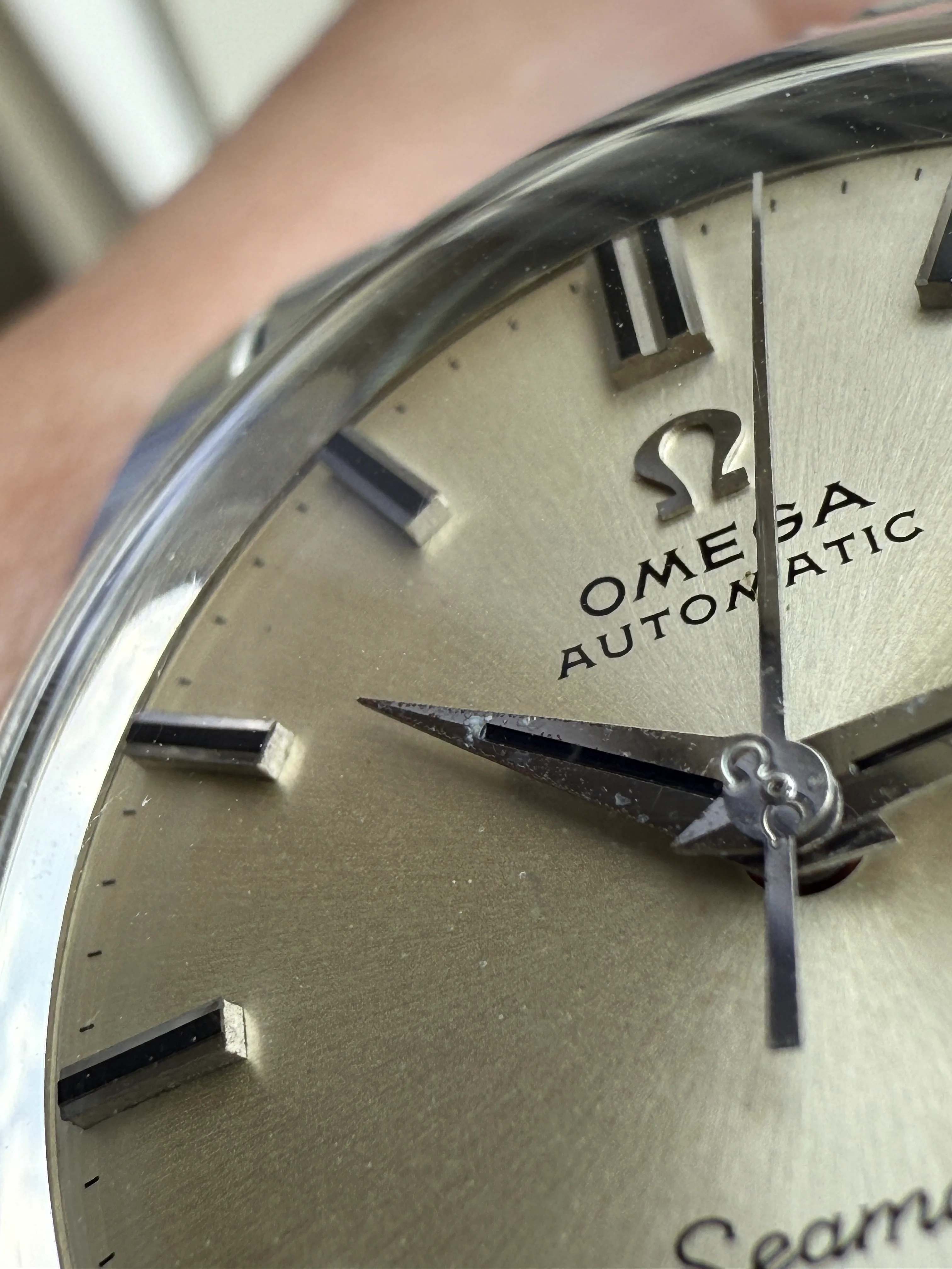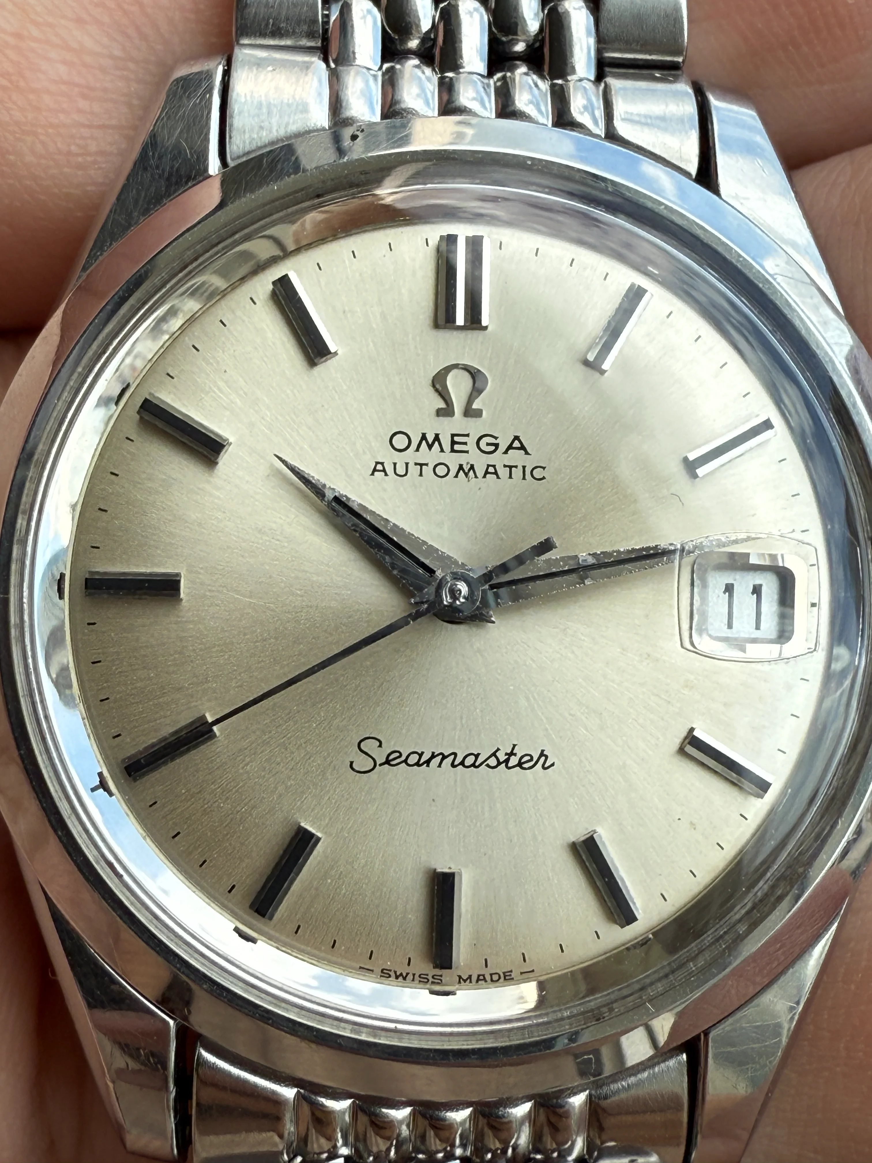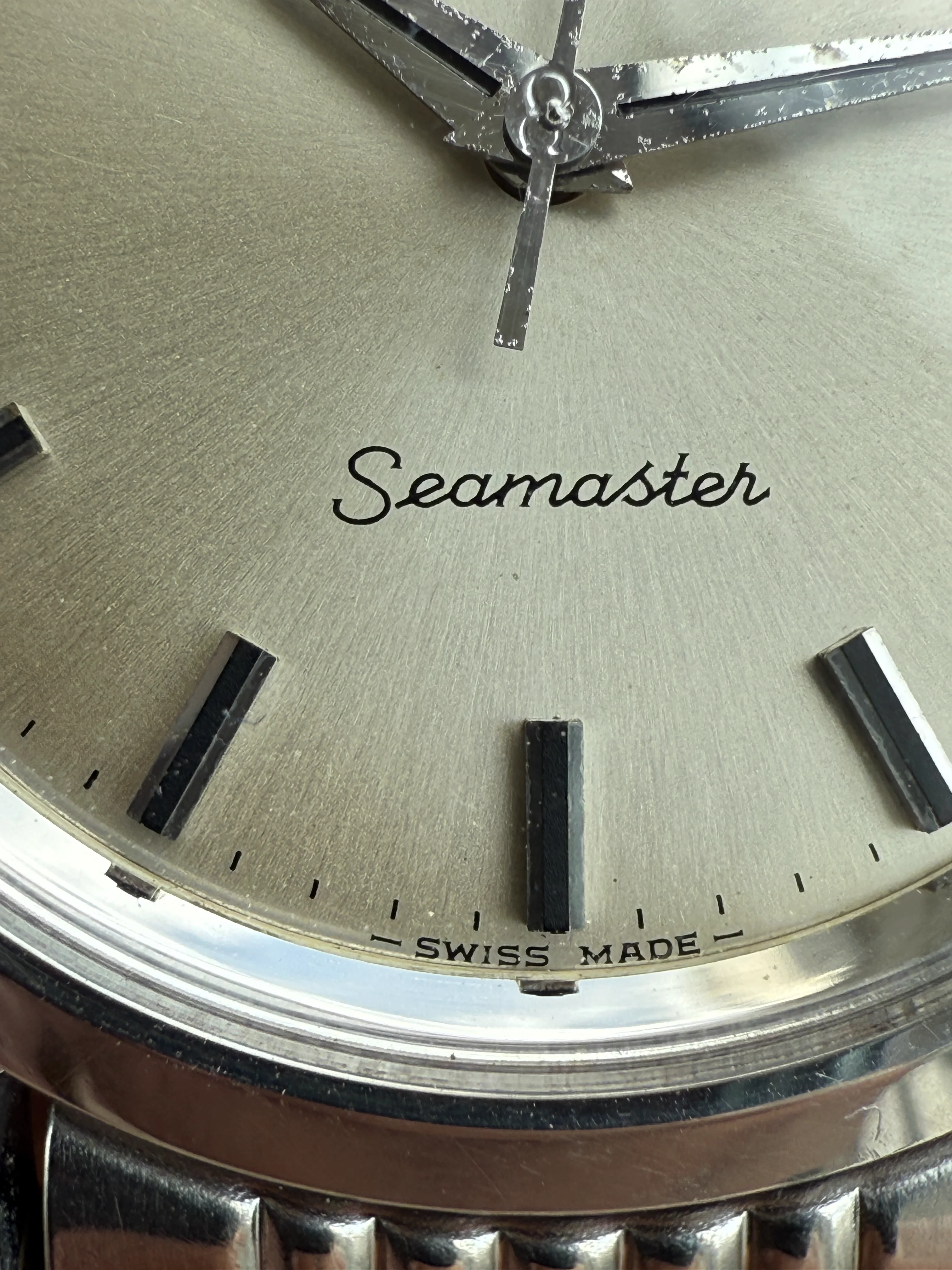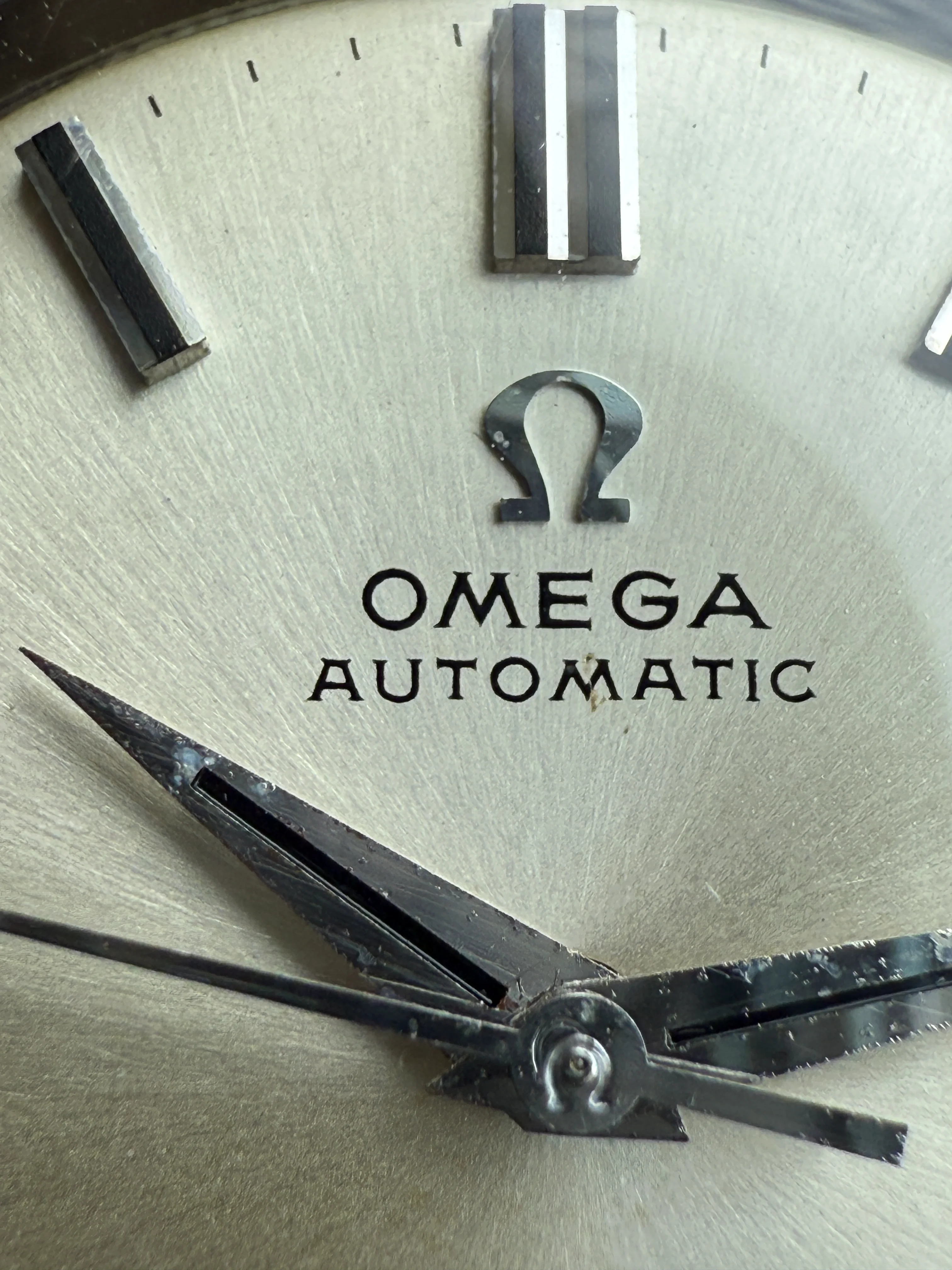 - Dial: Original white sunburst dial with black painted hour markers in good condition; date-aperture frame at 3; dauphine hands with signs of age; prints and hour markers are all good. There is a small stain at the OMEGA script.