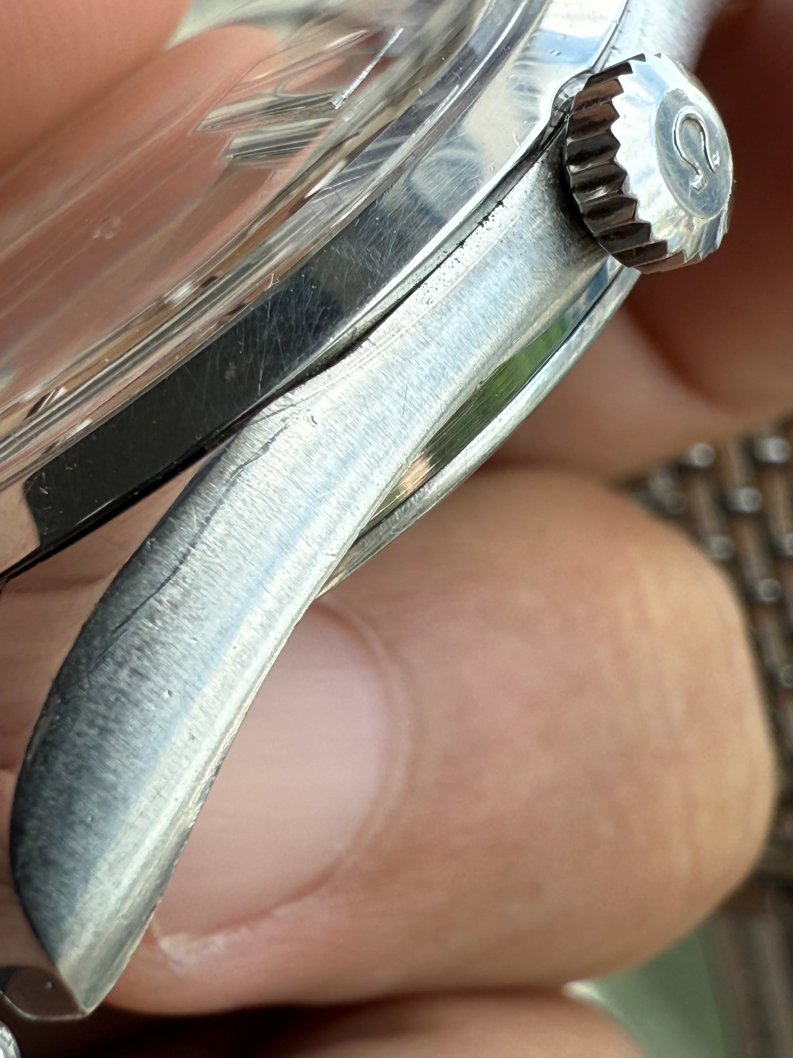 - Case: The diameter is 35mm without the crown. Original case is in good condition. Original Omega knurled crown.
