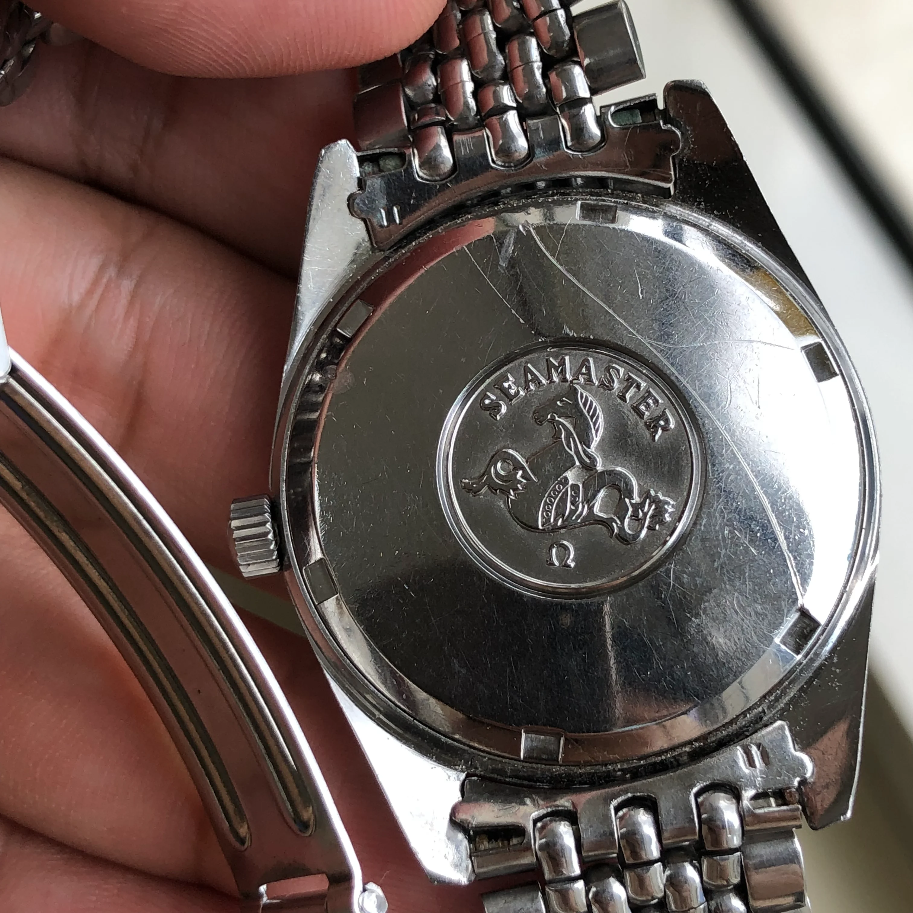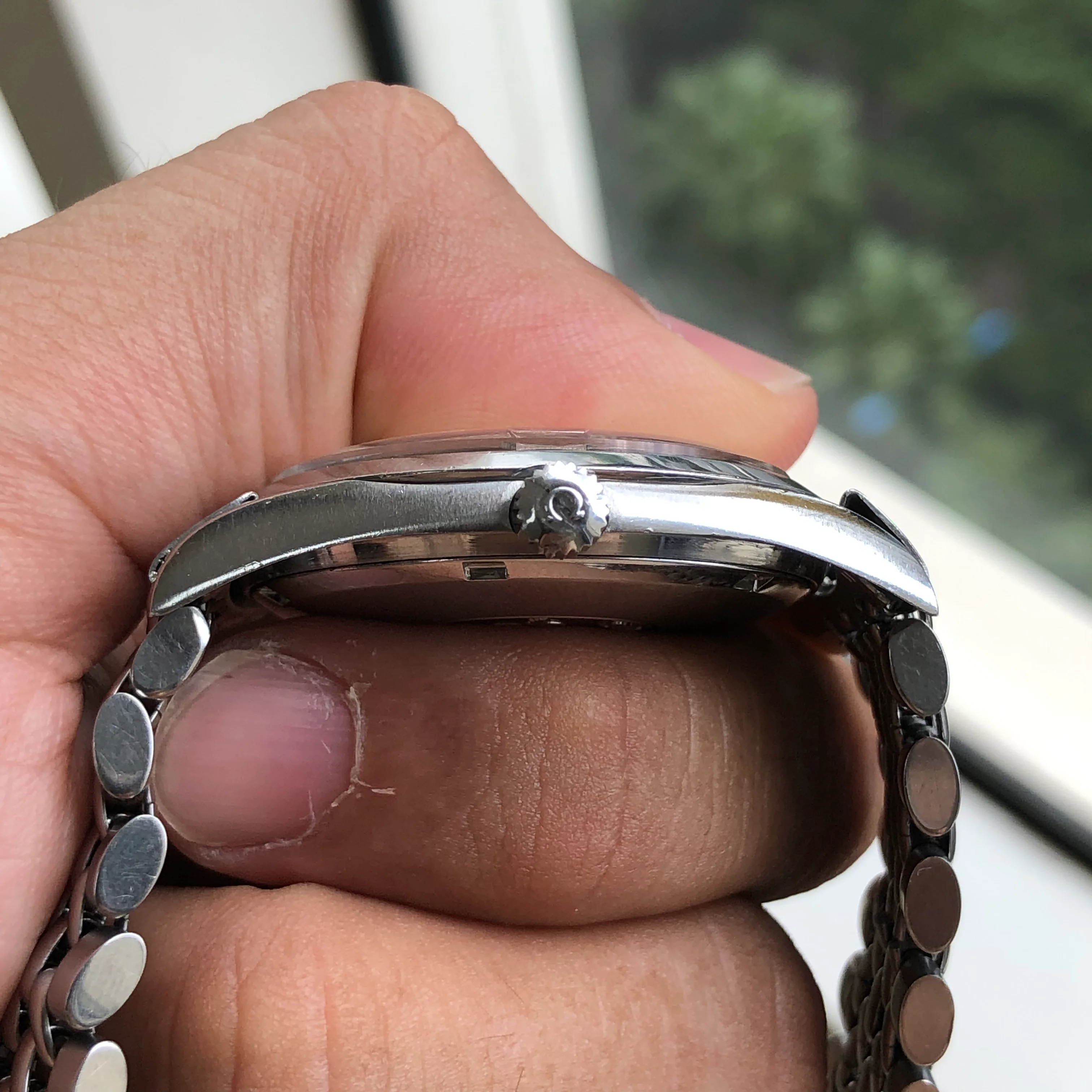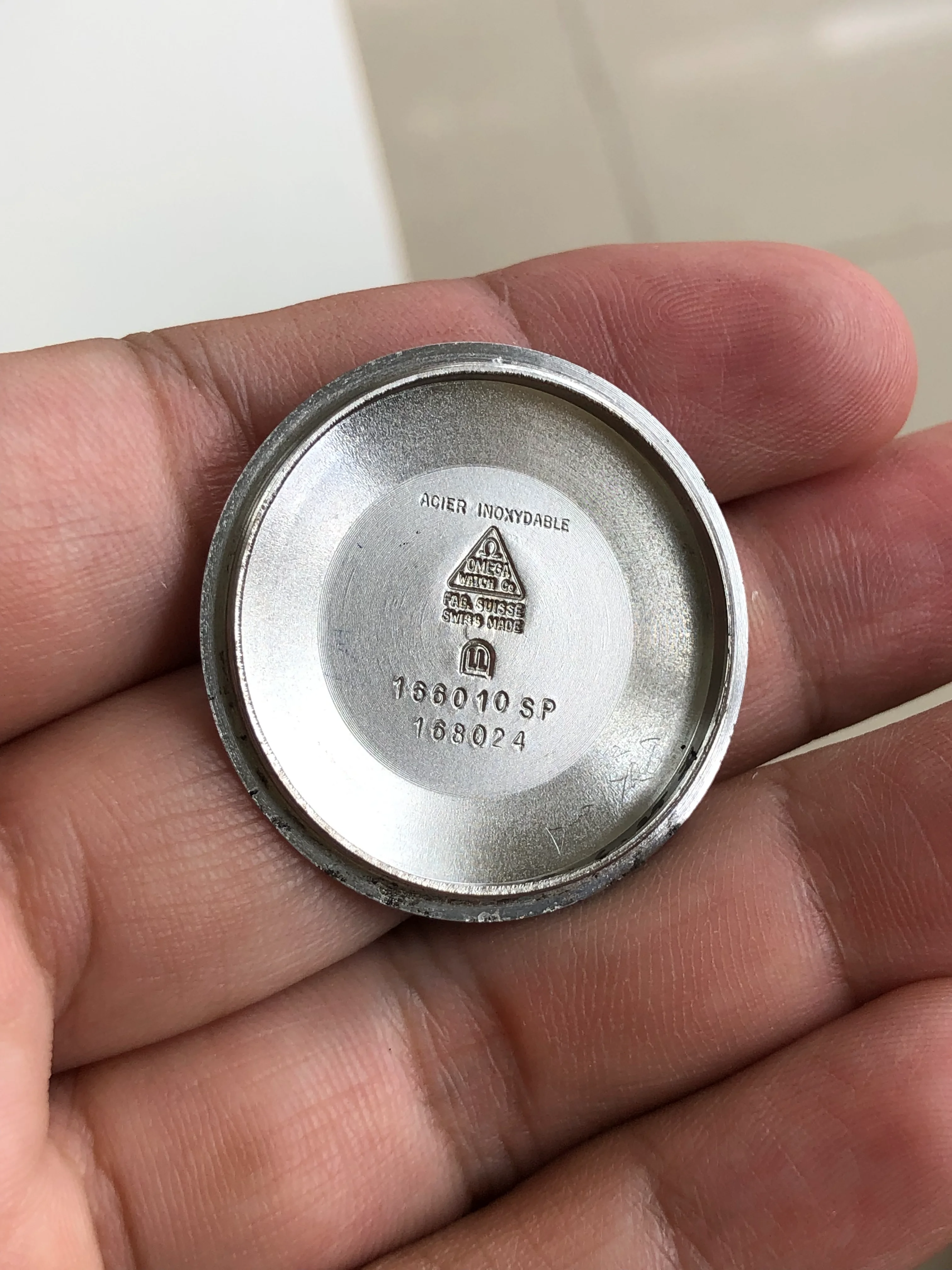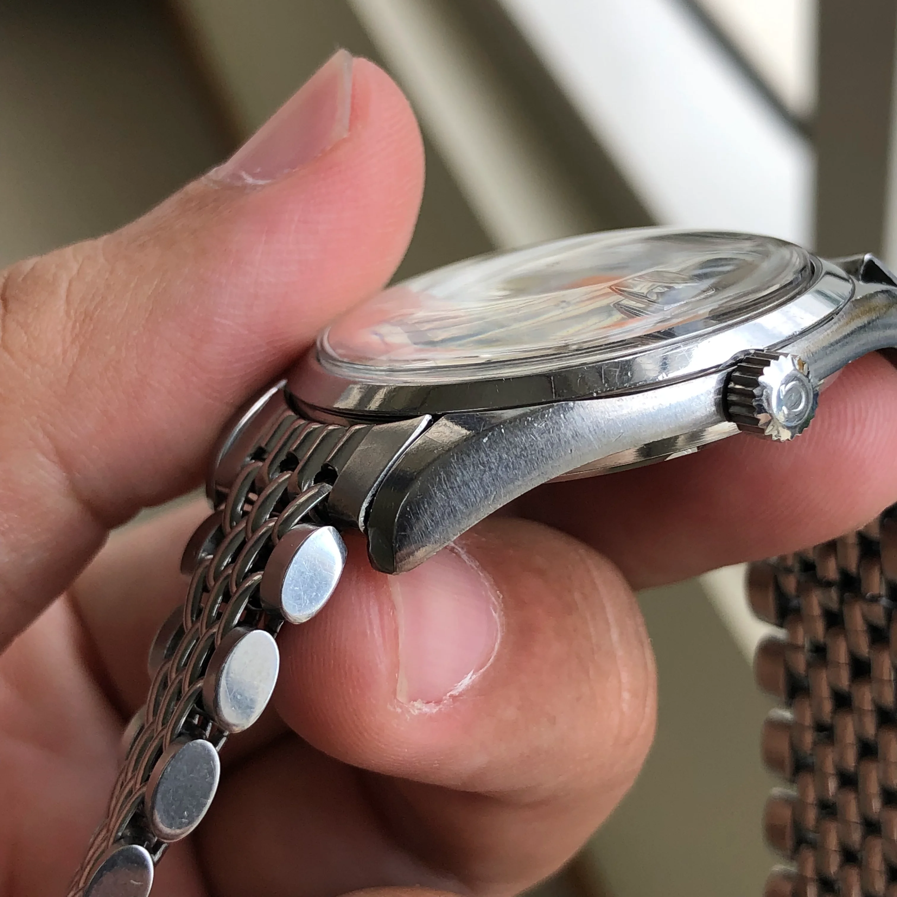 - Case: The diameter is 35mm without the crown. Original case is in good condition with scratches, a small chip on the lug at 5. Original Omega knurled crown.