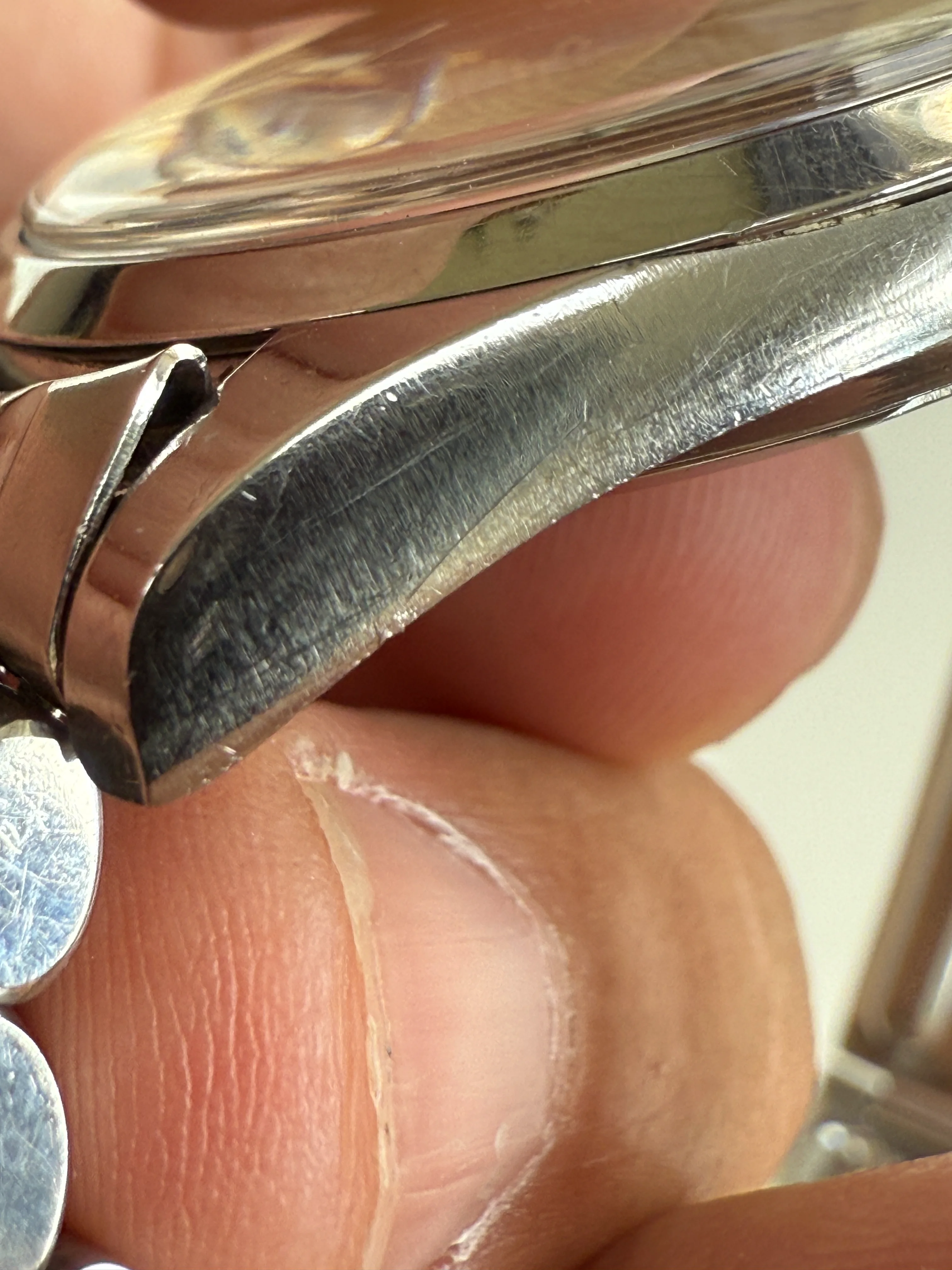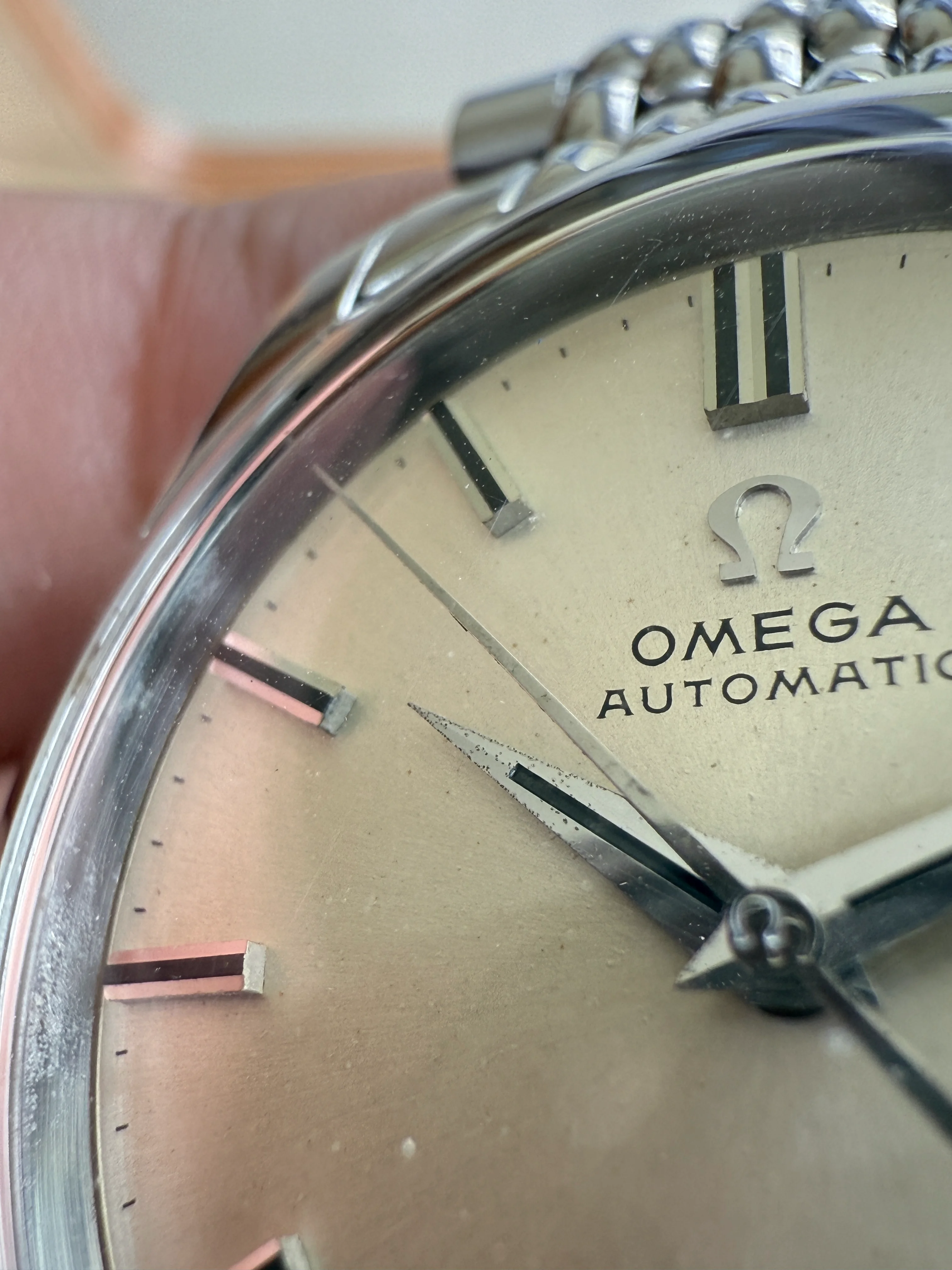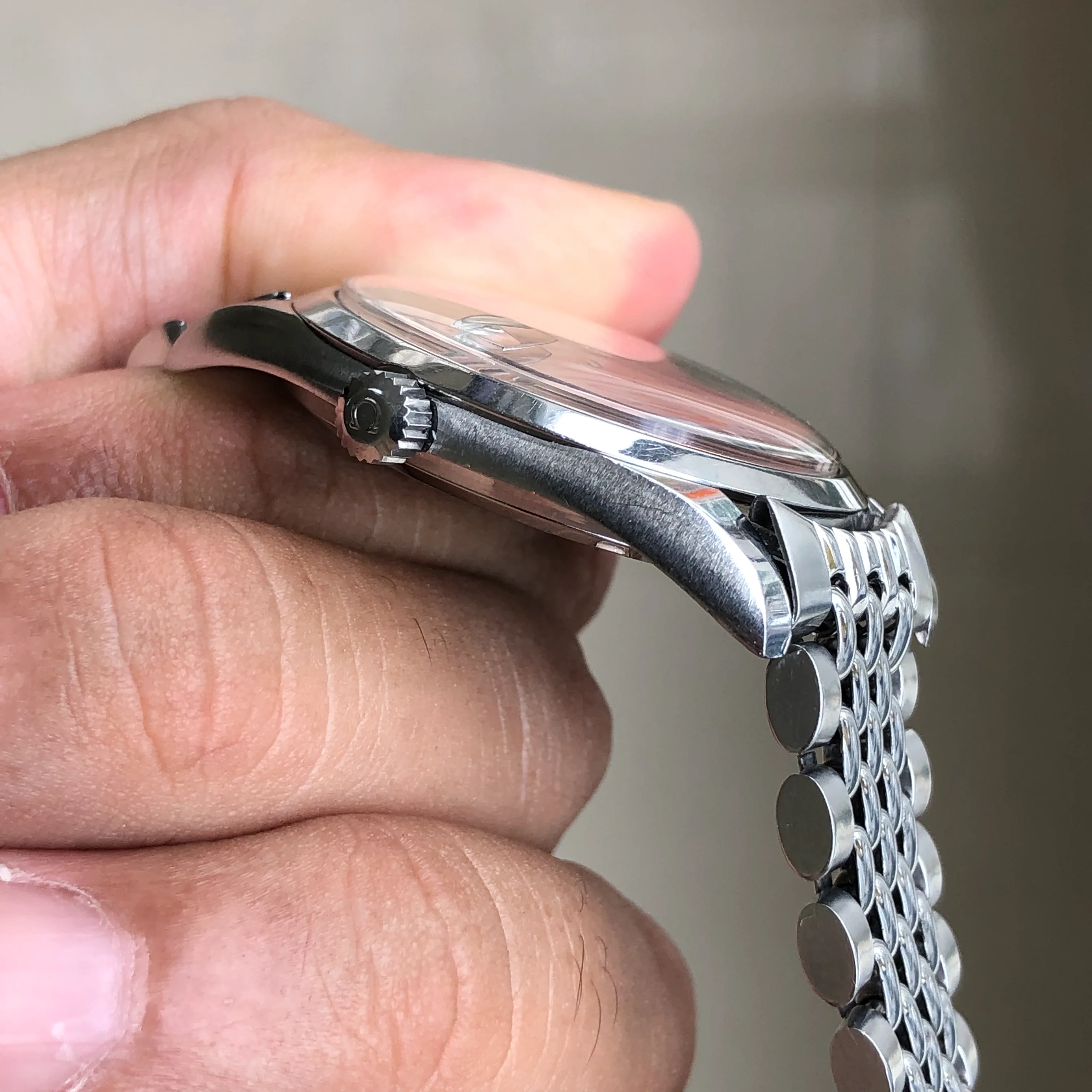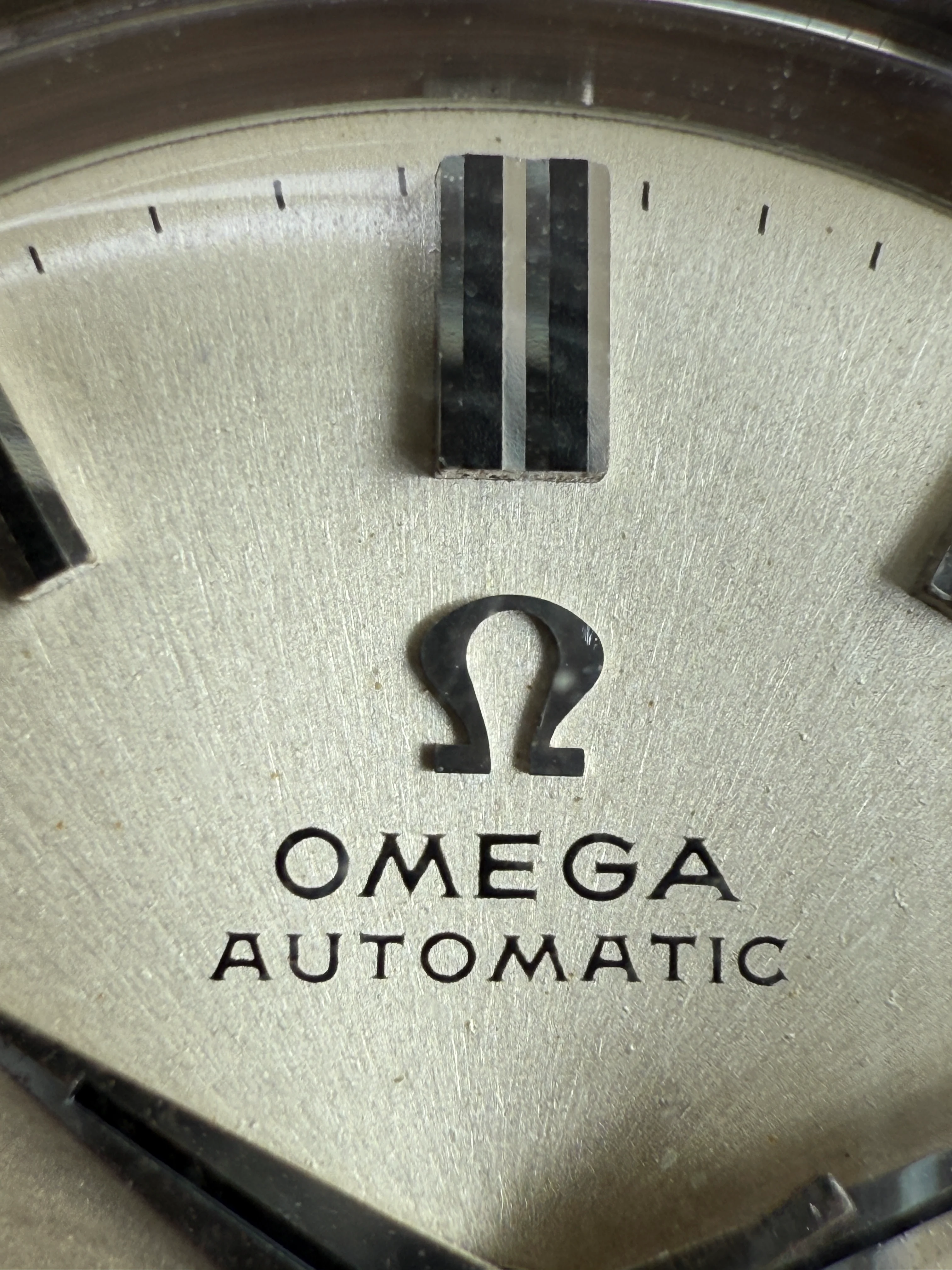 - Case: The diameter is 35mm without the crown. Original case is in good condition with scratches, a small chip on the lug at 5. Original Omega knurled crown.