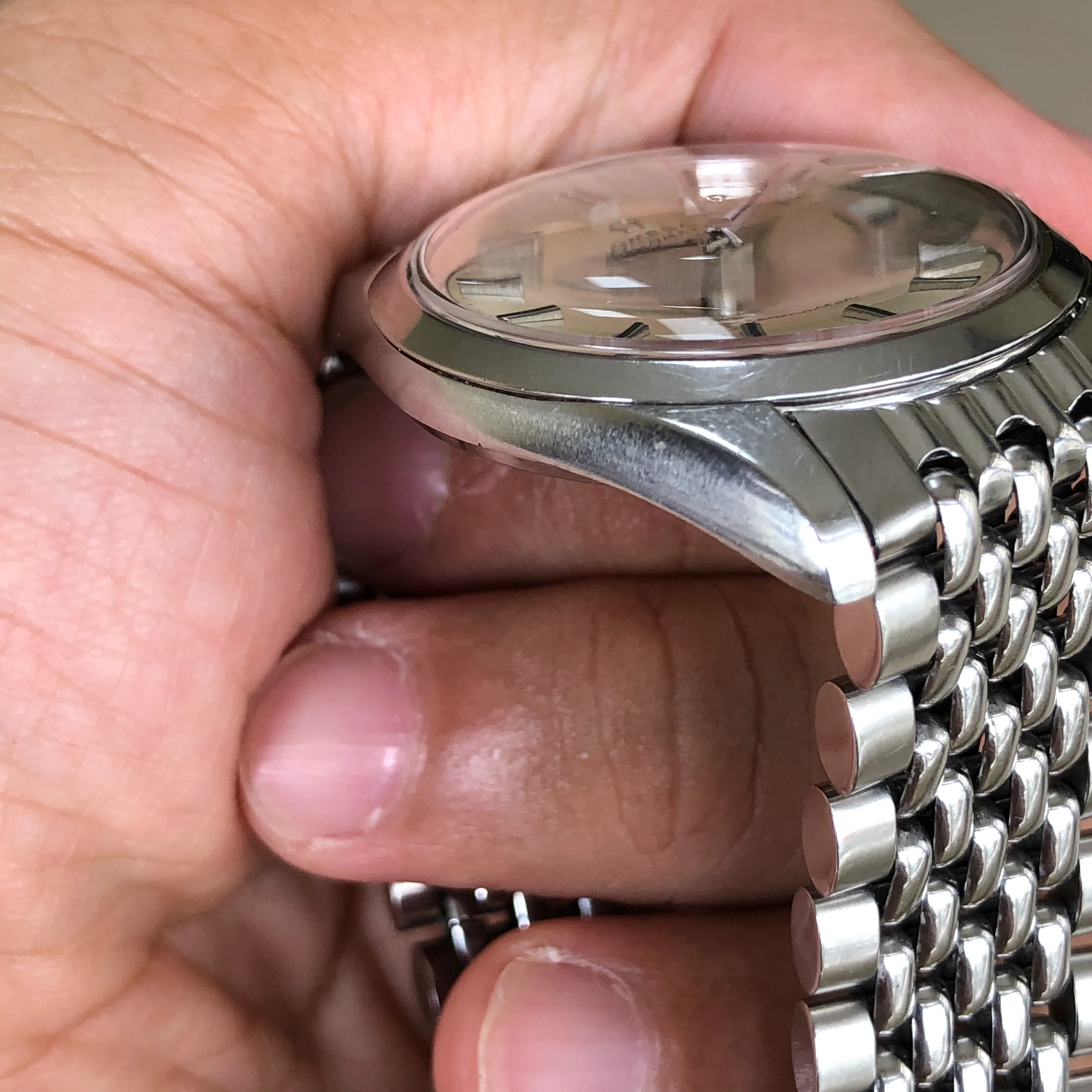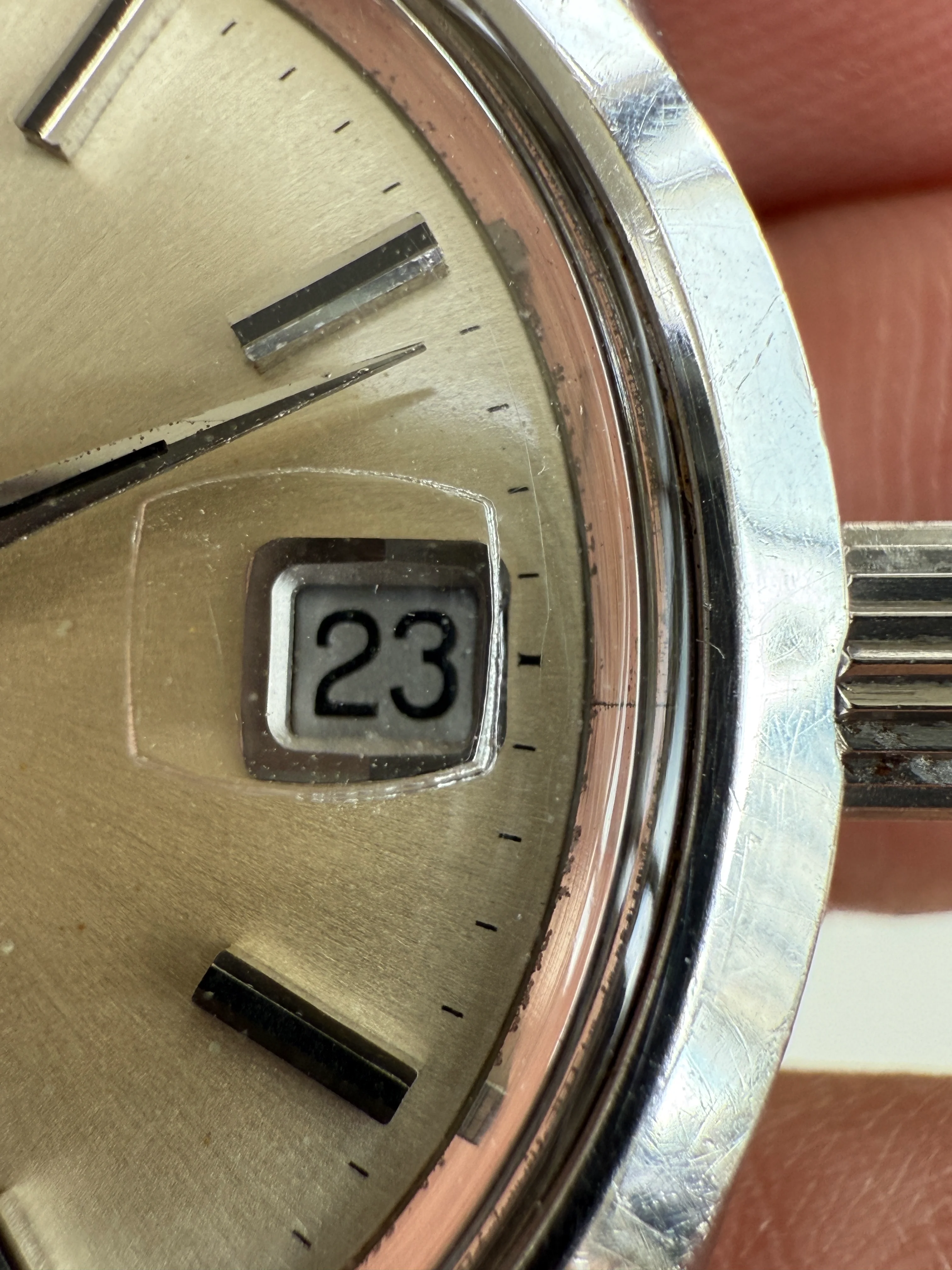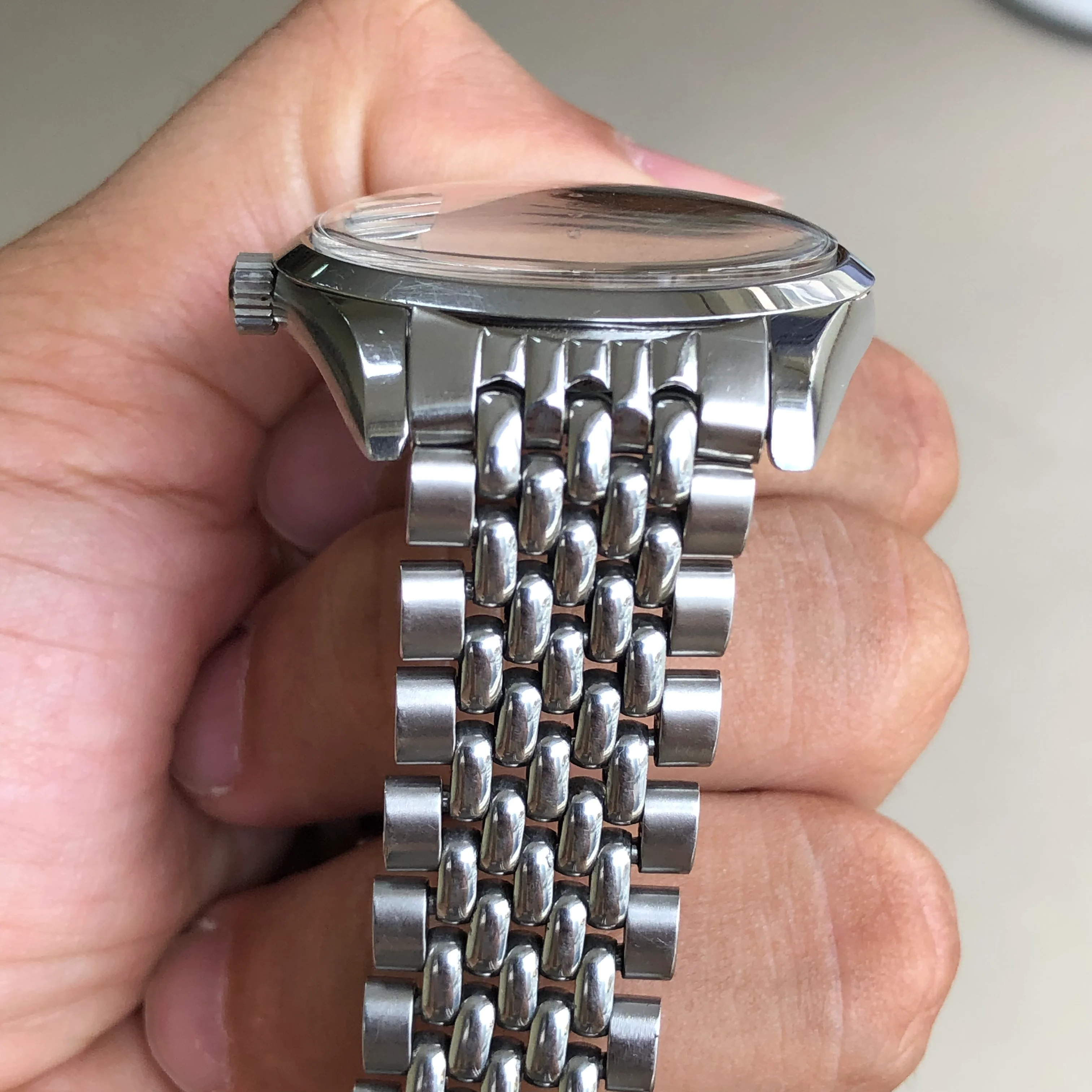 - Dial: Original white sunburst dial with black painted hour markers in good condition; faceted date-aperture frame at 3; dauphine hands; prints, hands and hour markers are all good.