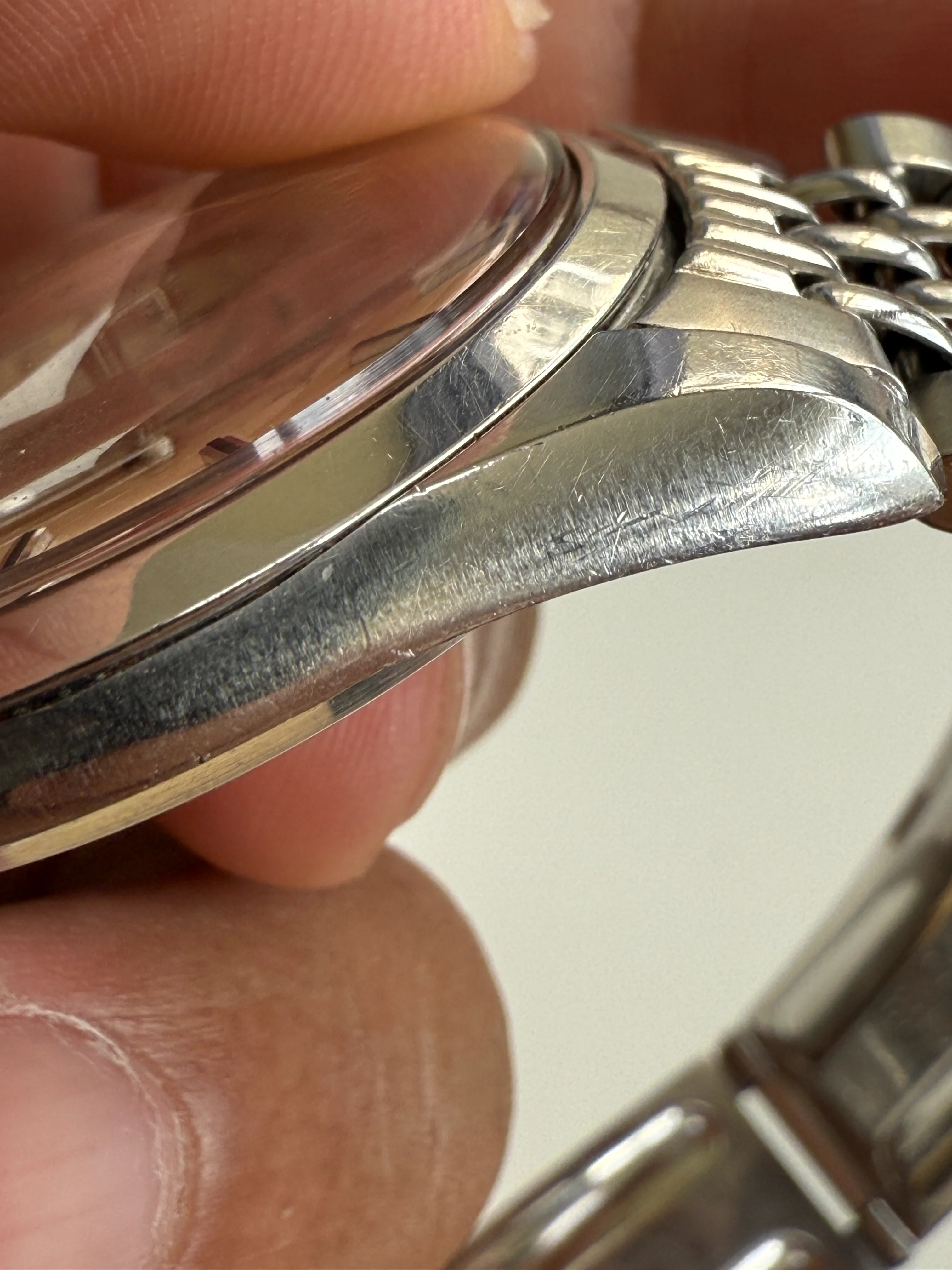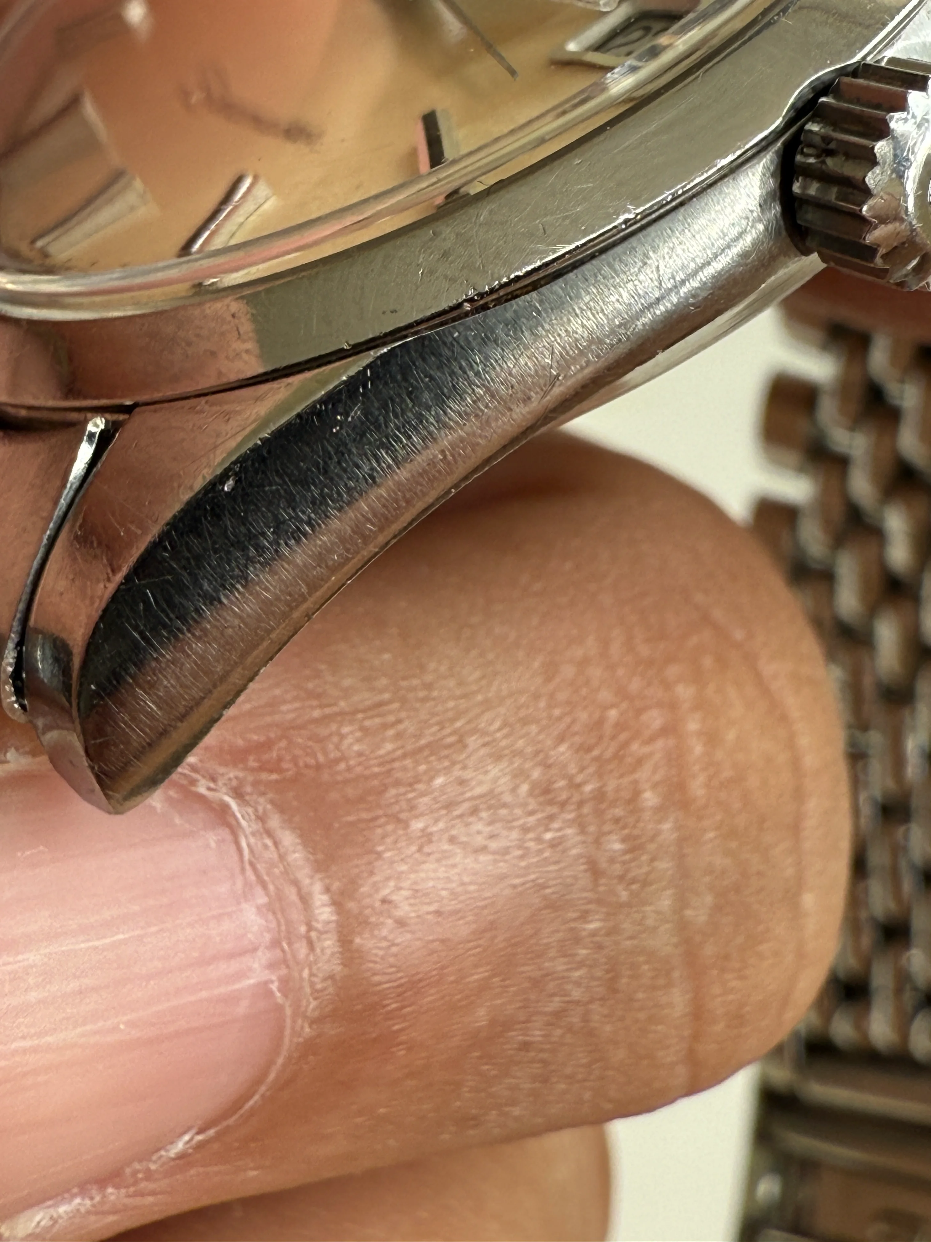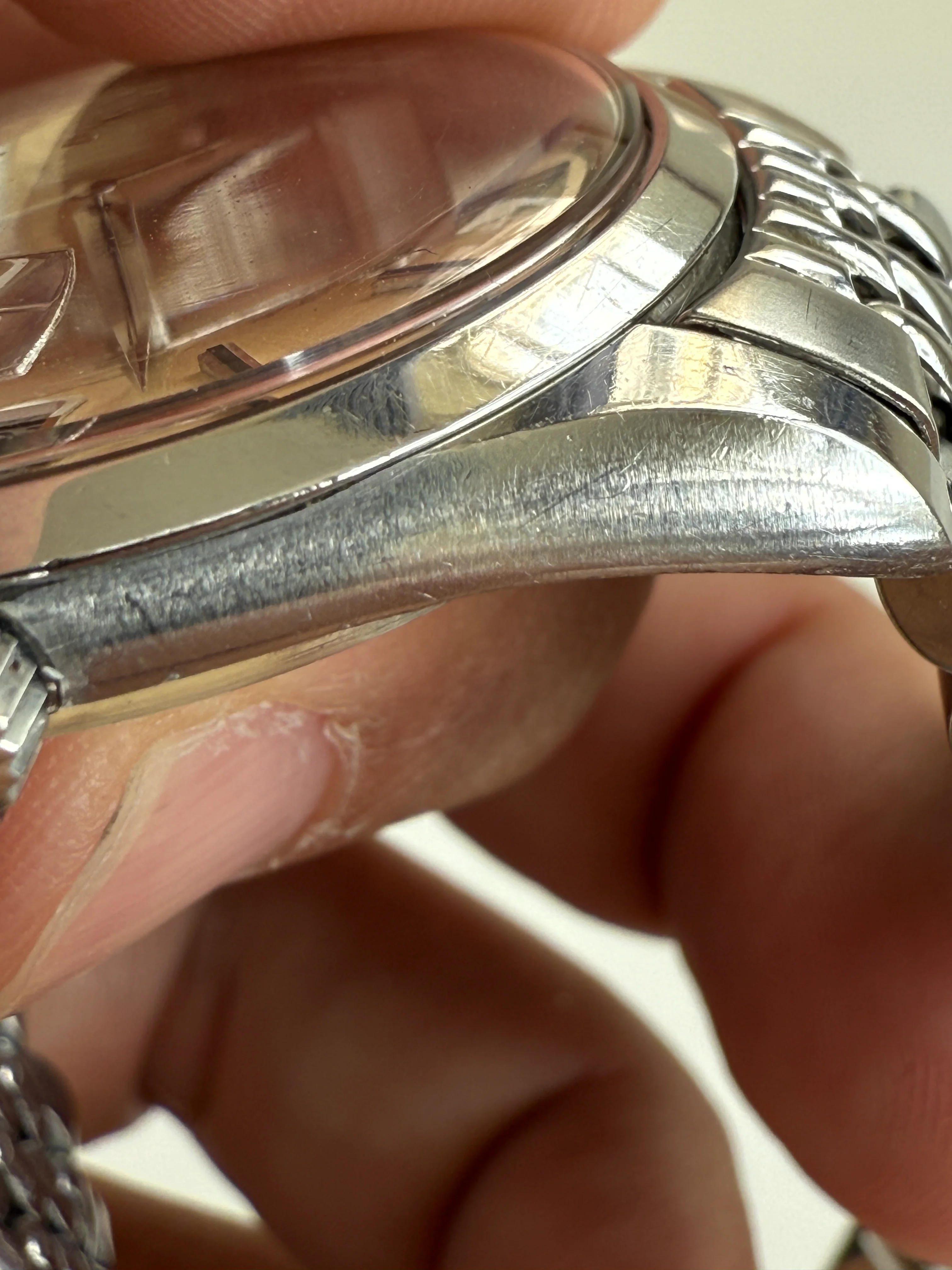 - Dial: Original white sunburst dial with black painted hour markers in good condition; faceted date-aperture frame at 3; dauphine hands; prints, hands and hour markers are all good.