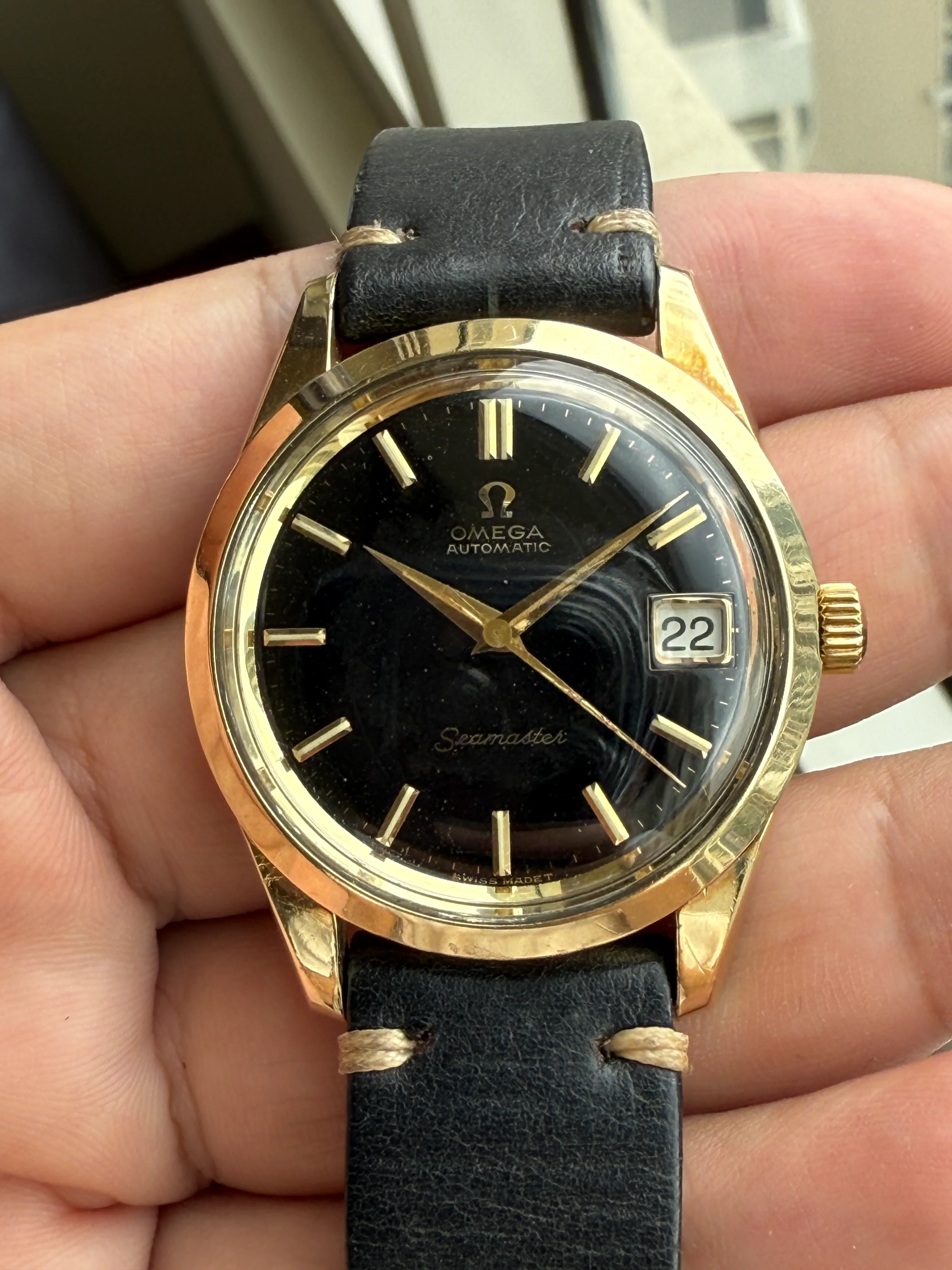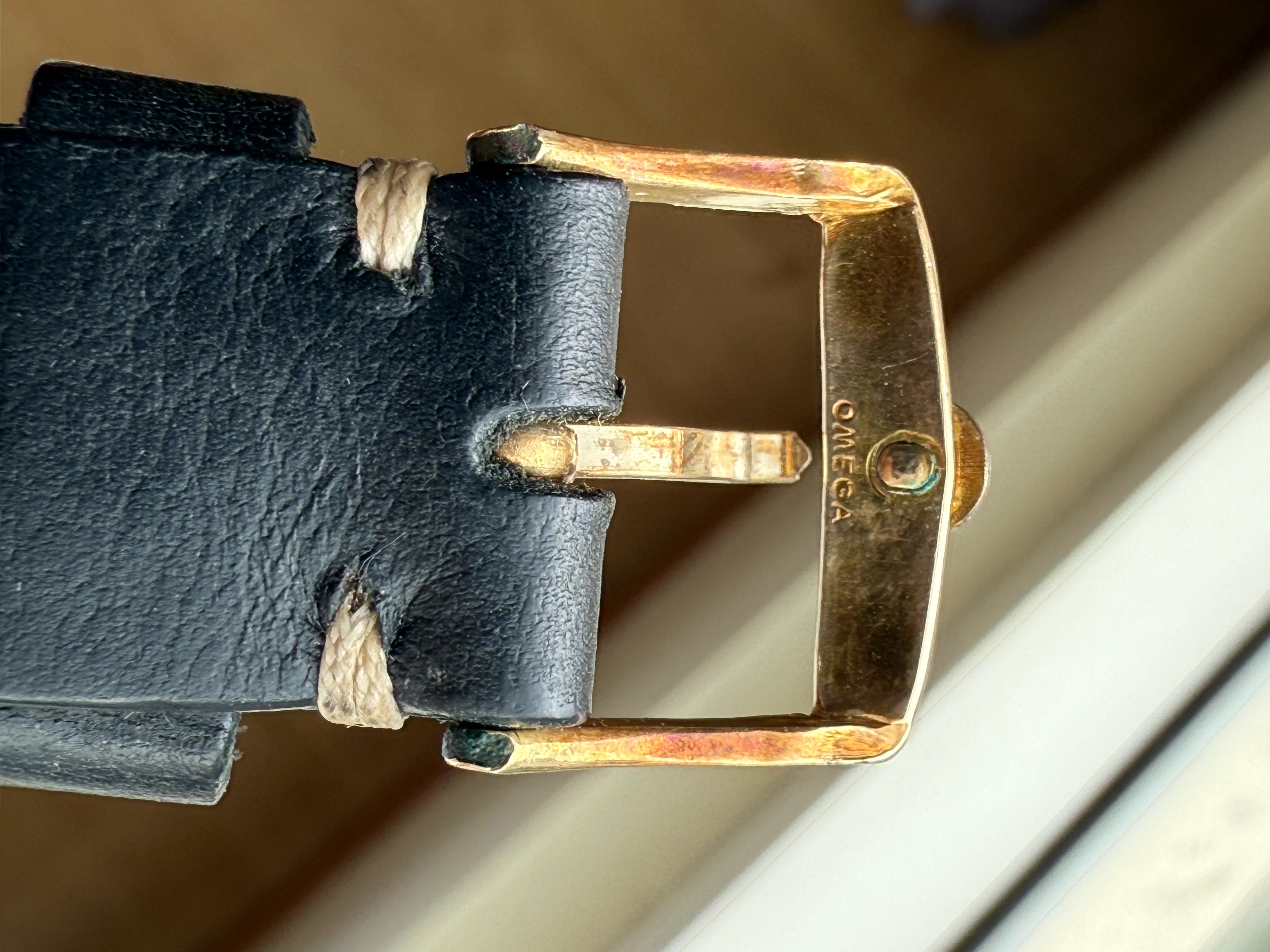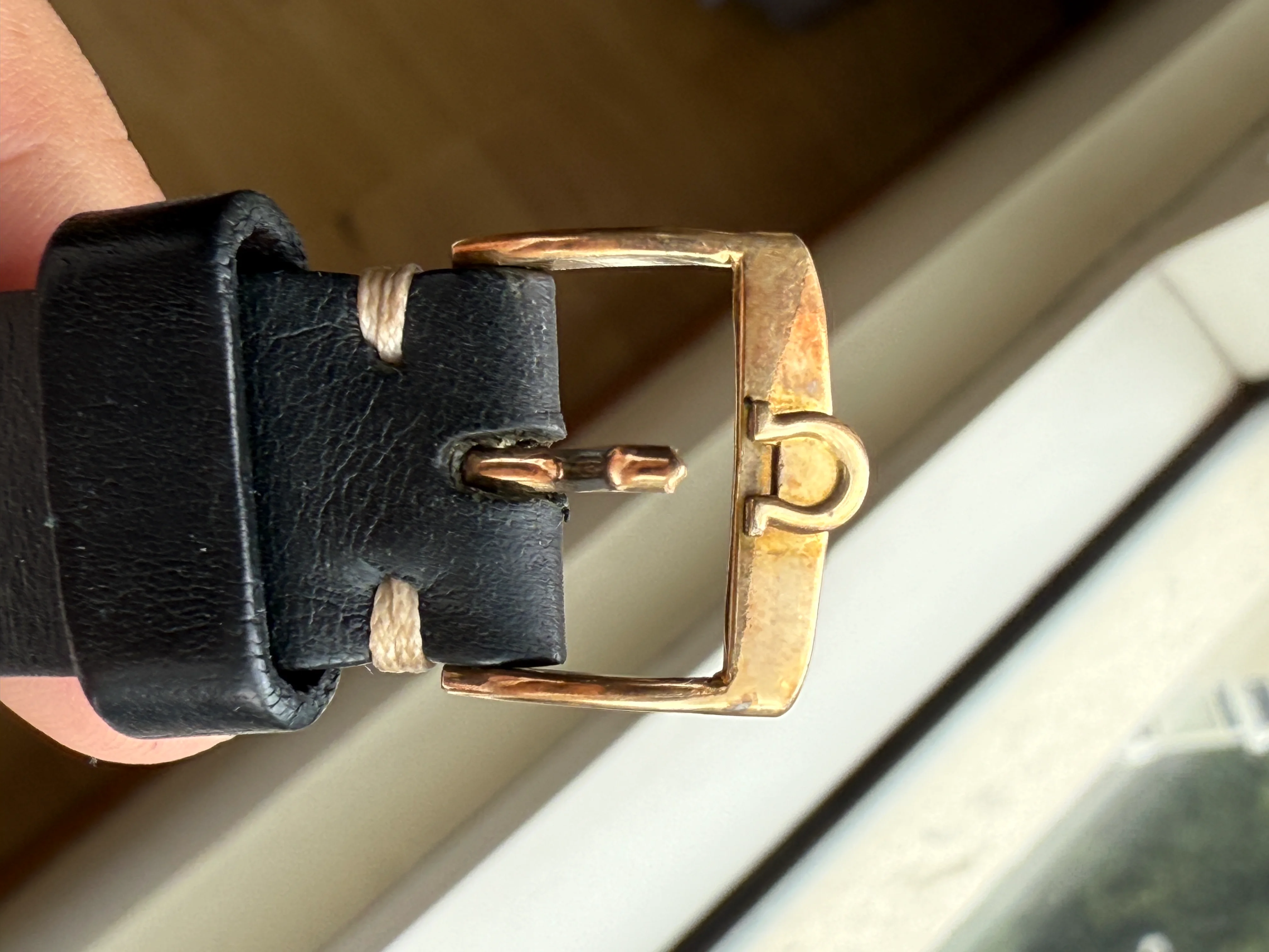 A gold capped Omega 166.010, original black gilt dial, hands and hour markers have tritium lume, leather strap with Omega buckle, serviced, shipping fee with insurance in EU included.