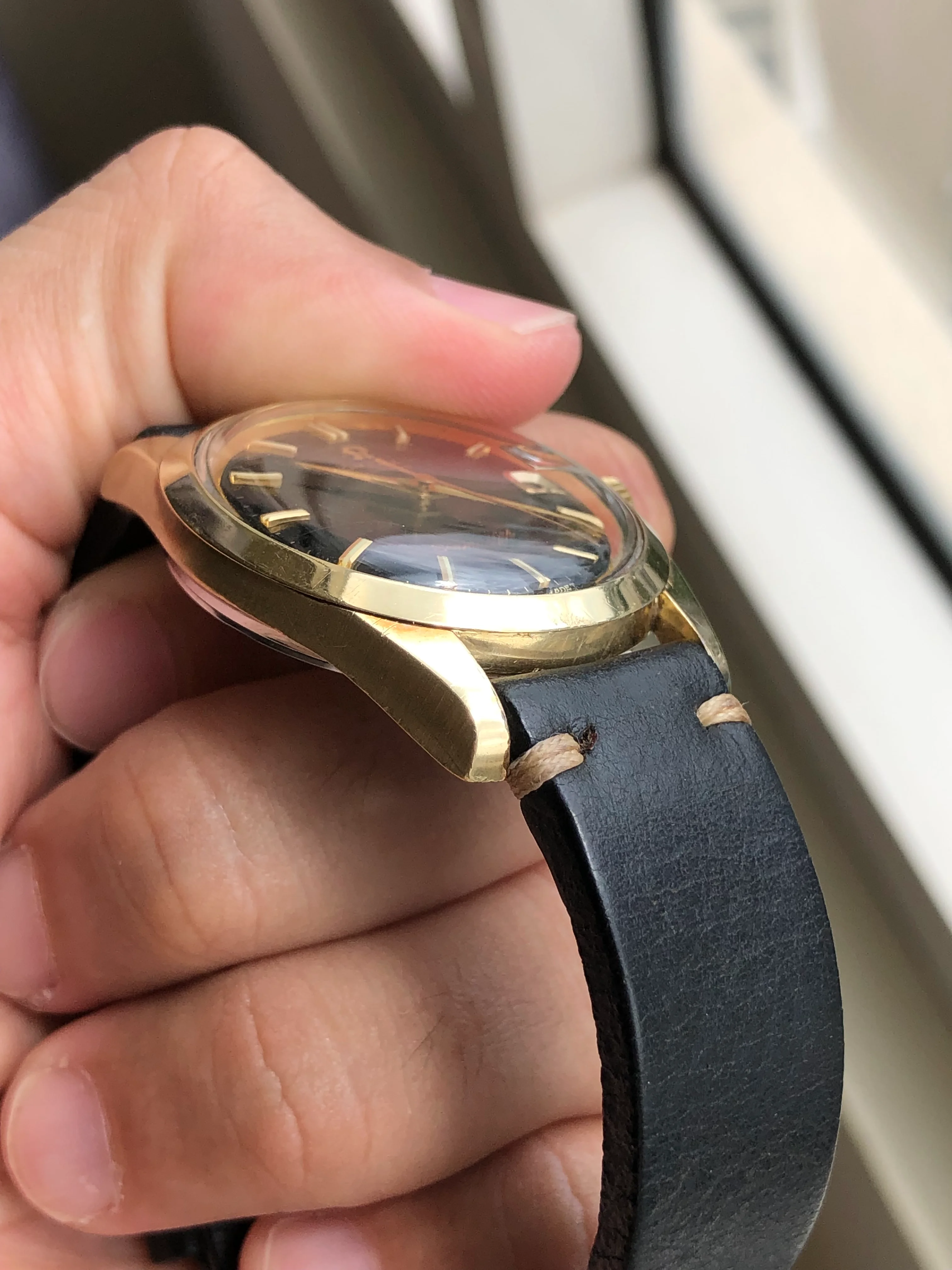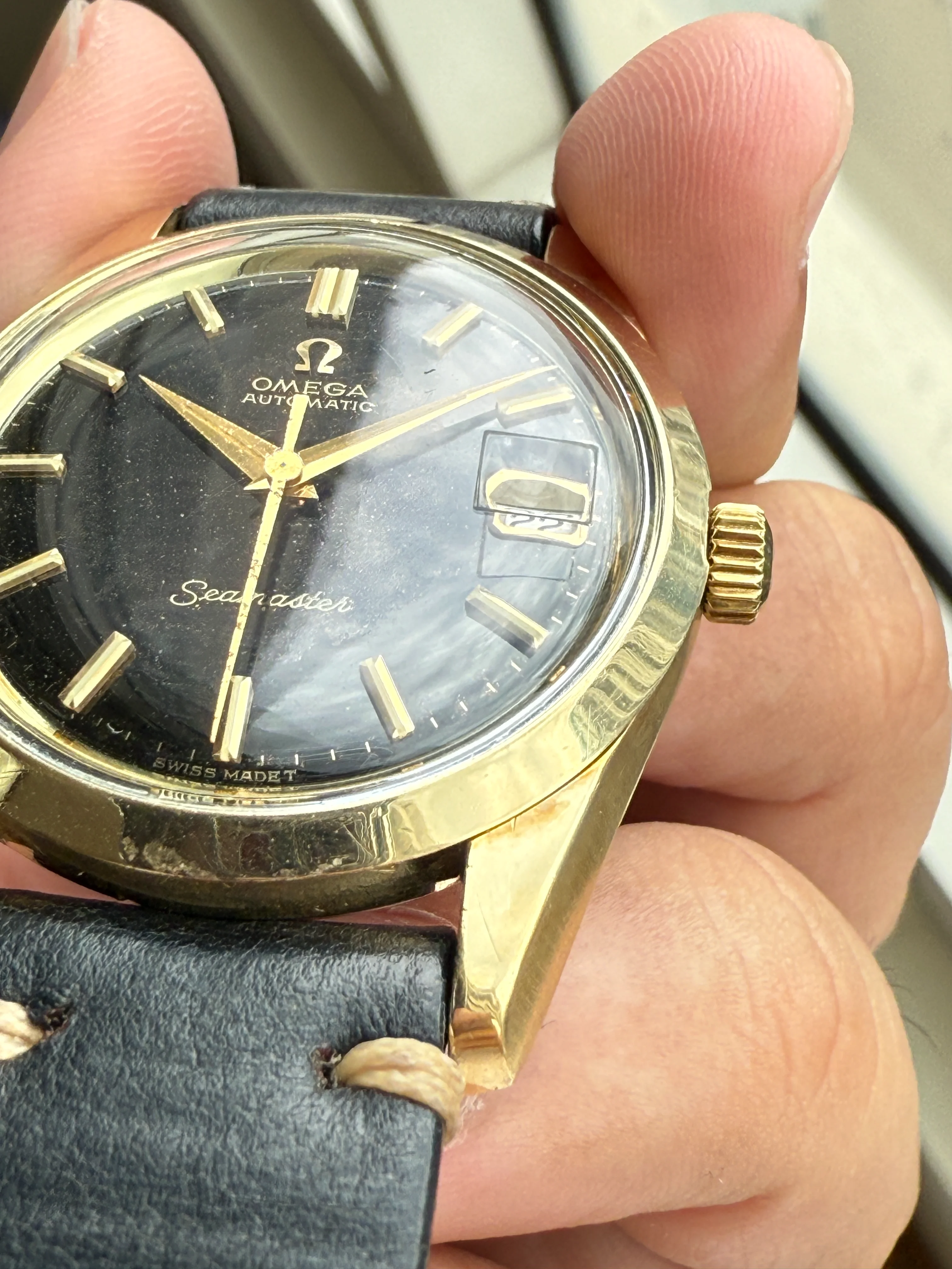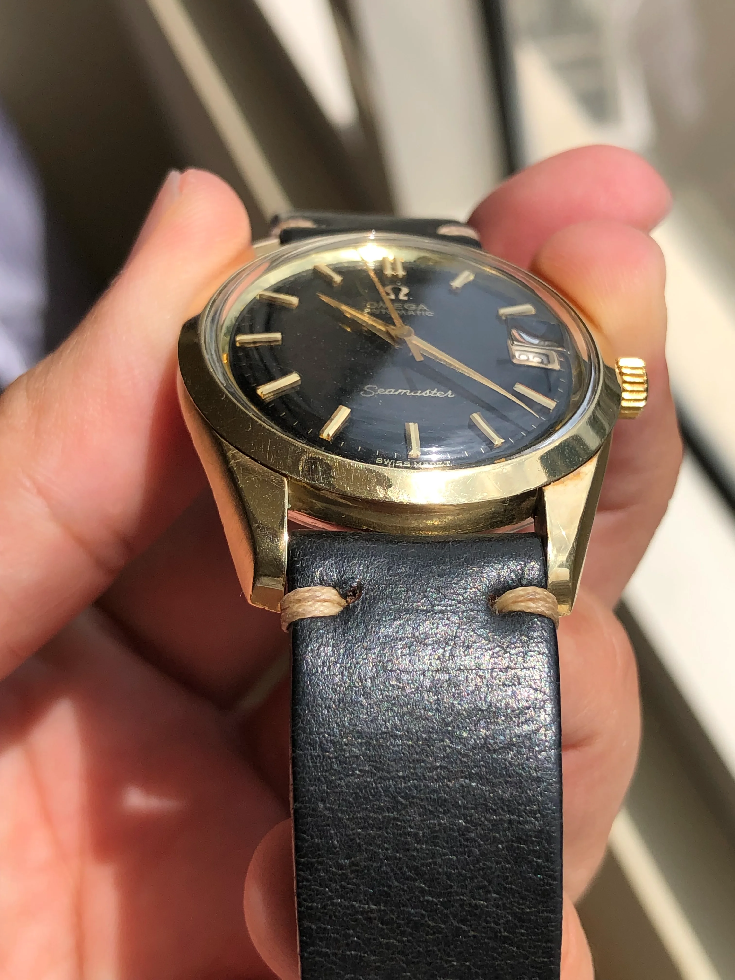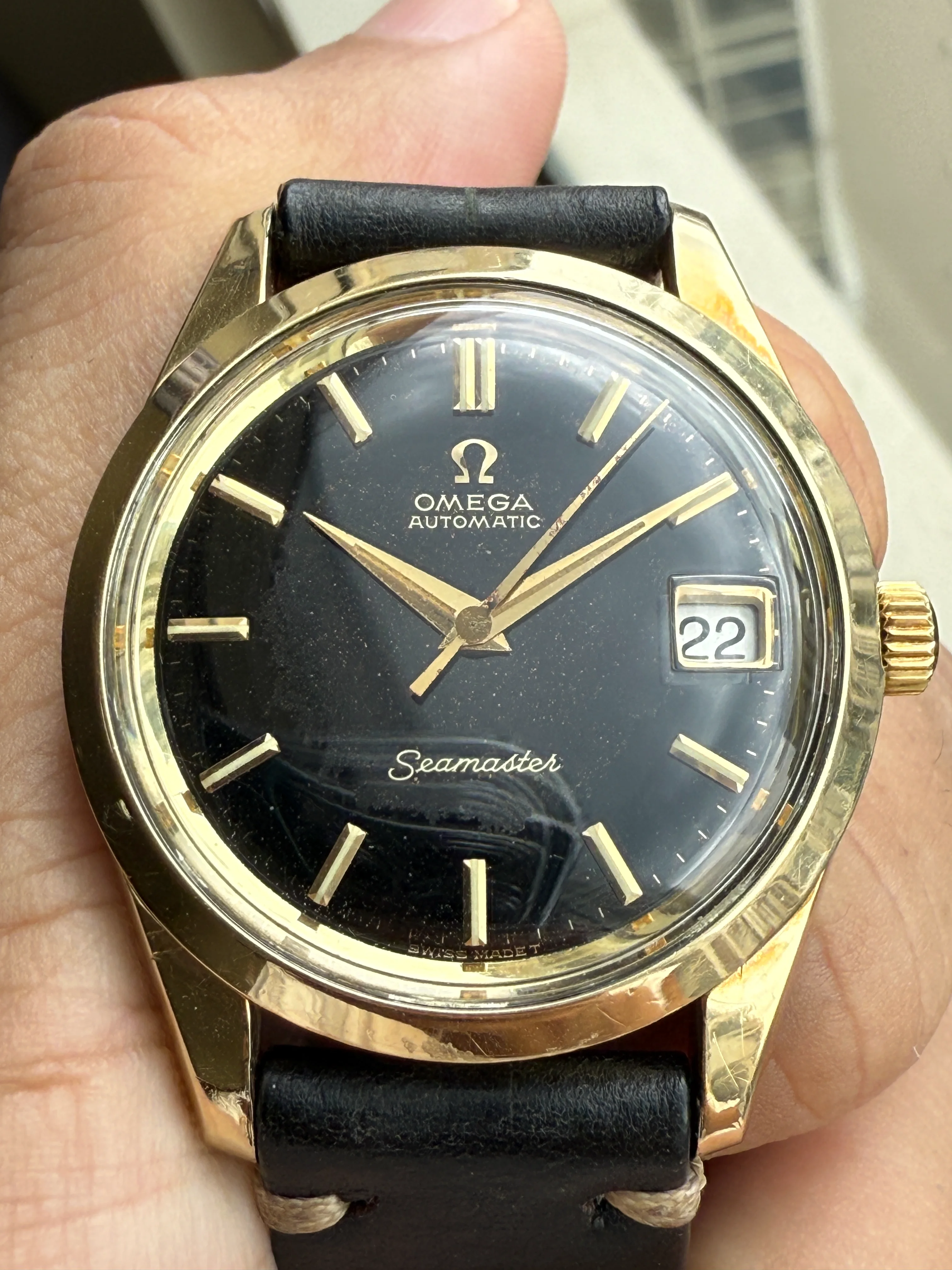 A gold capped Omega 166.010, original black gilt dial, hands and hour markers have tritium lume, leather strap with Omega buckle, serviced, shipping fee with insurance in EU included.