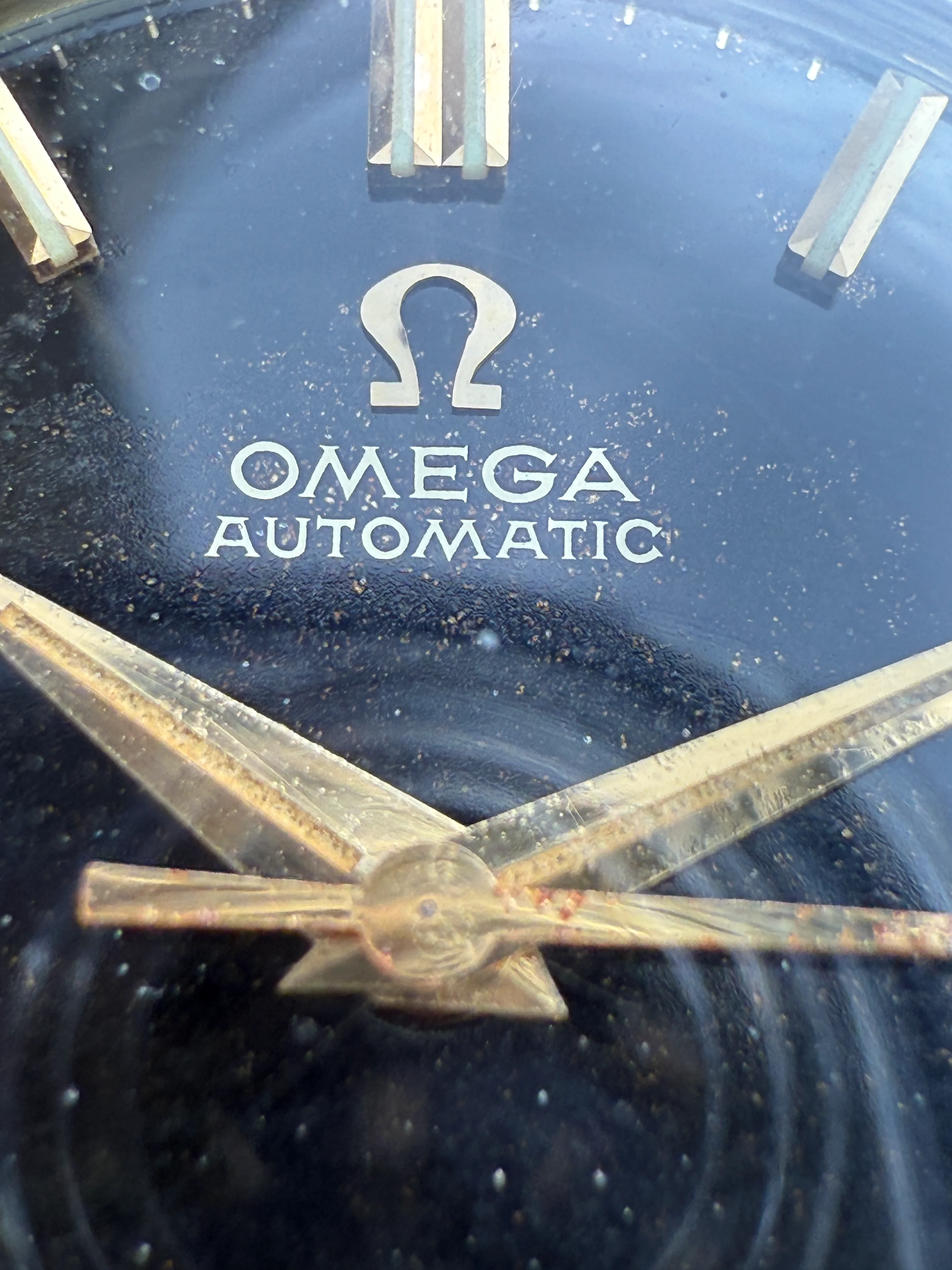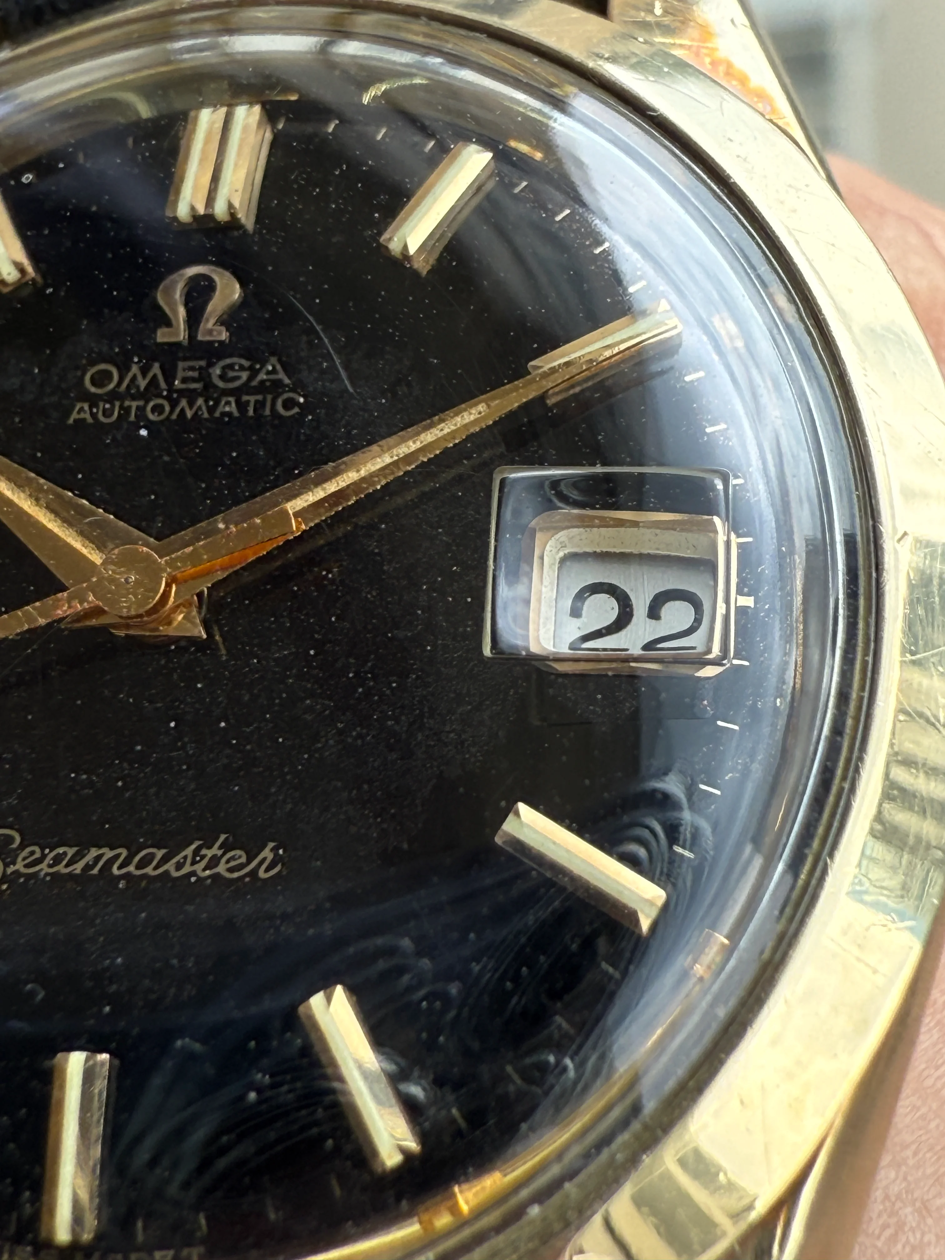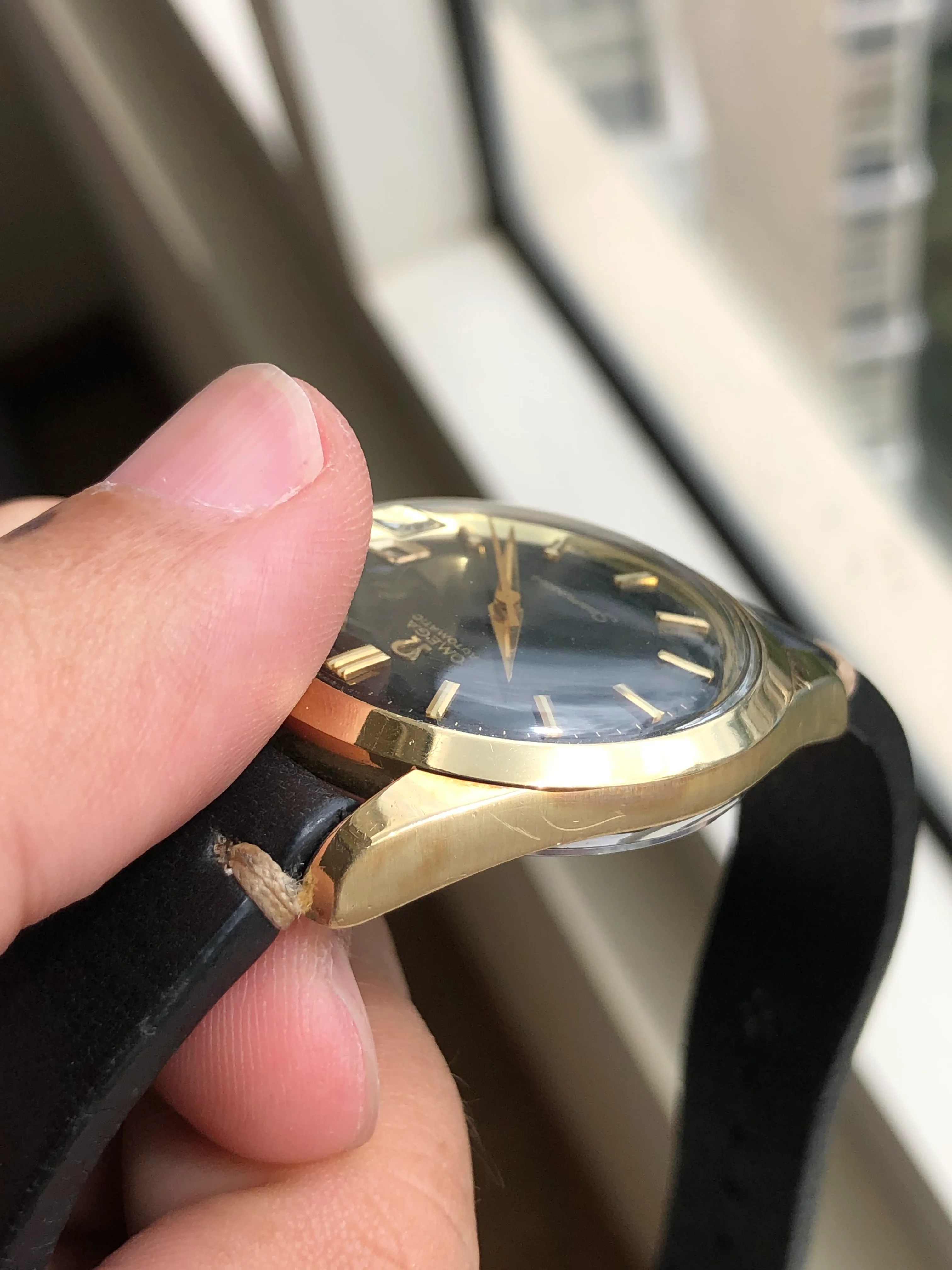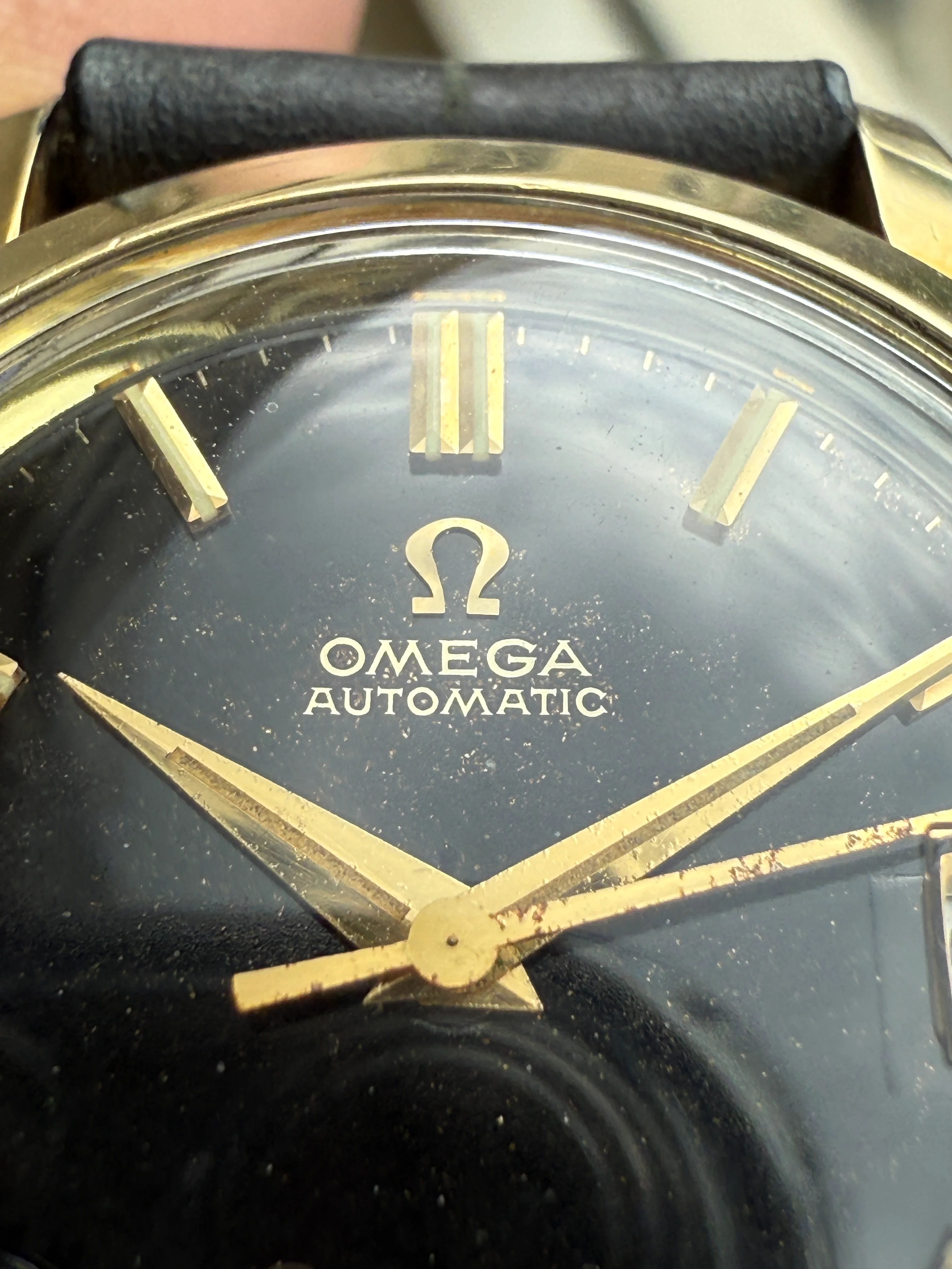 - Dial: Original black gilt dial with gold tone scripts; faceted date-aperture frame at 3; dauphine hands; hands and hour markers have lume; prints, hands and hour markers are all good. The dial surface has been aged and damaged in the center area (details are shown in photos below).