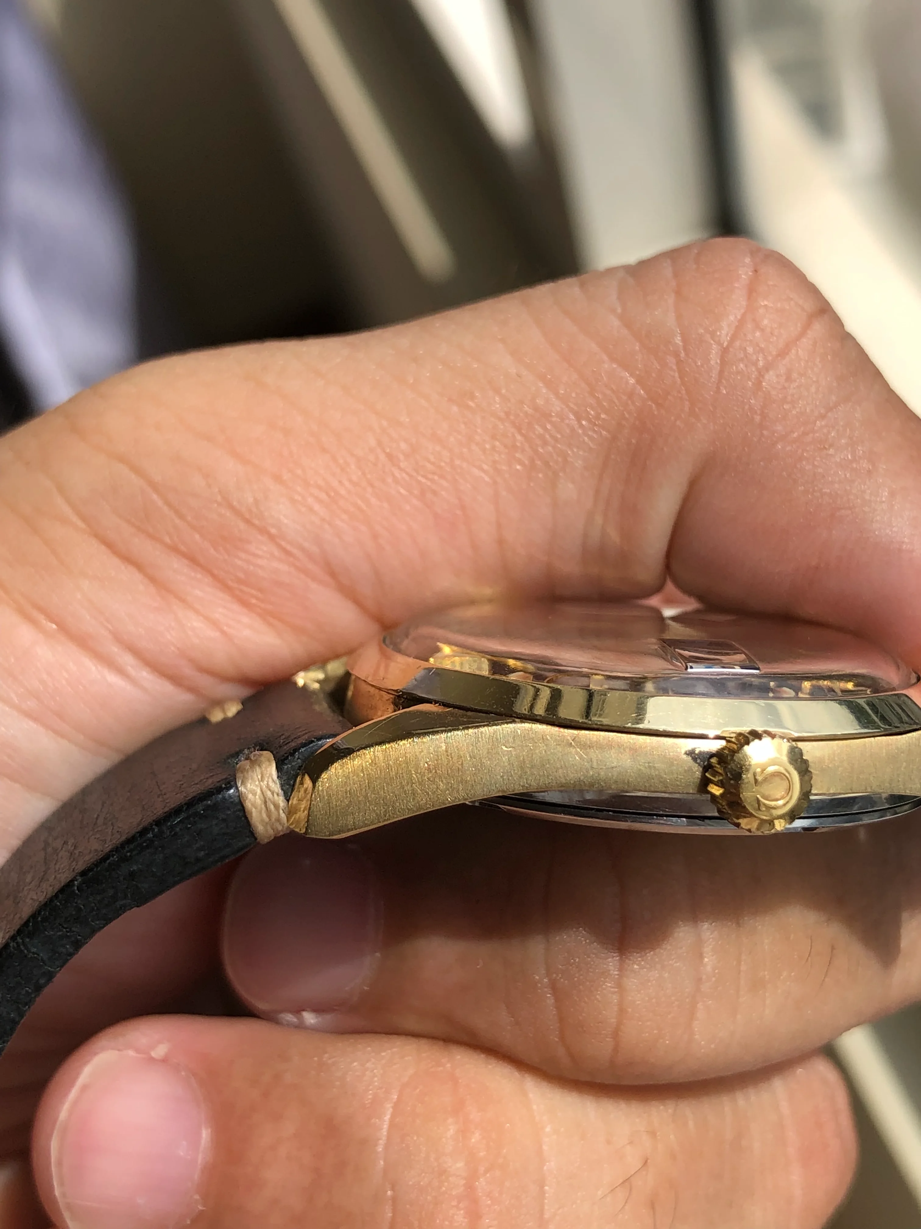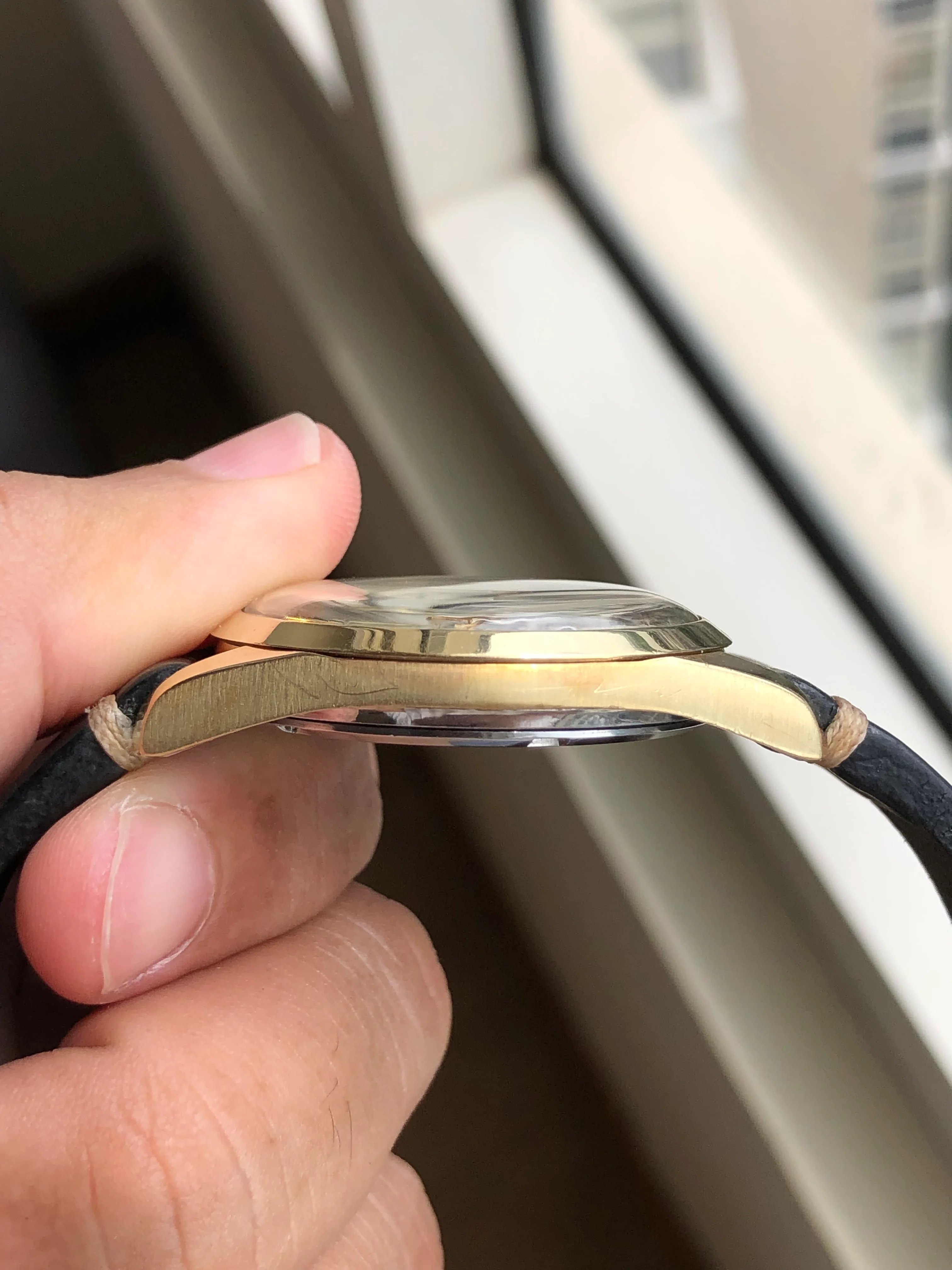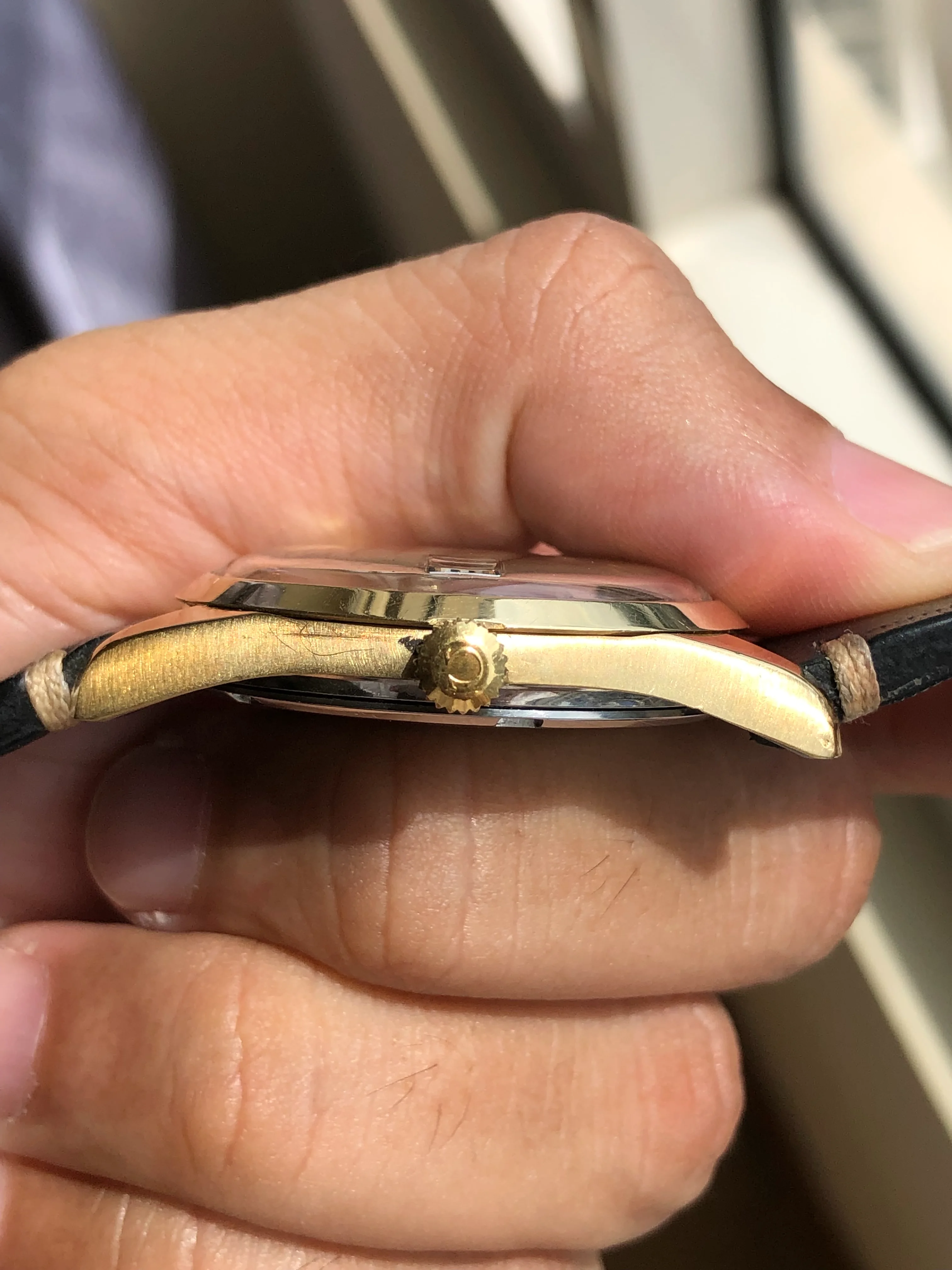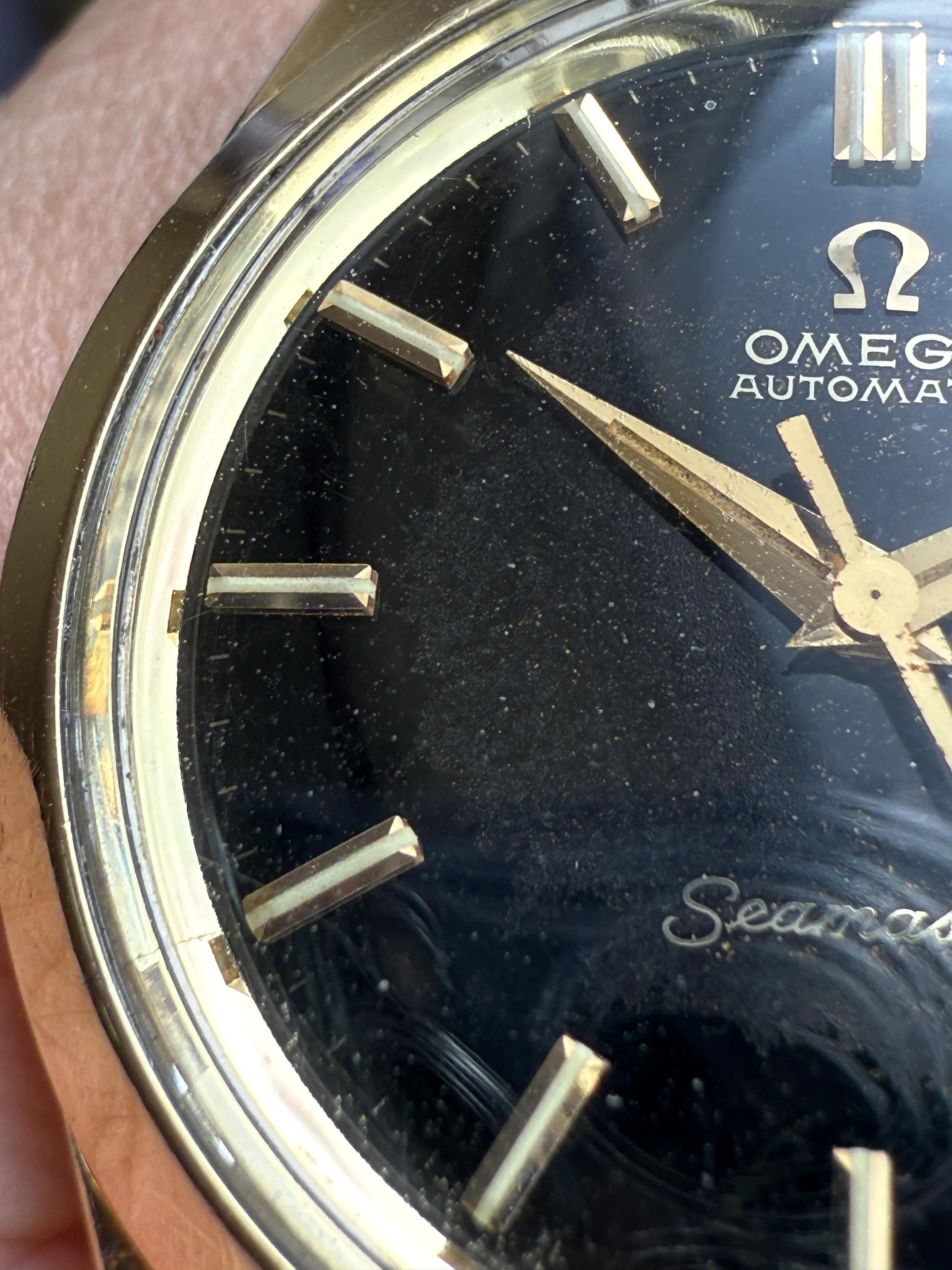 - Dial: Original black gilt dial with gold tone scripts; faceted date-aperture frame at 3; dauphine hands; hands and hour markers have lume; prints, hands and hour markers are all good. The dial surface has been aged and damaged in the center area (details are shown in photos below).