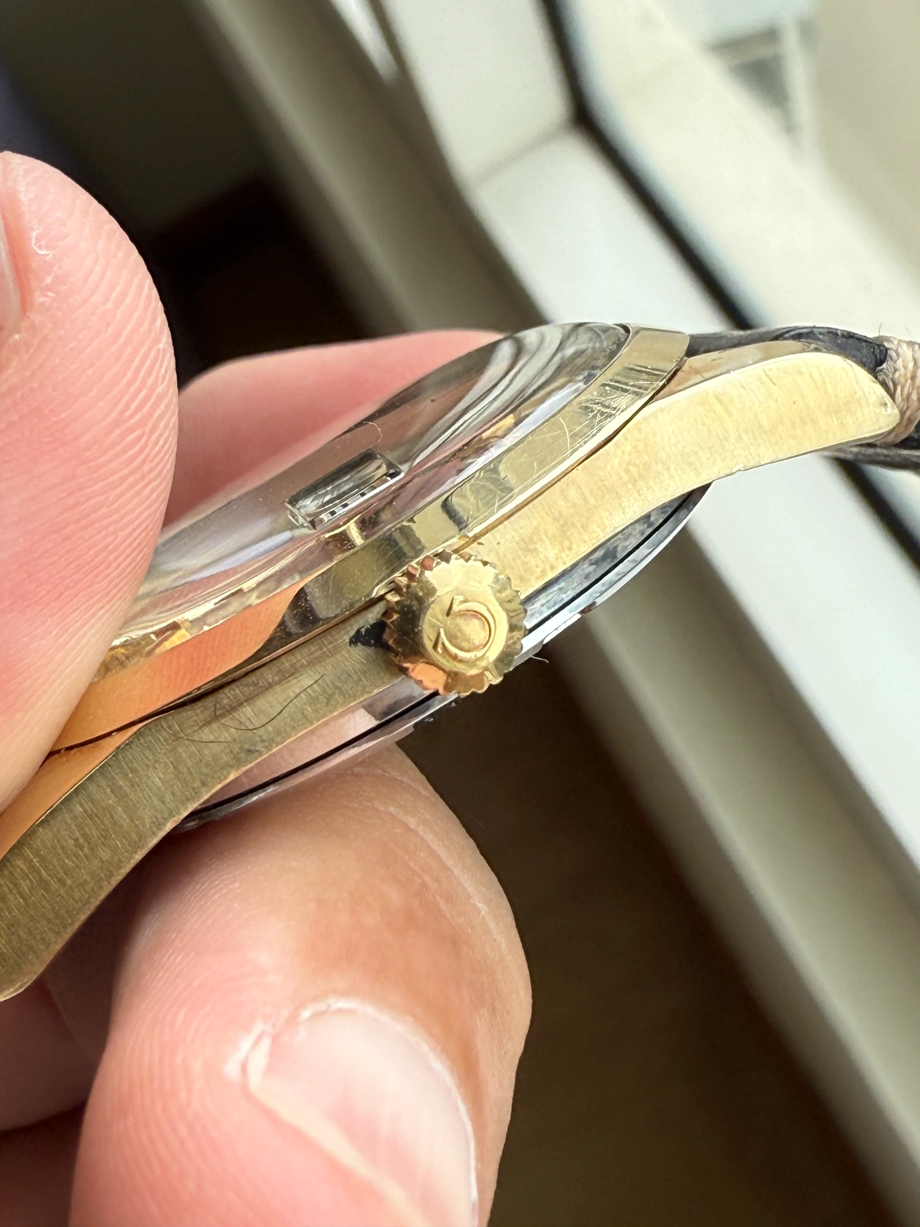 - Case: The diameter is 35mm without the crown. Original case is in good condition with scratches. Omega knurled crown.