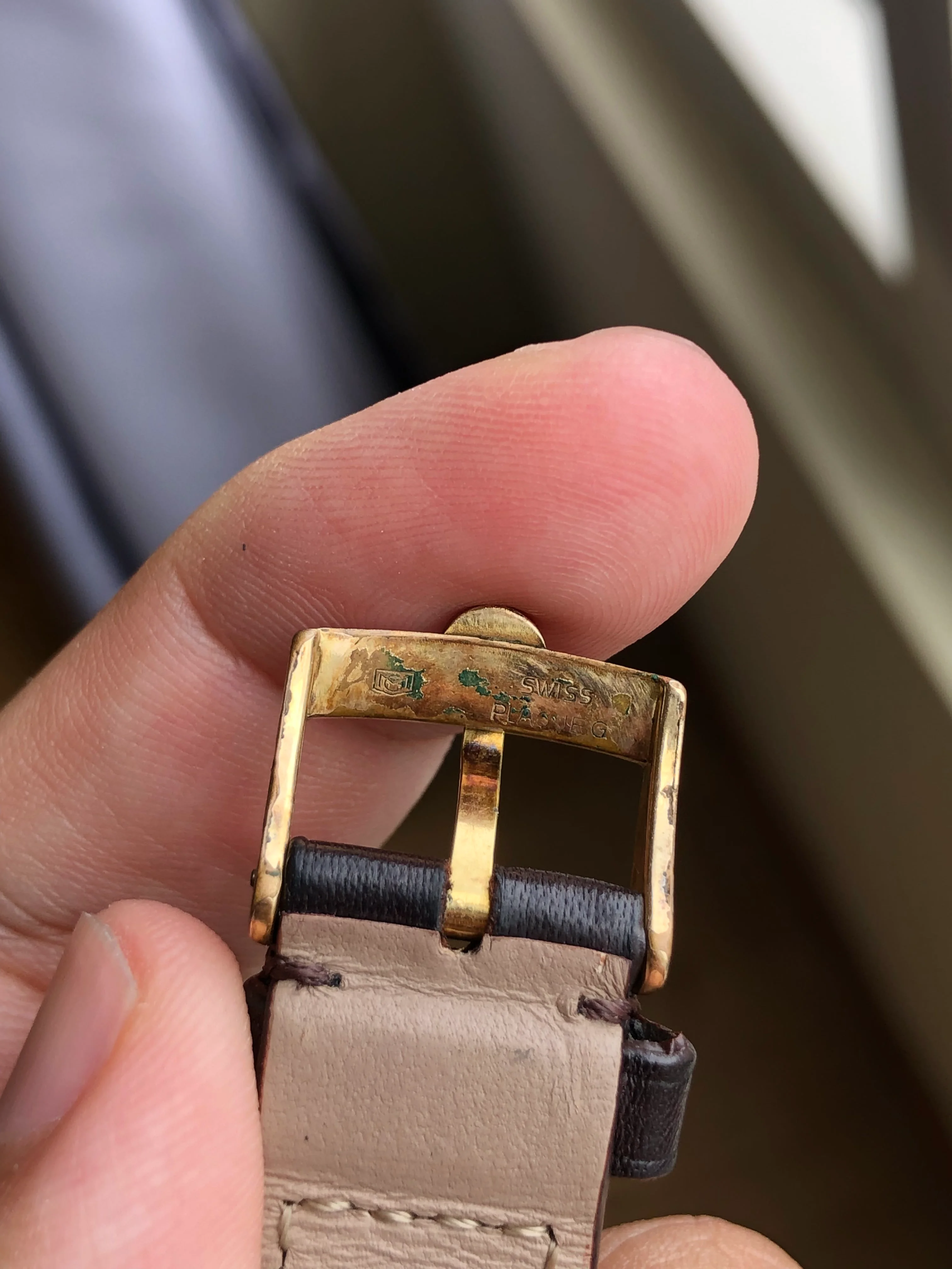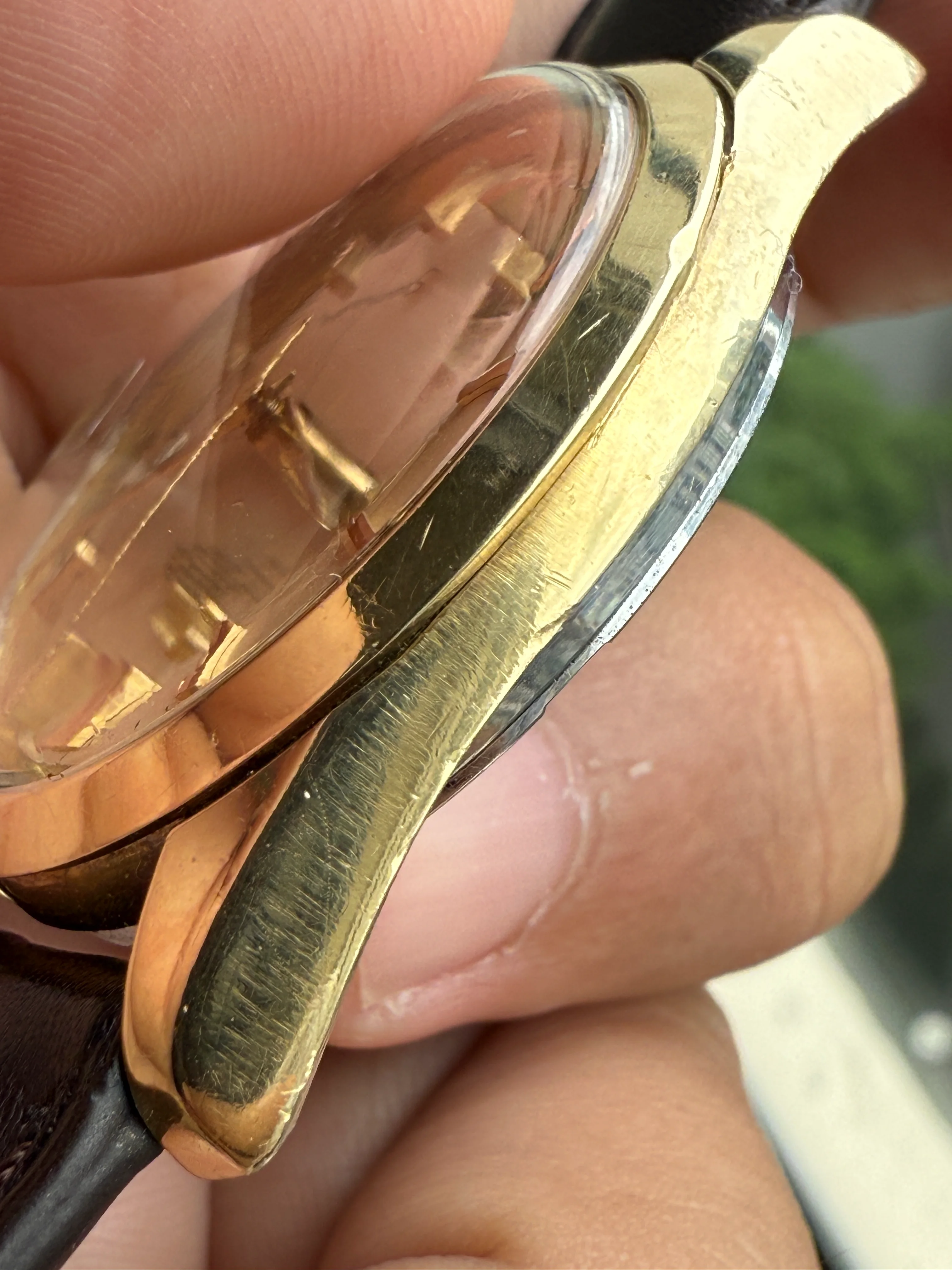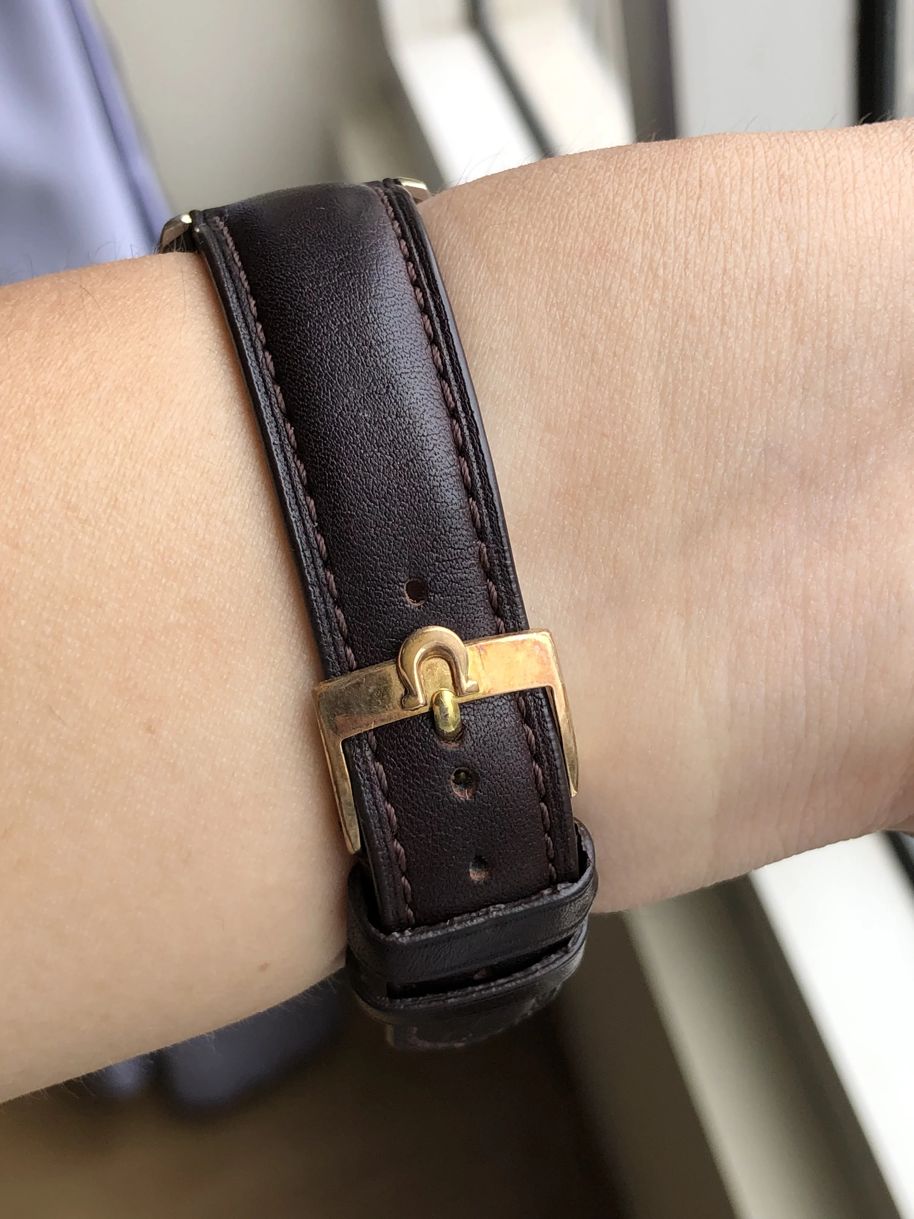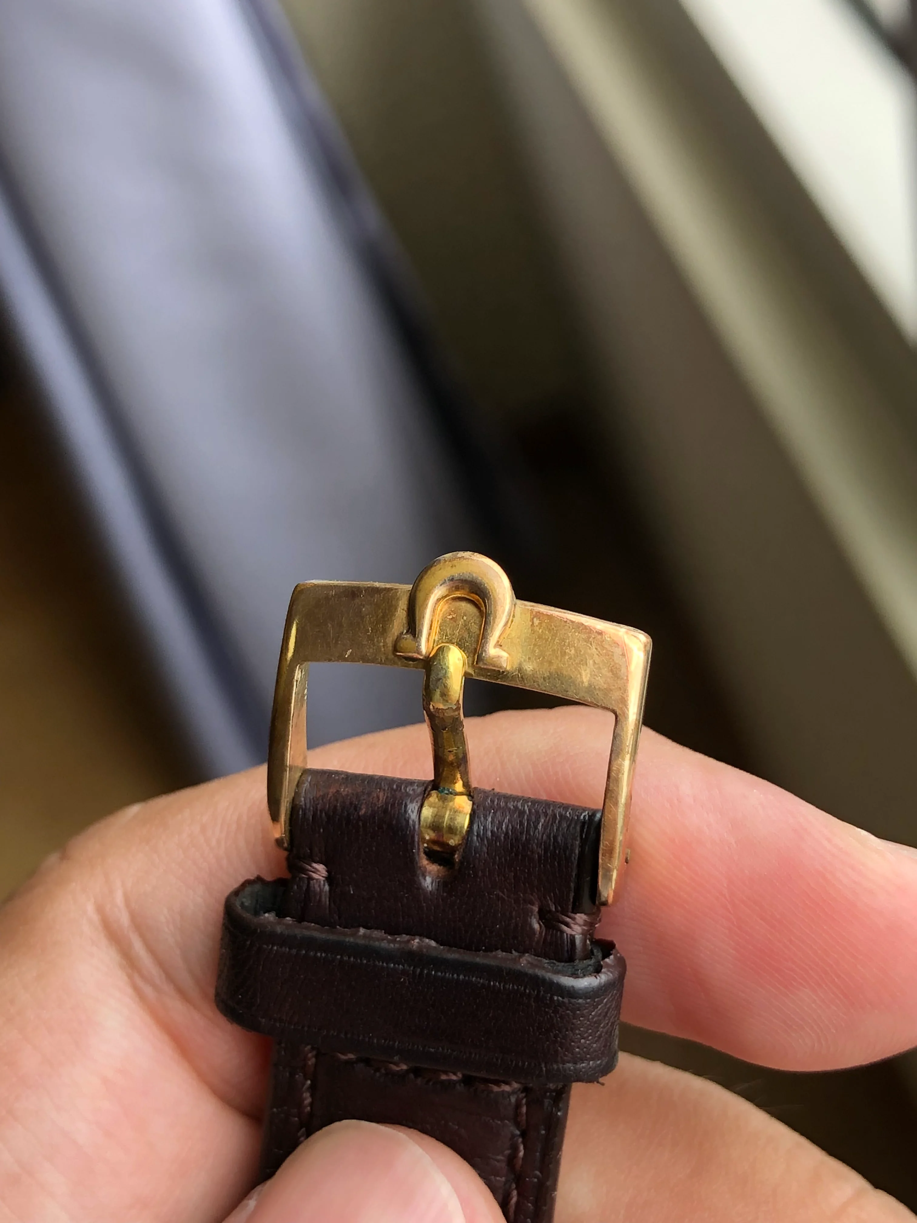 - Strap/buckle: Brown leather strap with smart spring bars. Original MG Omega plaque G buckle in fair condition with clear signs of wear.
