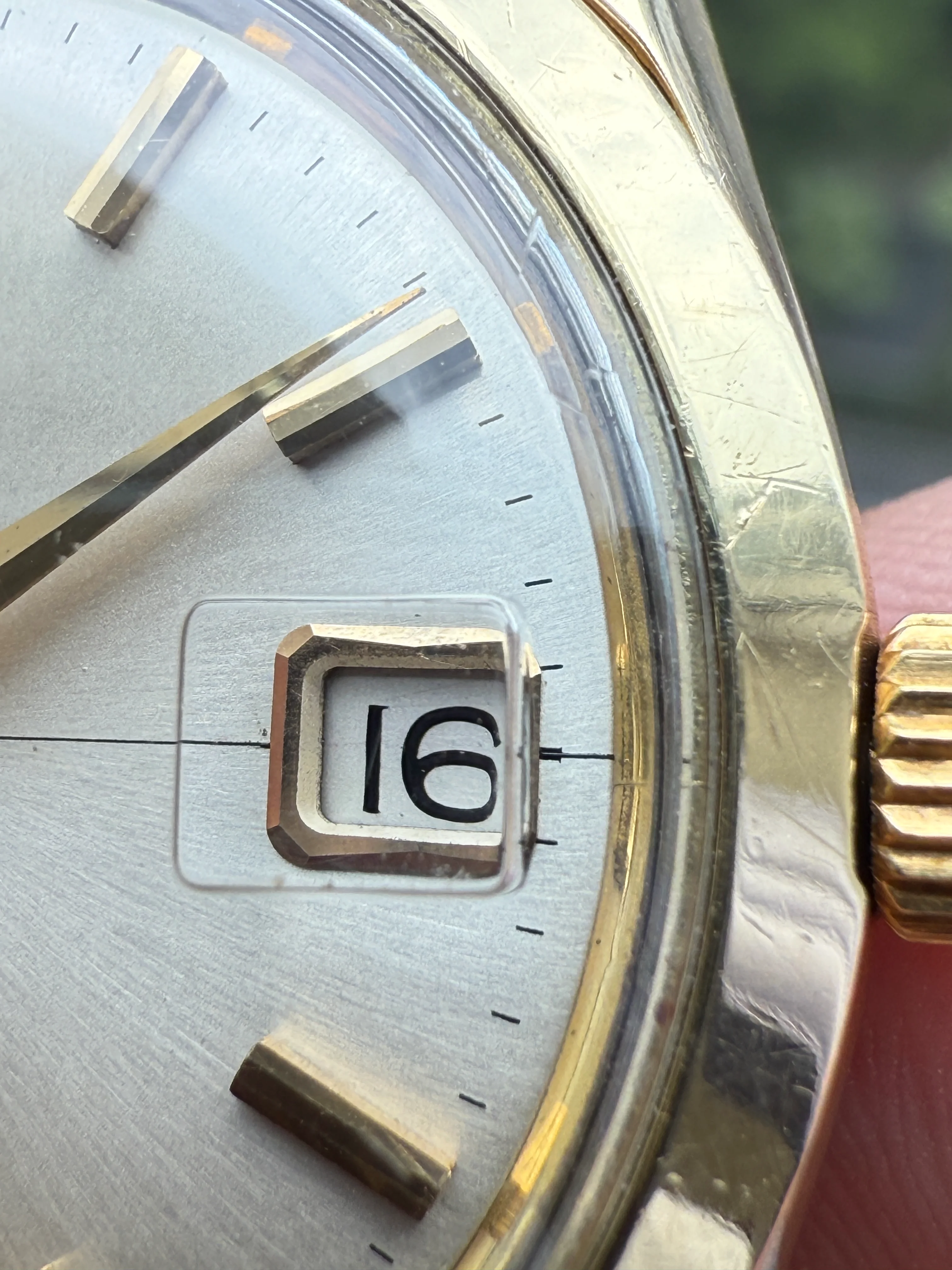 - Dial: Original white sunburst dial with cross hair, solid hands and hour markers (no lume, no paint, no onyx); faceted date-aperture frame at 3; dauphine hands; prints, hands and hour markers are all good.