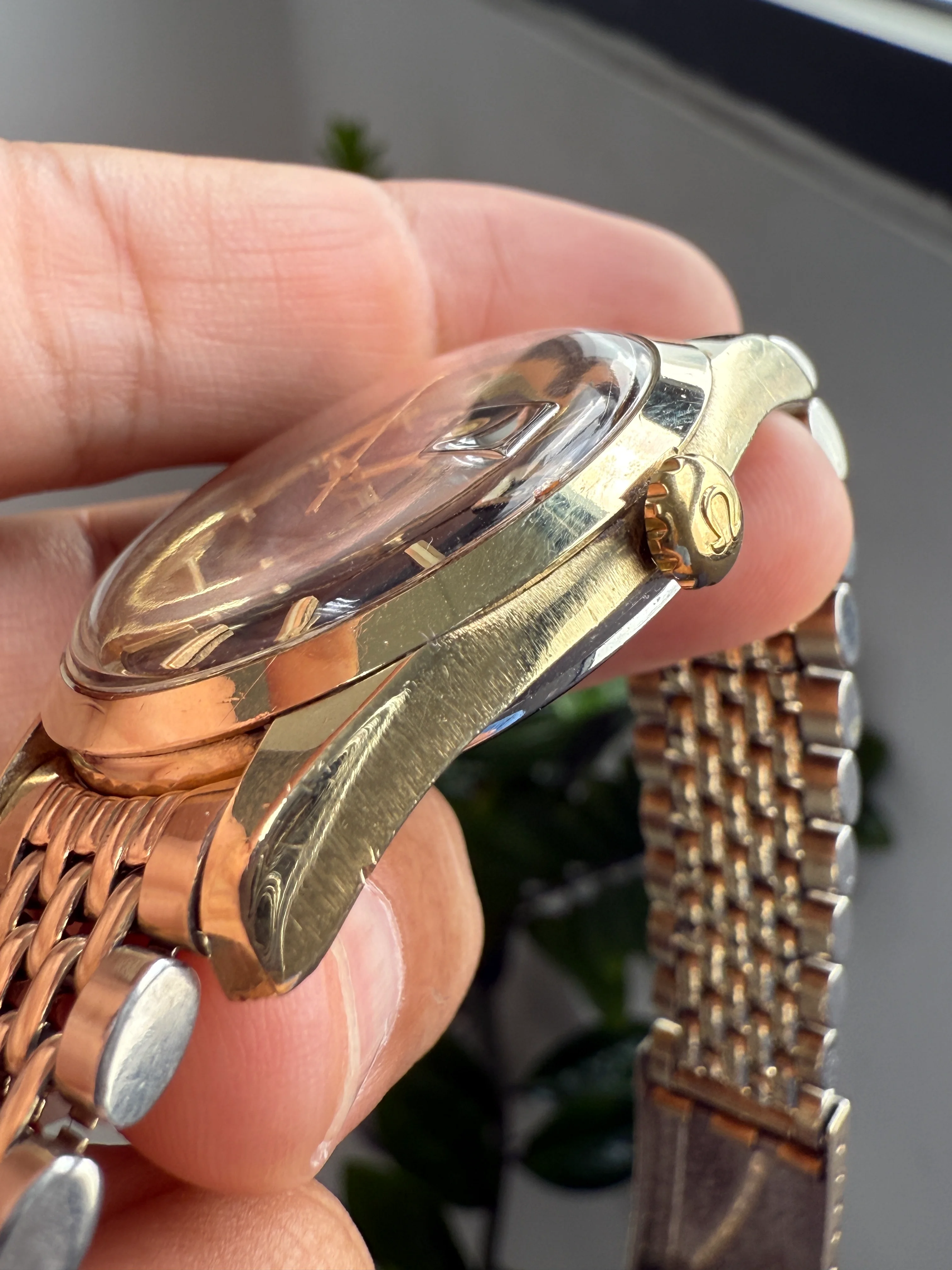 - Case: The diameter is 35mm without the crown. Original case is in fair condition with scratches. Omega scallop crown.