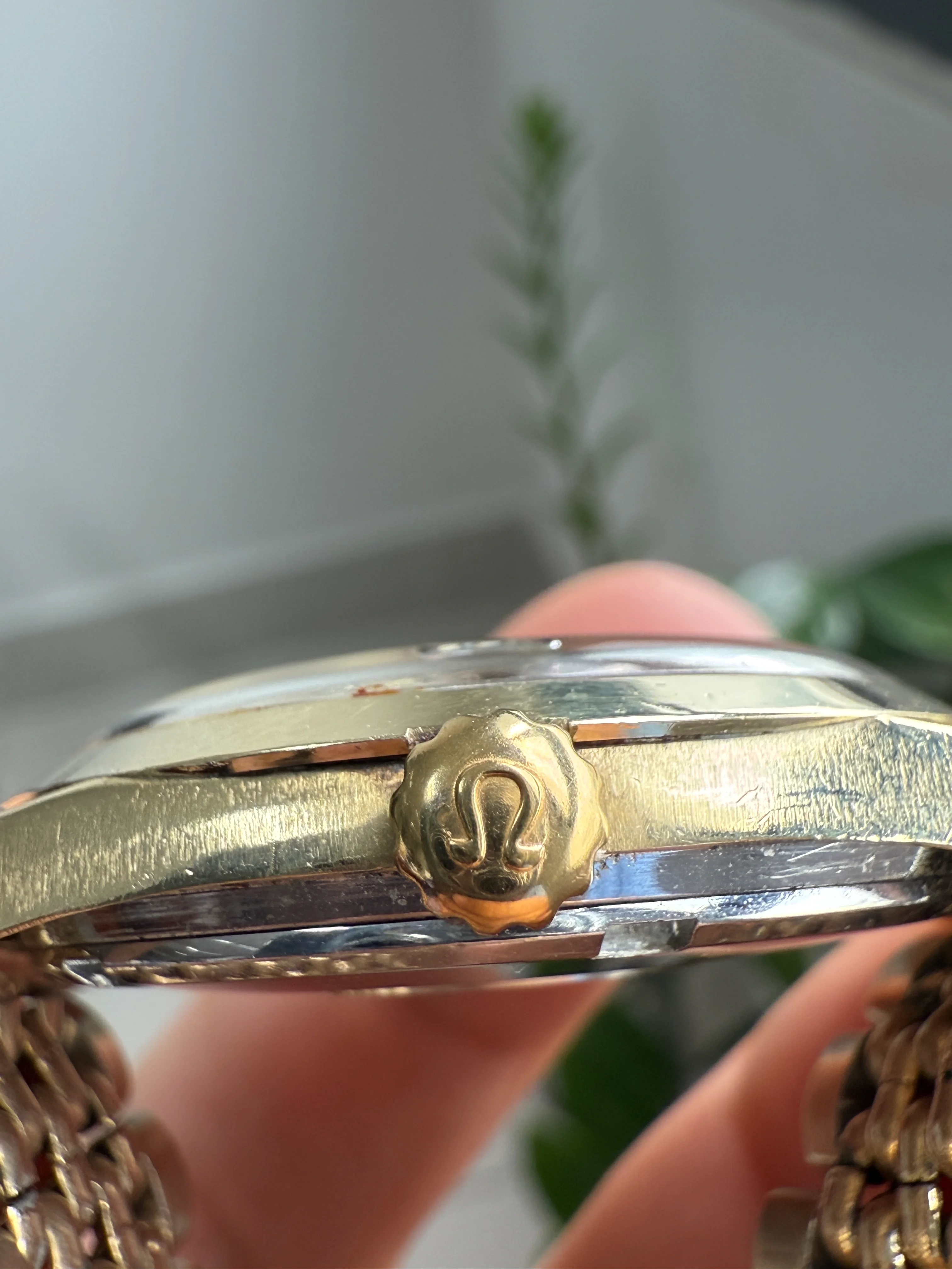 A gold capped Omega 168.010, original black gilt dial, hands and hour markers have tritium lume, Omega BOR 1502/11 gold plated, serviced, shipping fee with insurance in EU included.