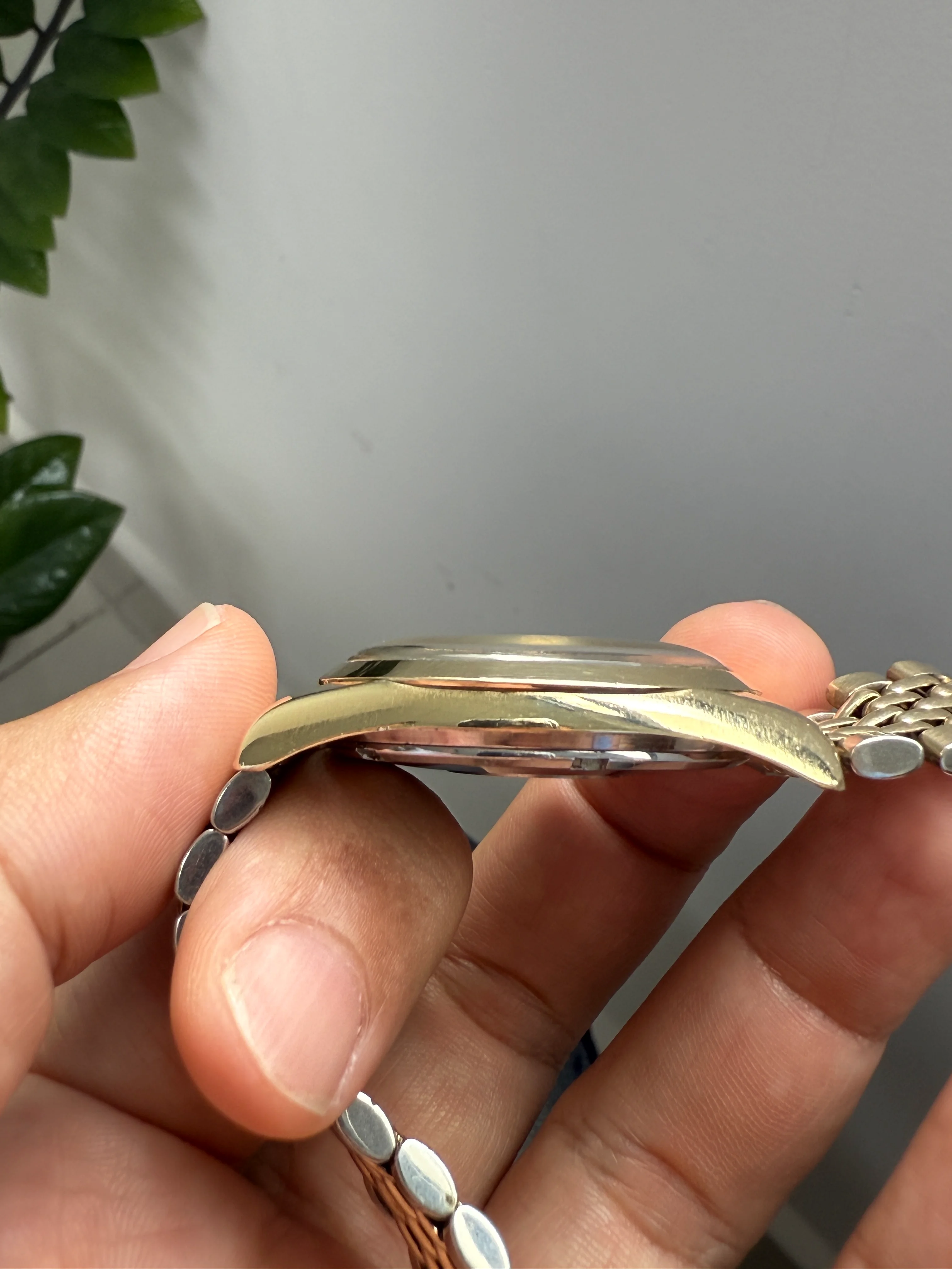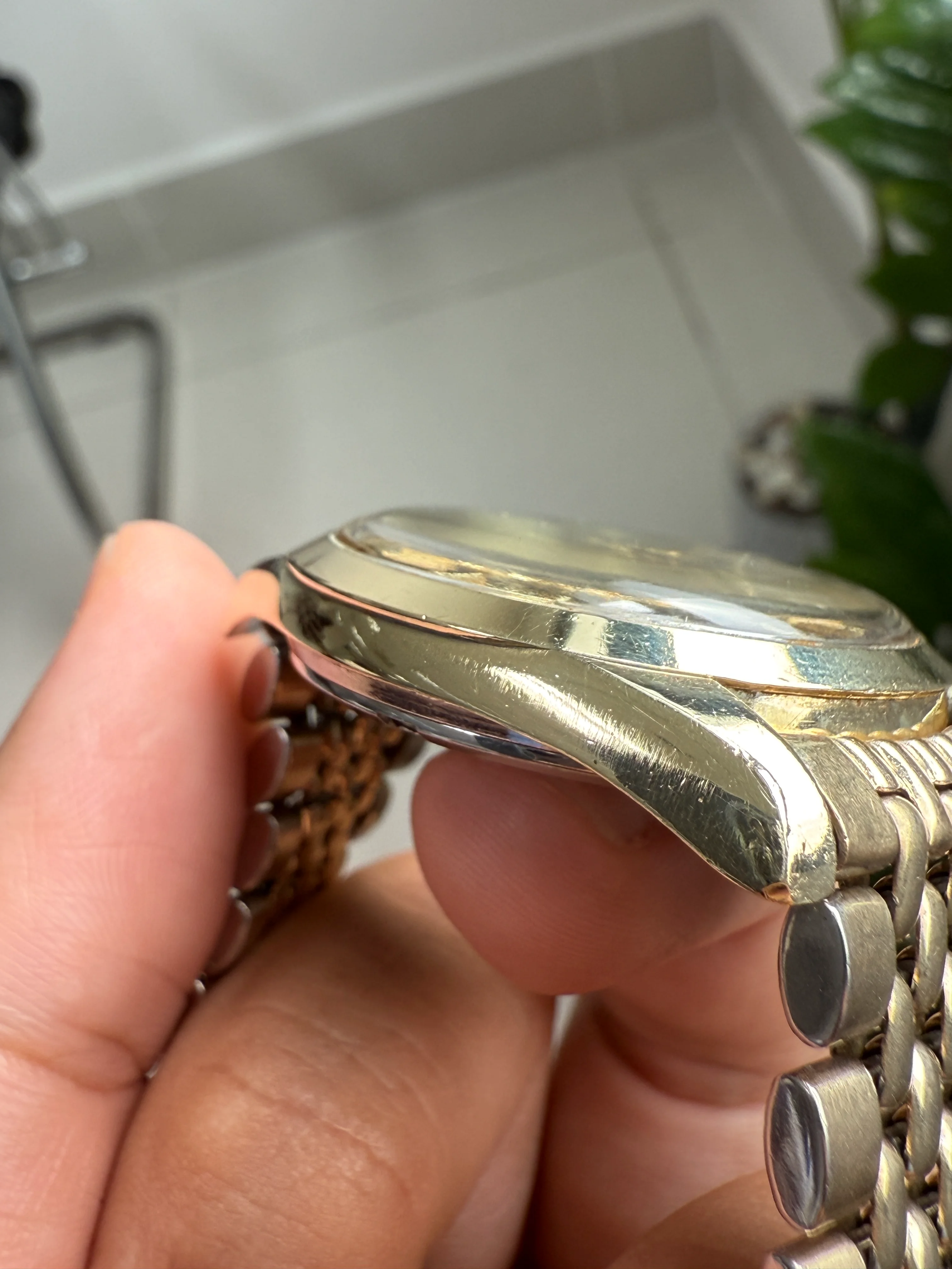 - Dial: Original black gilt dial with gold tone scripts; faceted date-aperture frame at 3; dauphine hands; hands and hour markers have lume; prints, hands and hour markers are all good. The dial surface has been aged and damaged in the center area (details are shown in photos below).