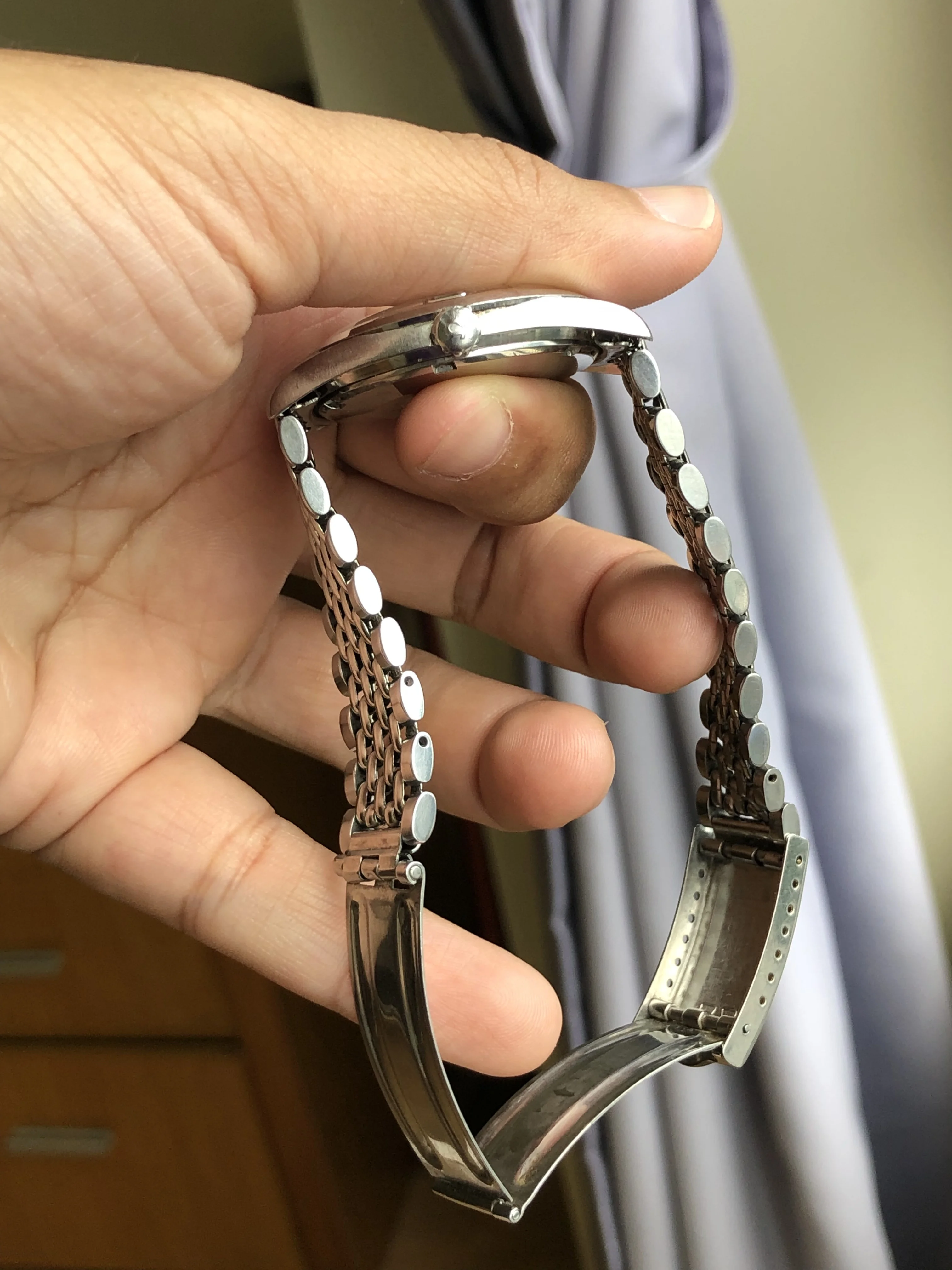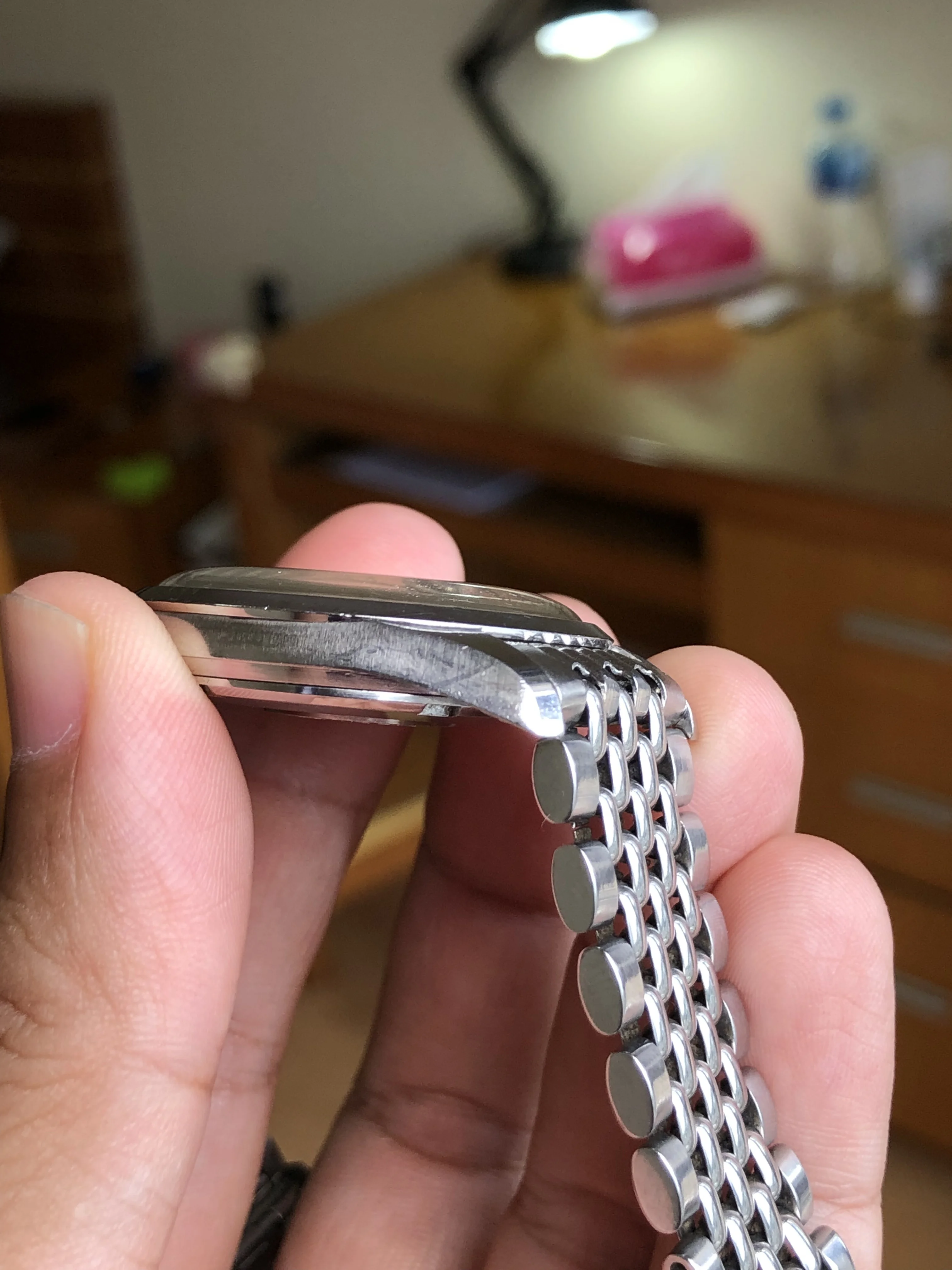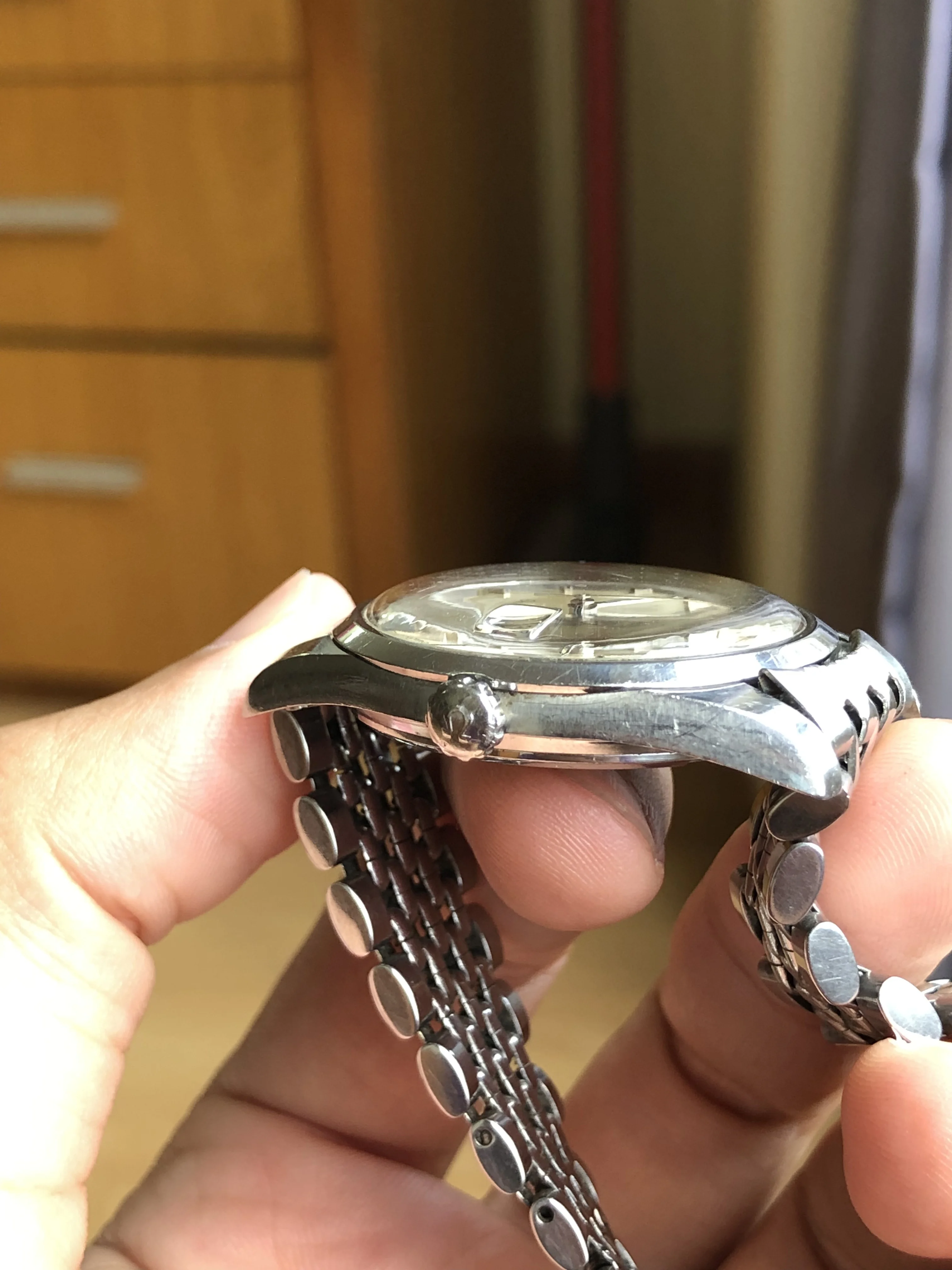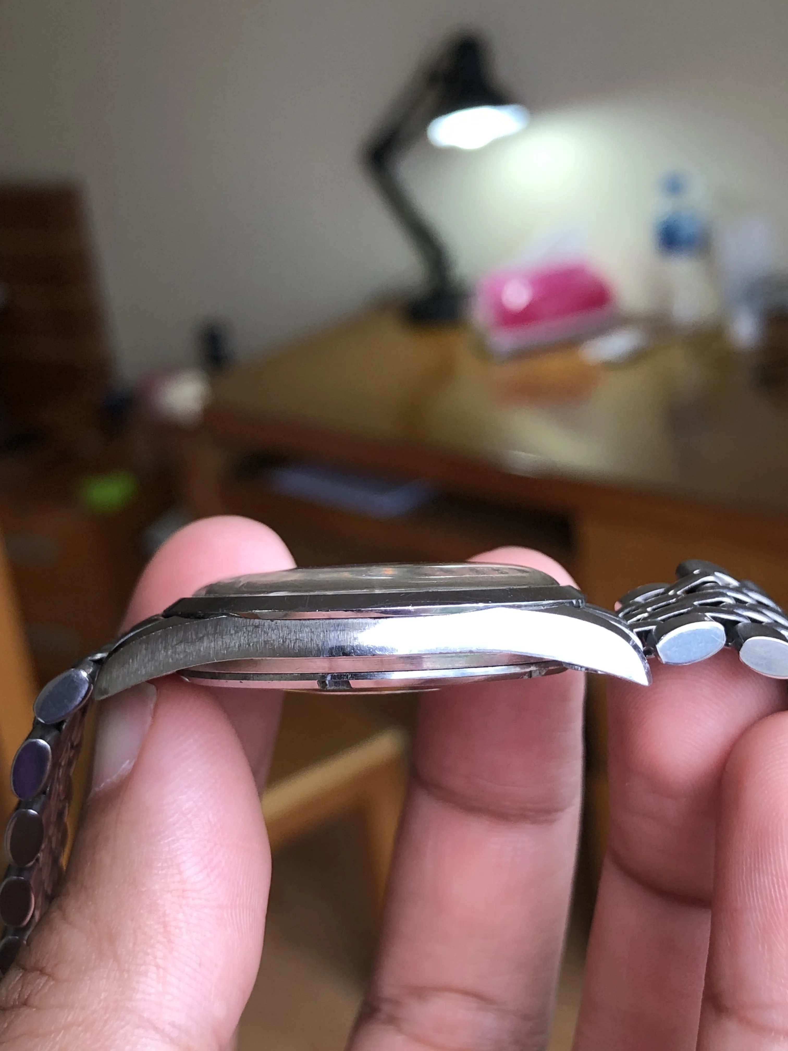 - Dial: Original white sunburst dial in fair condition (there are some spots on the dial as shown in photos and clips). Special dial with onyx and lume on hour markers (this variation only appears occasionally); pencil hands (these are small holes on the black strip of hour hand that can be fixed by black paint but I choosed to keep it that way); prints and lume are all good.