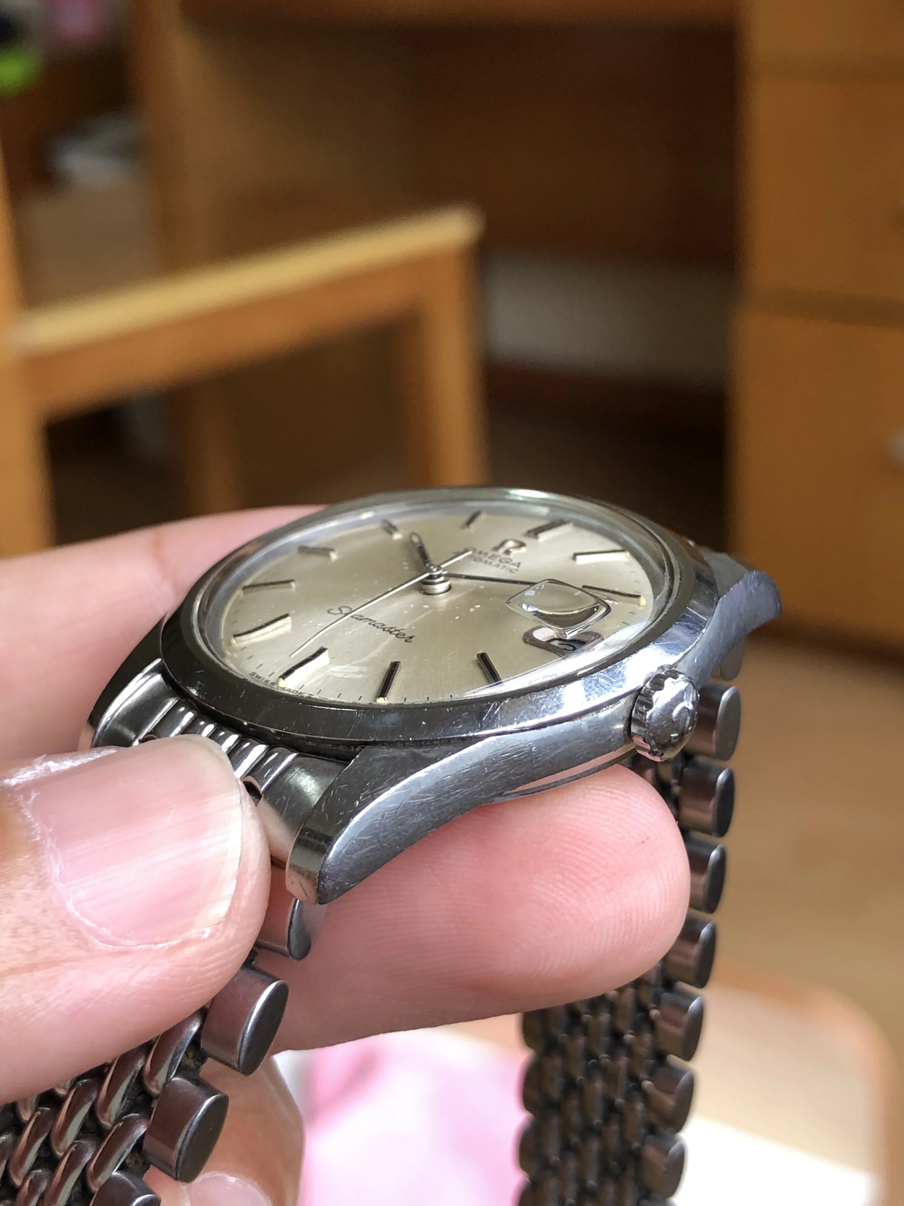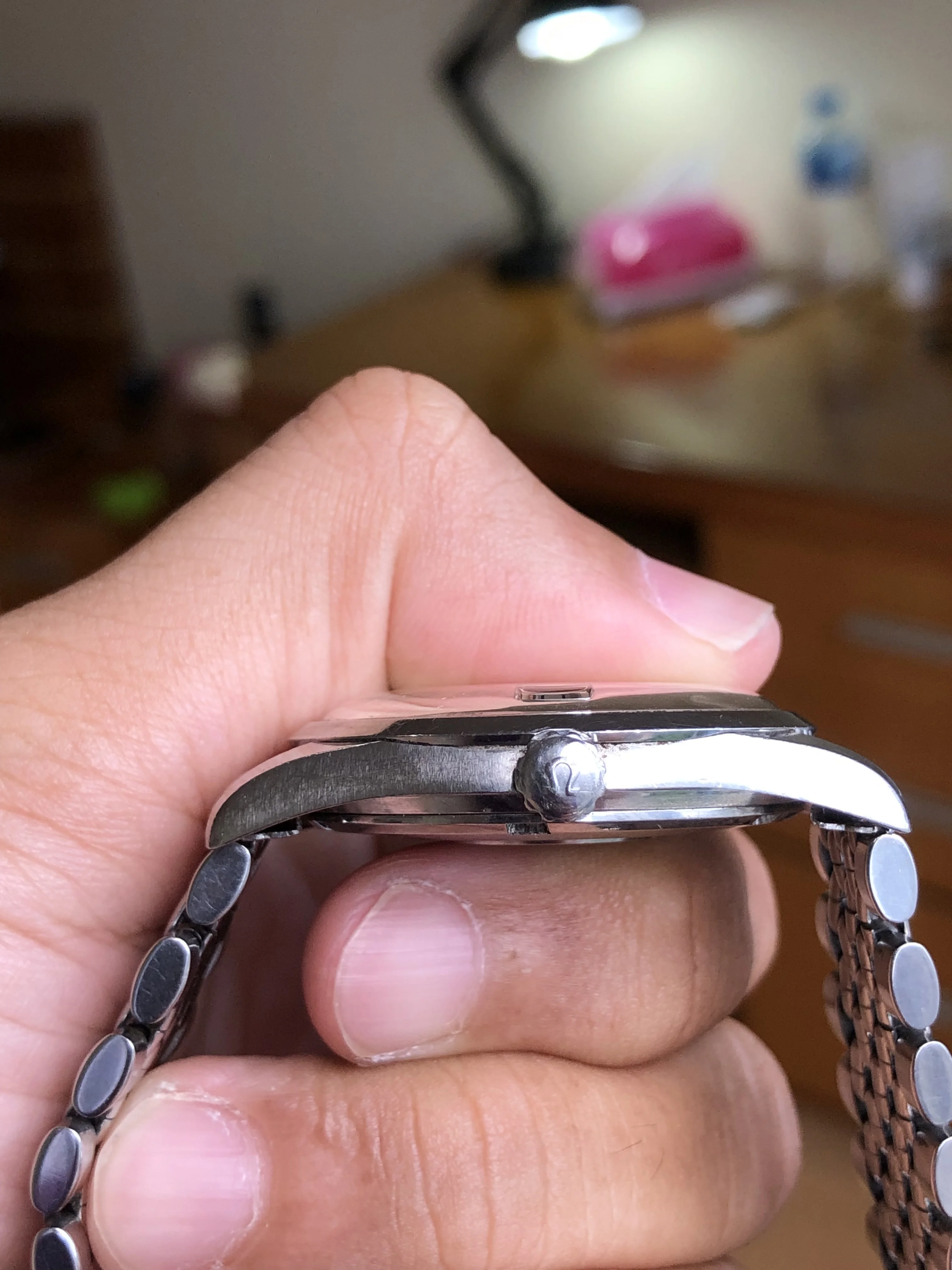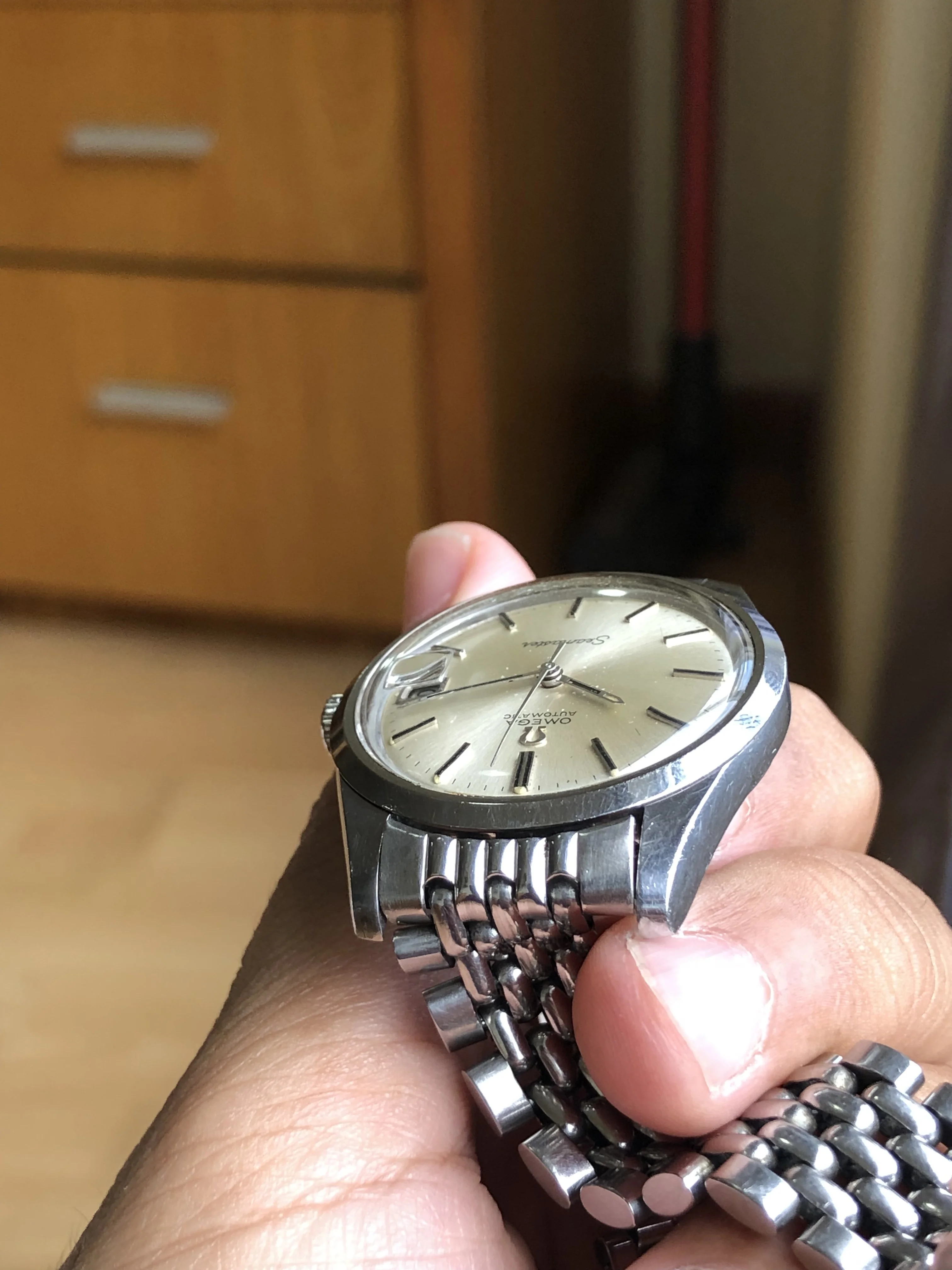 - Case: The diameter is 35mm without the crown. Original case in good condition with hairline scratches. Original Omega scallop crown (I changed it from the knurled crown during the last service).