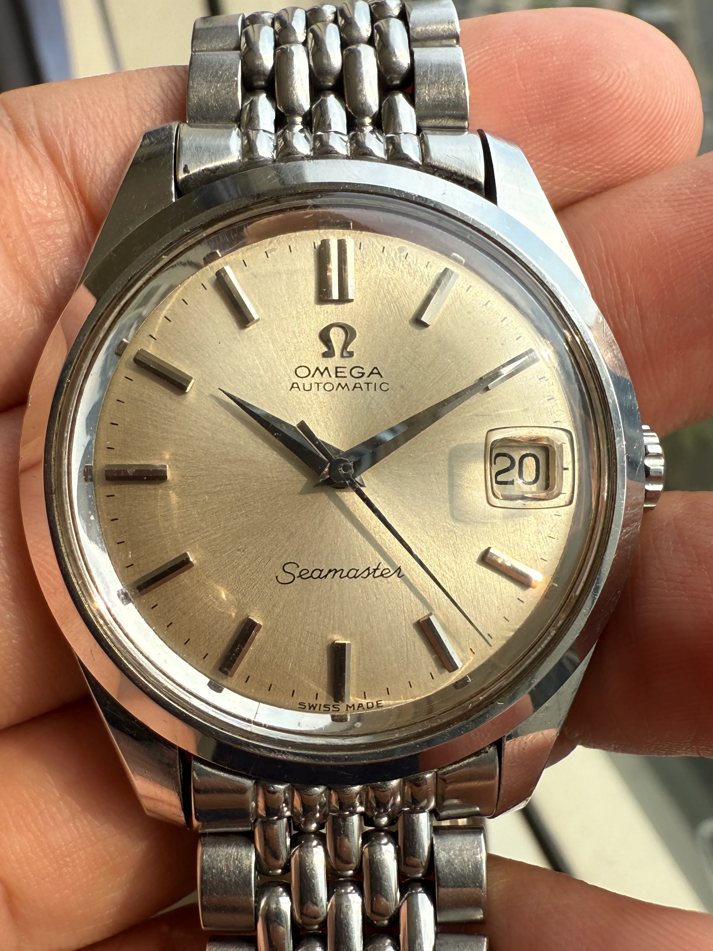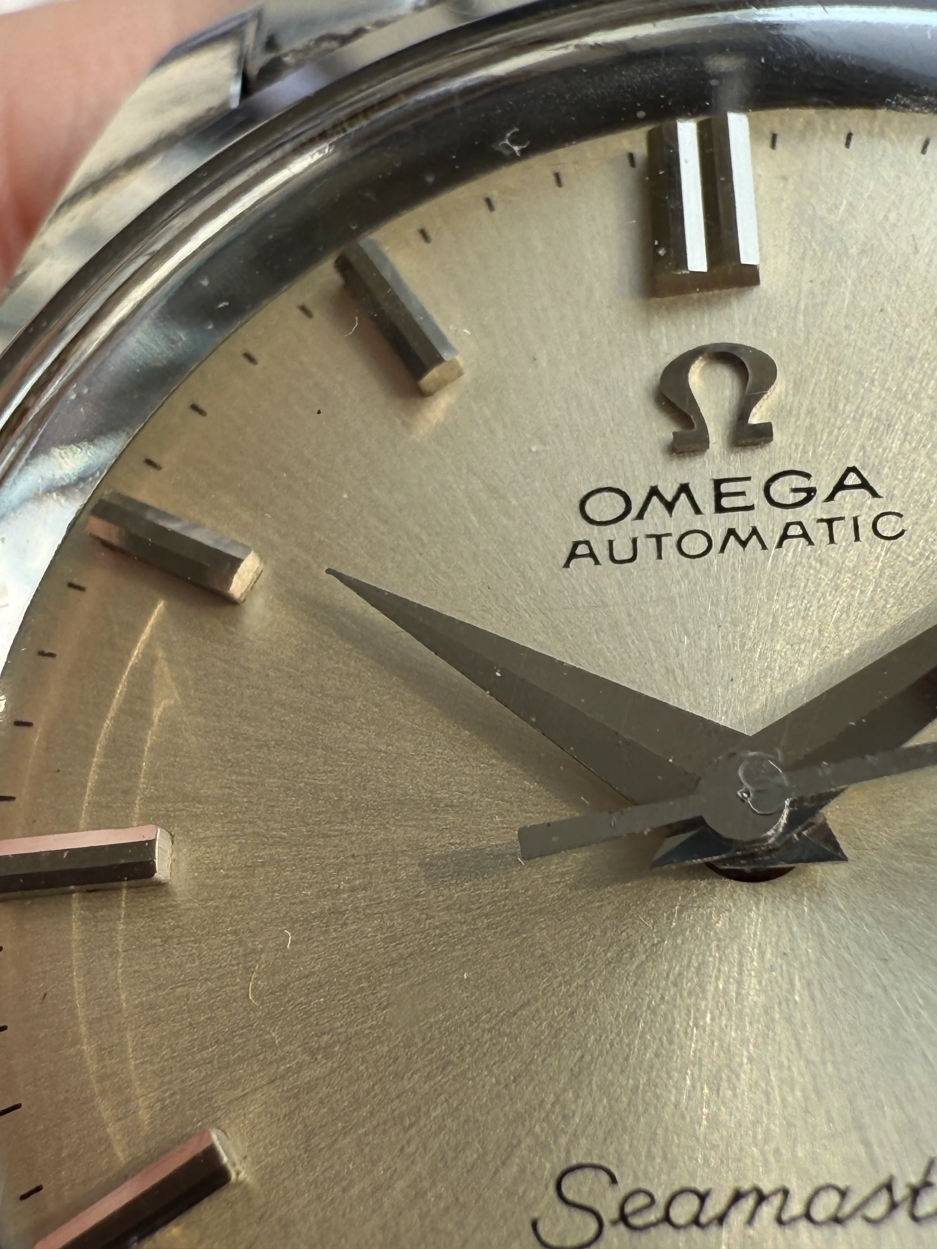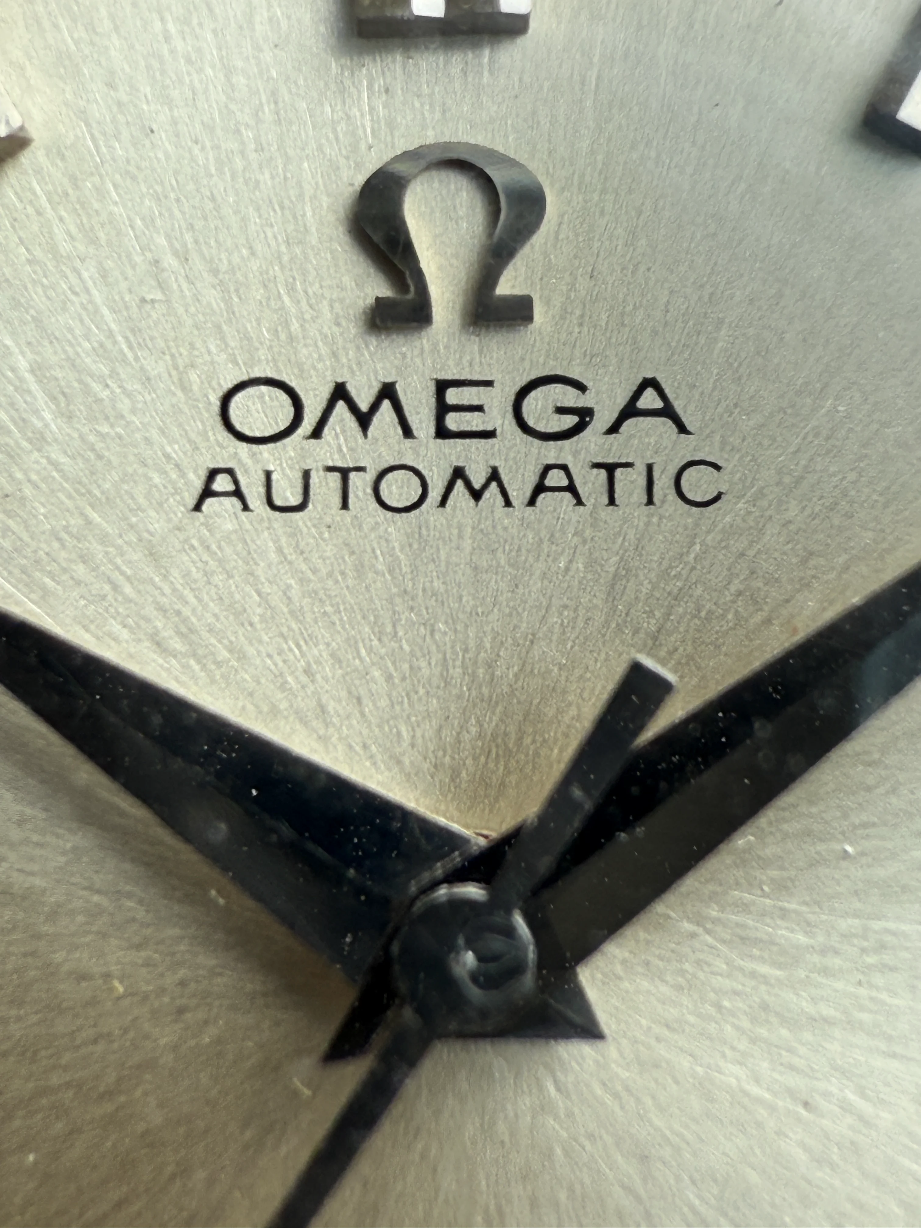 - Dial: Original white sunburst dial in very good condition. Applied Omega logo as well as an faceted date-aperture frame; solid hour markers (no lume, no paint, no onyx); dauphine hands; prints, hands, hour markers are all good.