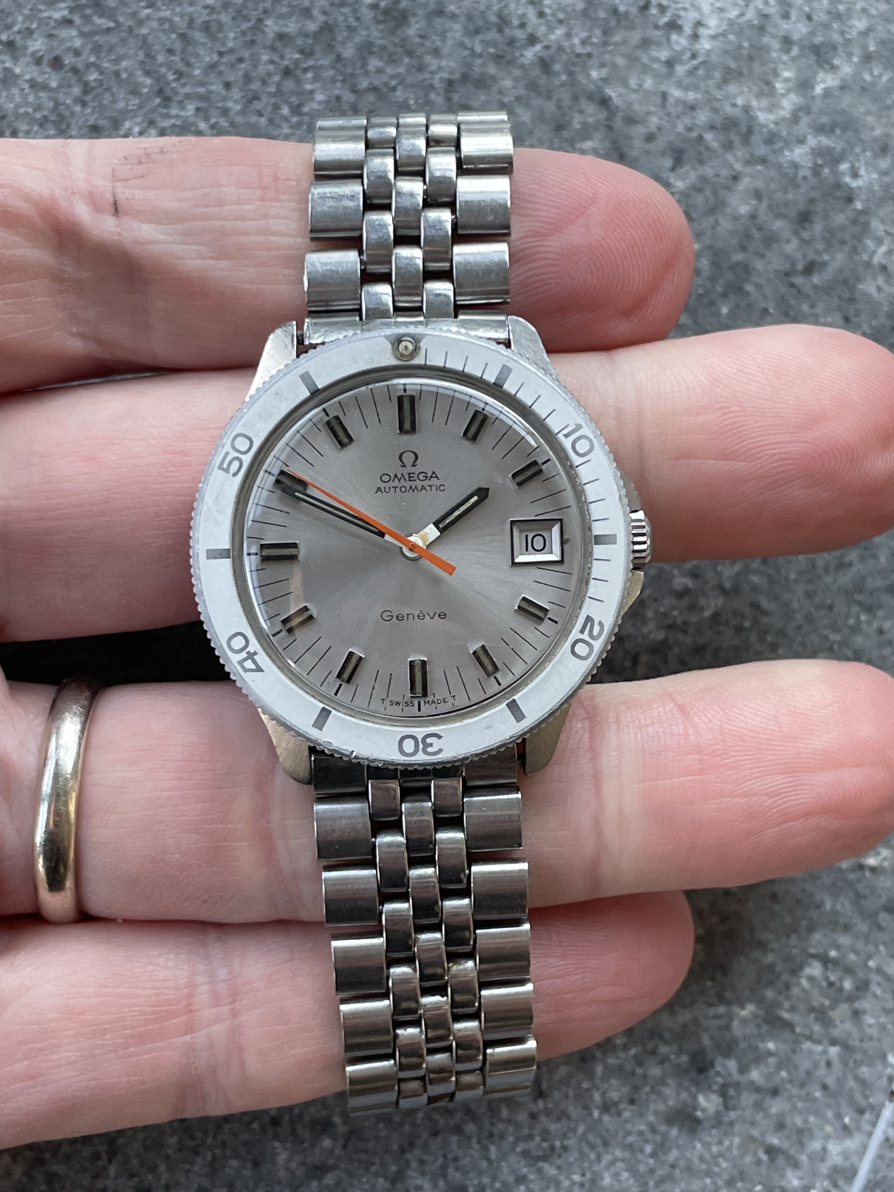 ·CASE: 36mm steel case is in relatively good shape; some knicks but nothing terrible. Unpolished, as far as I can tell (and based off the brushing on the crown side, the brushing on the top, the sharpness of the short lugs). Signed crown but the crystal seems to be lacking the hippocampus in the center. The bezel's faded just a bit and rotates as it should. Comes on an old JBChampion/Omega jubilee band with 146 end links; they're clearly not correct, but they get the job done. The bracelet is *massive*: I have a 7.25" wrist, but let all the way out it should accommodate almost an 8" wrist.