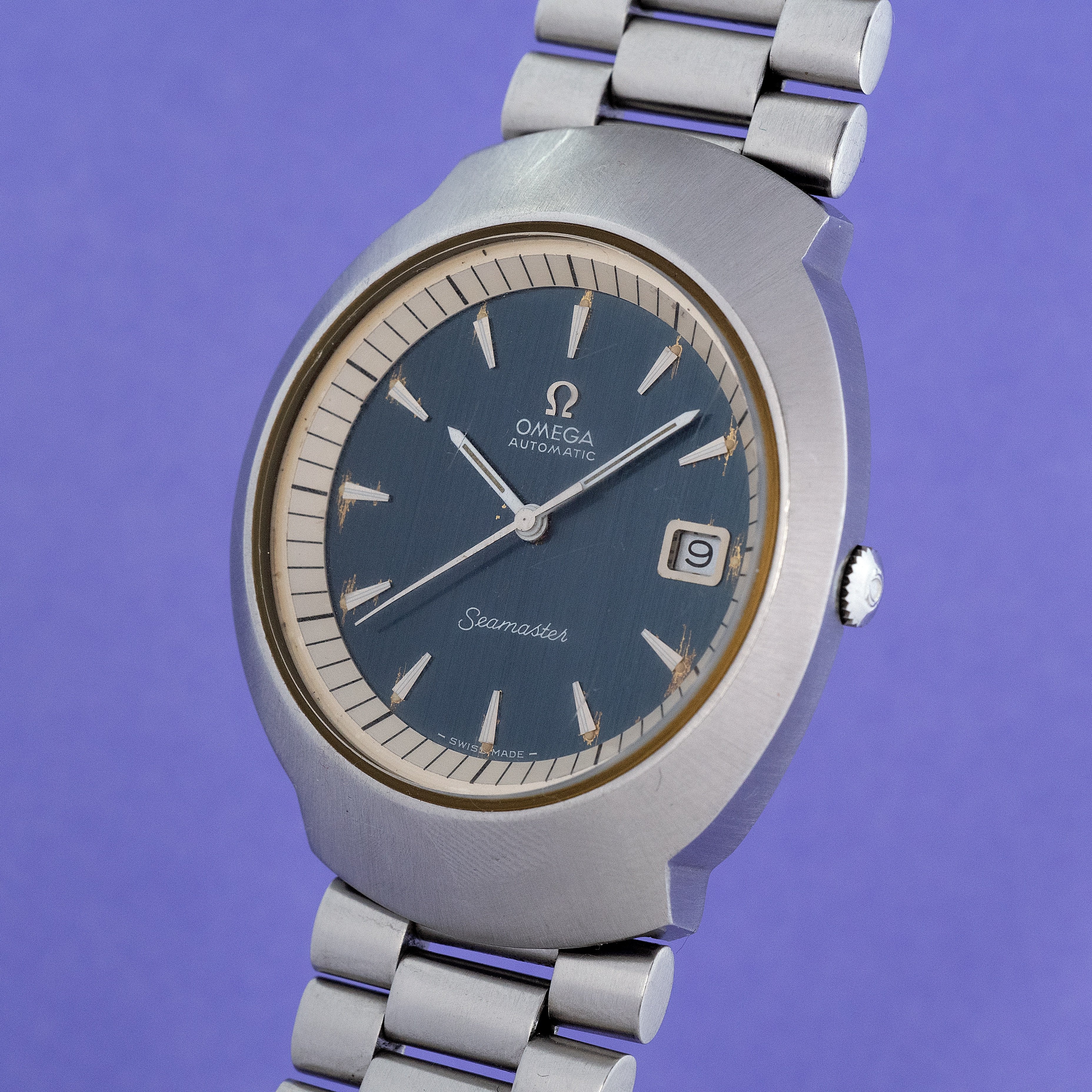 The dial is very nice, showing usual degradation of Omega blue dials on the indices and close to the hands pinion.