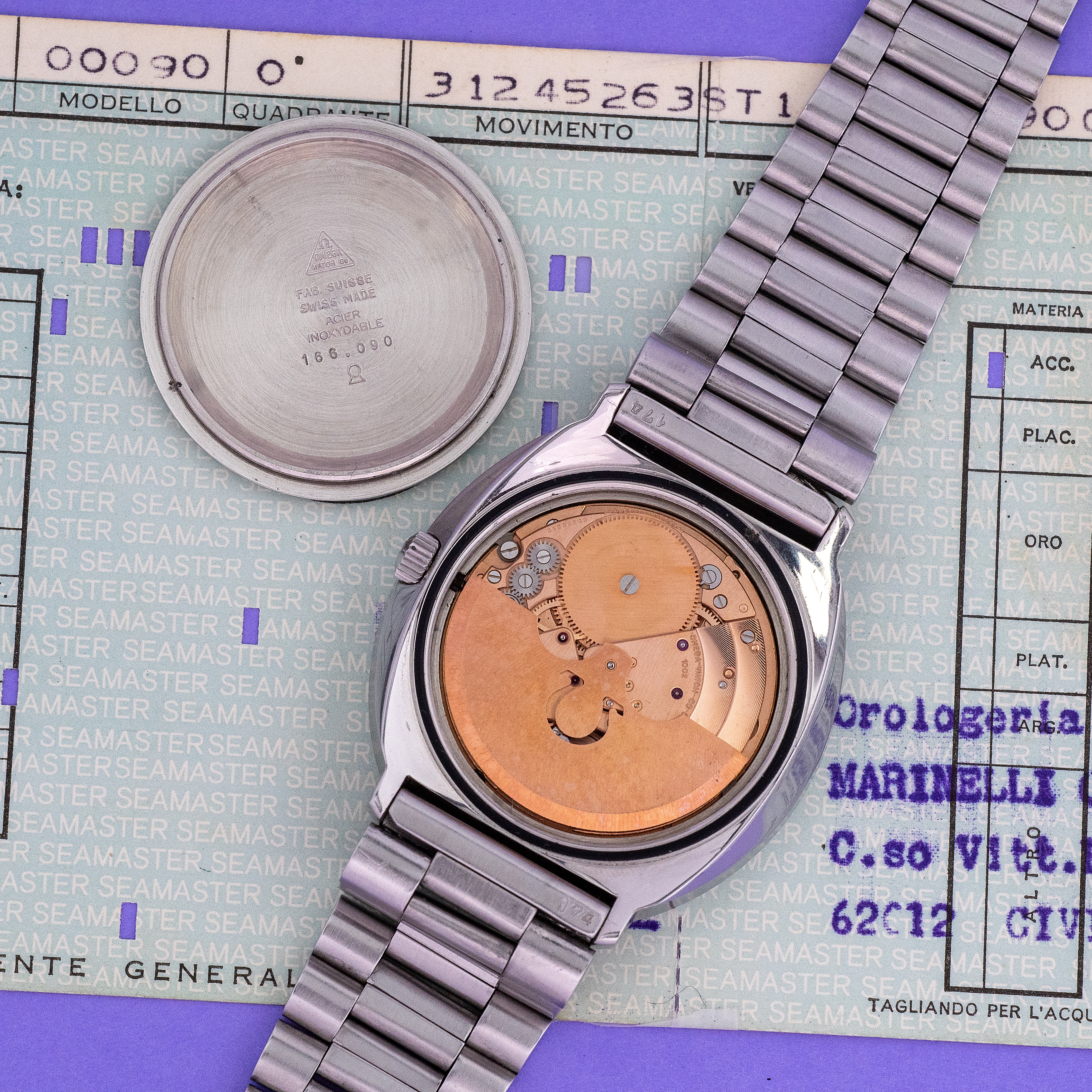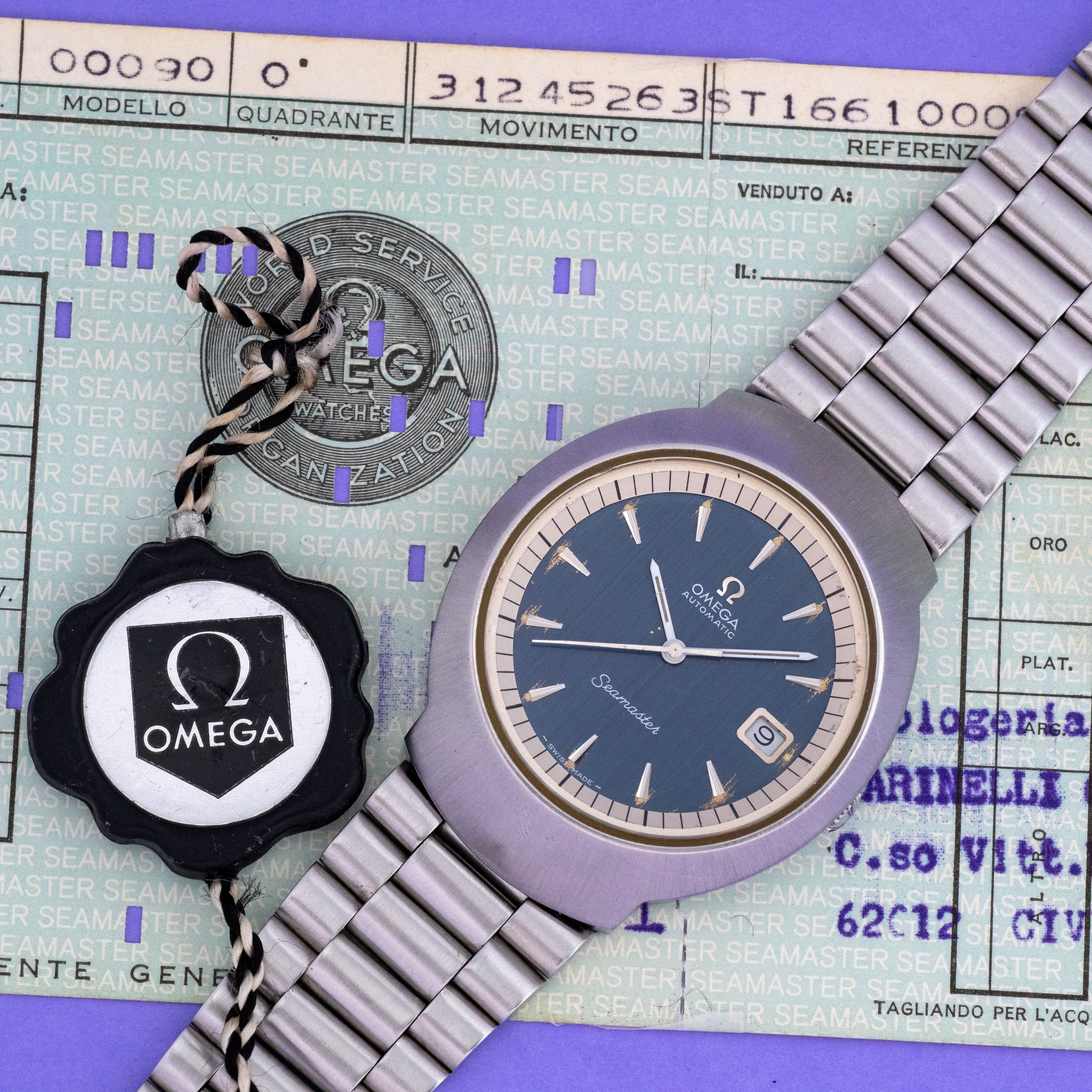 The watch comes with the Omega tag and its original Italian warranty with both reference and serial number matching.
