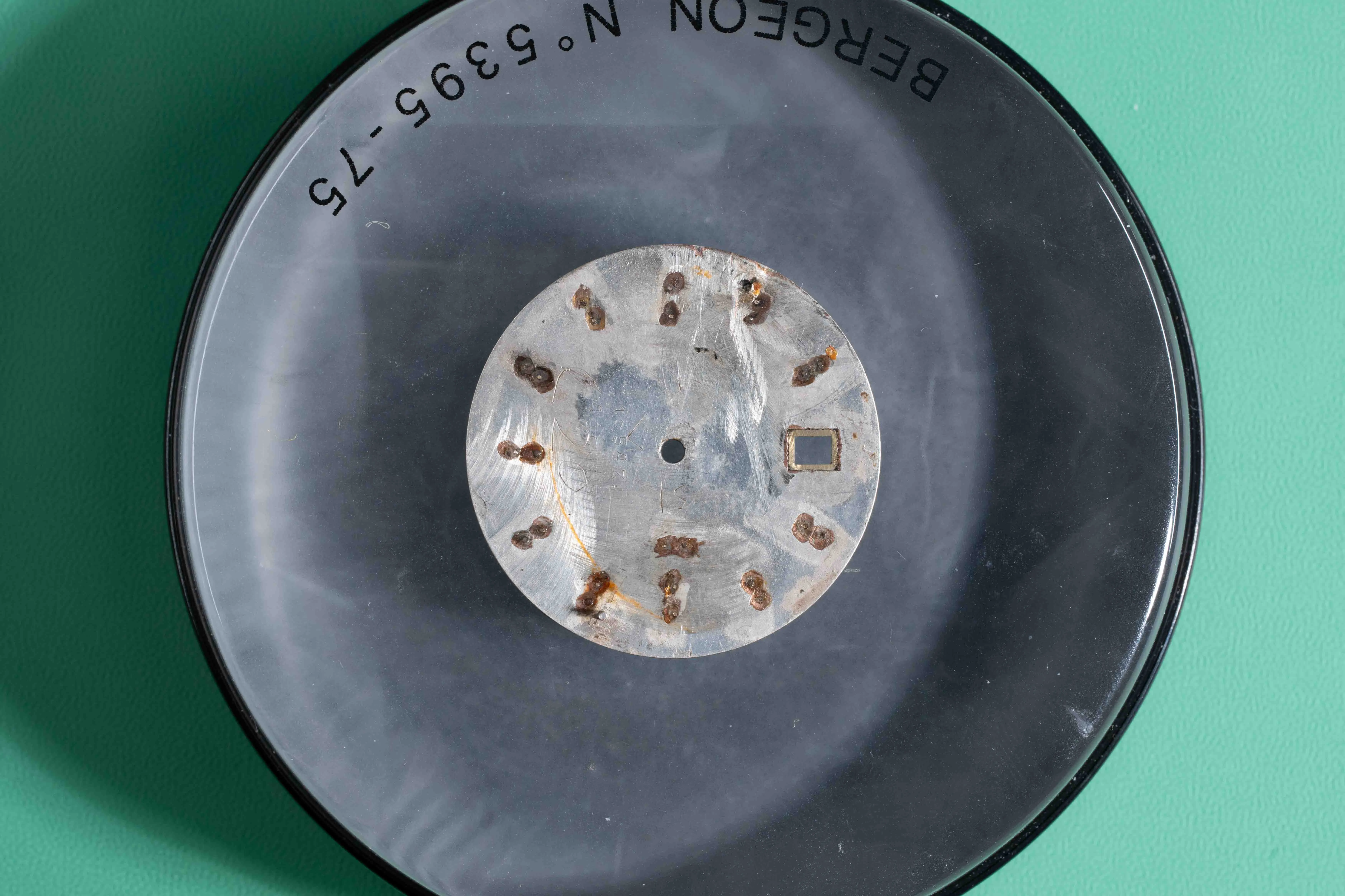 The dial on the 166.092 seem to dominantly have the single bushed direction vs the 166.066 that has the "X" pattern. The 192 has the -swiss made- below the indices and the 066 between. Not sure if there was a transitional dial where the 'X' pattern was on a 192. I have never seen the back of a know genuine example to know if this is a bad redial or an outright forgery. Dial does not have any Lum, Swiss Made is too low and lacking dashes, Brush direction is not straight, date disc is black rather than the white, etc, etc.. Dial used little adhesive pad in addition to a single dial foot. (seen on the movement).