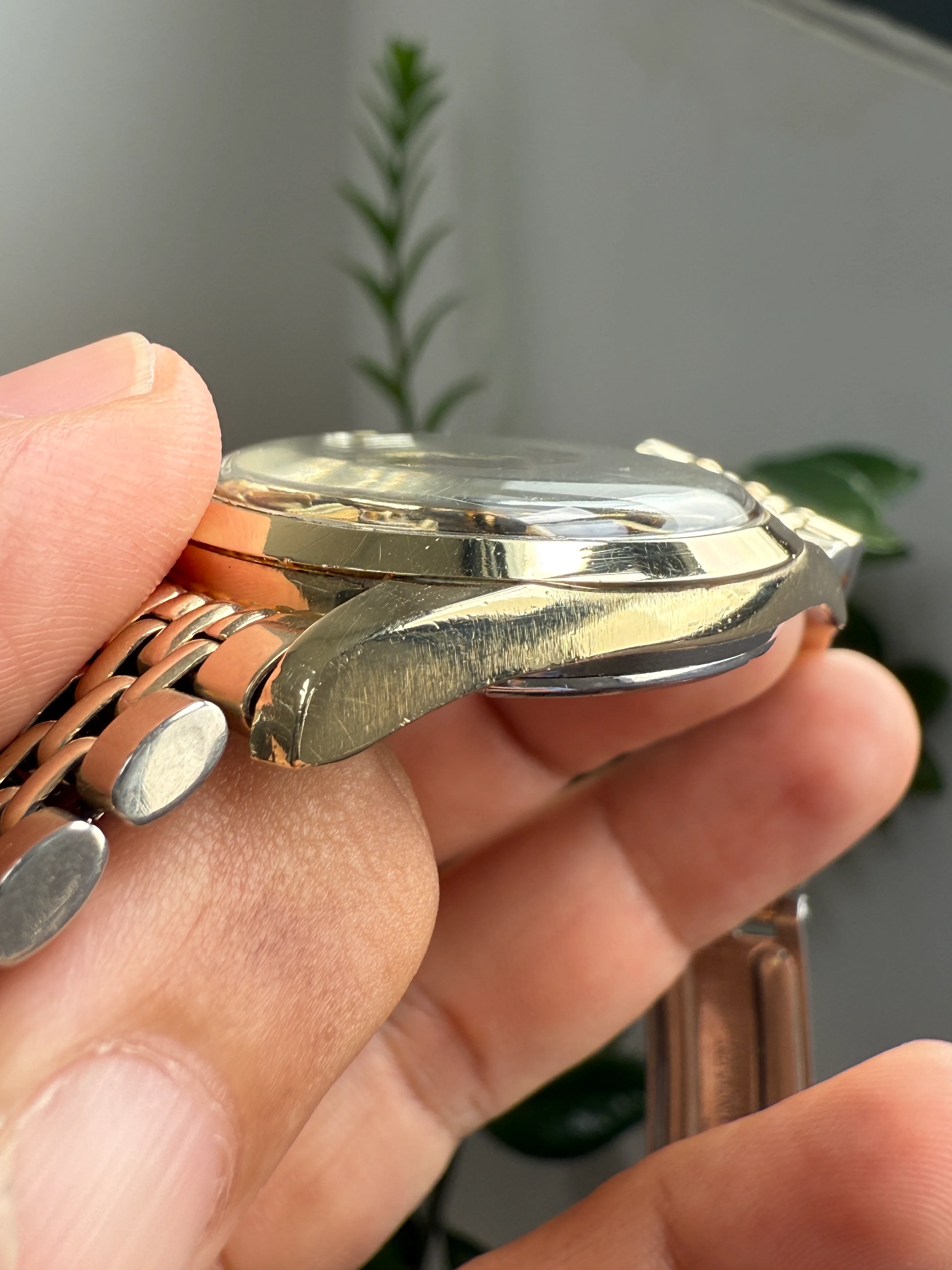 - Dial: Original black gilt dial with gold tone scripts; faceted date-aperture frame at 3; dauphine hands; hands and hour markers have lume; prints, hands and hour markers are all good. The dial surface has been aged and damaged in the center area (details are shown in photos below).