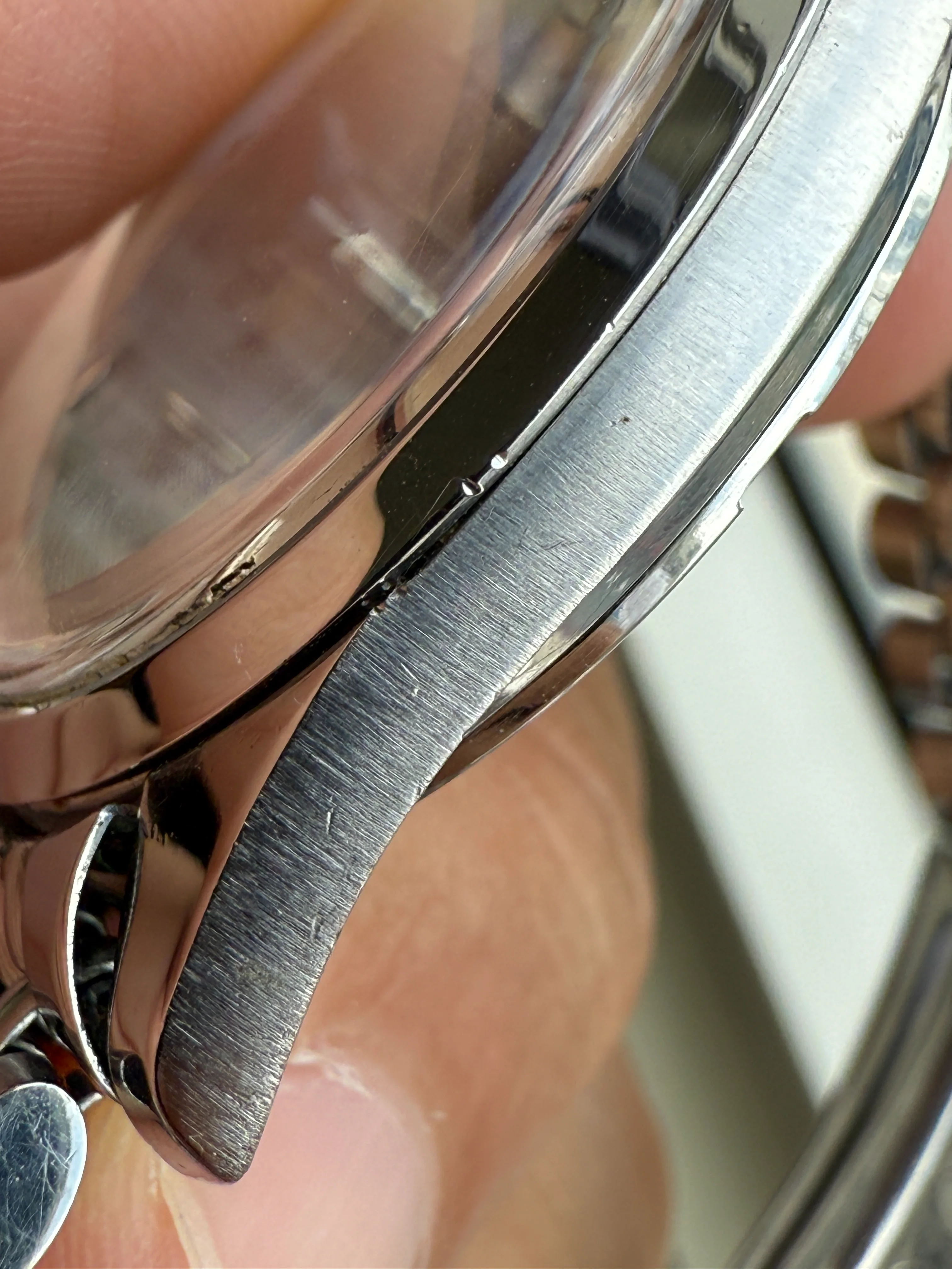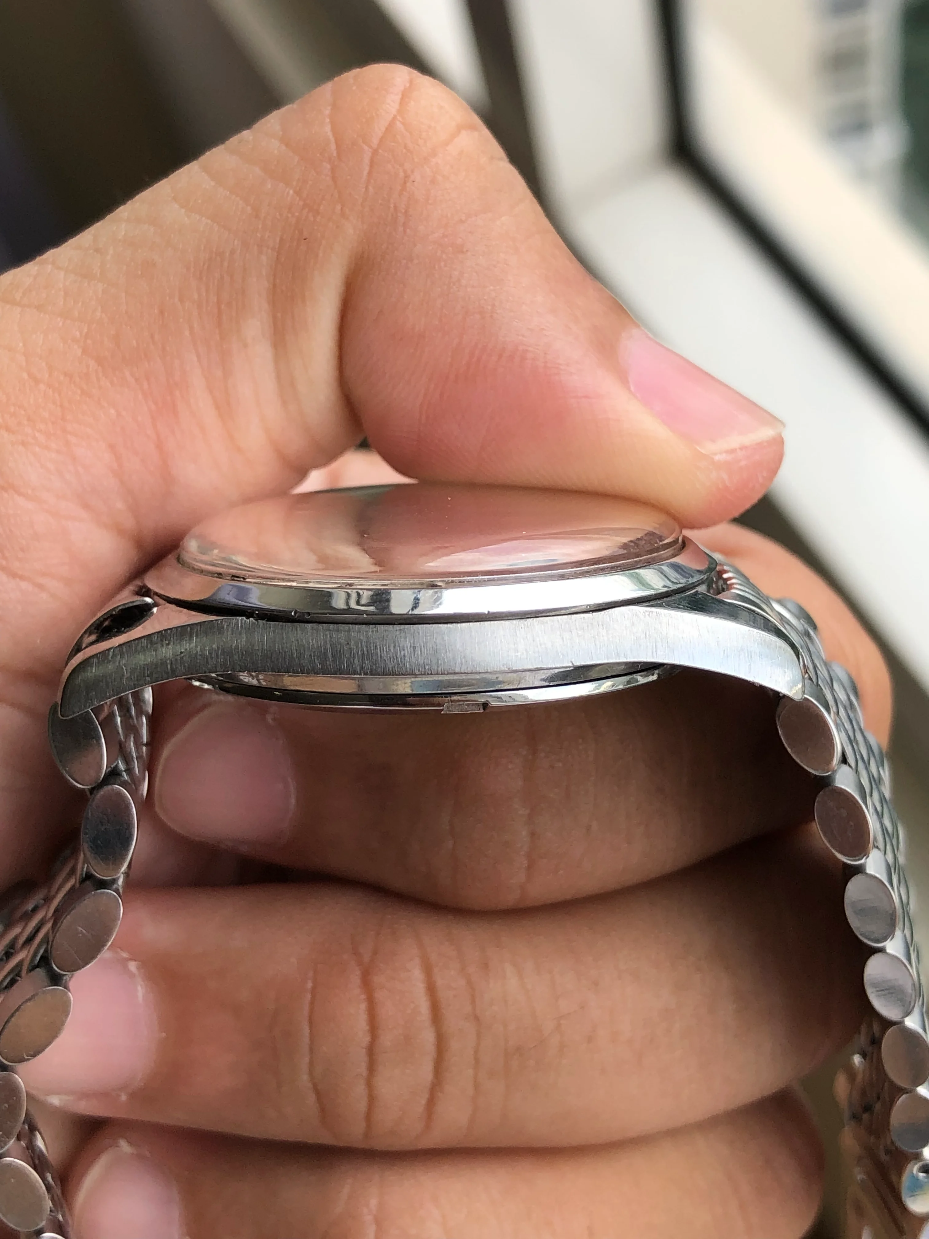 - Dial: Original white sunburst dial with black onyx-inserted hour markers; faceted date-aperture frame at 3; dauphine hands; prints, hands and hour markers are all good. There are small spots that evenly distributed on the dial (as shown in photos). The 30, 2, 3 number on date wheel have partially faded print (as shown in the Youtube clip).