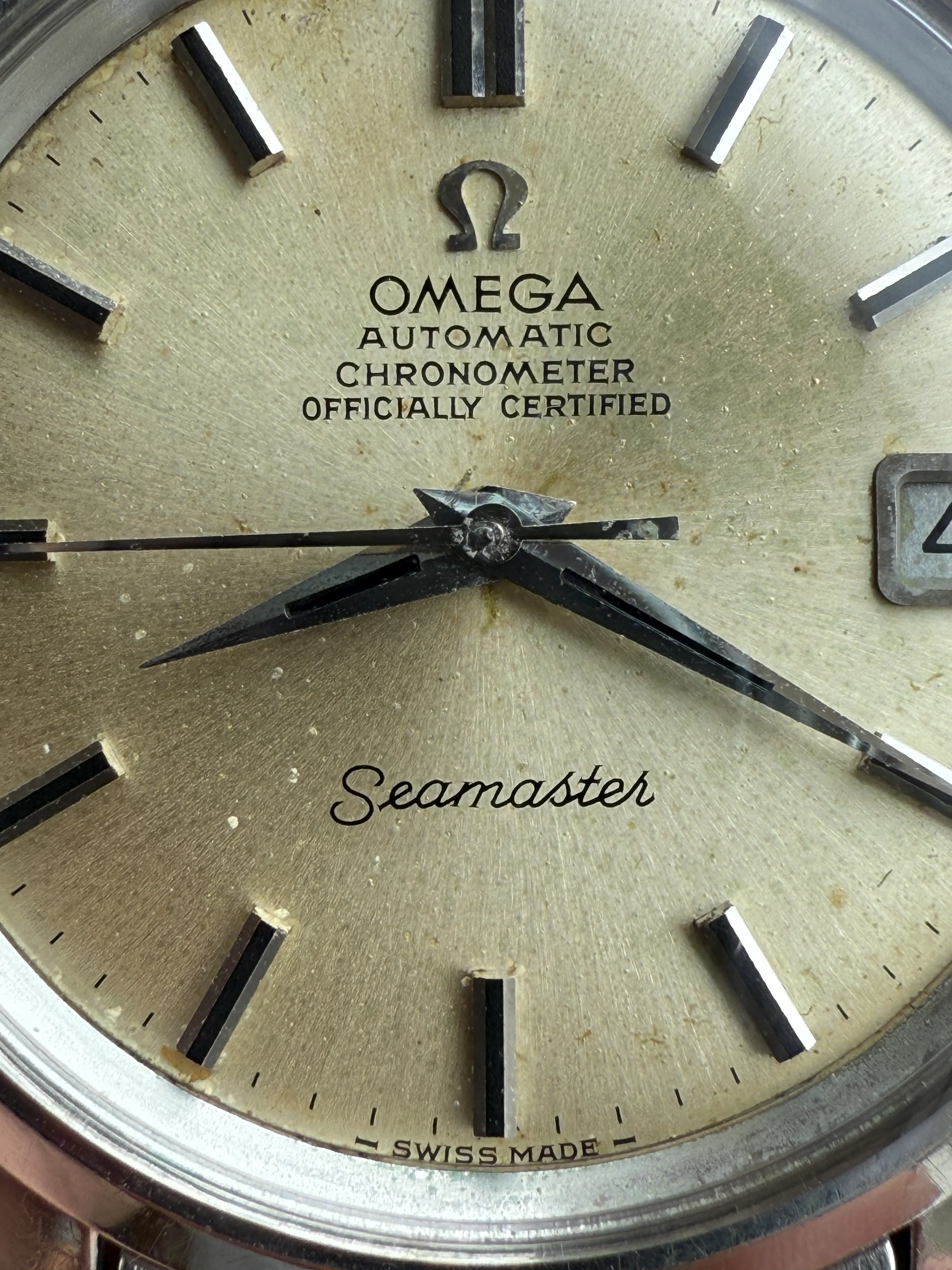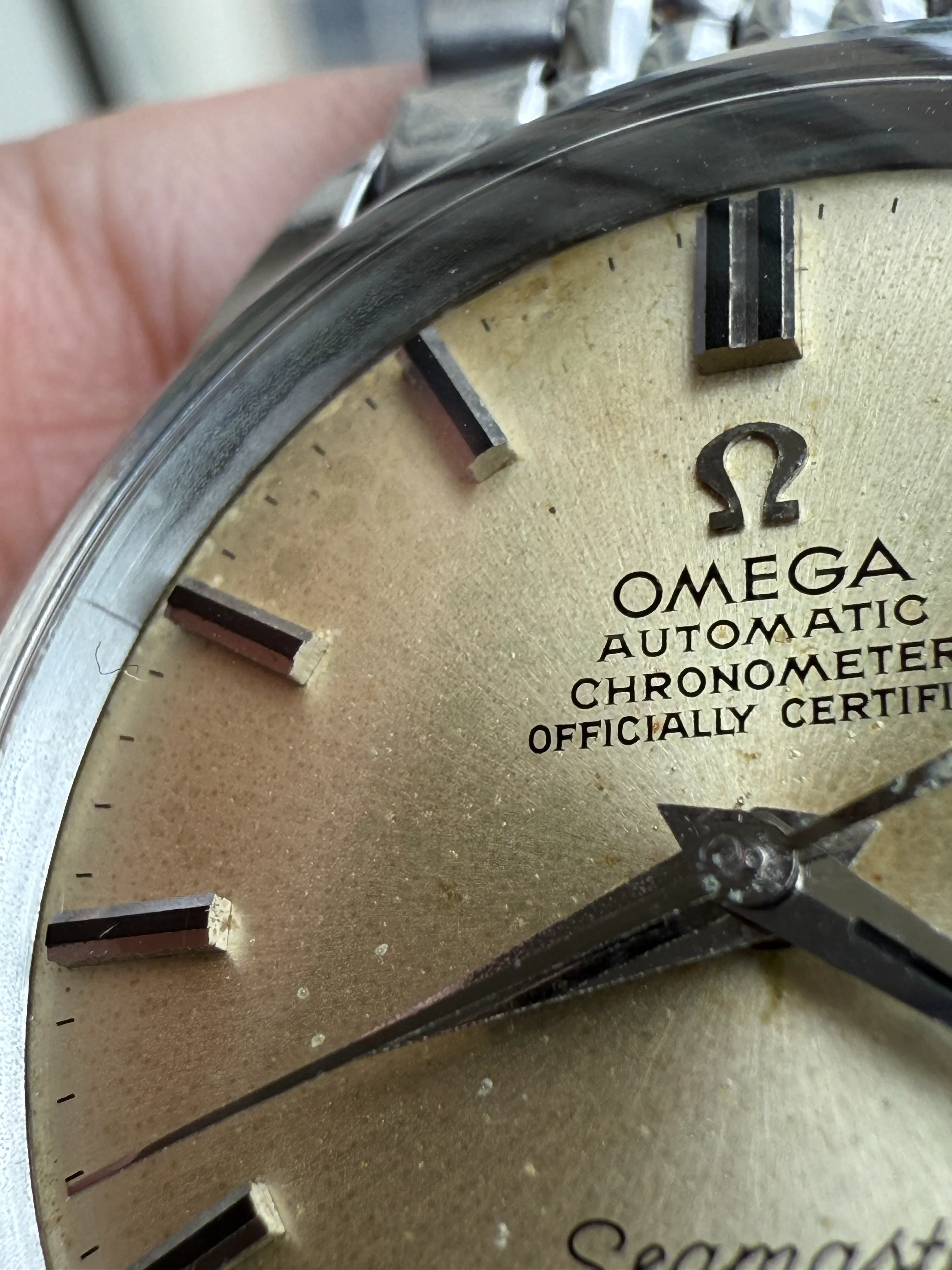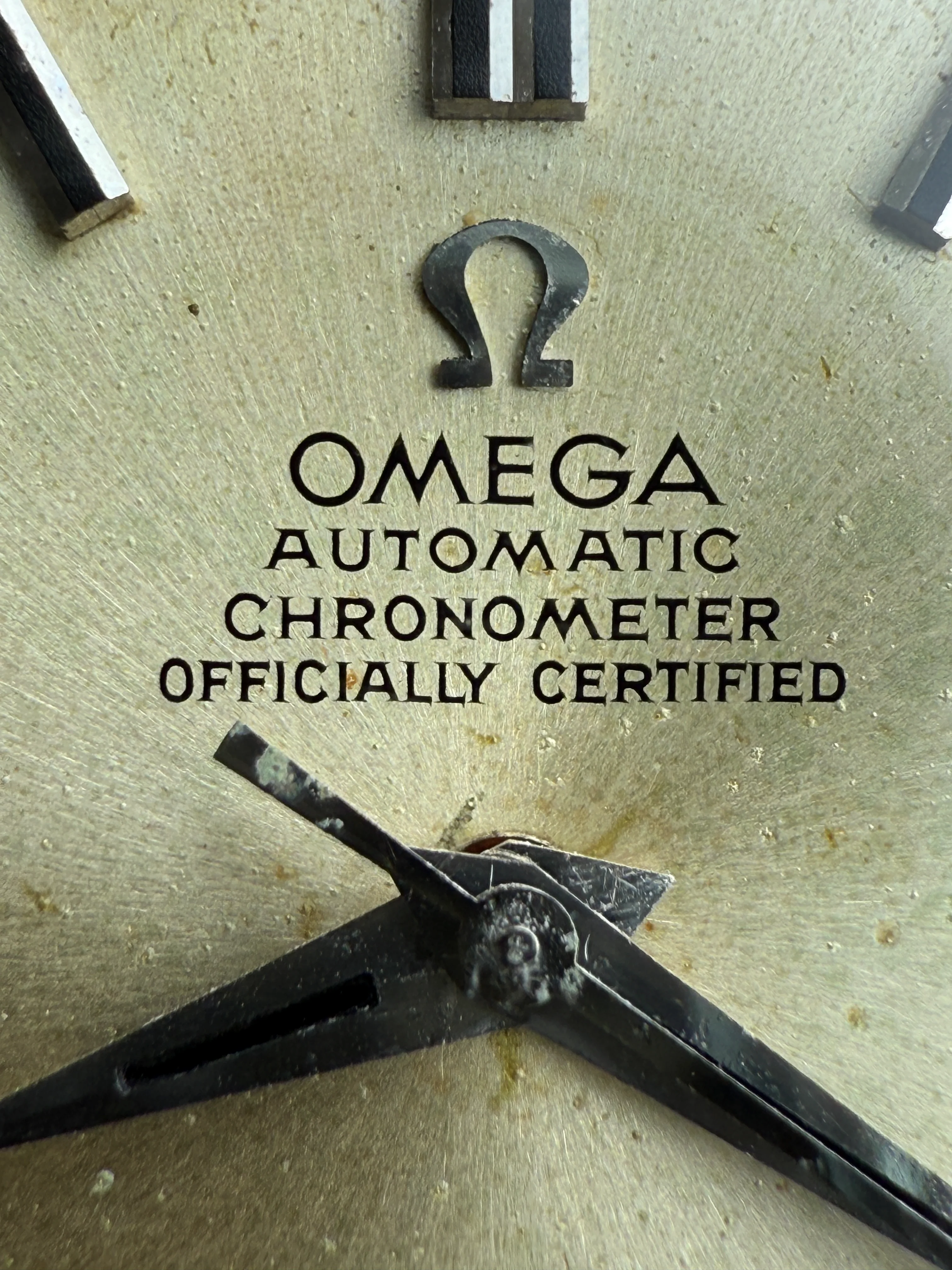 A stainless steel Omega 168.024, chronometer, 35mm, the sunburst dial has been damaged with clear signs of age, original Omega 1036/511 bracelet, newly serviced, free shipping with insurance in EU.