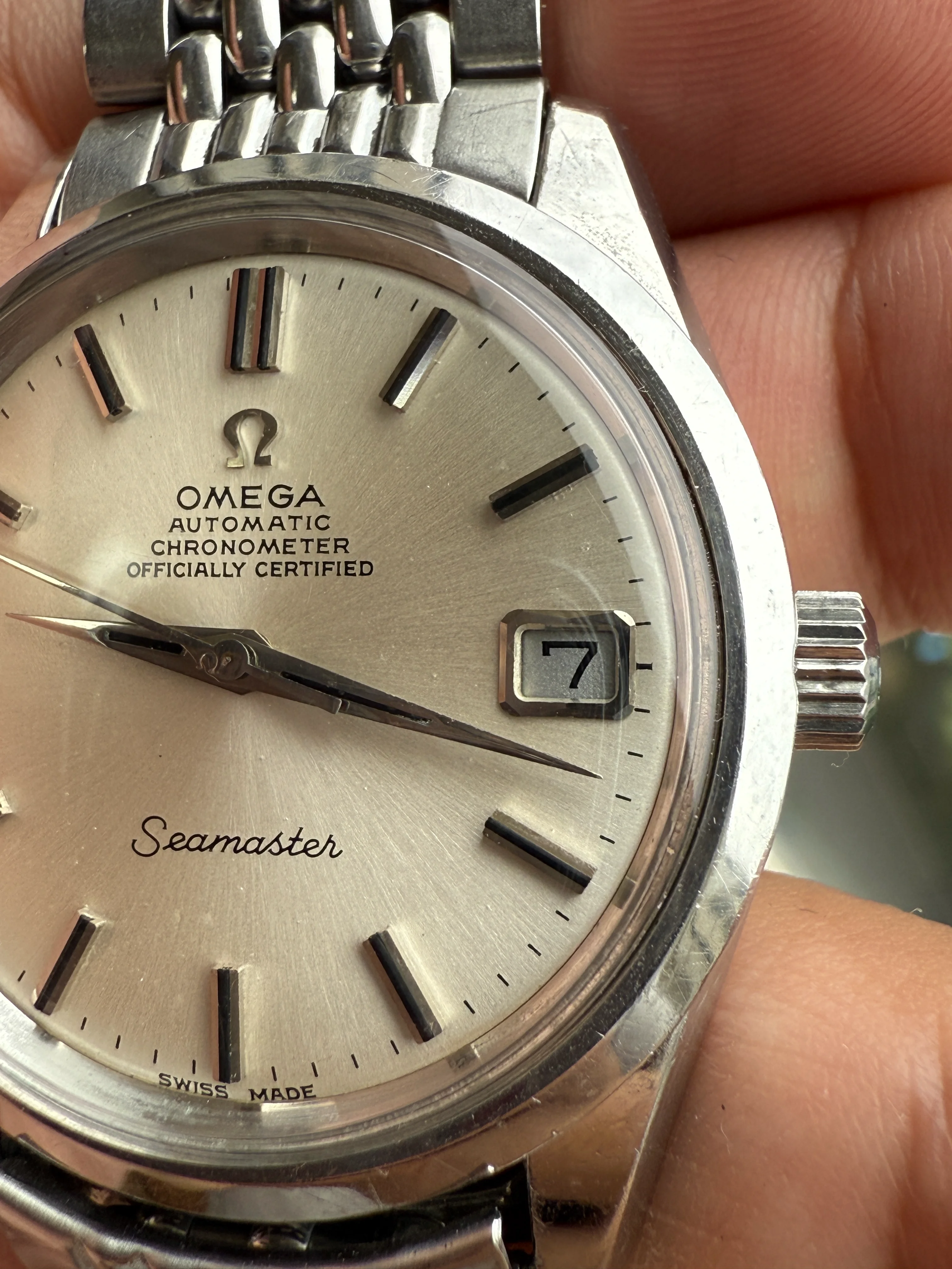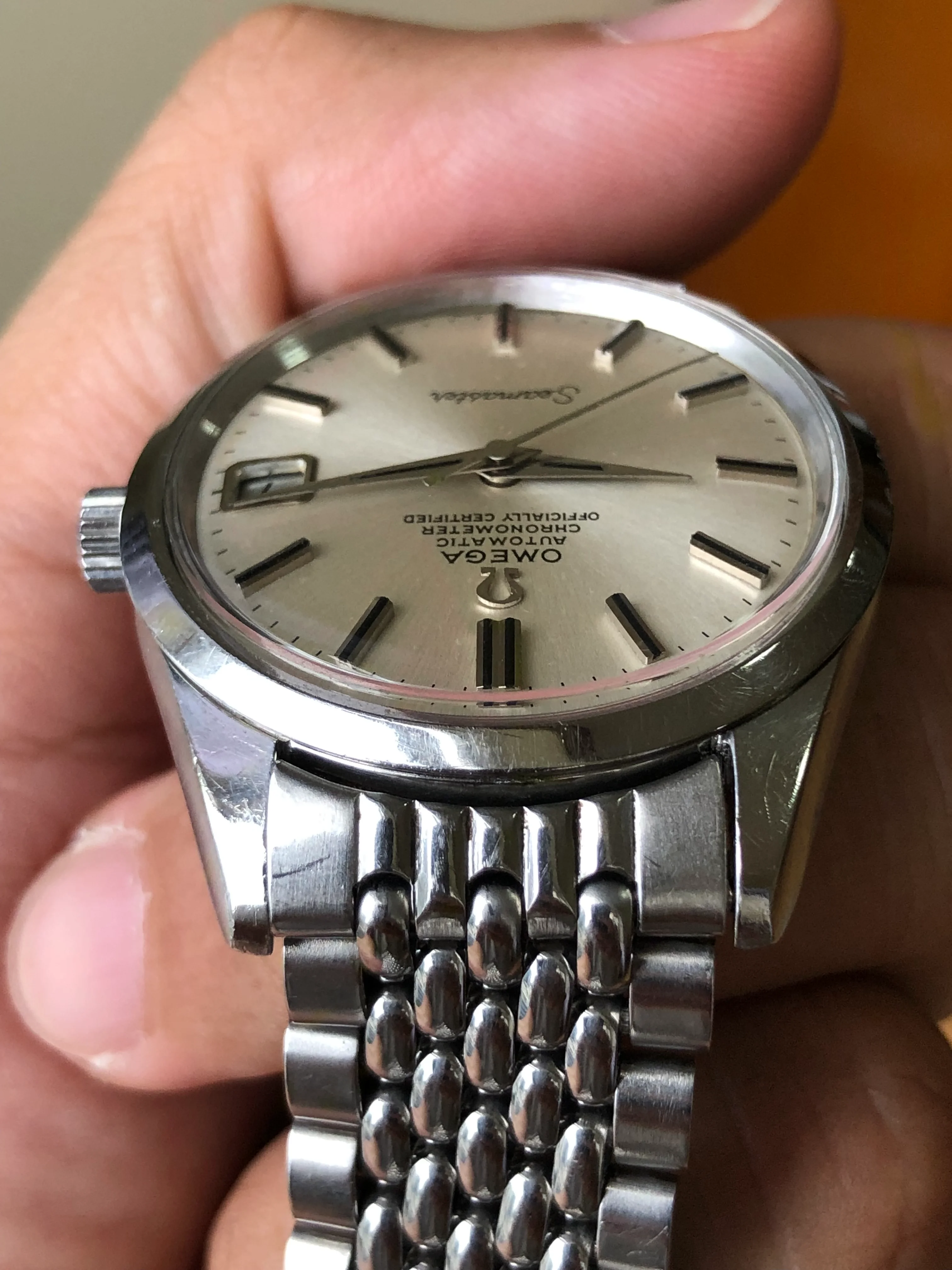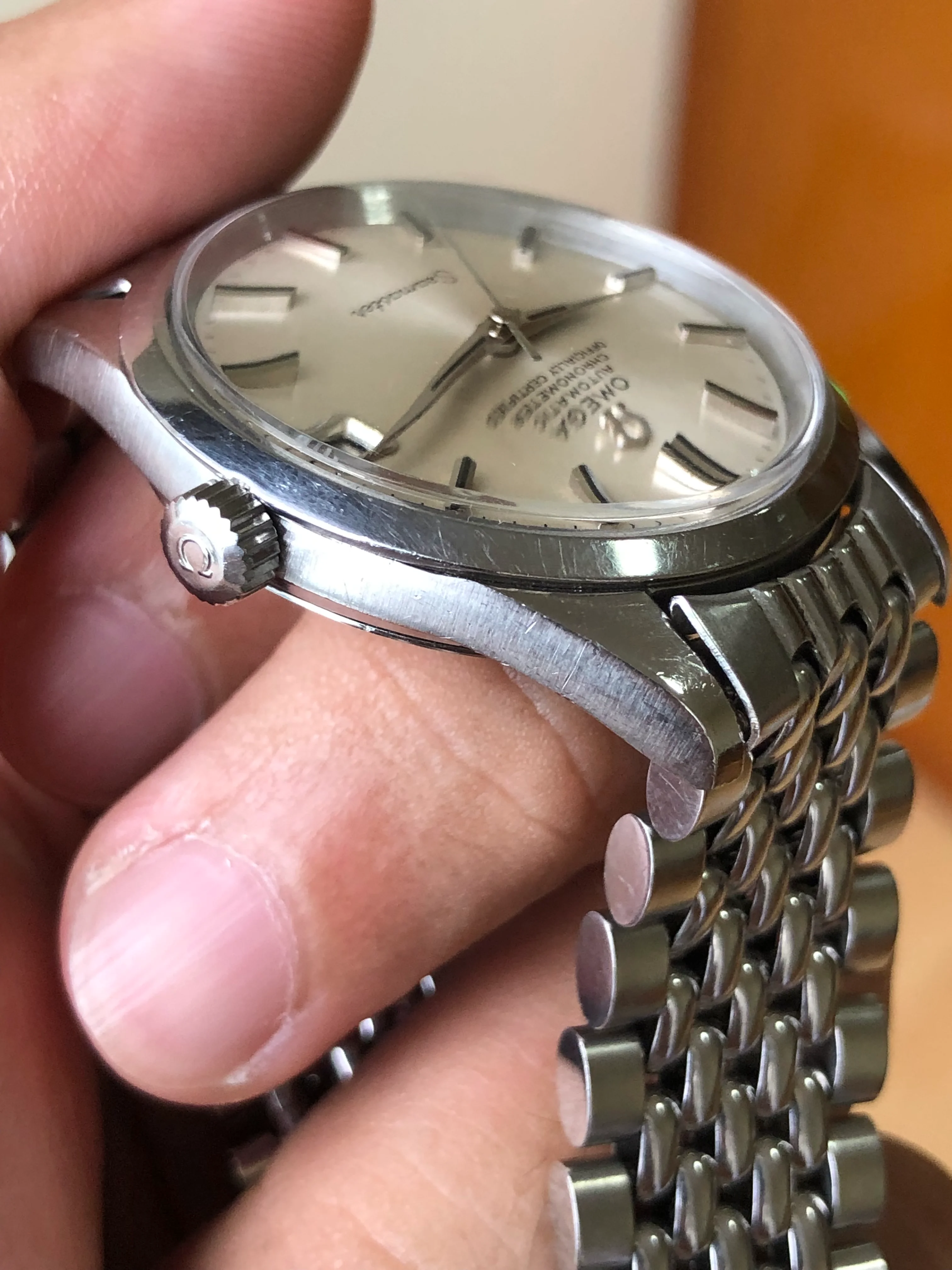 - Case: The diameter is 35mm without the crown. Original case is in good condition with scratches, some small chips on the bezel at 9’. Original Omega knurled crown.
