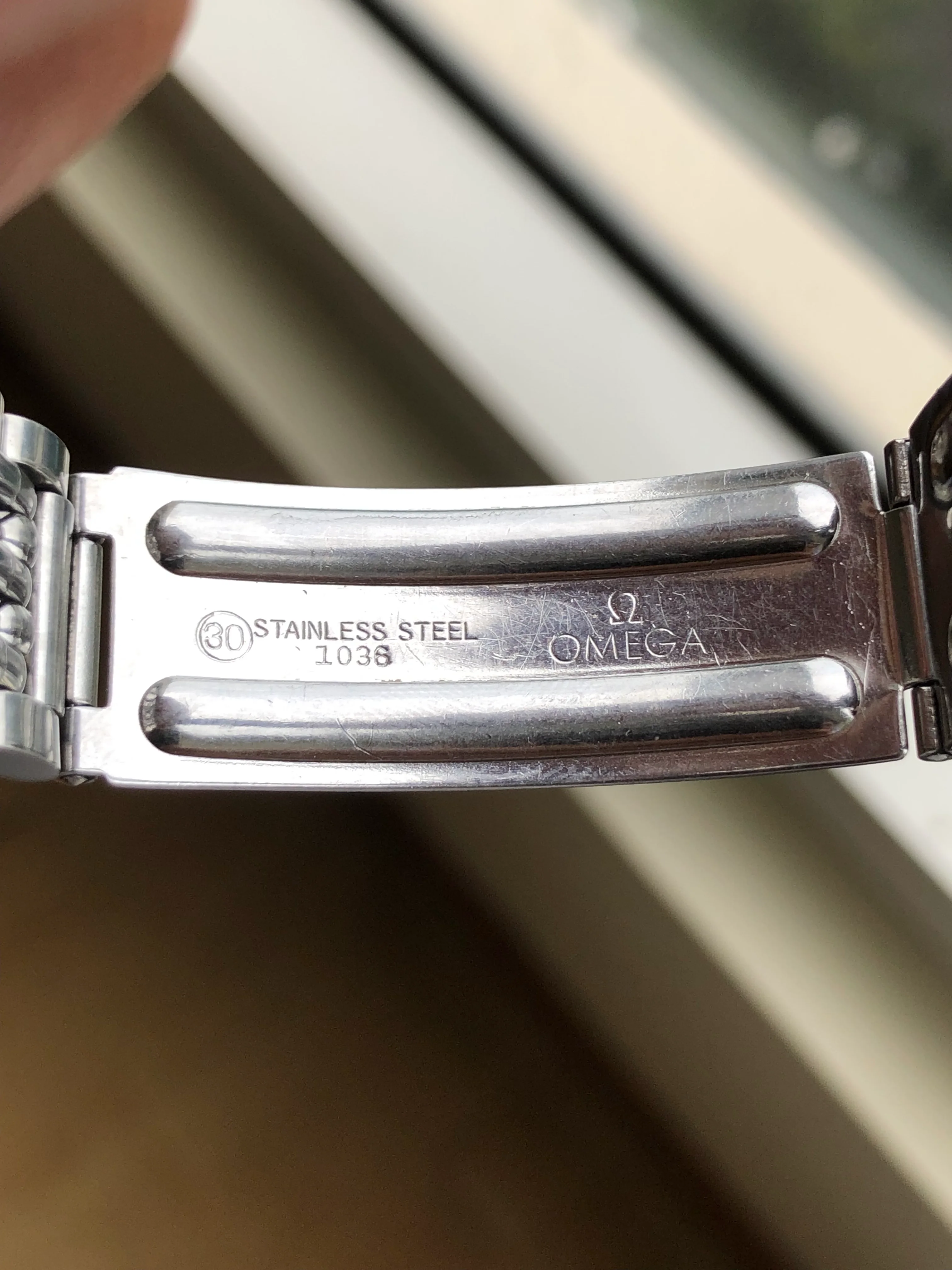 - Bracelet: Omega bracelet reference 1036 with 11 end-links in very good condition; triple fold clasp featuring micro-adjust with Omega logo.