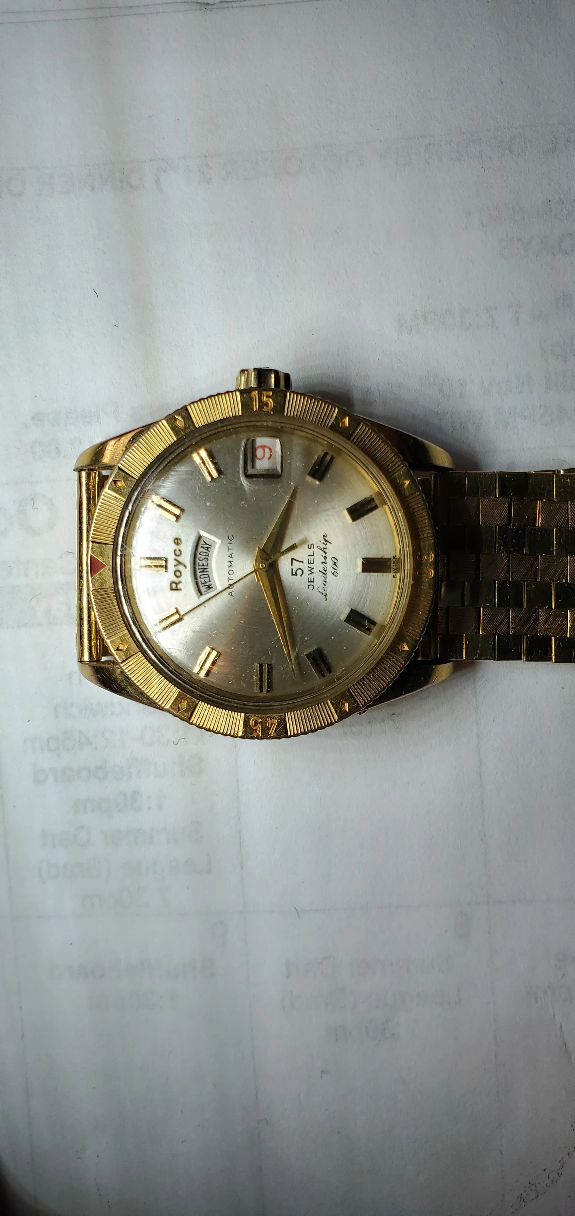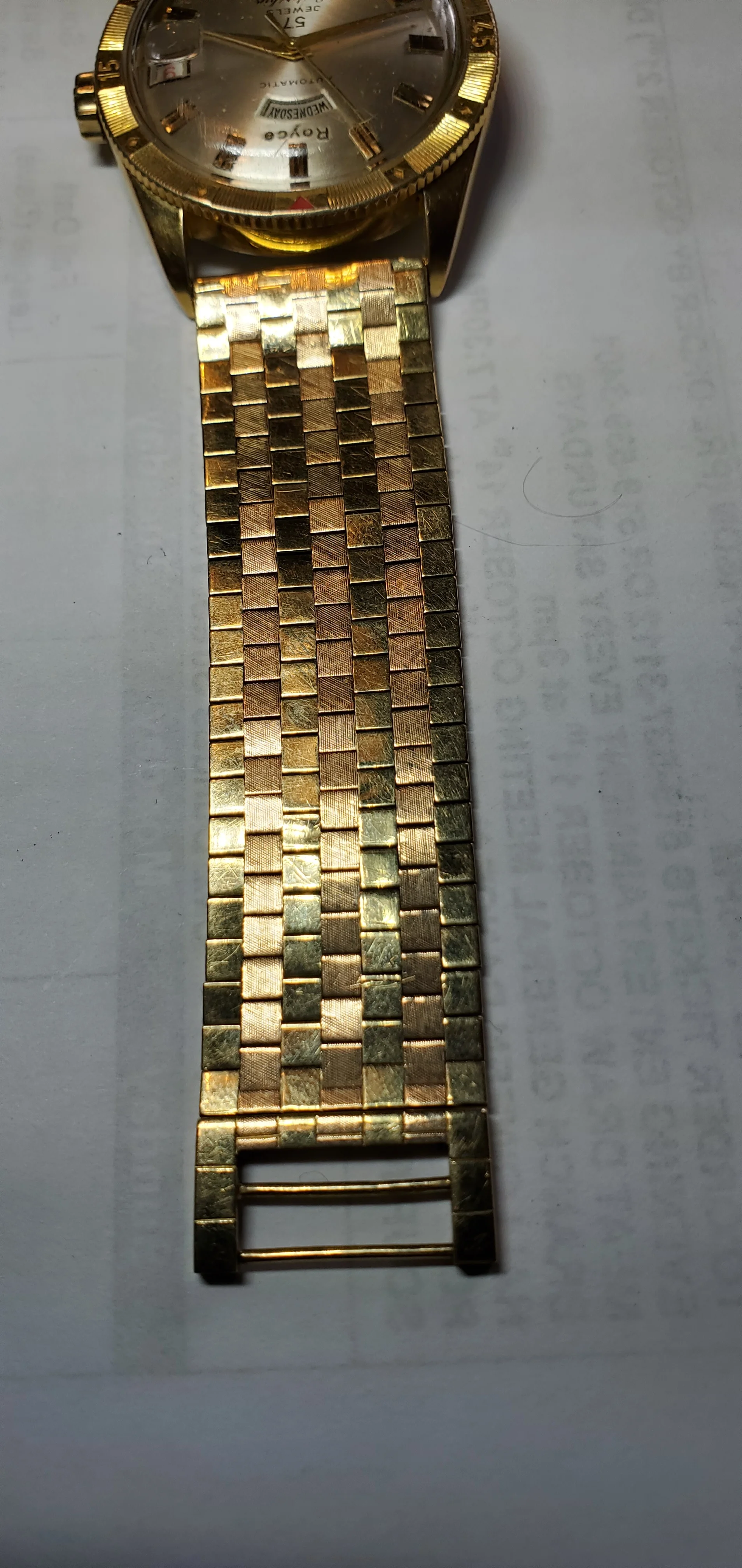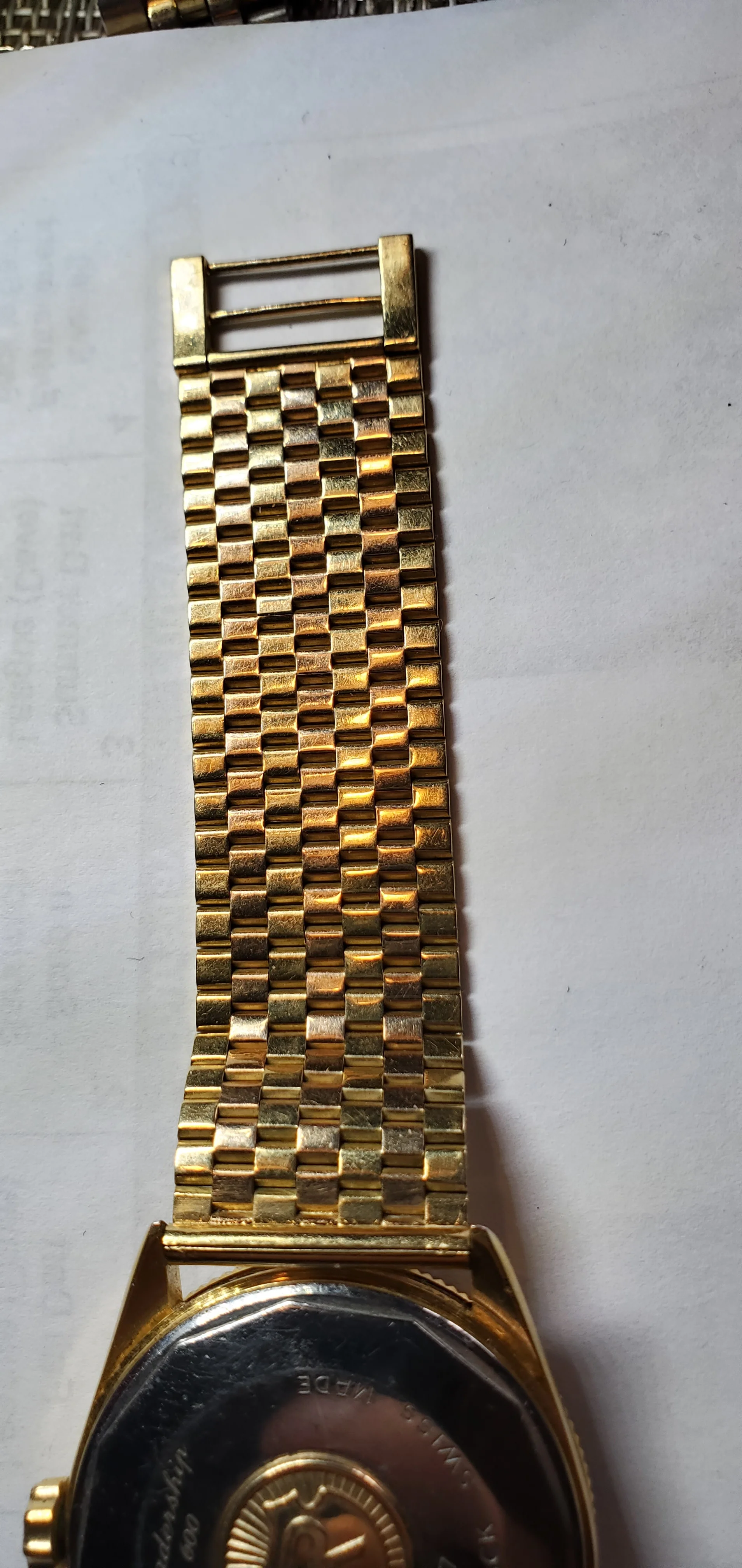 ·I only just noticed the very mall hallmark on this solid 18k band as being Omega. It is on a Royce Leadership 600 watch which was my Grandfathers. I would like to know if there is a model # for this band? and ultimately it's value. It has yellow gold and rose gold, very heavy solid. Thanks in advance.