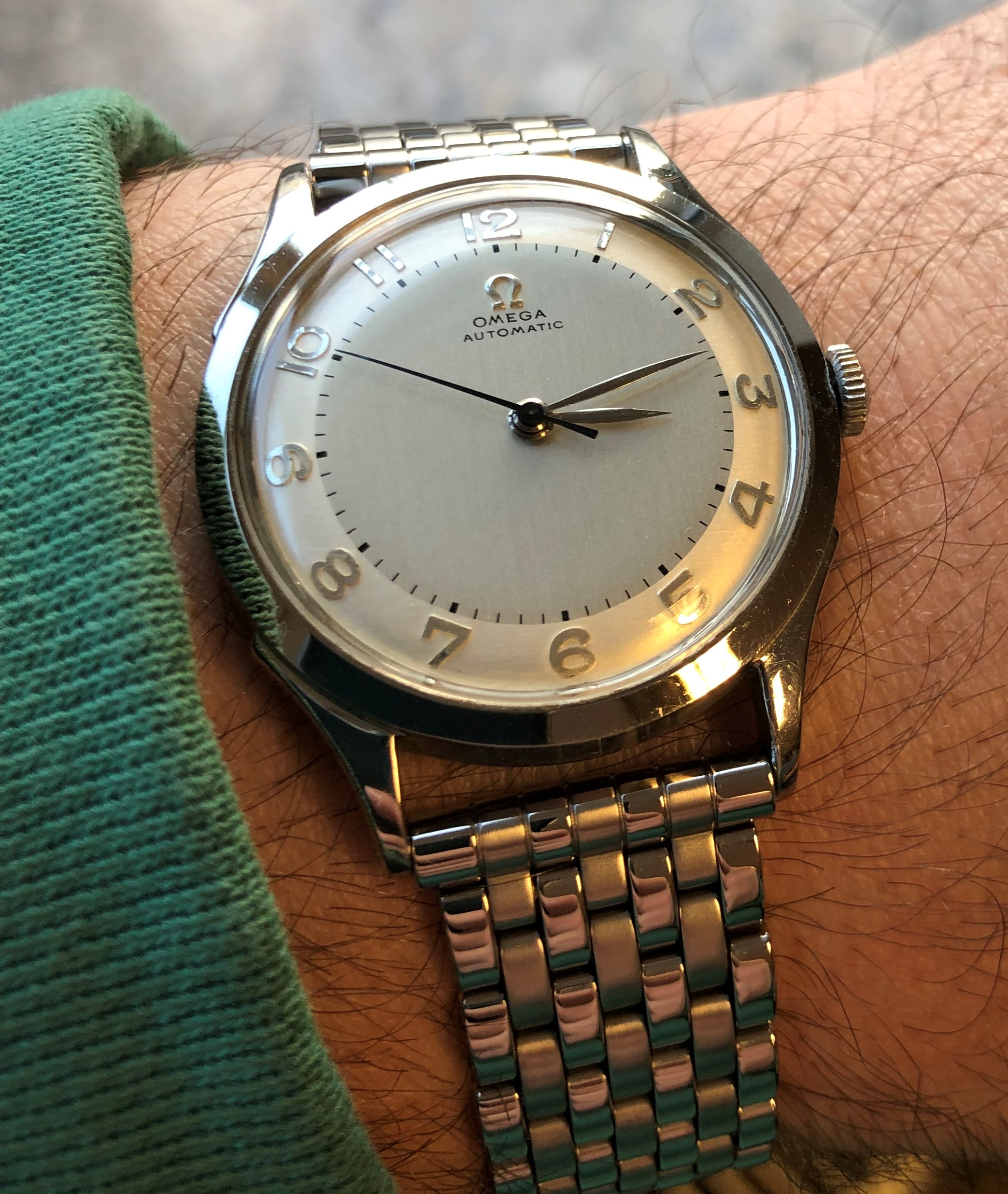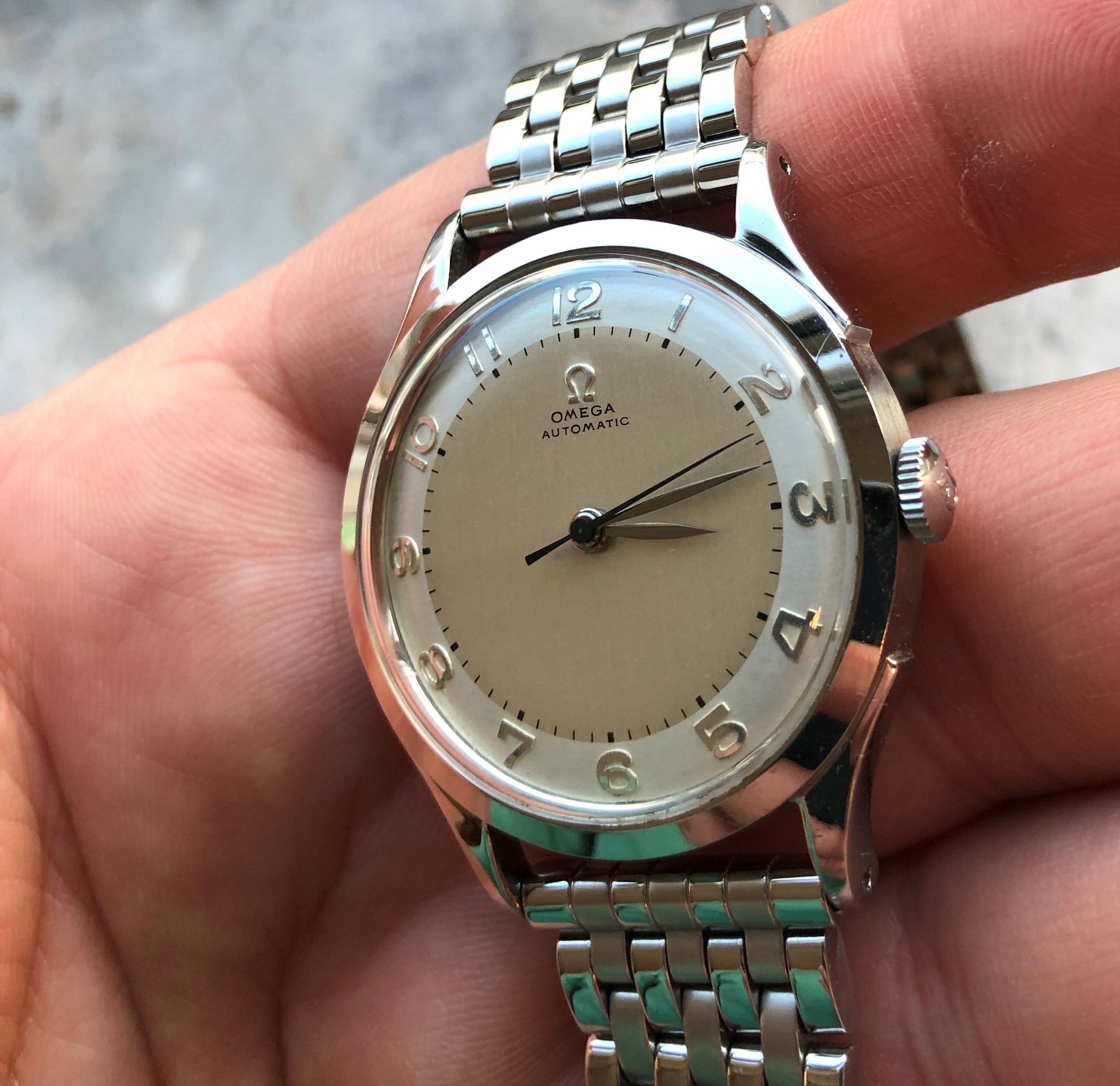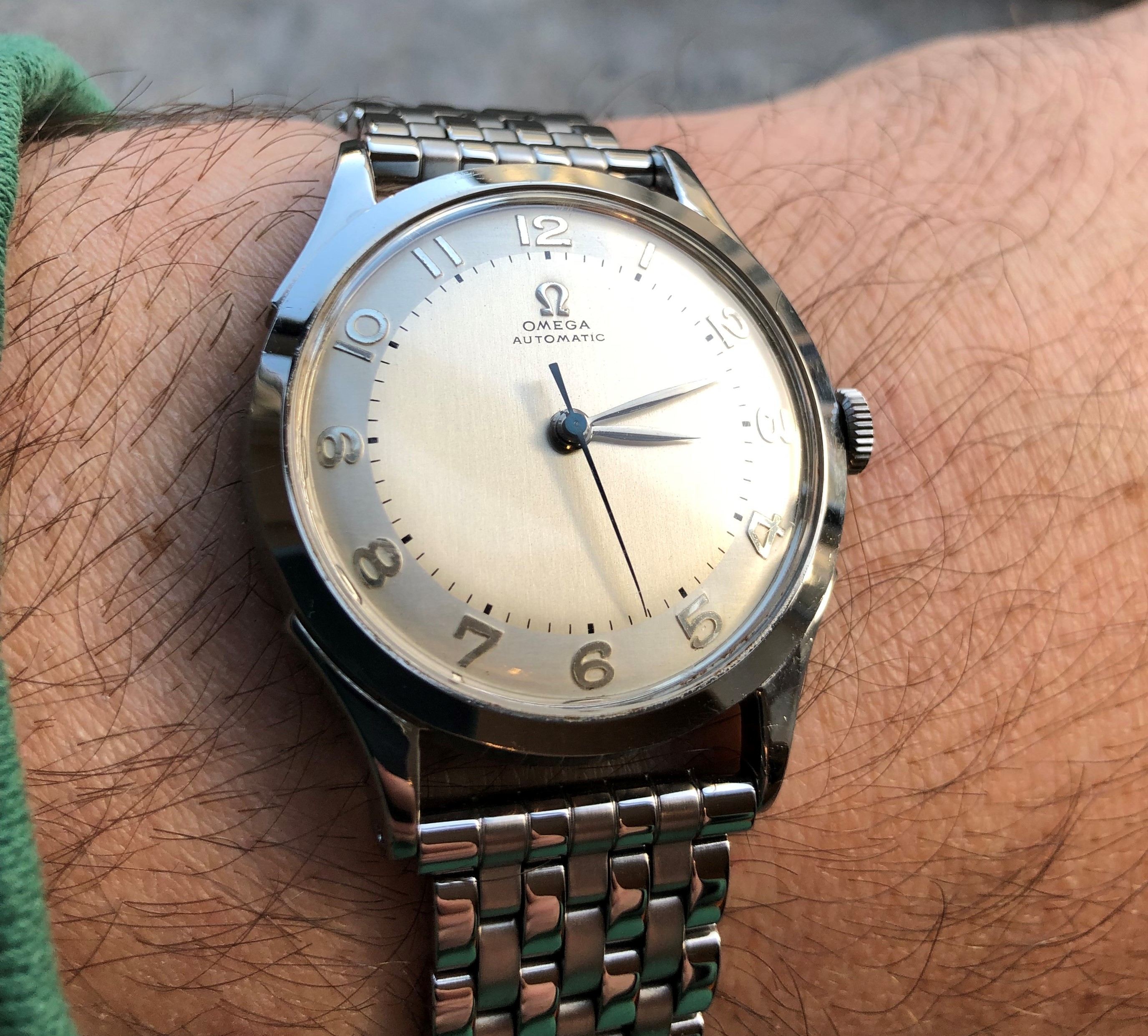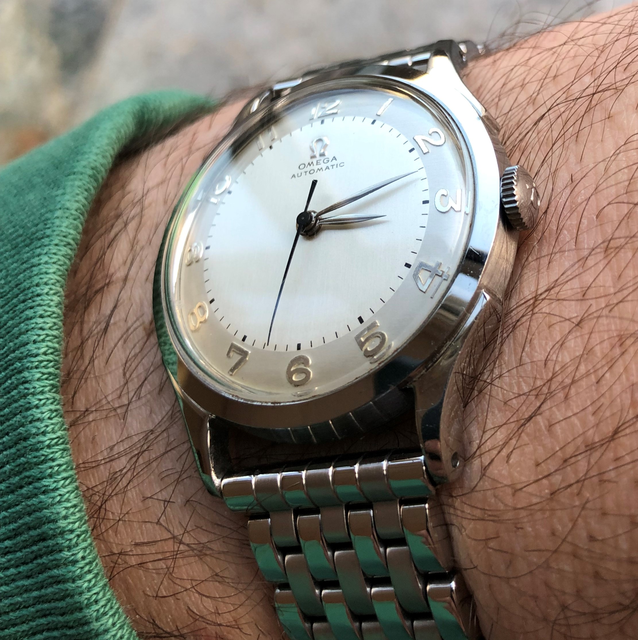 ·For sale is this beautiful Omega Bumper automatic from circa 1949 in fantastic condition. 33mm brushed and polished stainless steel case and In what I believe to be original condition in regards to the dial, hands with blued second hand as well as flat footed crown. It keeps excellent time and winds and sets well. Comes with a lovely black strap, Omega buckle and includes a Forstner beads of rice bracelet with nice presentation box.