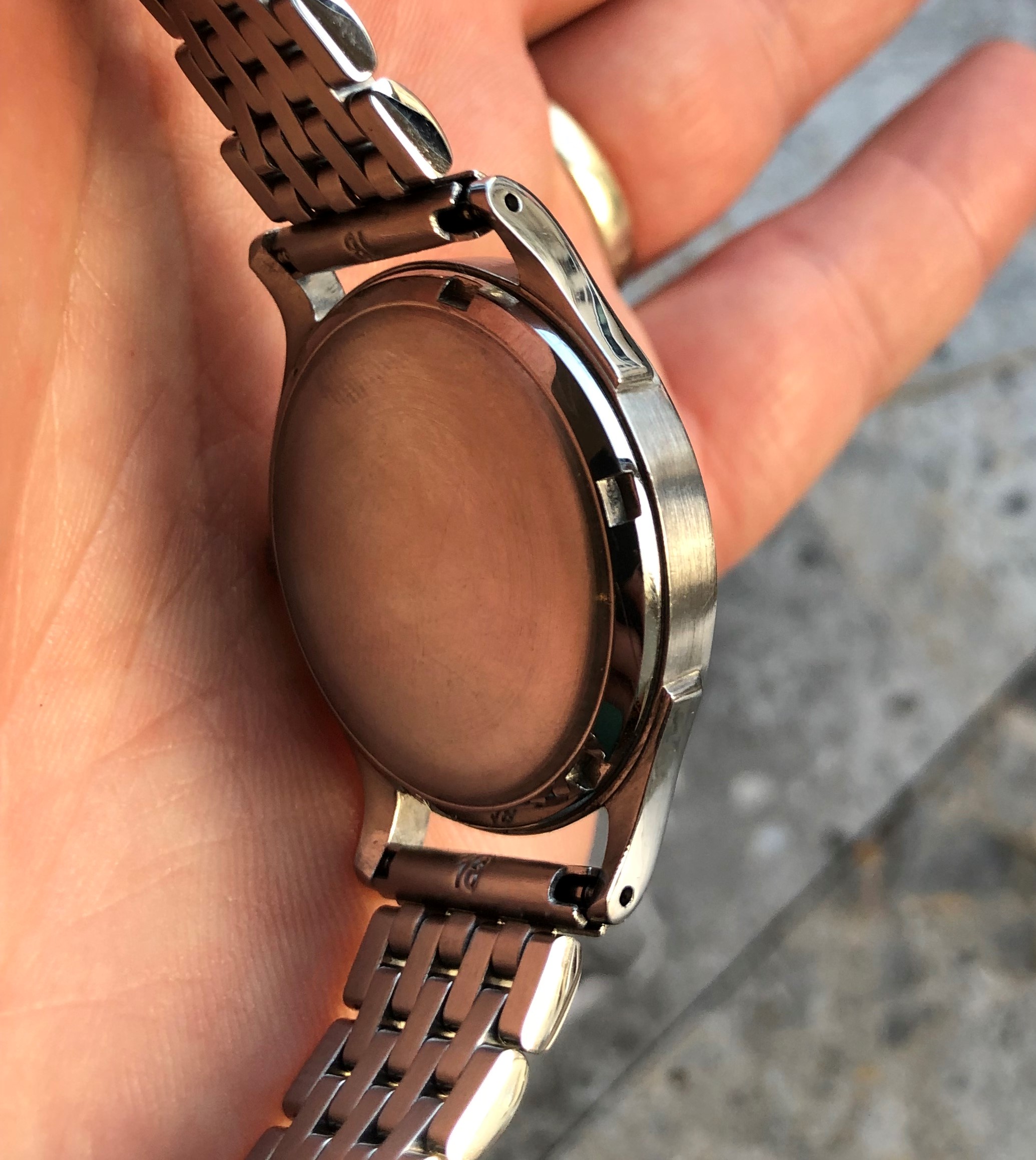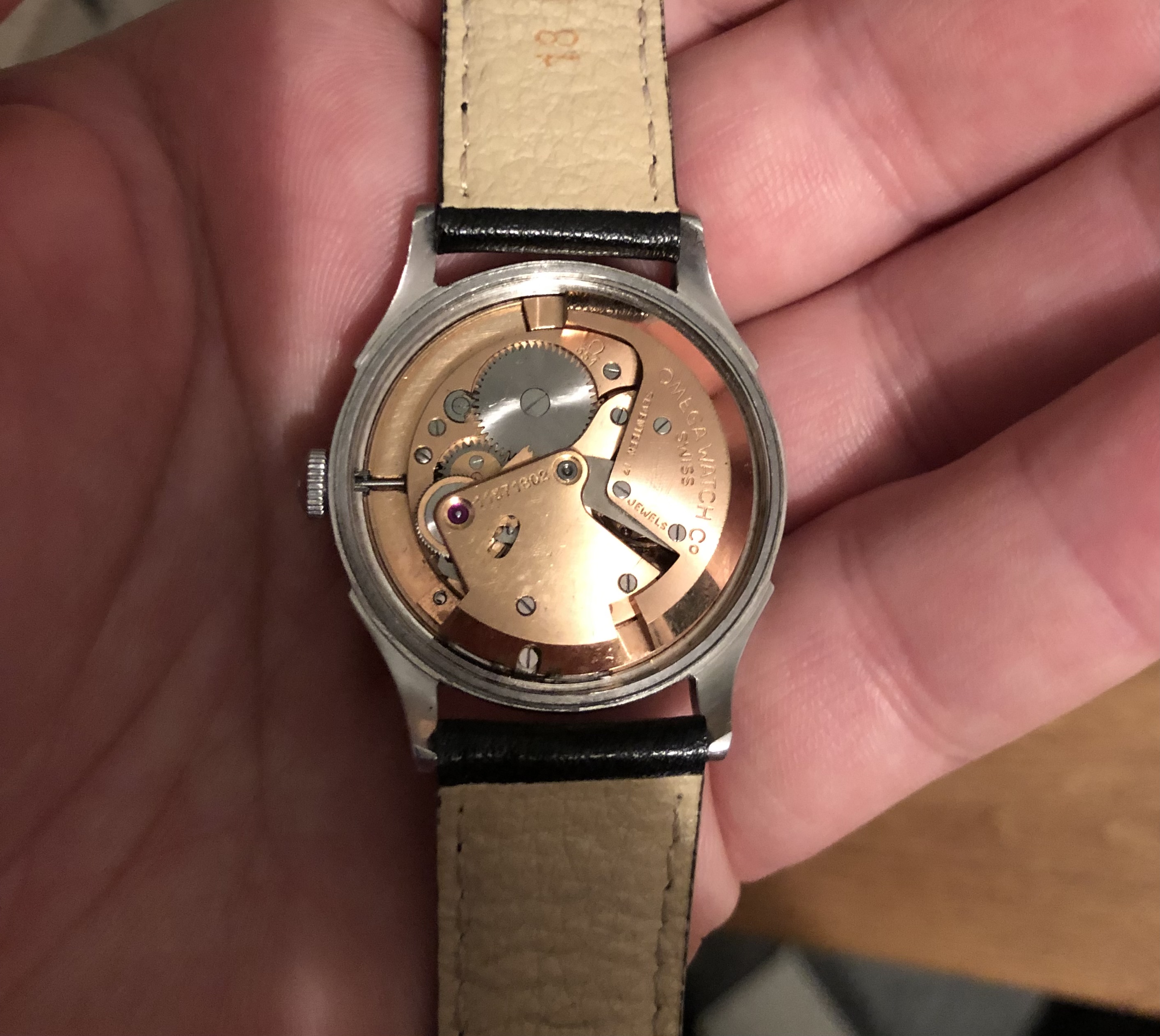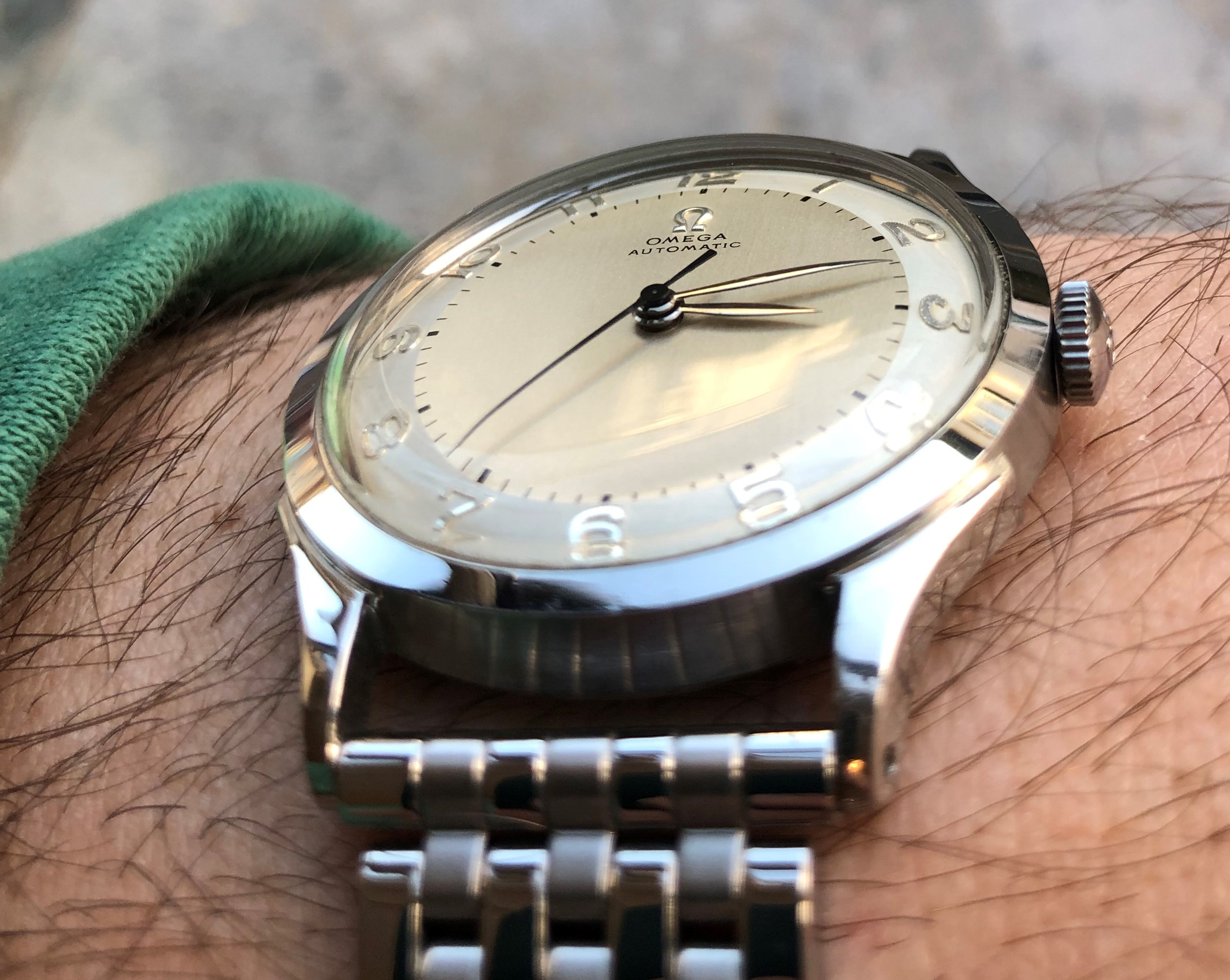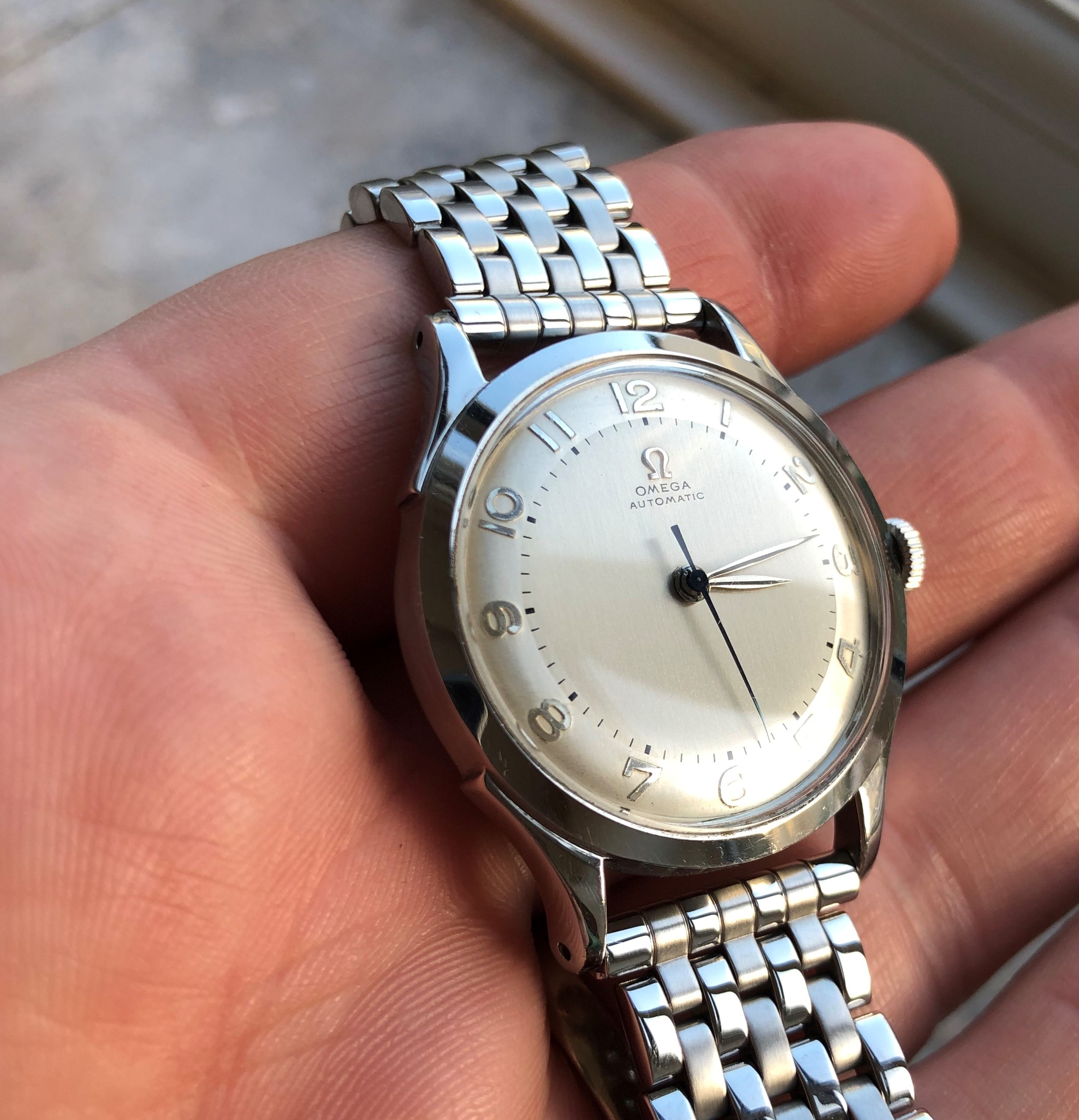 ·For sale is this beautiful Omega Bumper automatic from circa 1949 in fantastic condition. 33mm brushed and polished stainless steel case and In what I believe to be original condition in regards to the dial, hands with blued second hand as well as flat footed crown. It keeps excellent time and winds and sets well. Comes with a lovely black strap, Omega buckle and includes a Forstner beads of rice bracelet with nice presentation box.