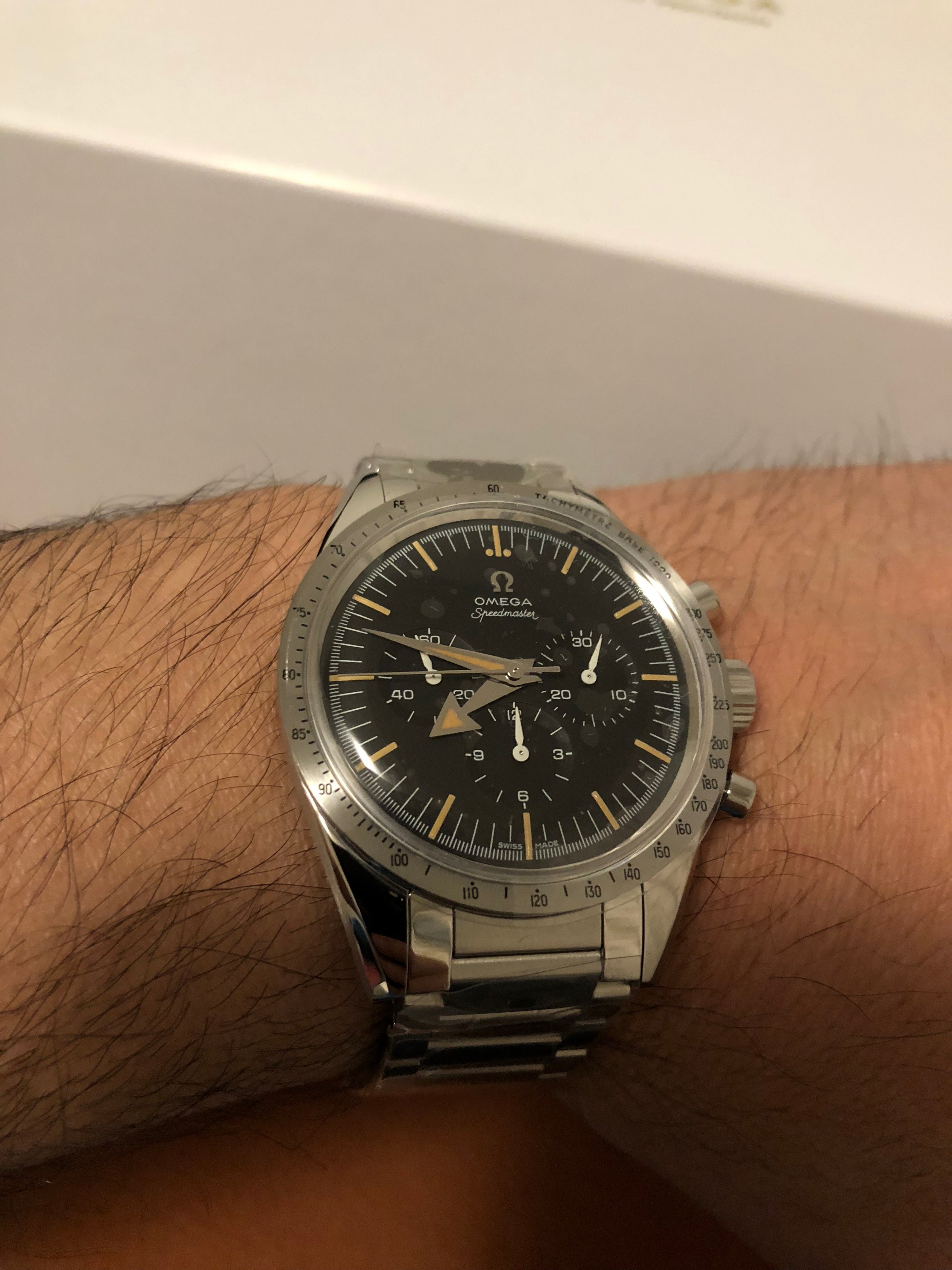 Got my speedmaster on Friday. Not sure yet how I feel about it. Overall its a beautiful watch but I have 2 issues with it. It wears a bit small compared to other speedys and I find it a little too shiny. Maybe I need some time to get used to it. Will have to see 😕