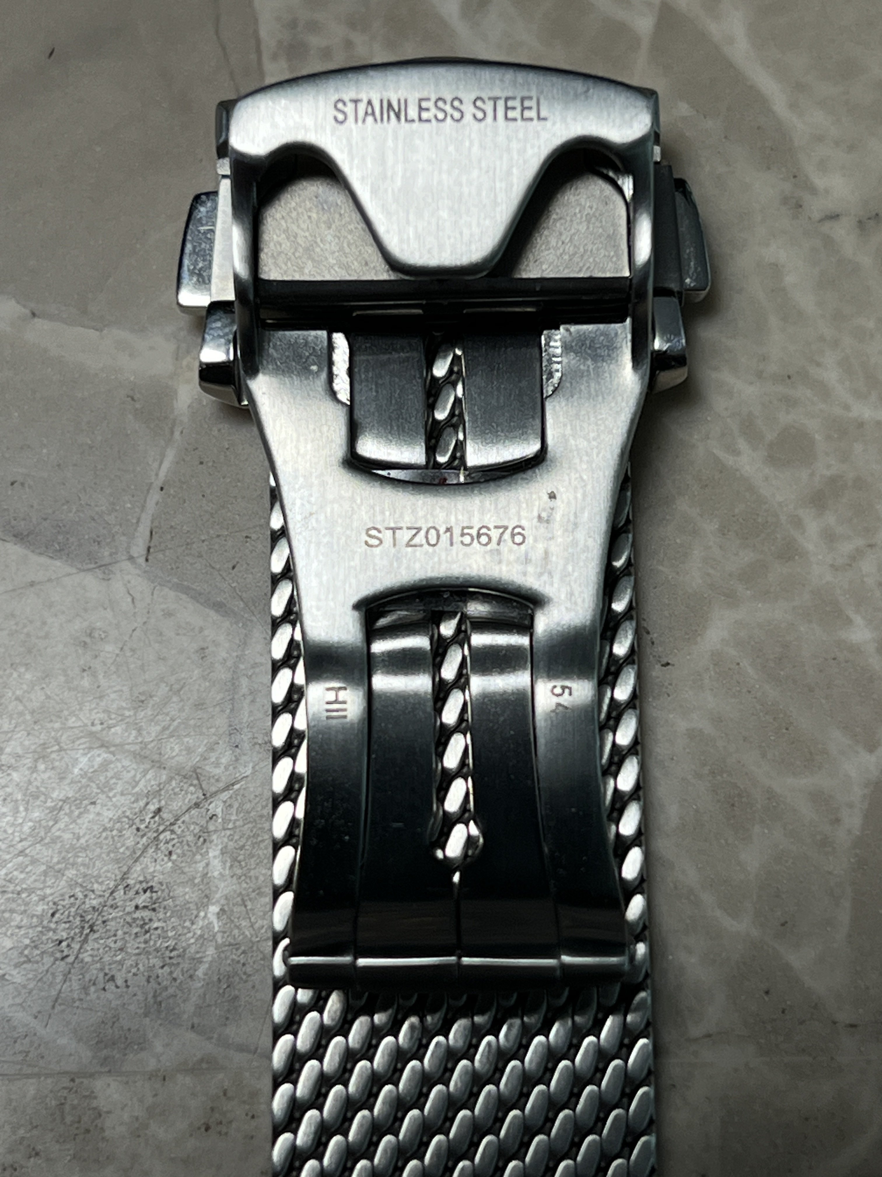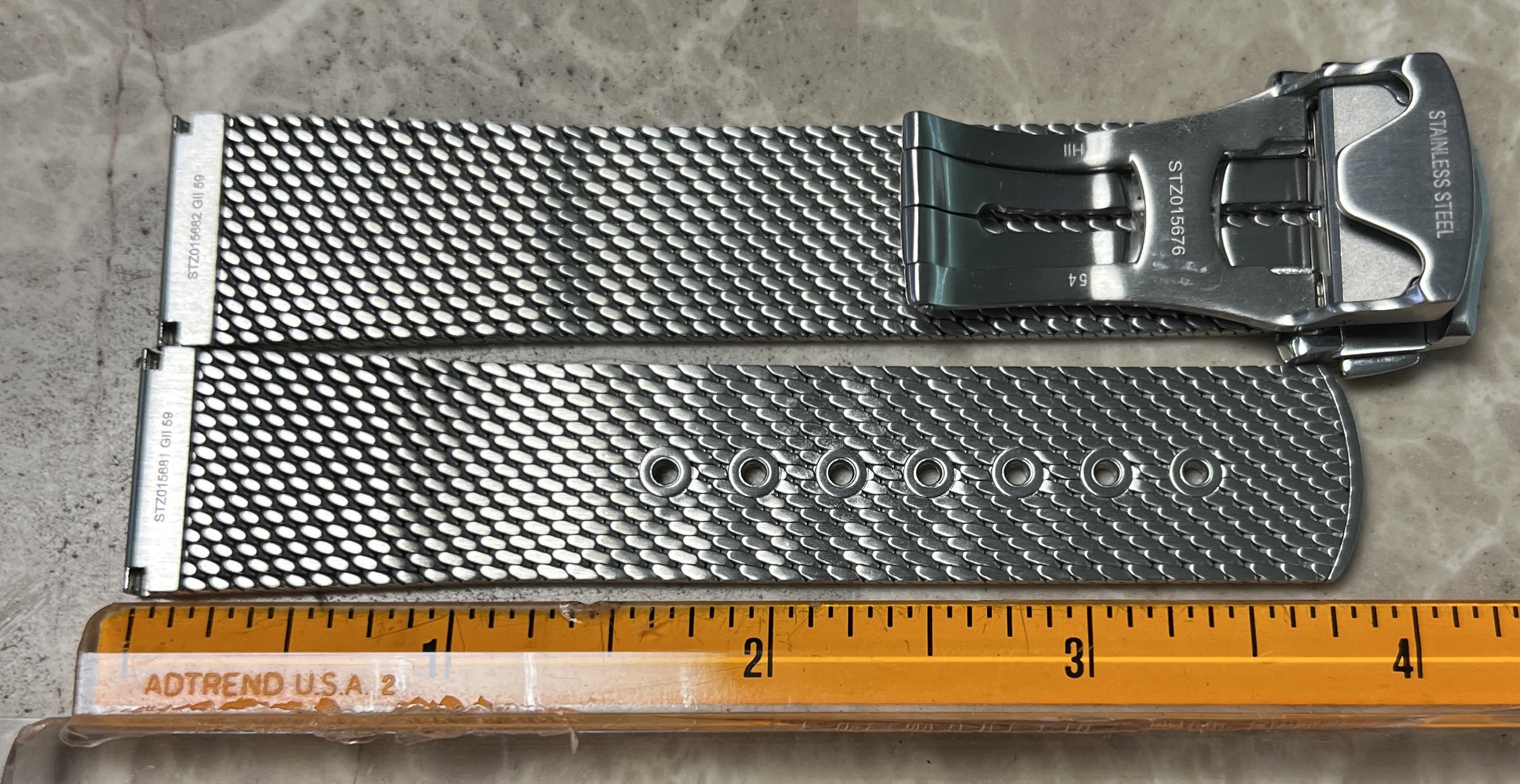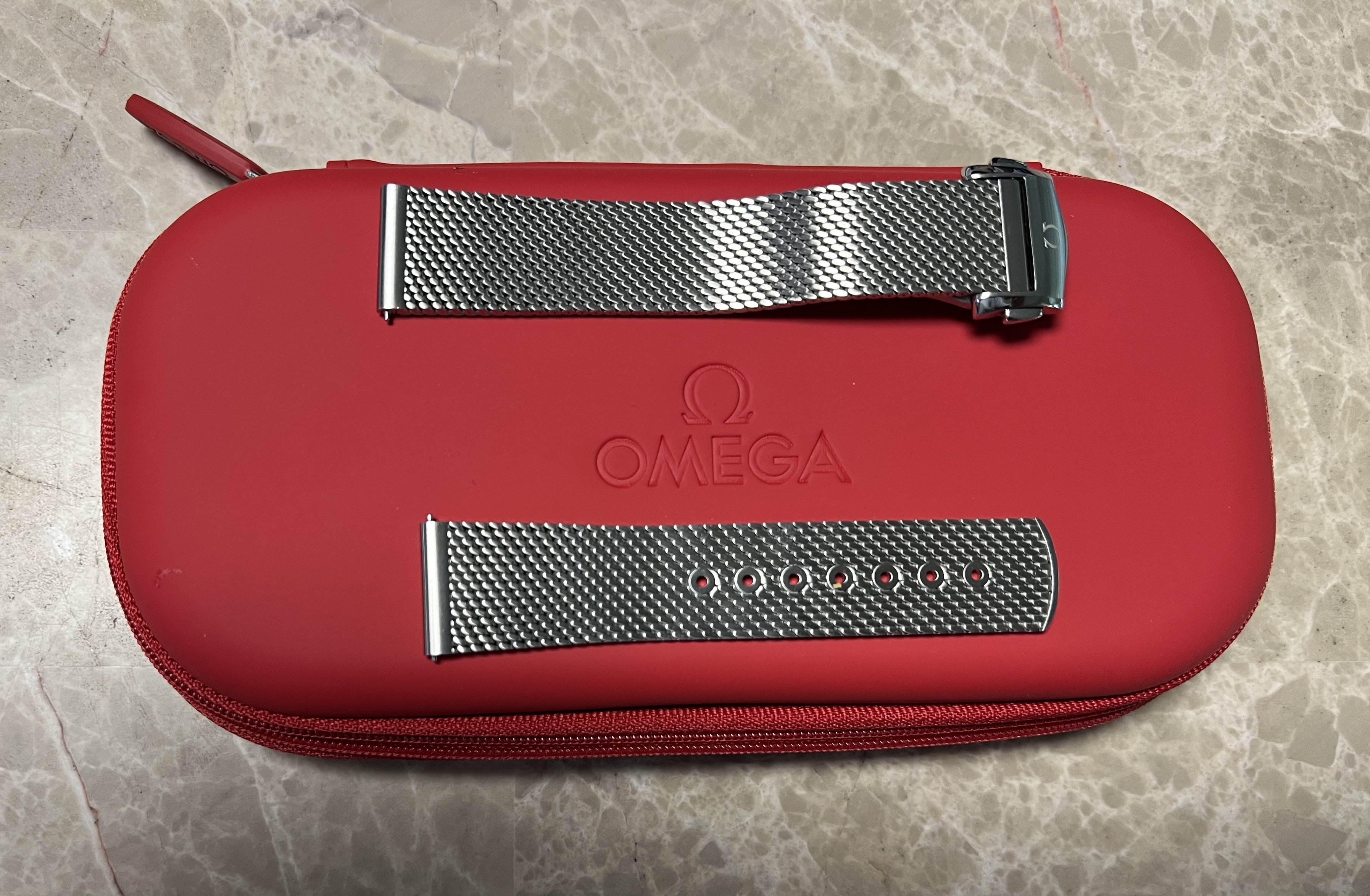 Part numbers on mine are STZ015682 , STZ015681 (6 O'Clock and 12 O'Clock sides, respectively) and STZ015676 for the deployant / clasp. This is the standard size, measuring approximately 3 5/16 inches each side which according to Omega is suitable for 6 3/4 - 7 inches wrist and above . The bracelet is in very good conditions as shown with little wear and comes in unpolished conditions; will come with the shown Red Omega travel case and a pair of springbars.