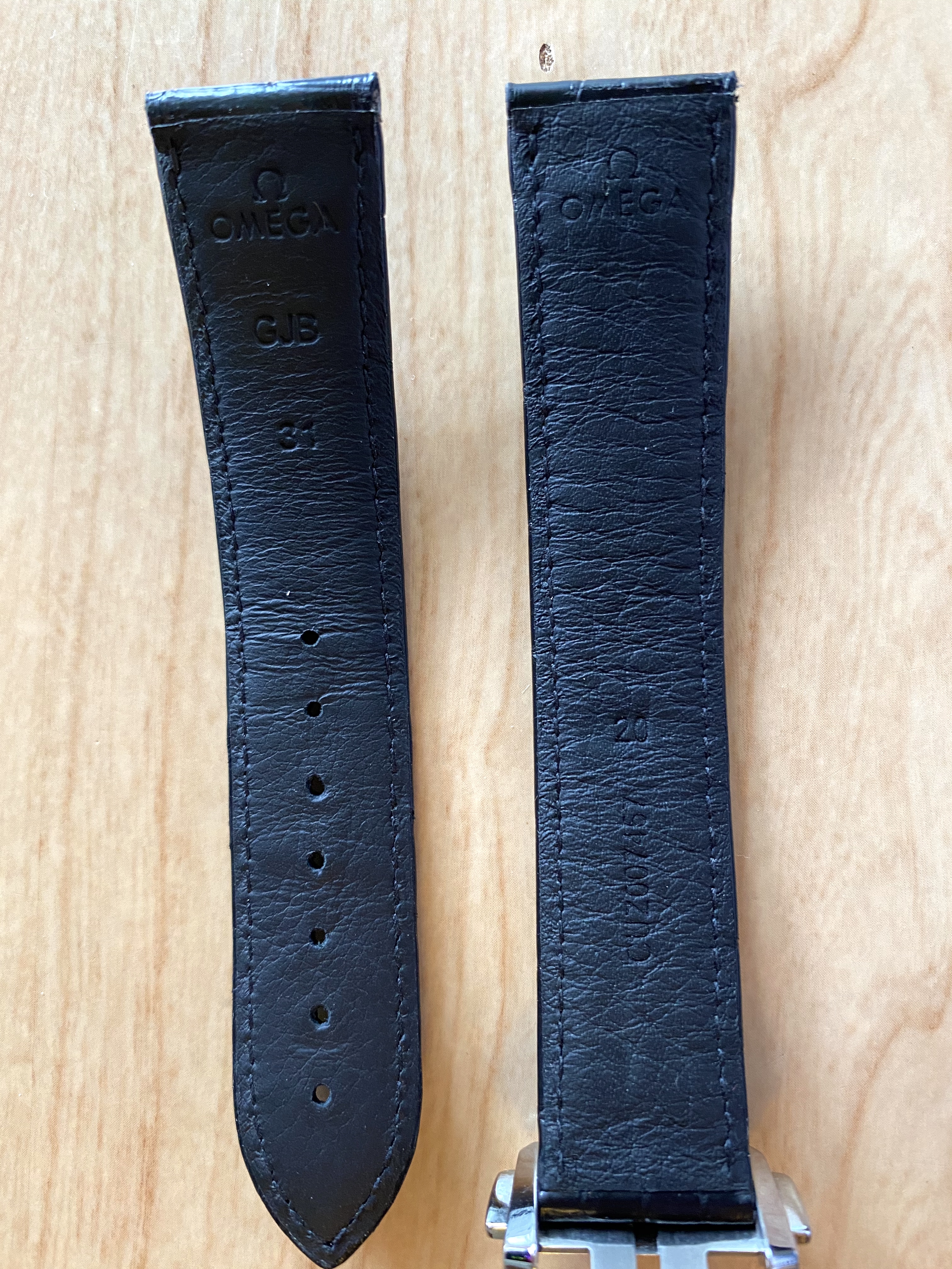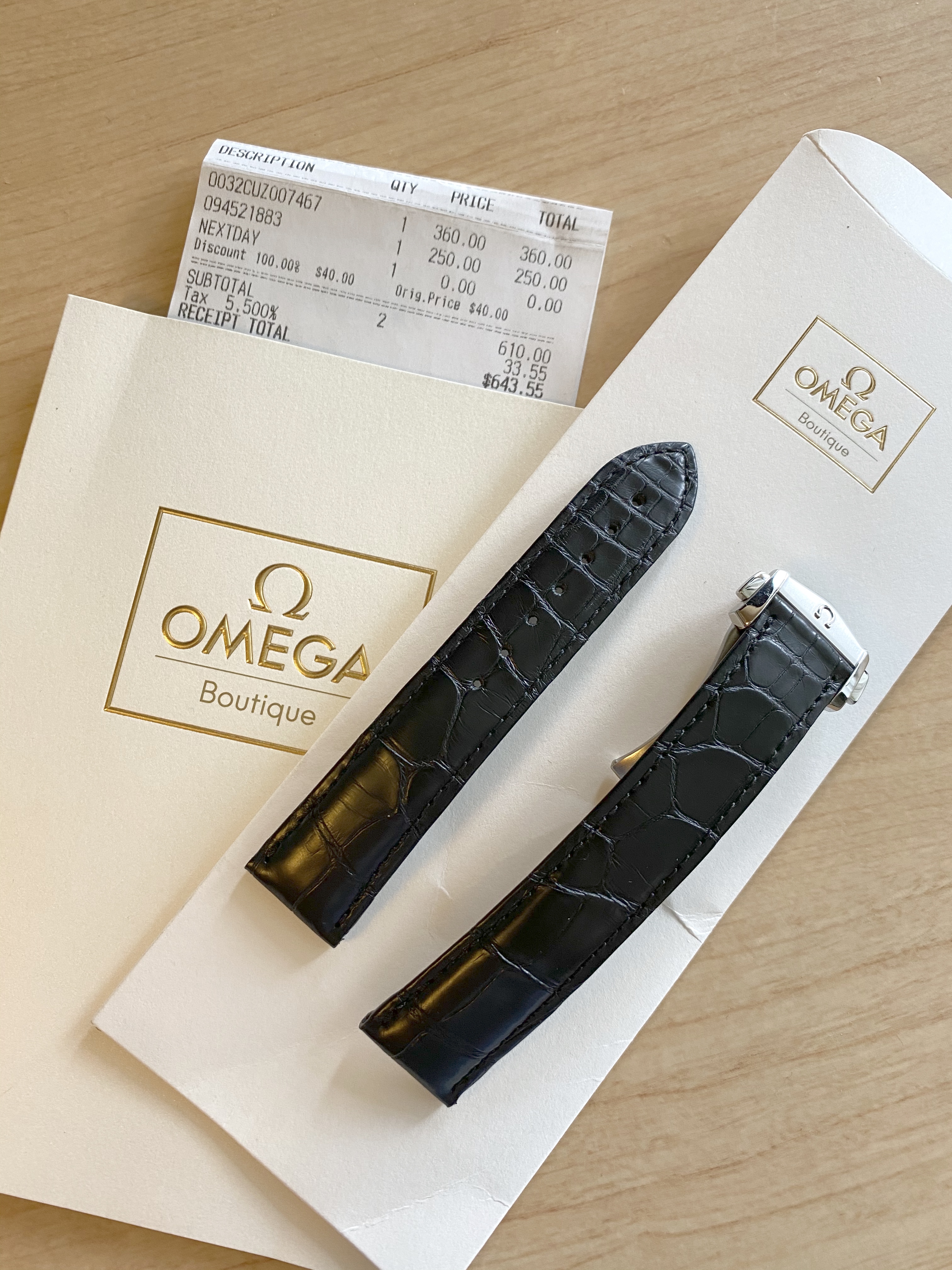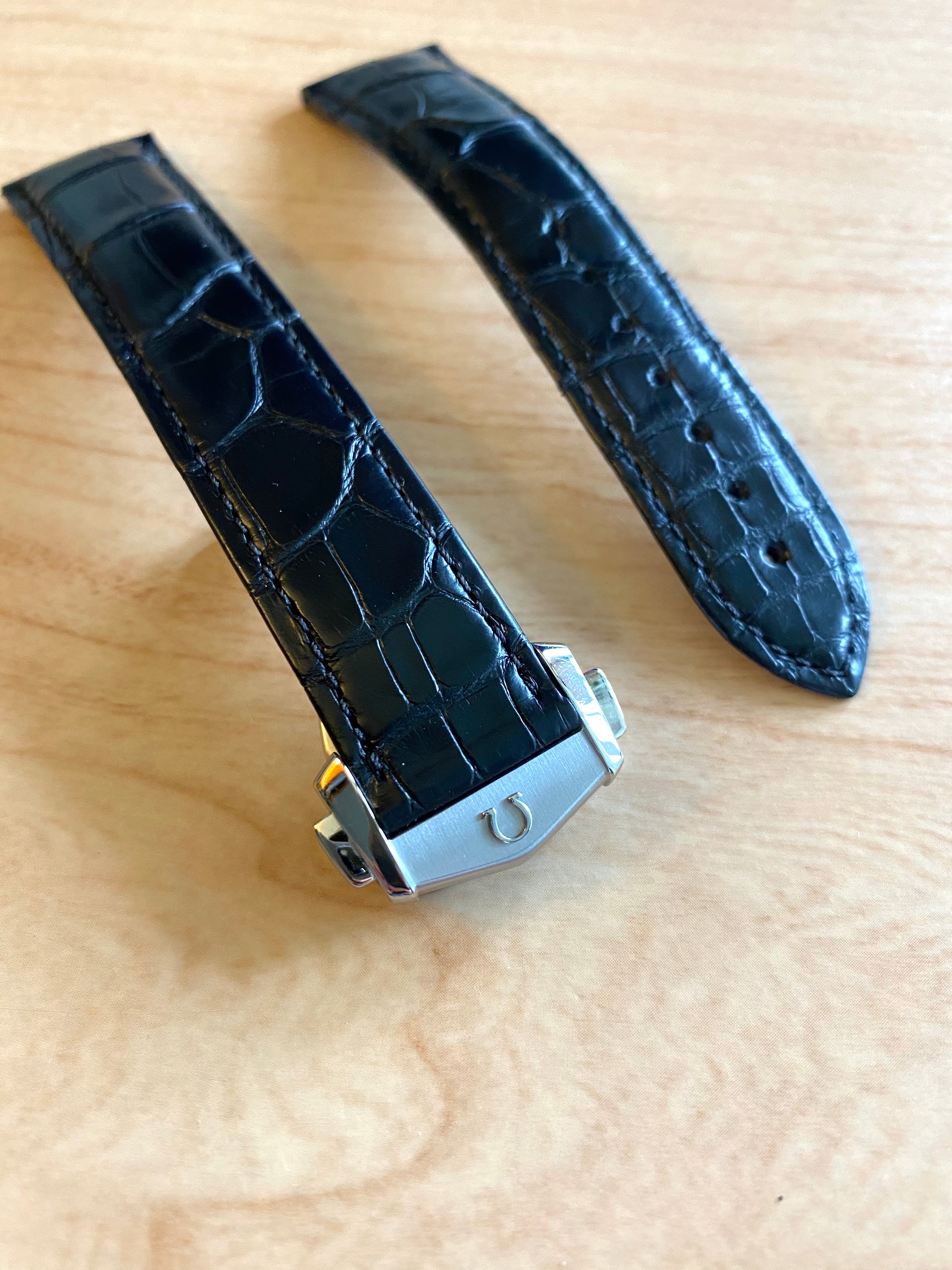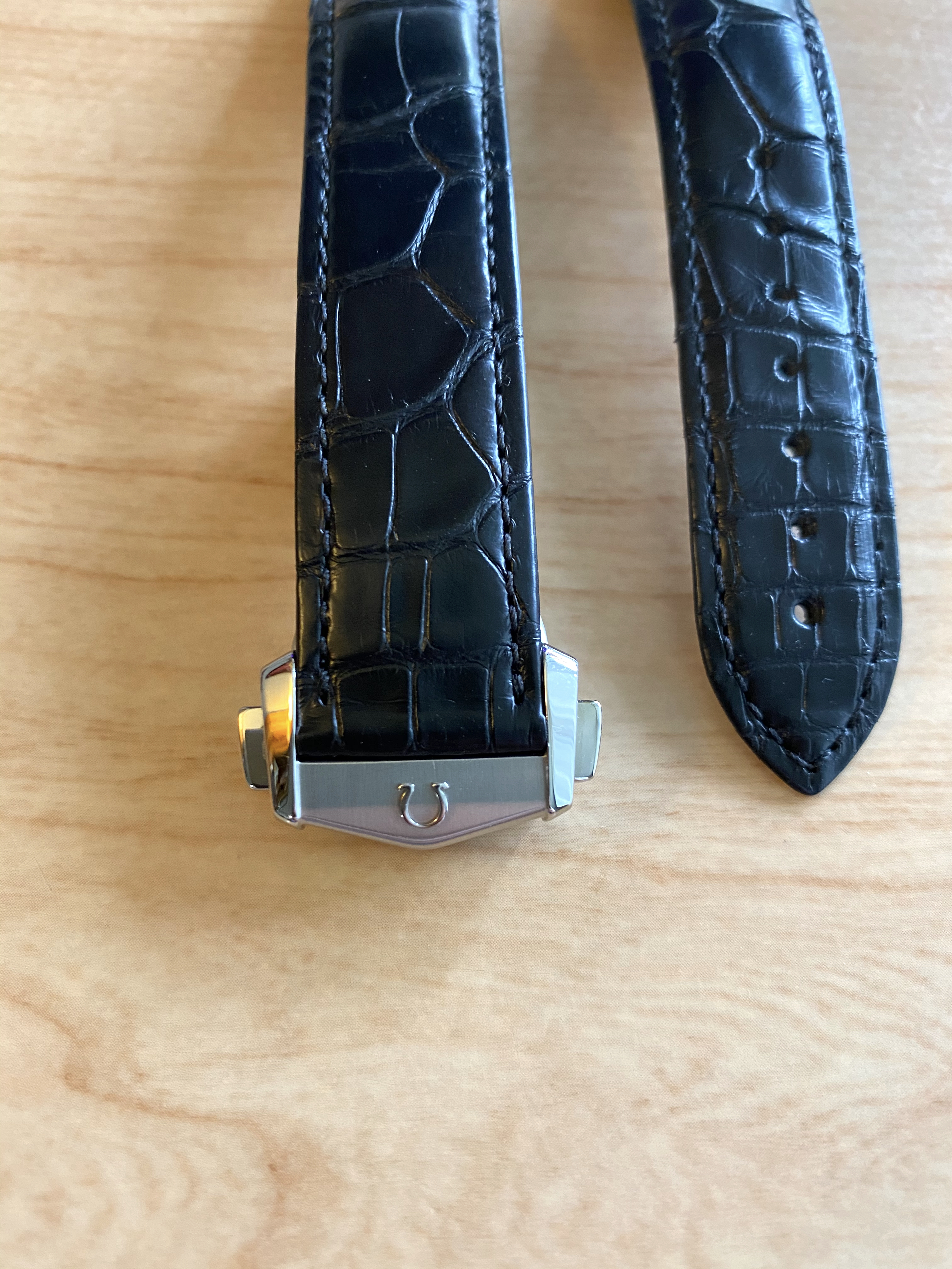 Up for sale is a gently used Omega 20mm black alligator leather strap with 18mm deployant clasp that was purchased from the Chicago Omega Boutique in January 2021. Both the strap and clasp are in excellent condition. Included in this sale is the strap, clasp, and OB paper packaging - unfortunately, no spring bars.