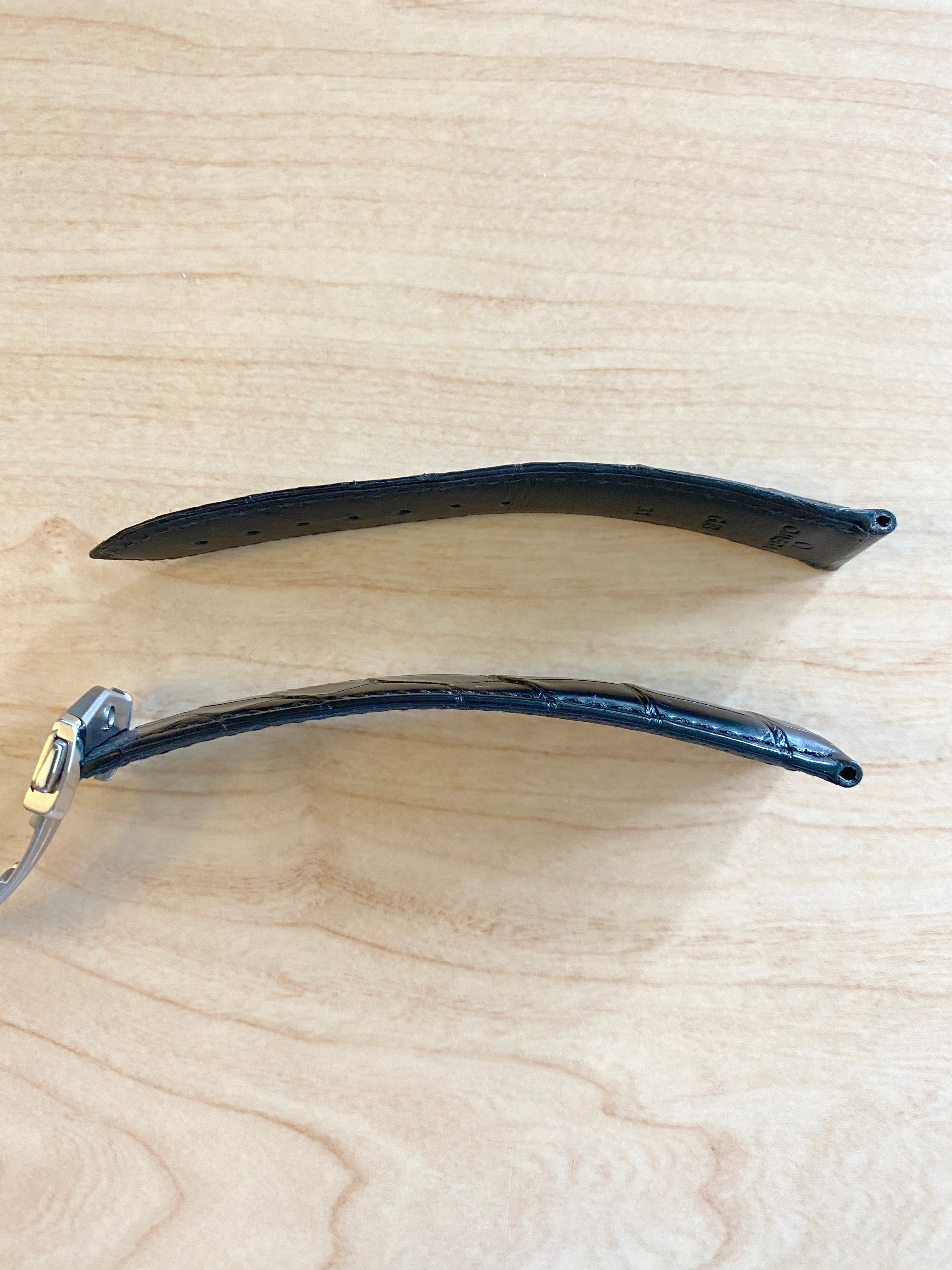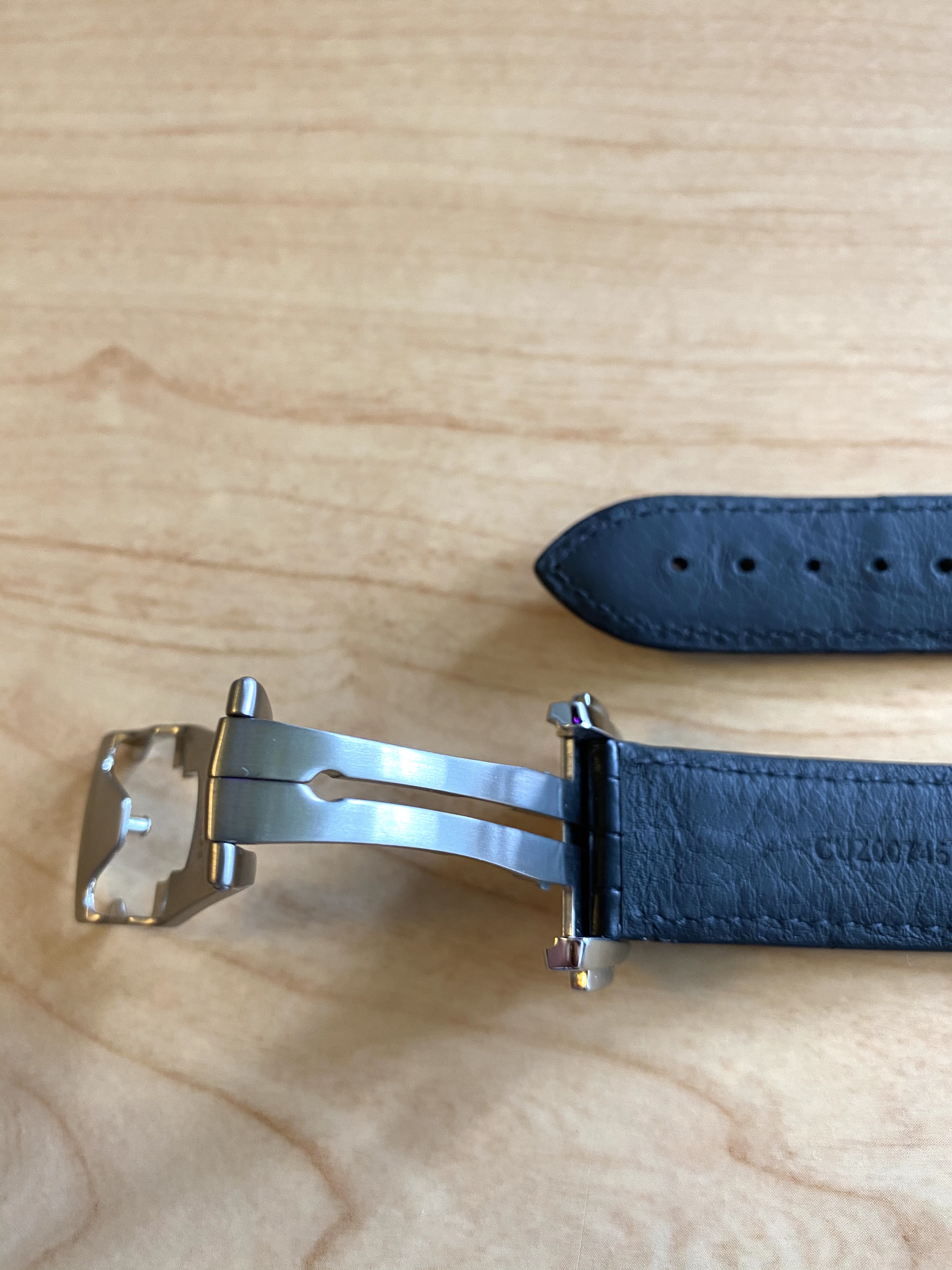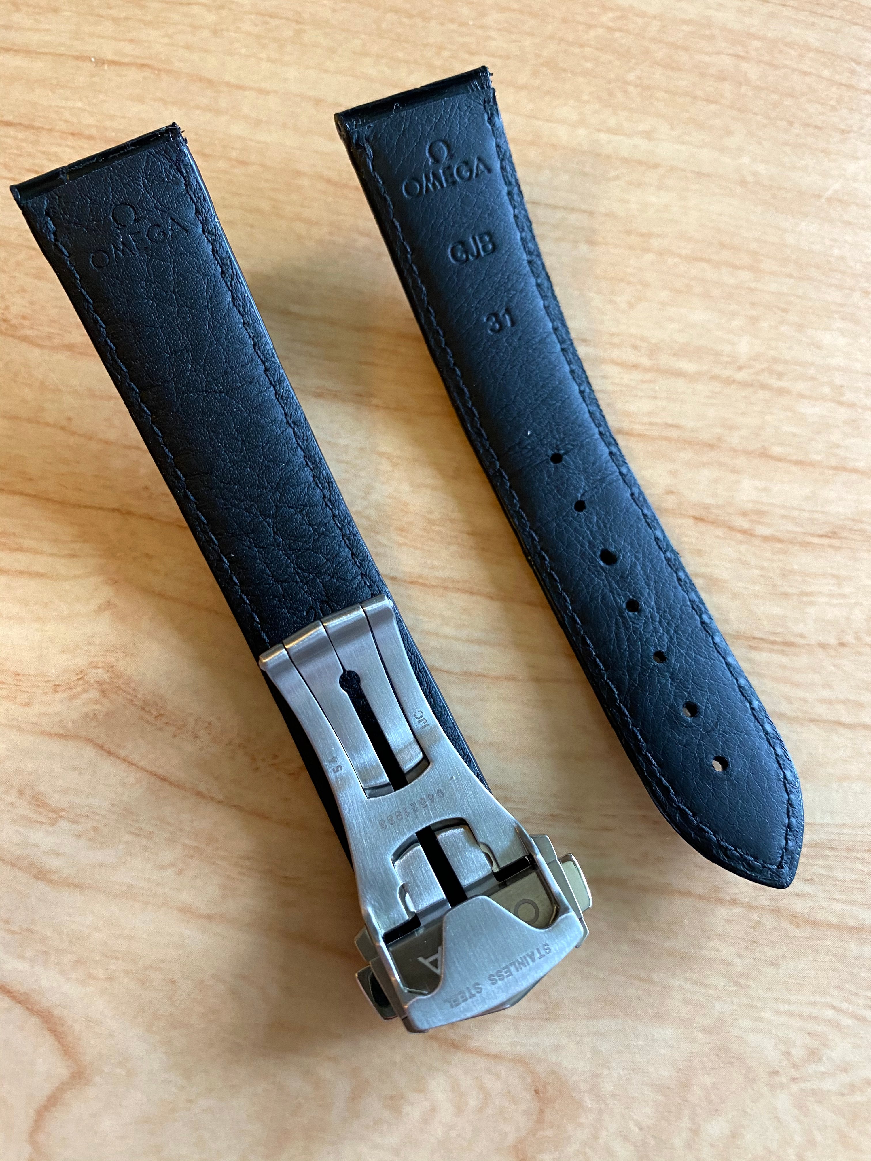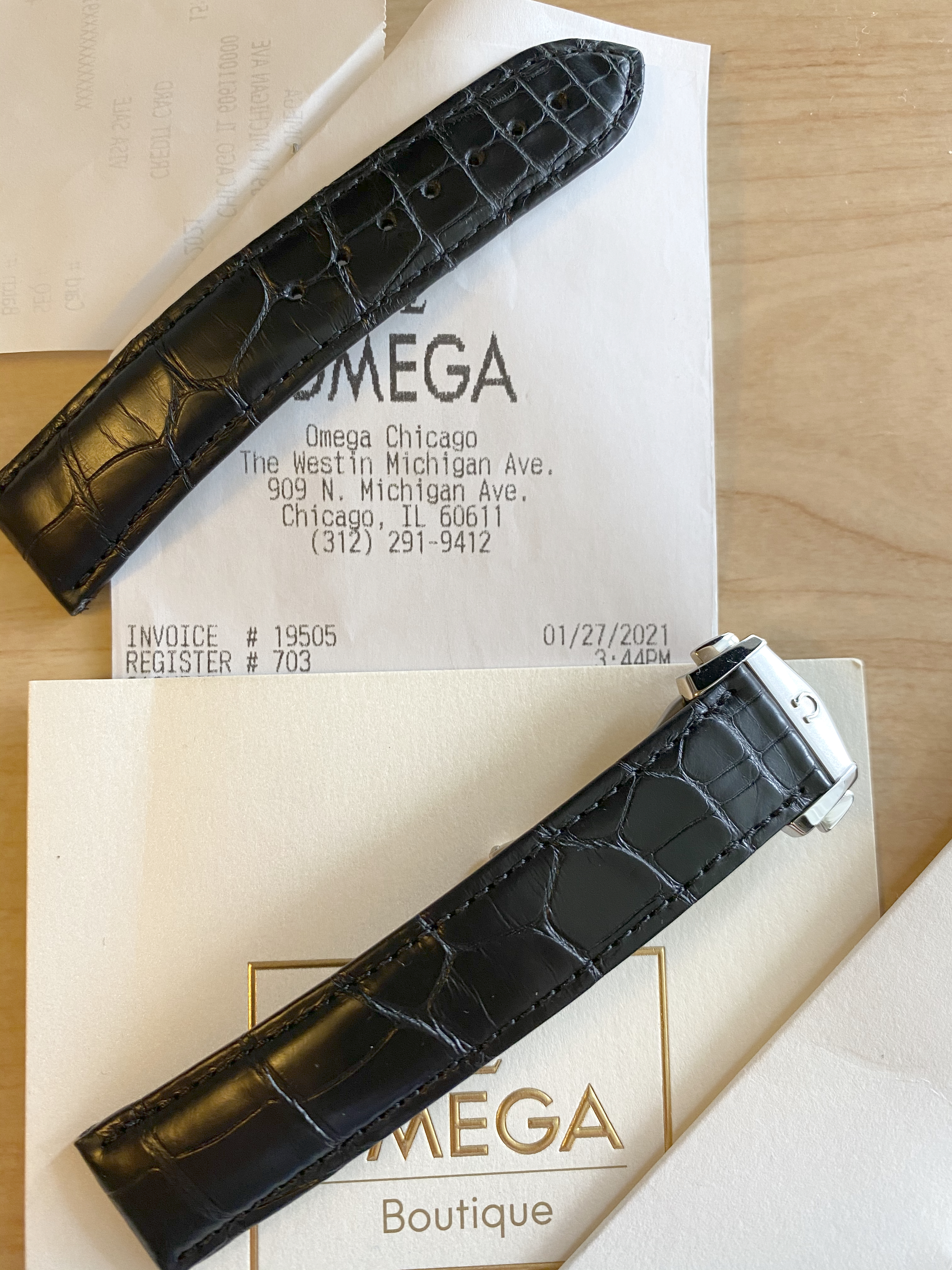 Up for sale is a gently used Omega 20mm black alligator leather strap with 18mm deployant clasp that was purchased from the Chicago Omega Boutique in January 2021. Both the strap and clasp are in excellent condition. Included in this sale is the strap, clasp, and OB paper packaging - unfortunately, no spring bars.