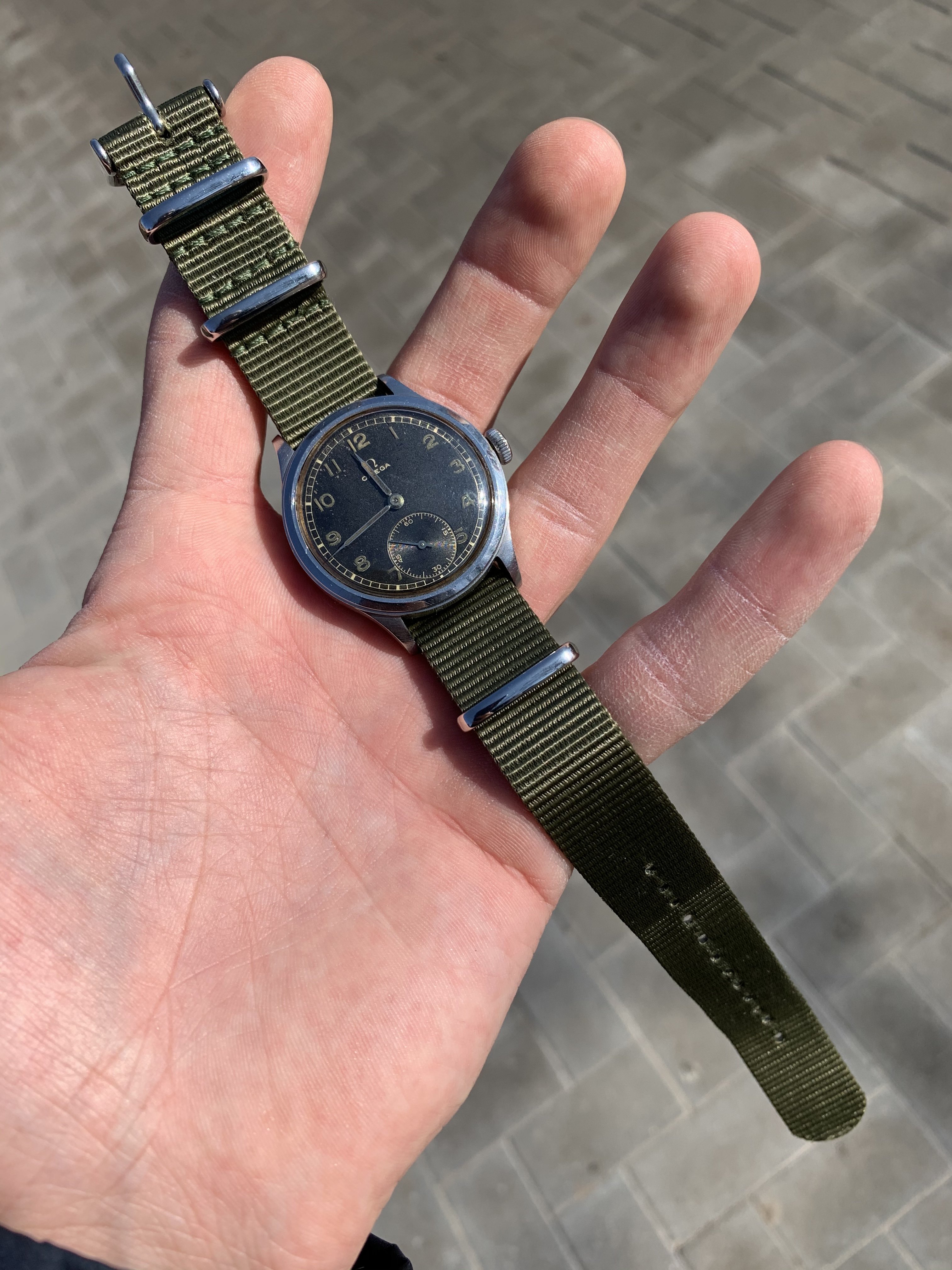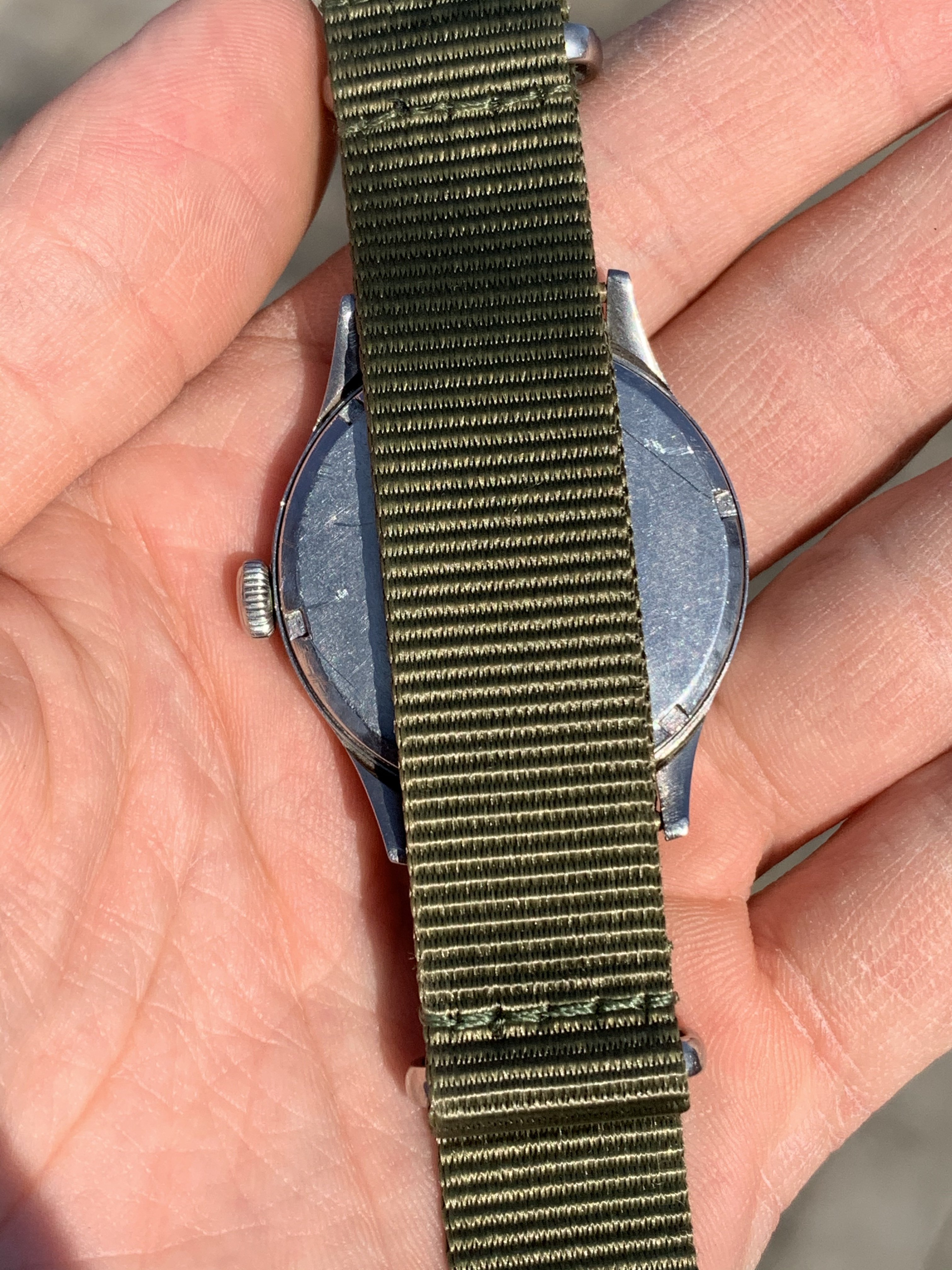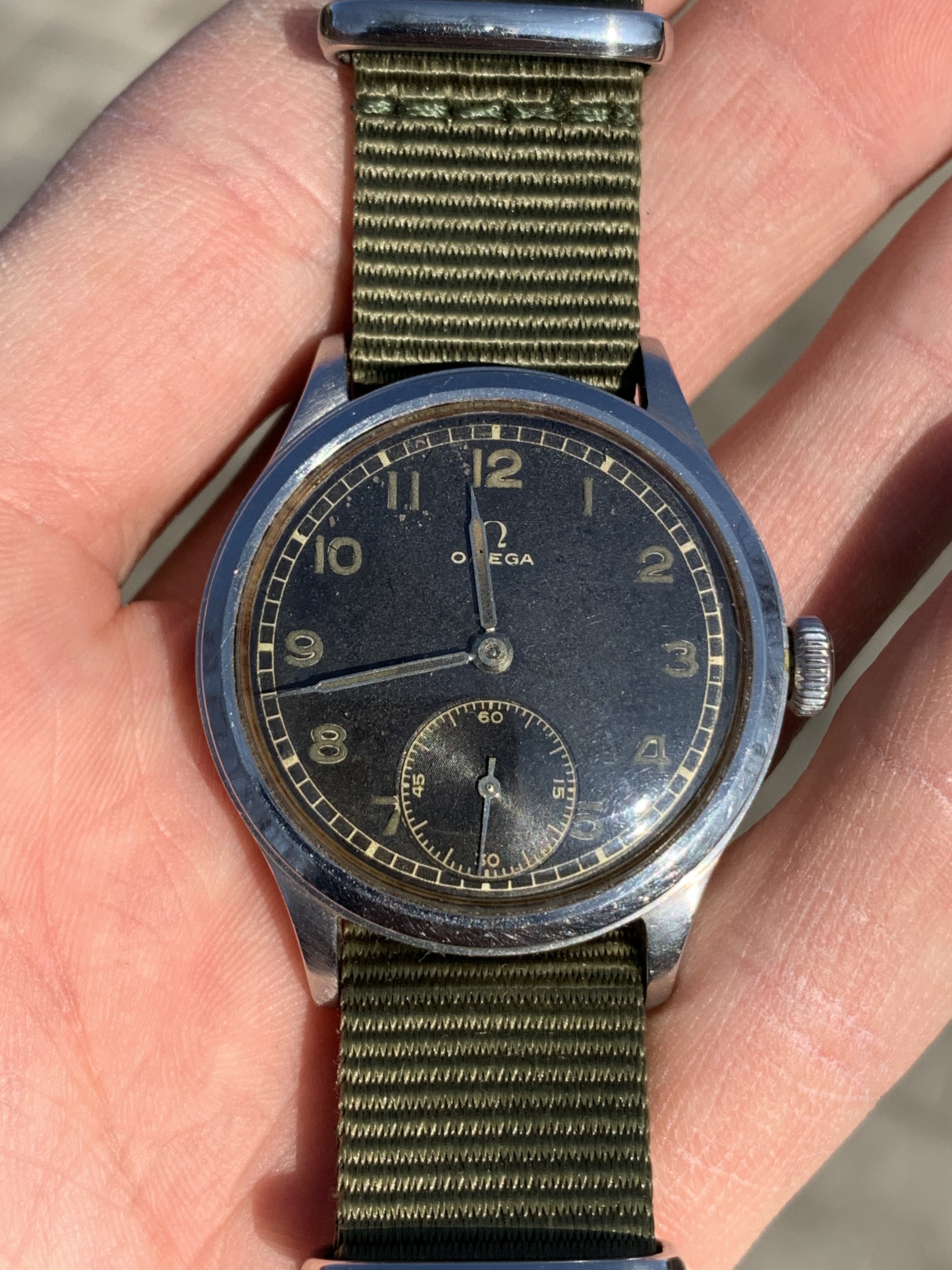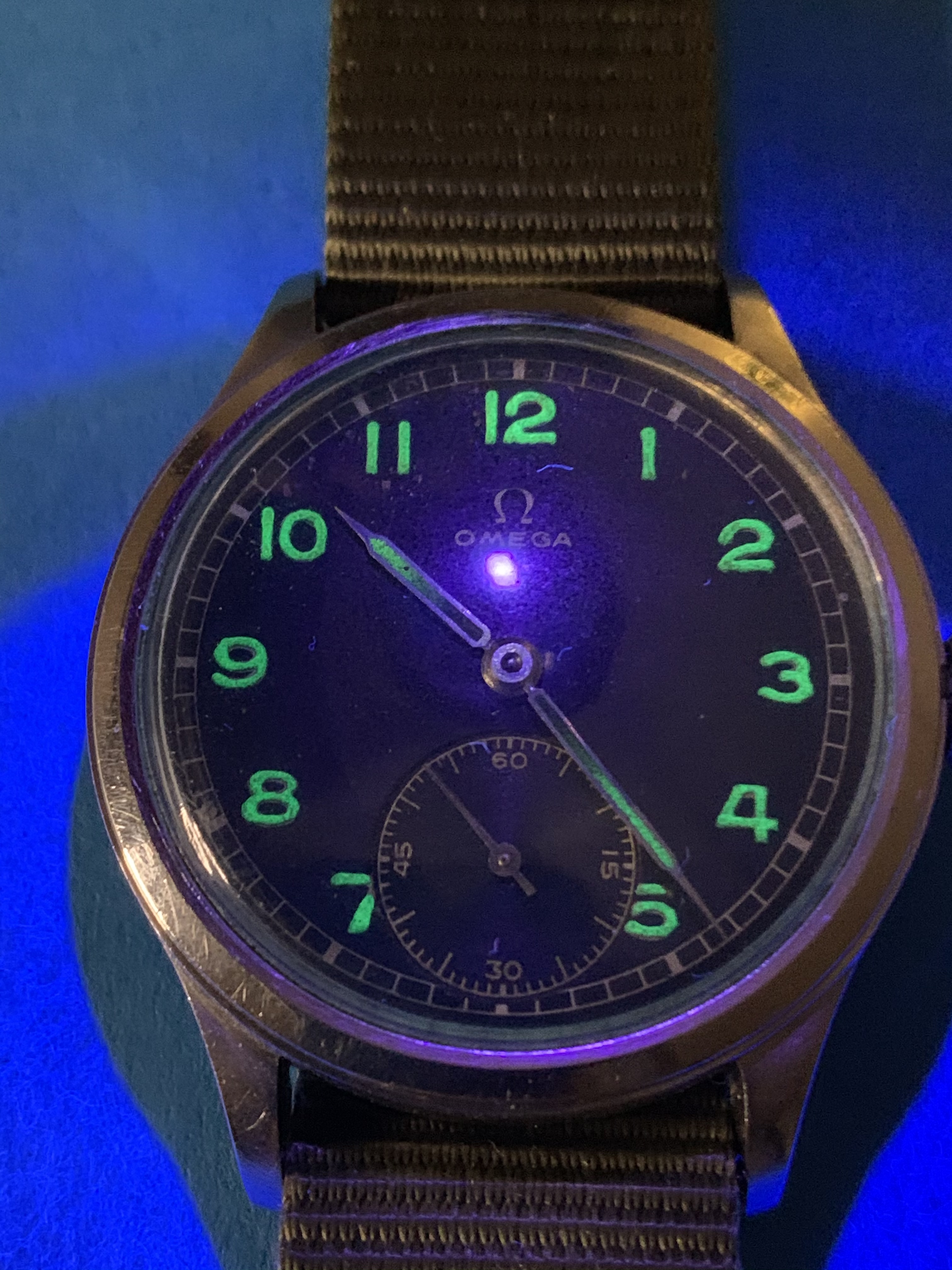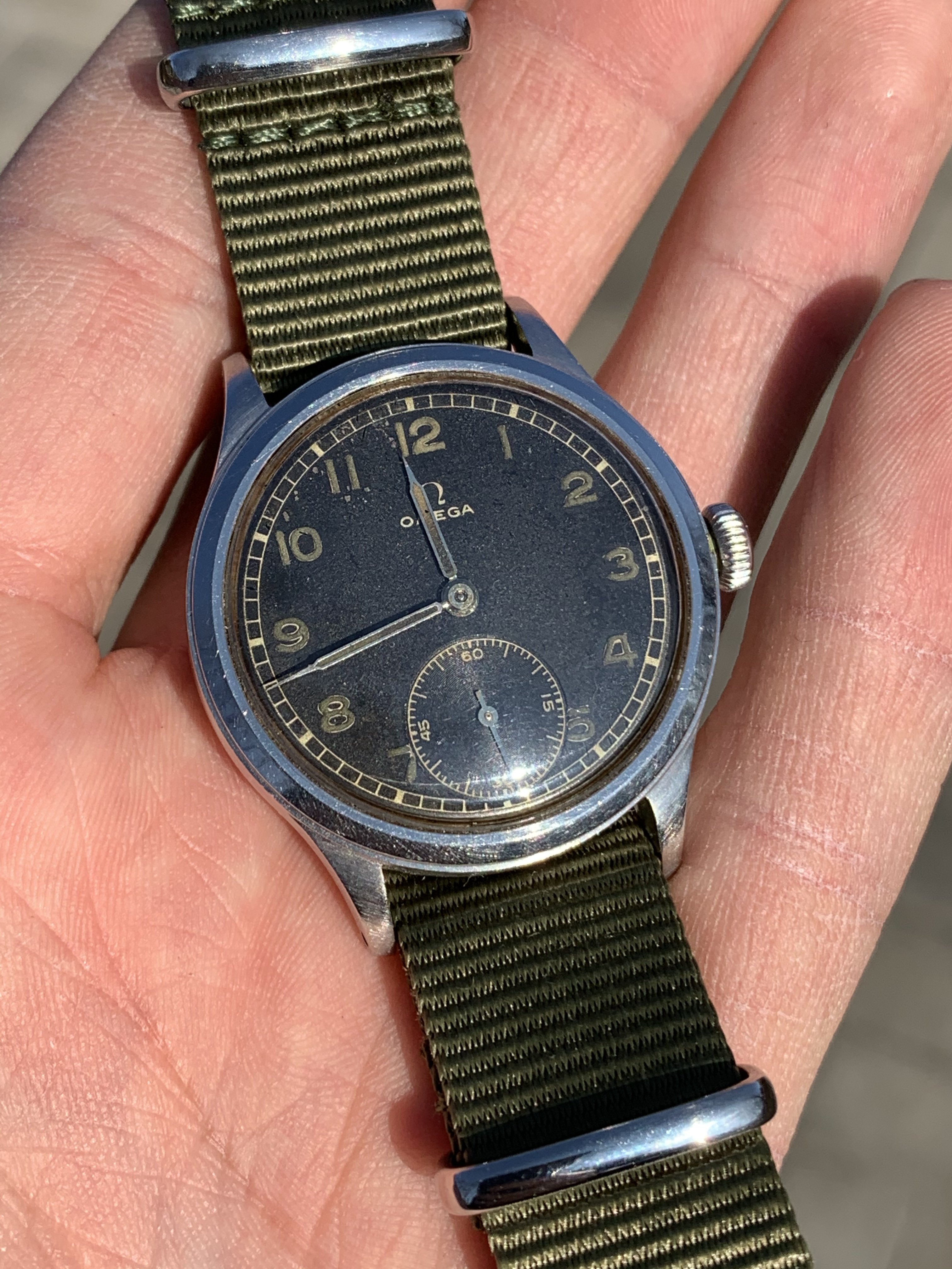The dial is fully authentic, not restored or repainted. Black matte dial has radium filled arabic numerals changed their color through ages - under UV light lume color matches with faded lume on syringe hands, please see pics in album.