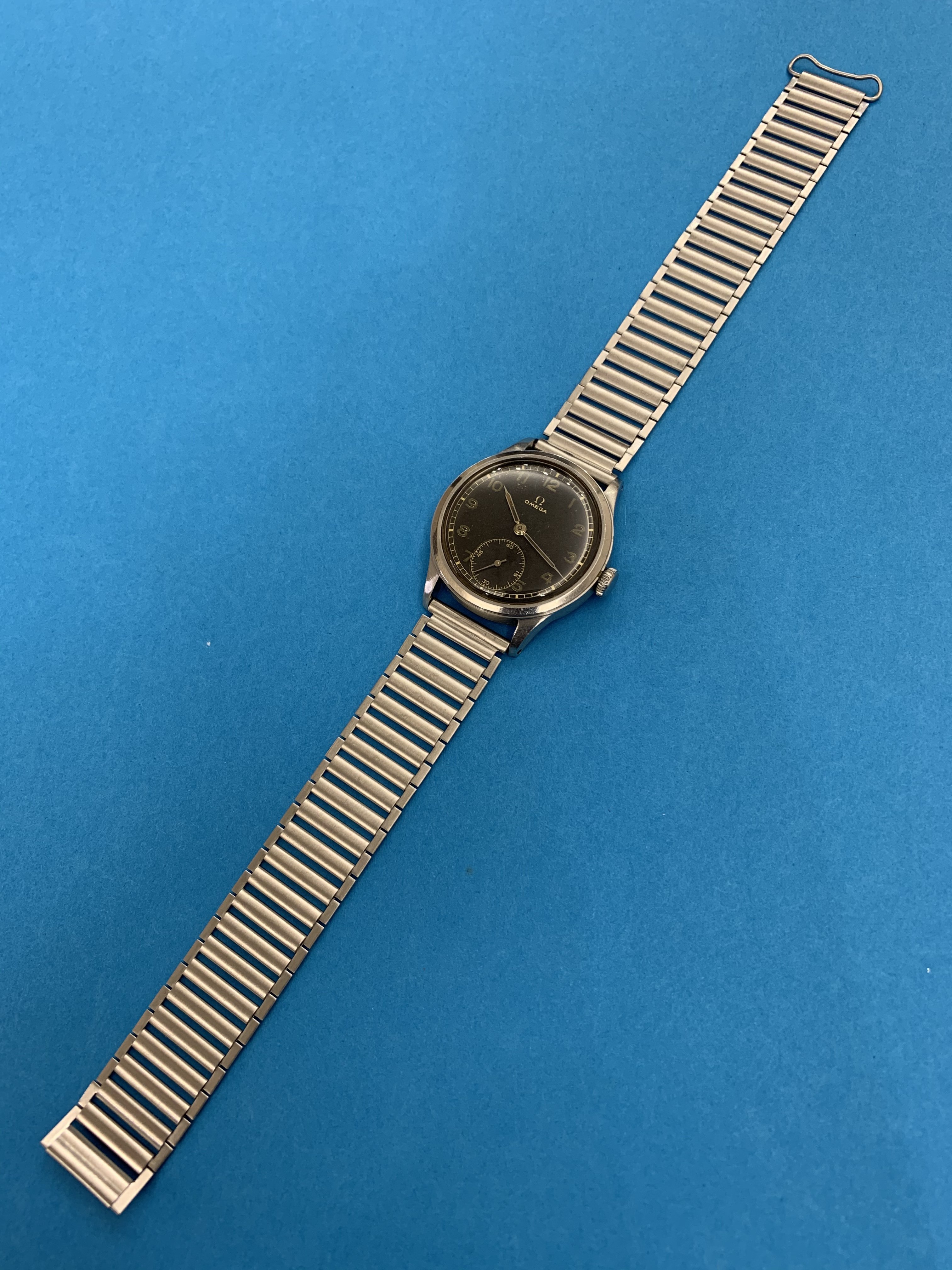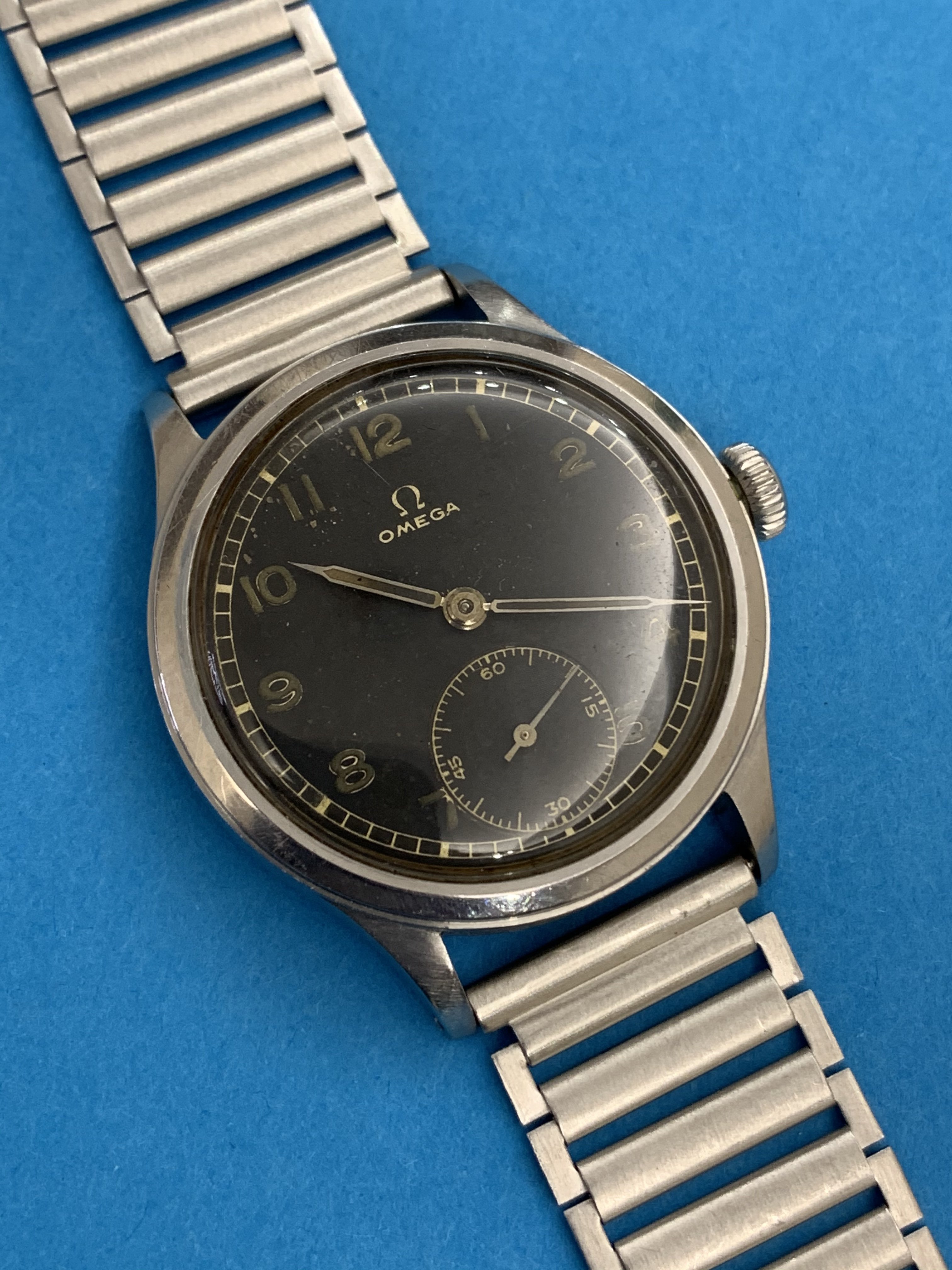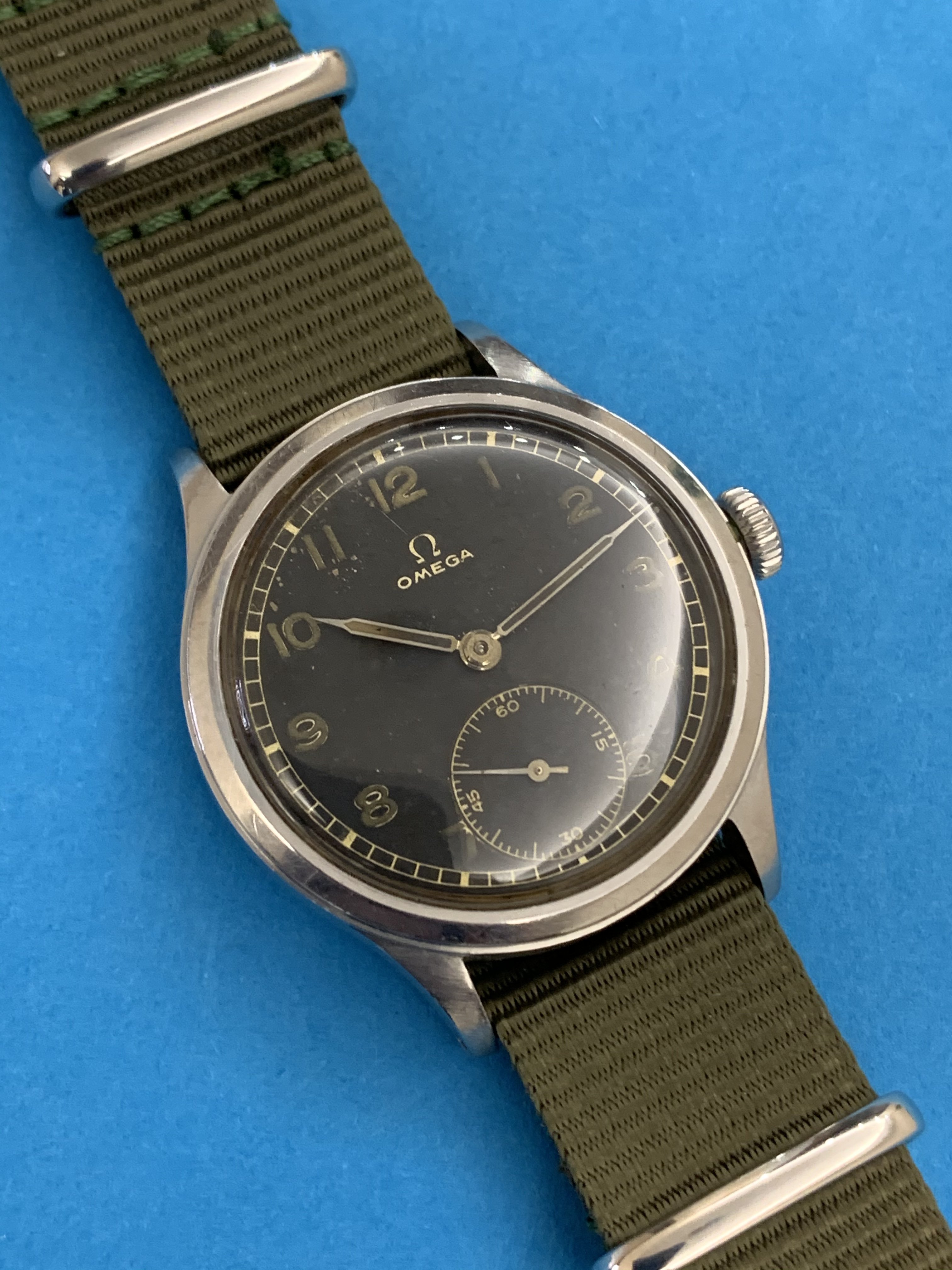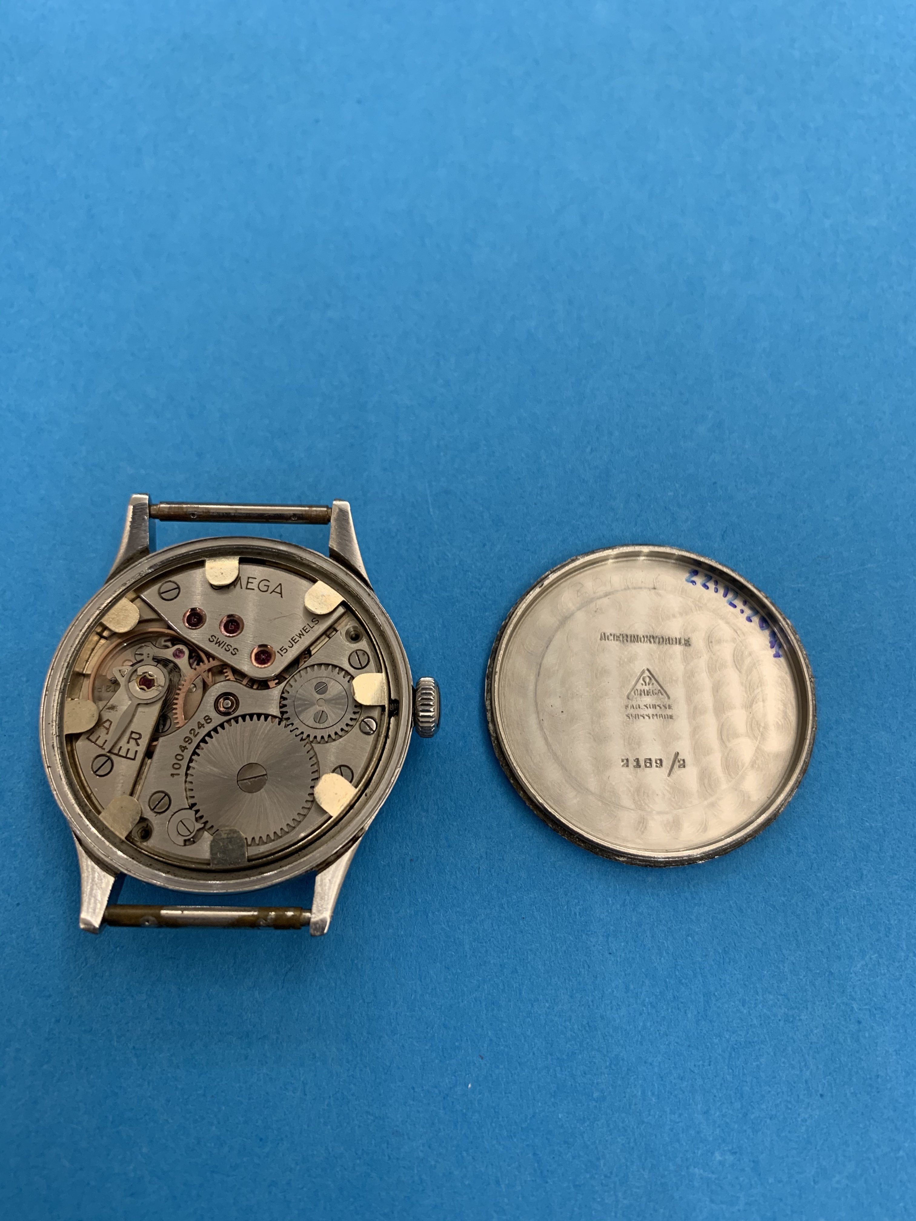 Here is for sale Omega 2169 2 cal. 30T2 from 1944 according to serial number 10049248. The watch is made of stainless steel. Black dial looks like military one, but as to my knowledge - this model is issued for civilians. For sale is the watch with 2 straps.