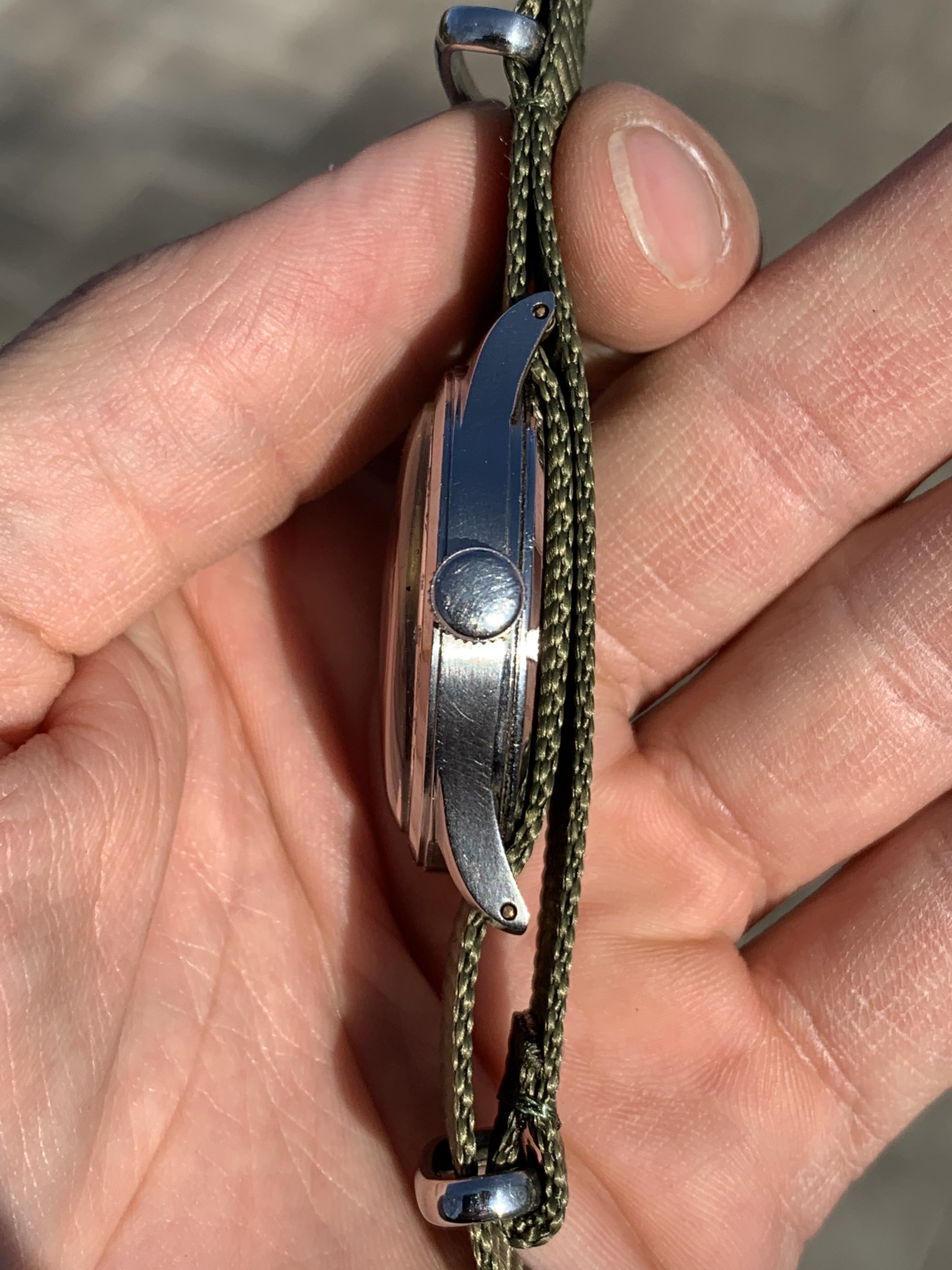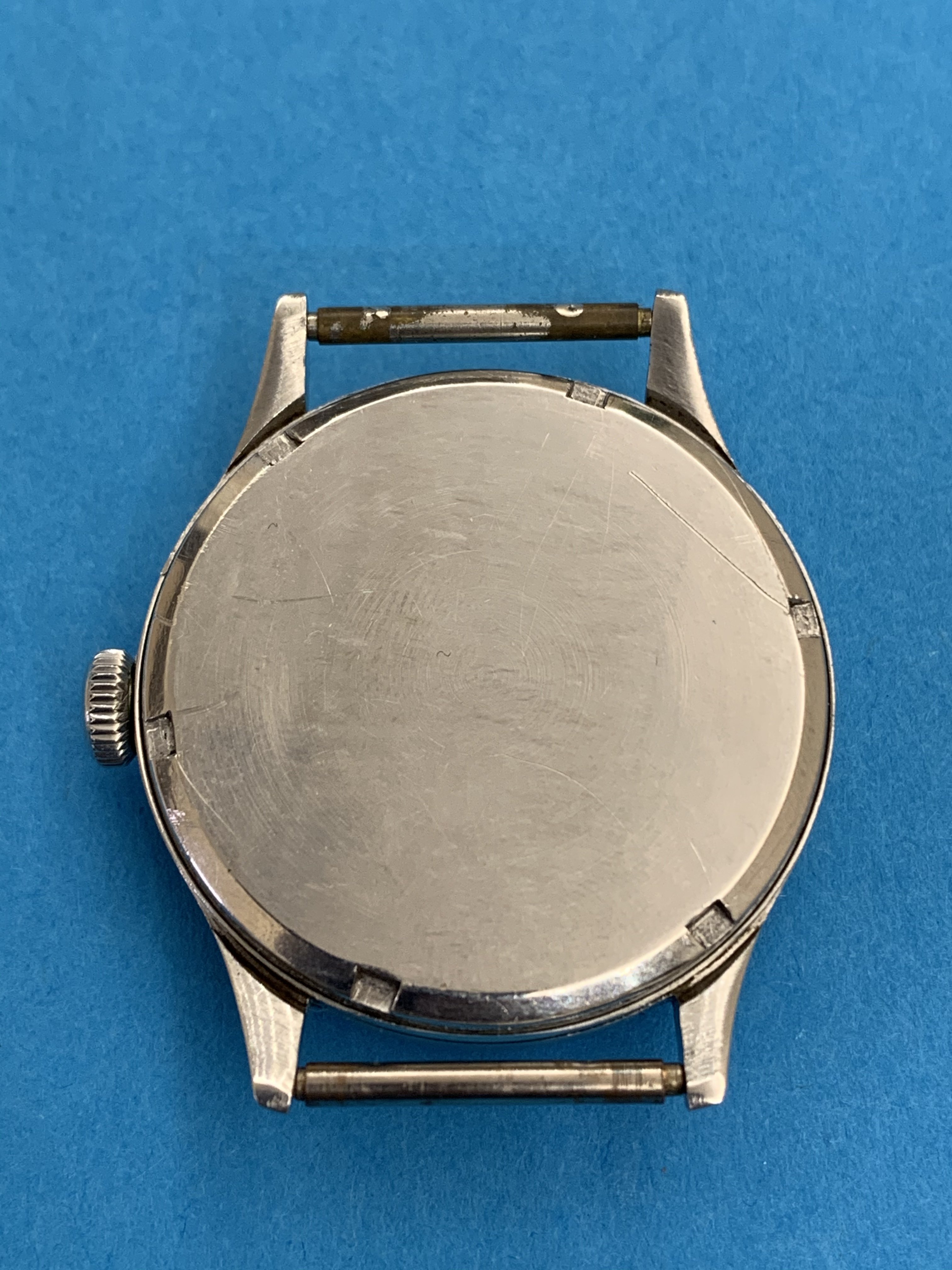 The case is made of stainless steel, has size 35mm without the crown. The case is unpolished - still has original sharp brushed edges, no deep scratches or dings.
