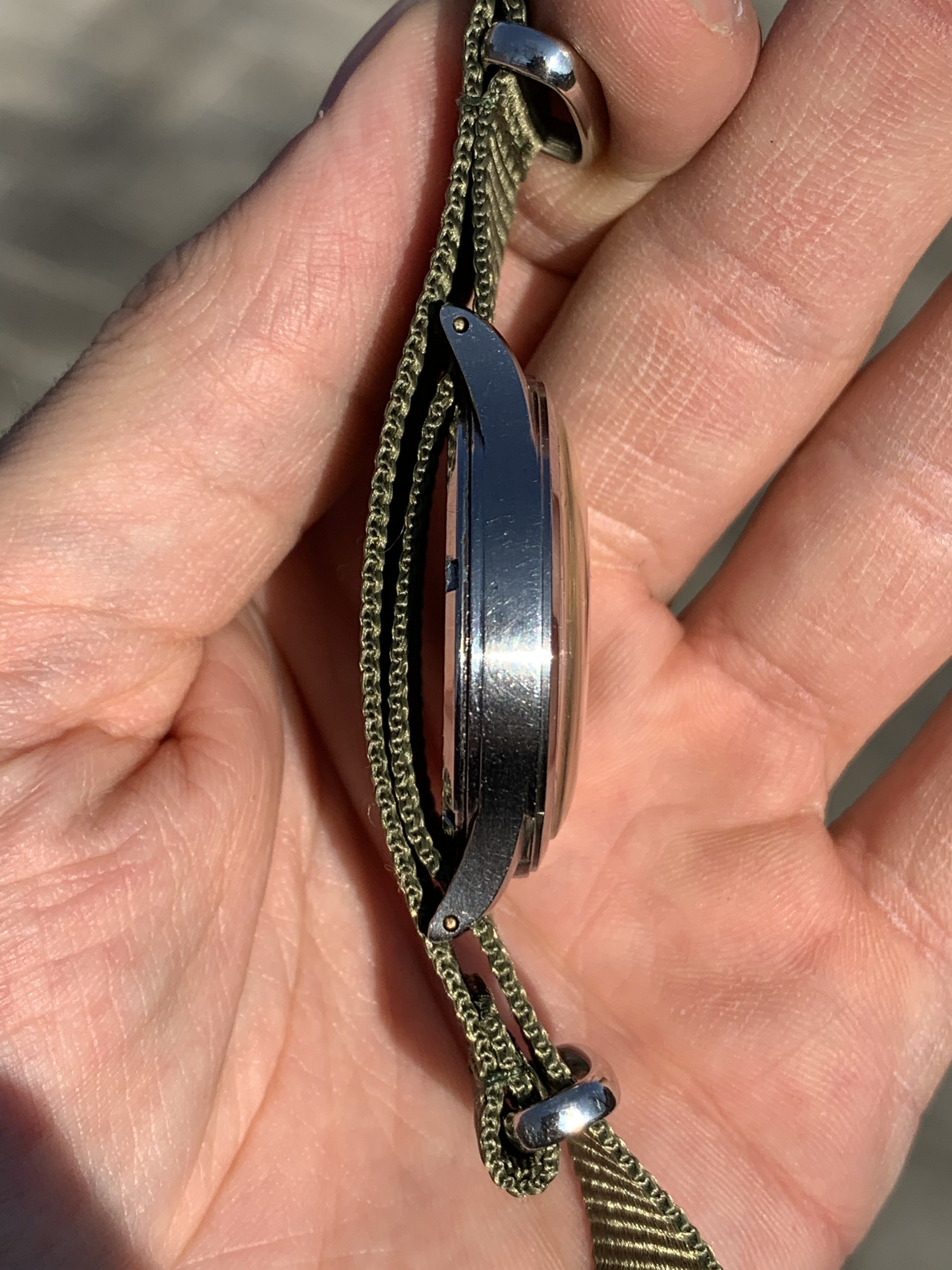 Two straps: first one green NATO 18mm strap, second one is bonklip style old fashioned steel bracelet, unworn.