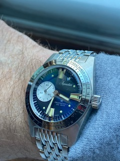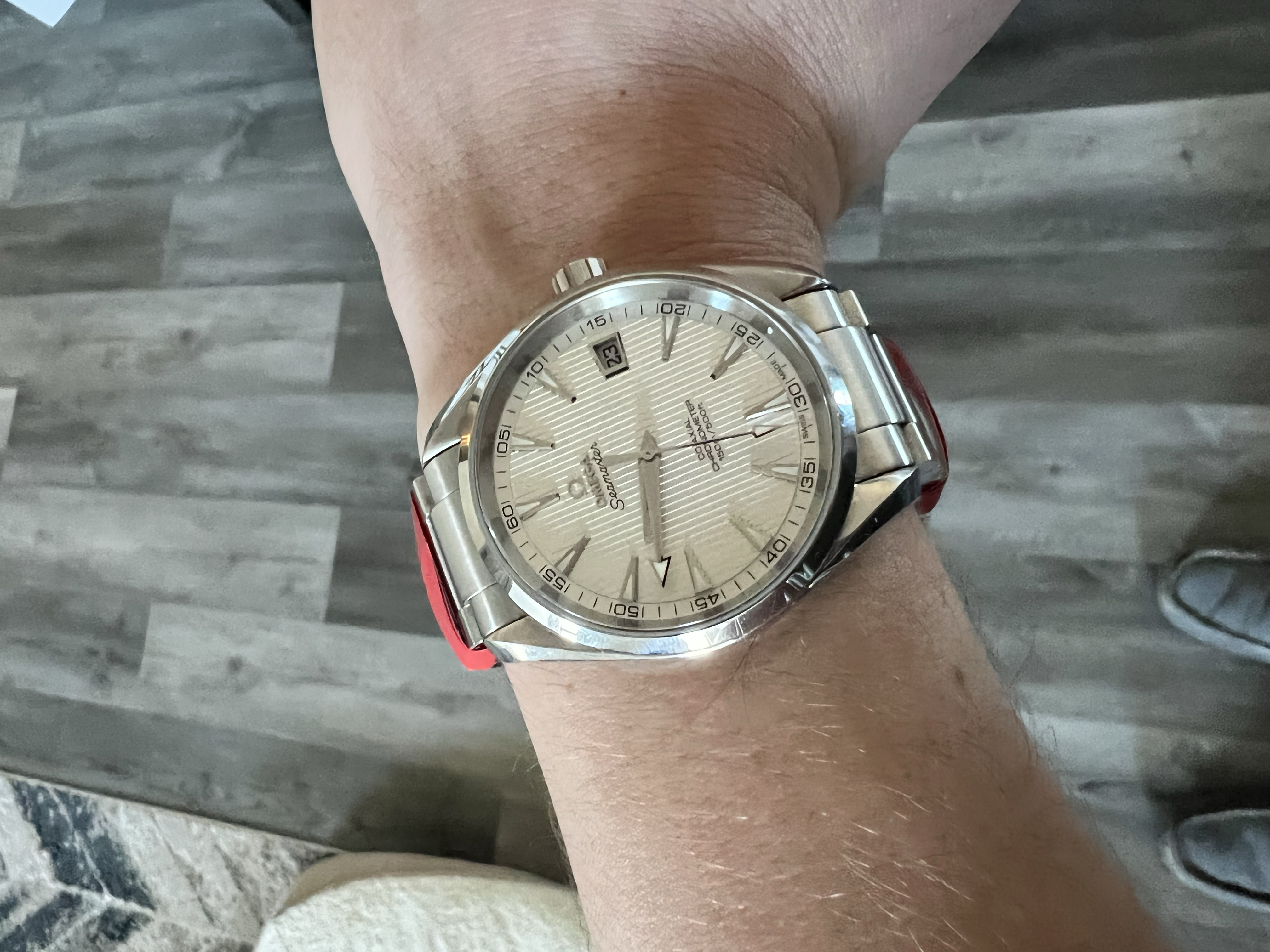 ·I just purchased this pre-owned Seamaster Aqua Terra automatic with the white dial, and I love it. It shines so nicely in the light, and the applied "Omega" name and logo look amazing. Pictures really don't do it justice. I wanted to post a couple of pictures showing the size of the 41.5mm watch on my 7in wrist to show how it looks. I'm torn between keeping it as a larger everyday watch or returning it and getting the 38.5mm version. It definitely fills up my wrist area, but I love the way it looks. Let me know what you think (forgive the red tag; I can't return the watch if removed).