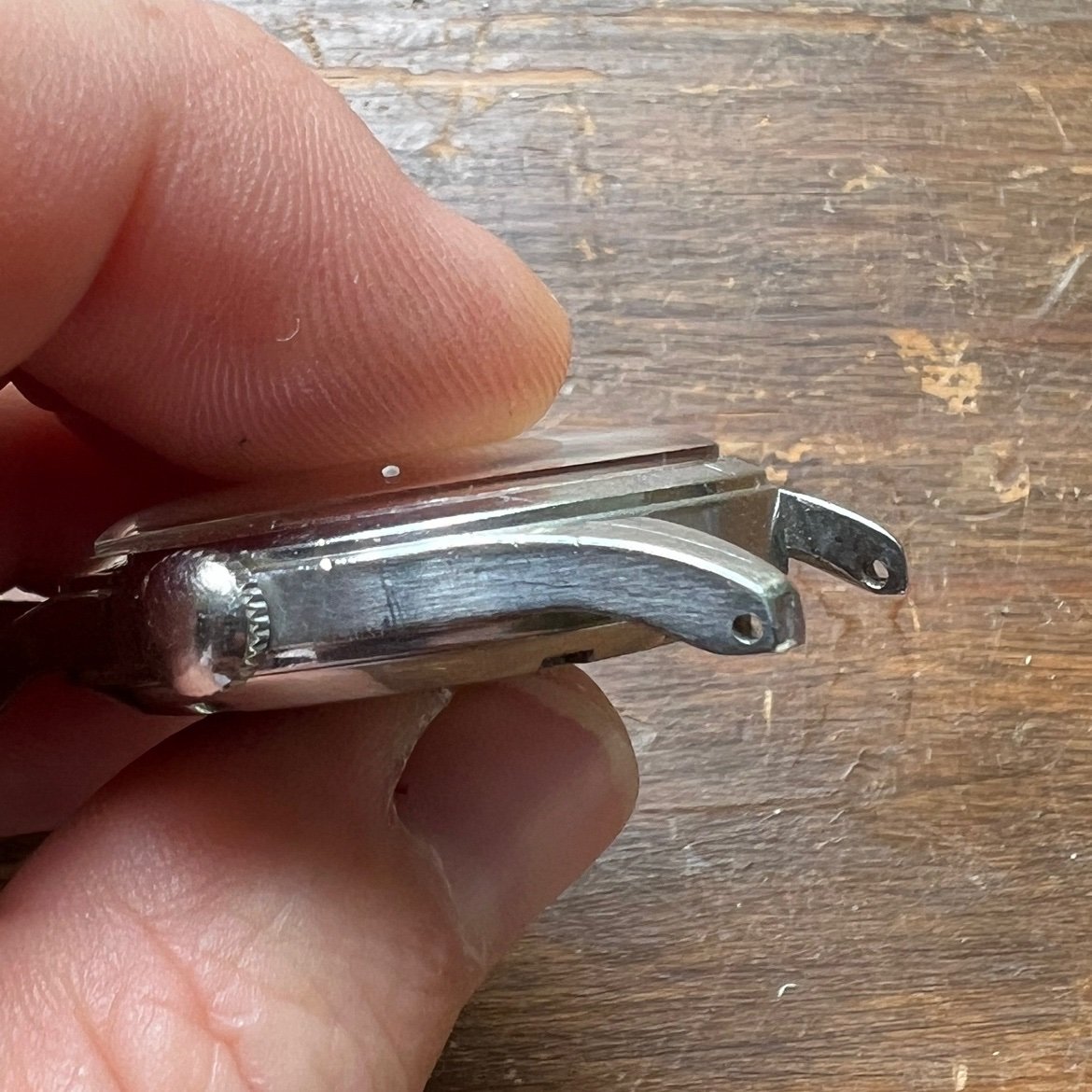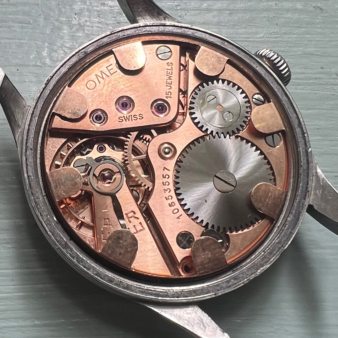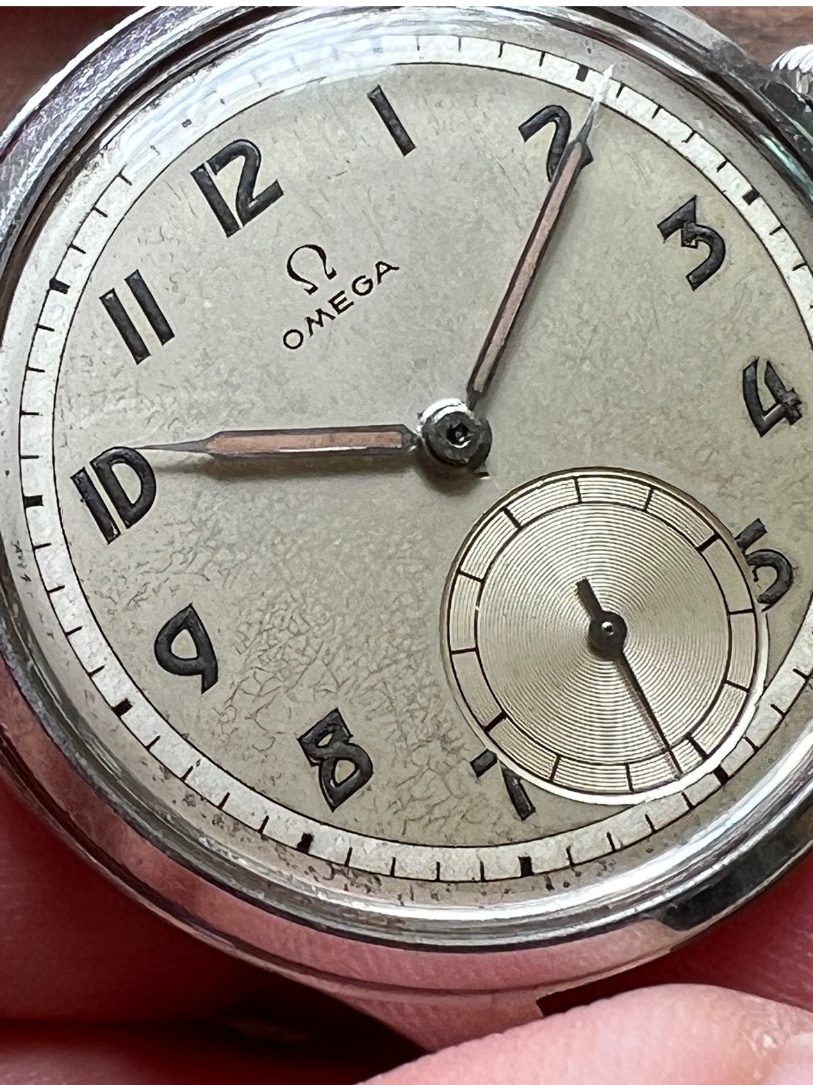 Dial + Hands: Original condition with Arabic numerals; patina as pictured. Very uncommon dial in excellent condition for the vintage. Original pencil hands with radium lume.